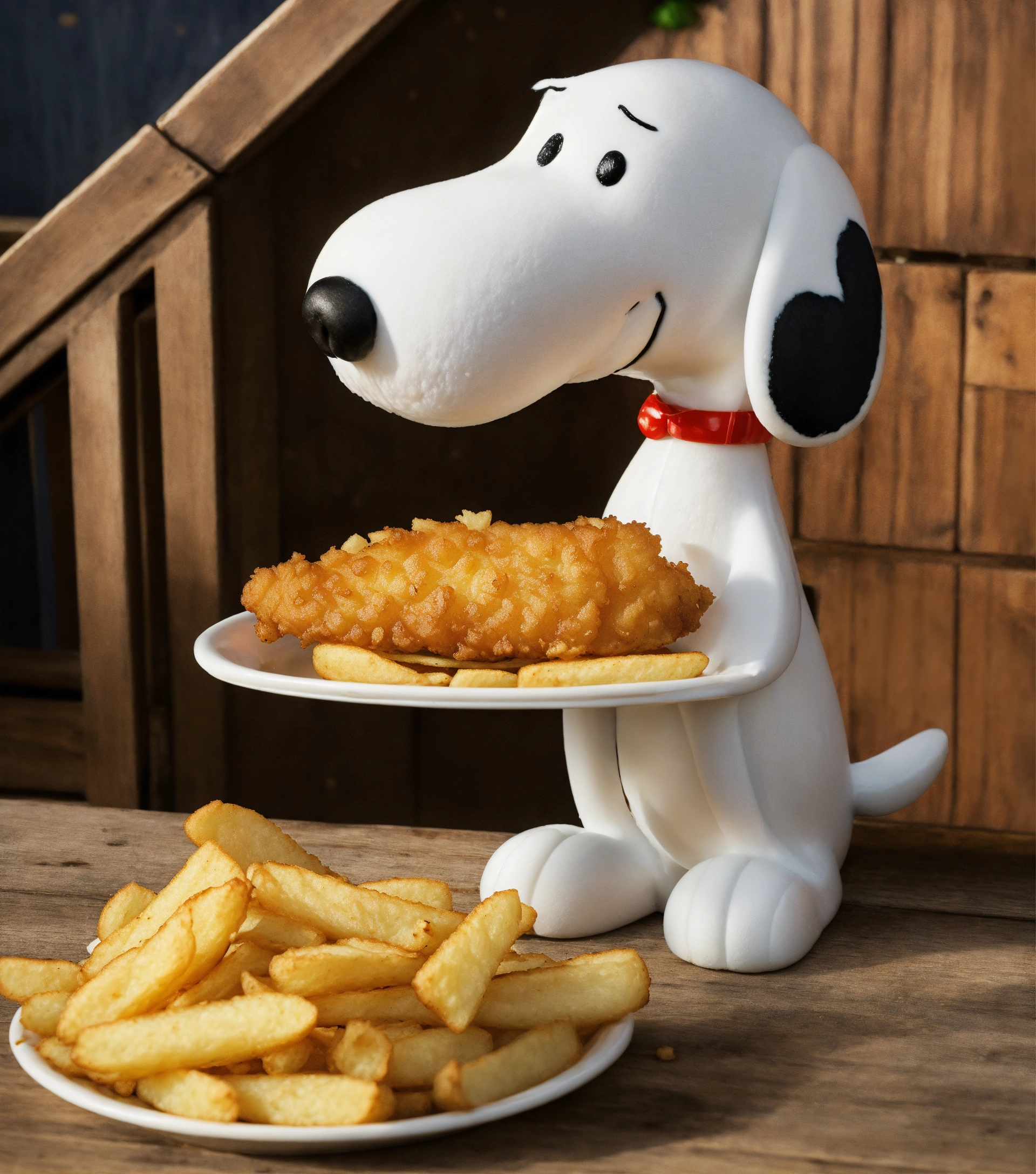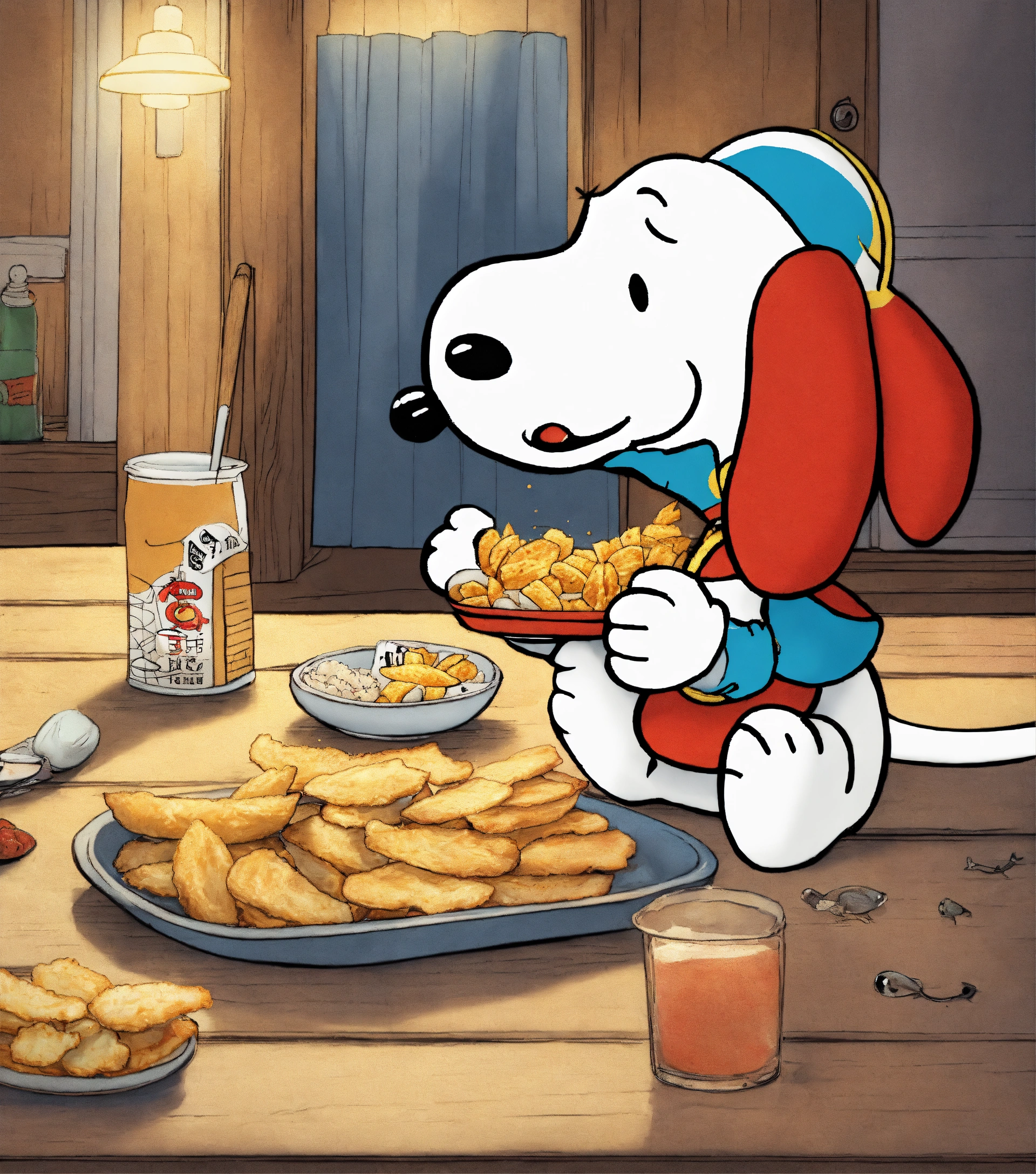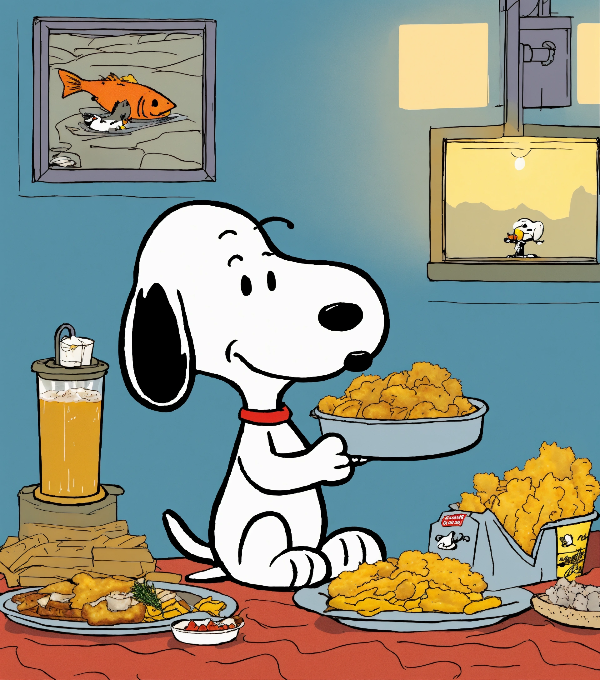 Snoopy eating fish and chips