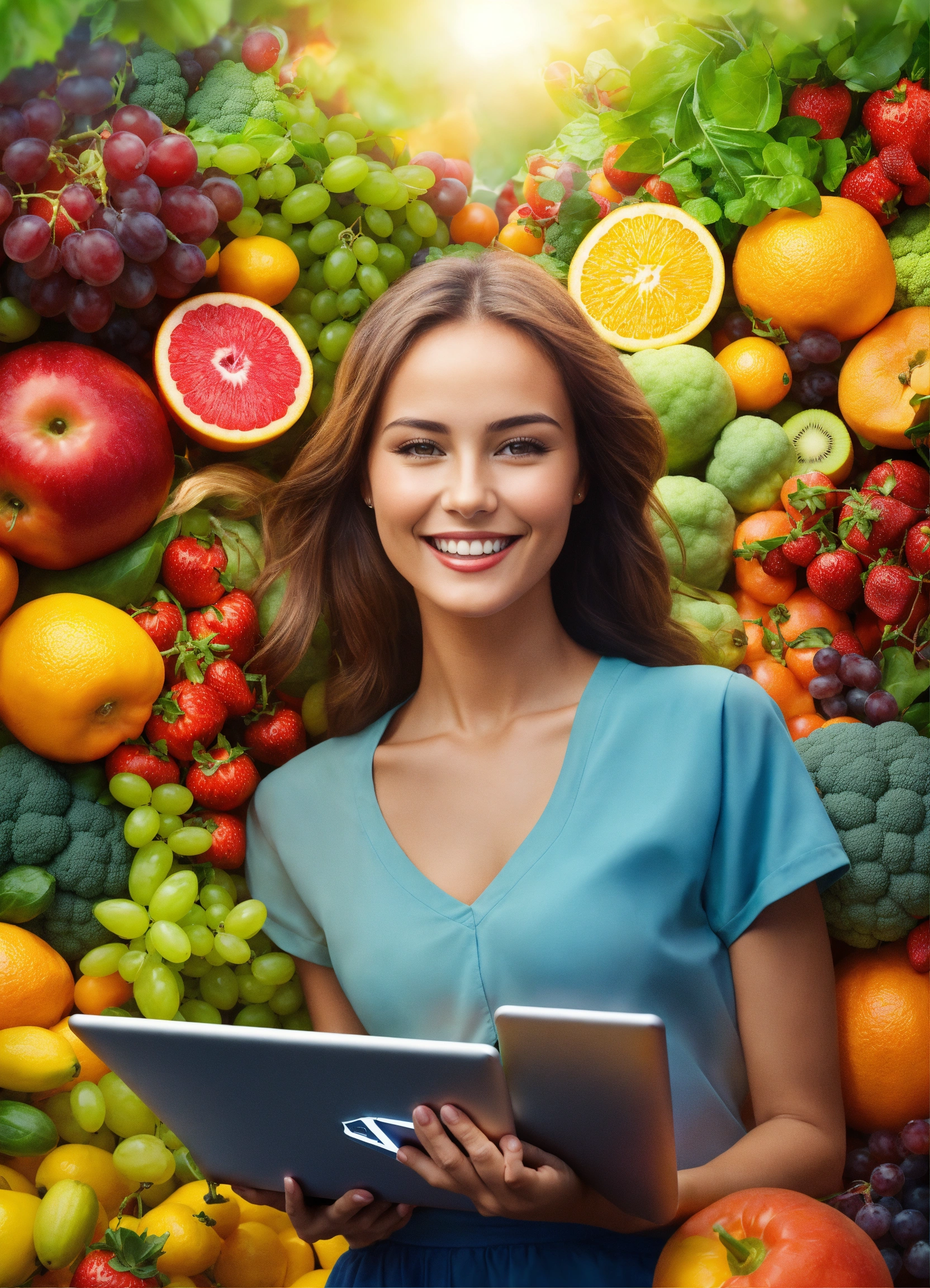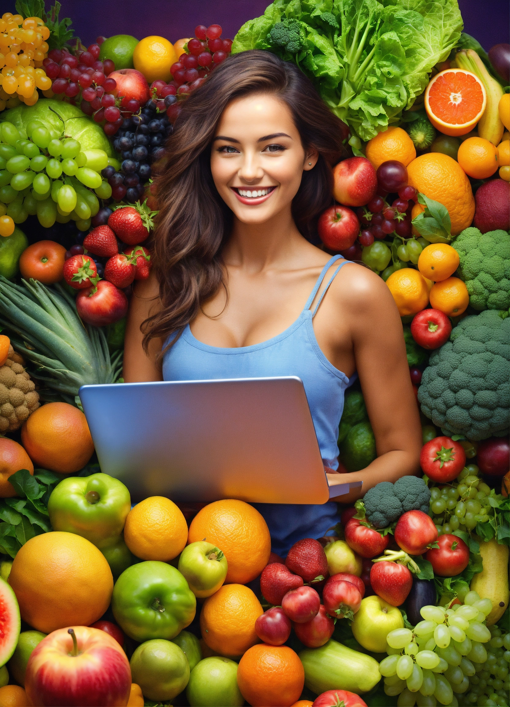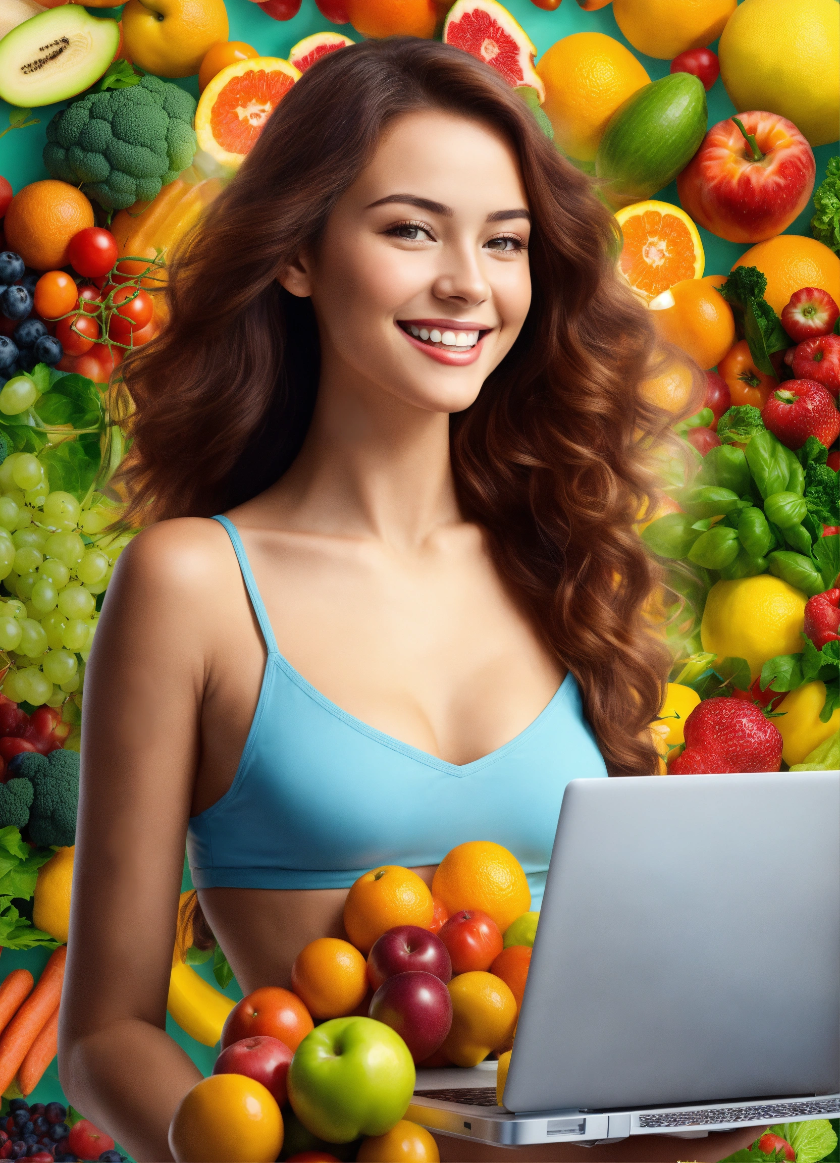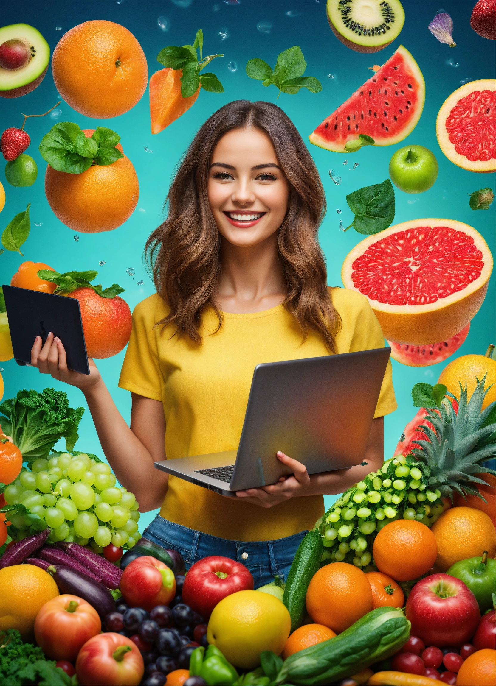 Ultra realistic a young beautiful woman stands with a laptop in her hands. fruits, vegetables, vitamins and supplements are flying around her. the girl is smiling, realistic picture, bright colors and positivity. highly detailed