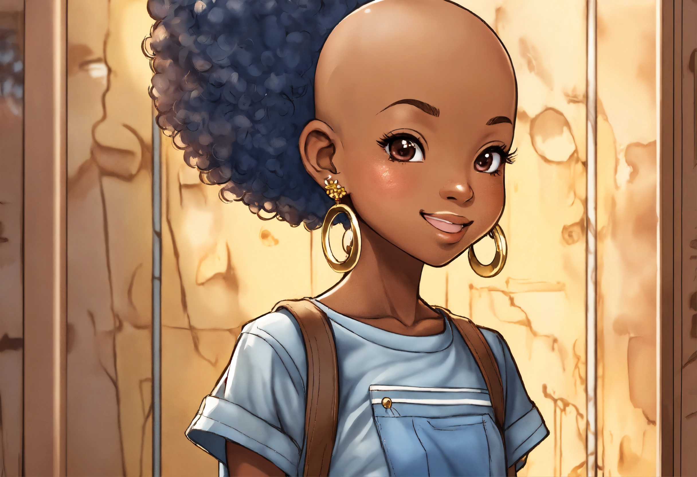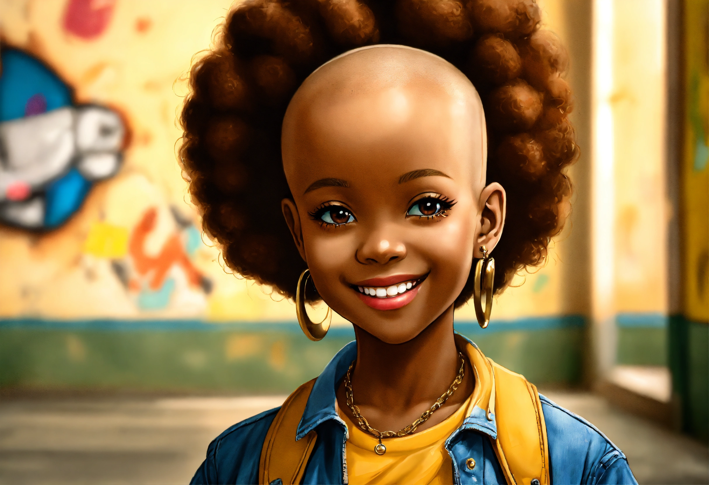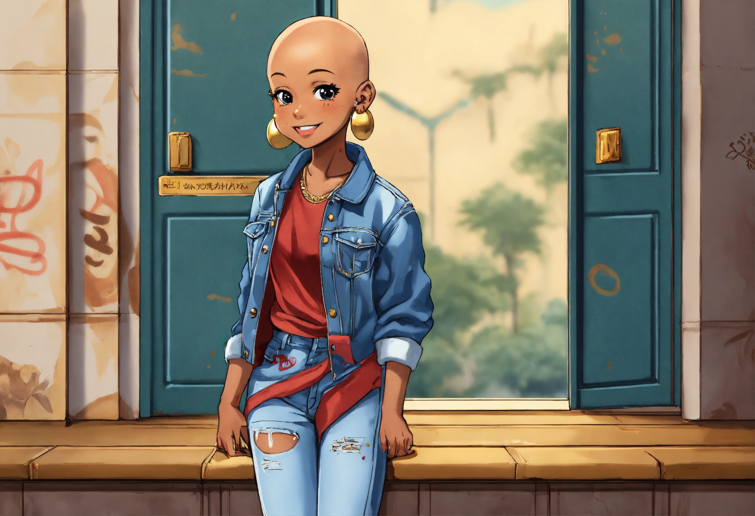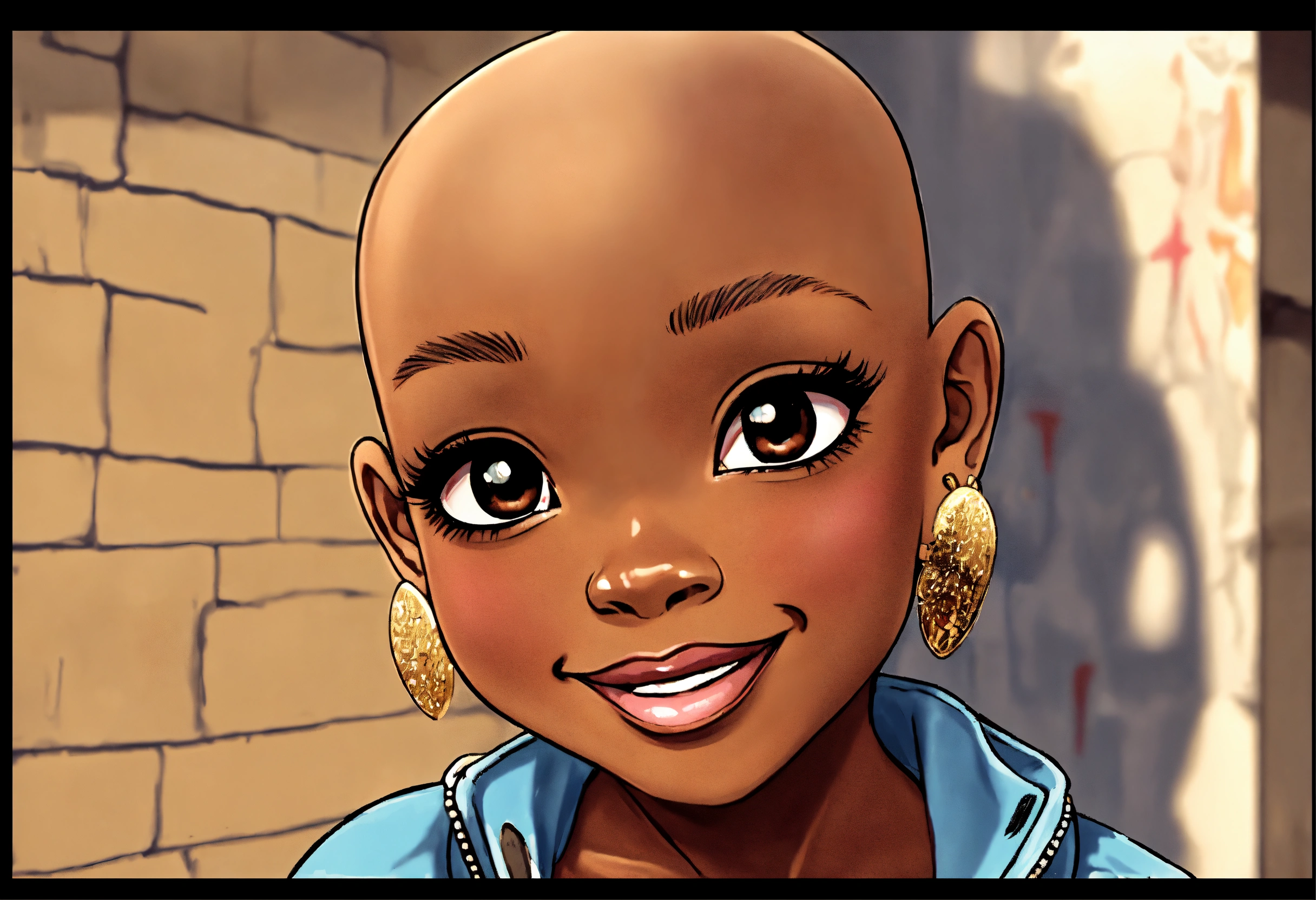 Hd manga kewpie anime mahogany dark complexion african american 12 year old smiling bald girl with full alopecia, wearing small gold stud earrings, wearing denim street wear style standing and leaning her leg against a plaster wall in a school hallway, alopecia awareness, bald head and no eyebrows, airbrush graffiti art style