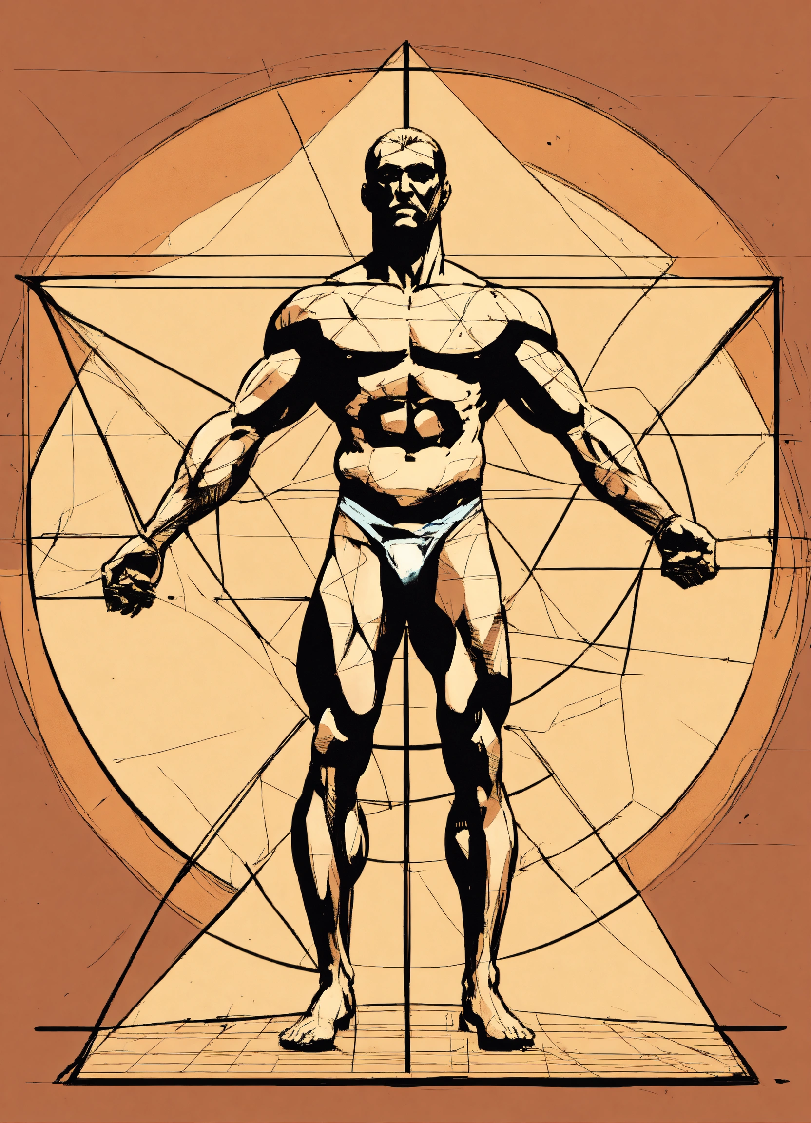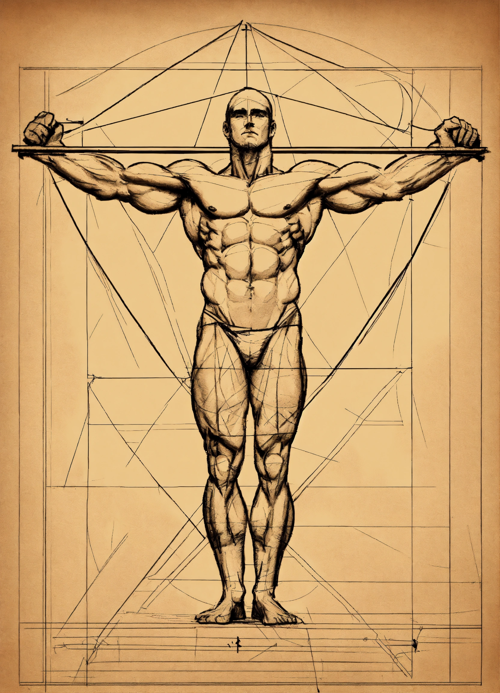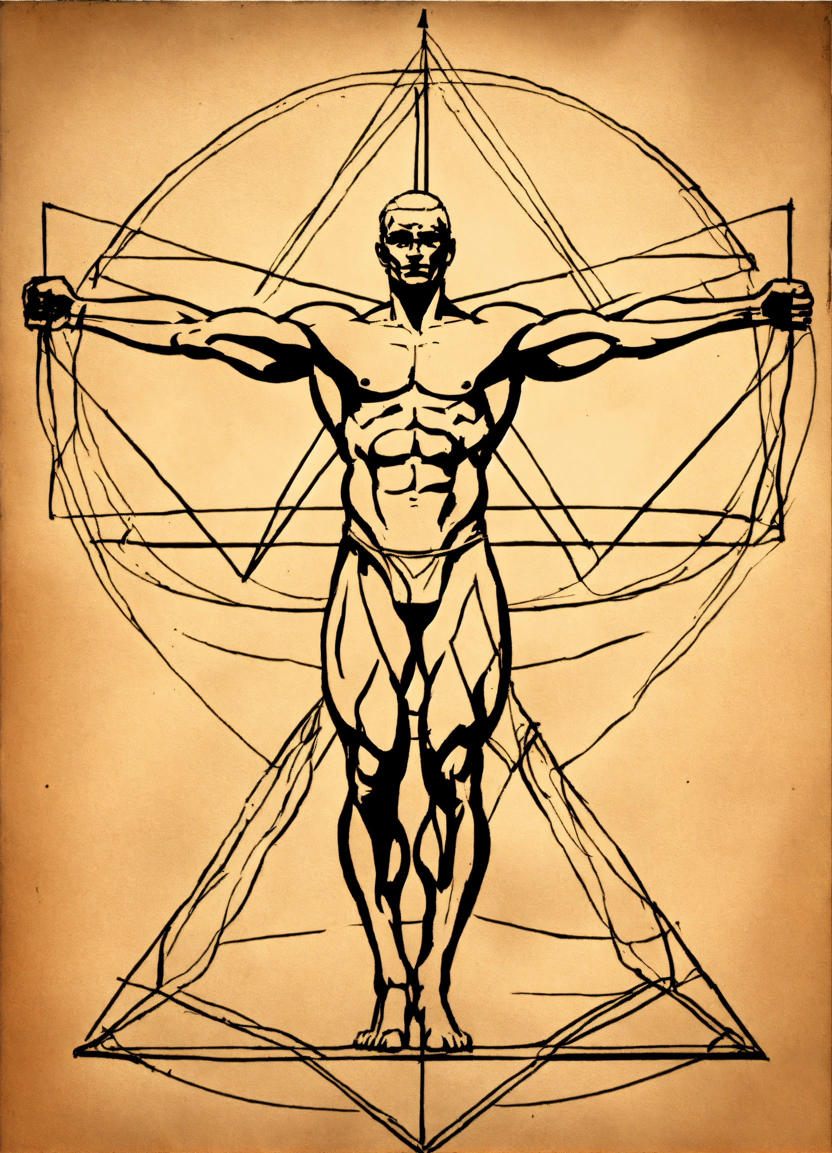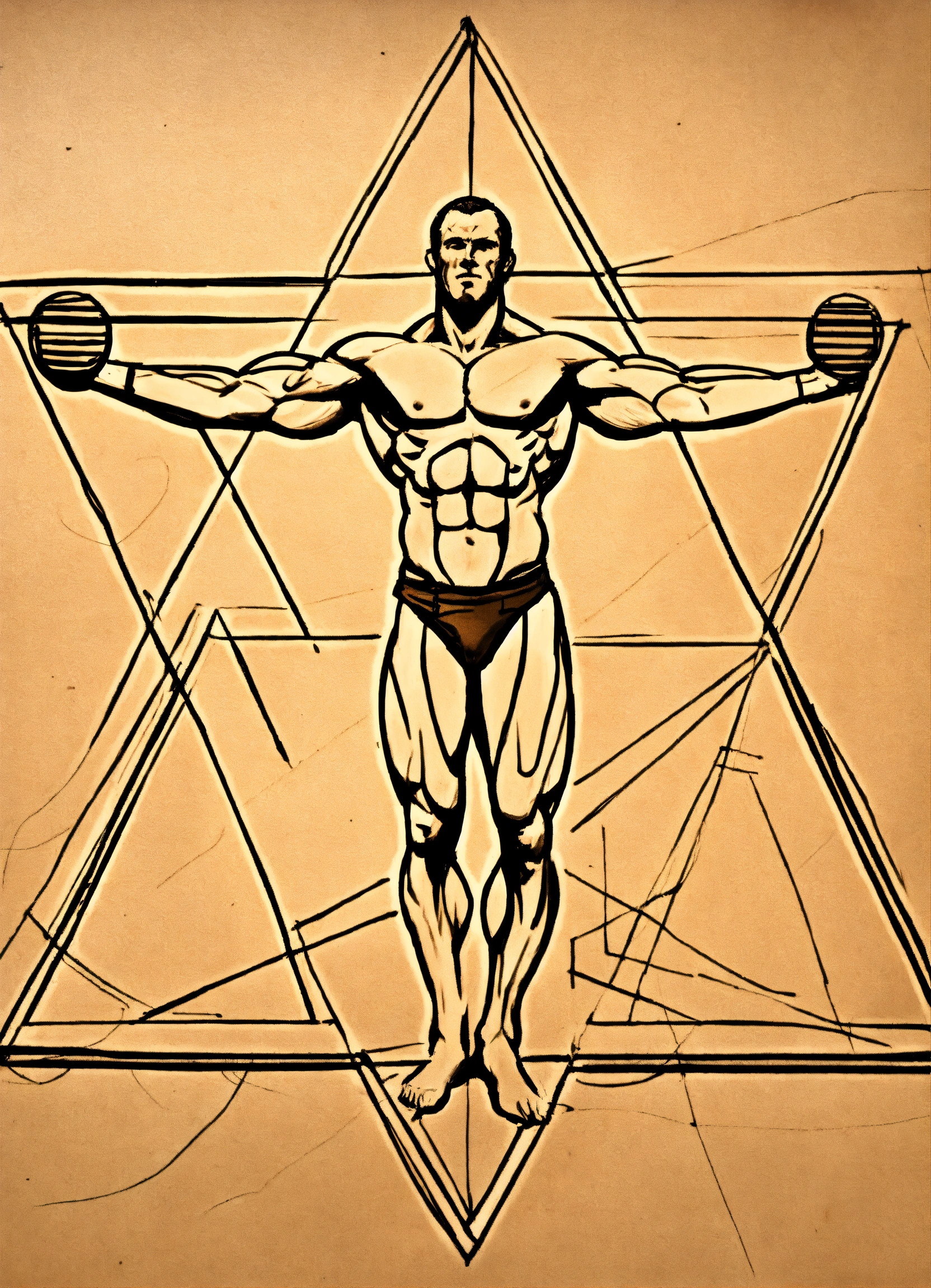 A sketch of a vitruvian bodybuilder surrounded by a triangle