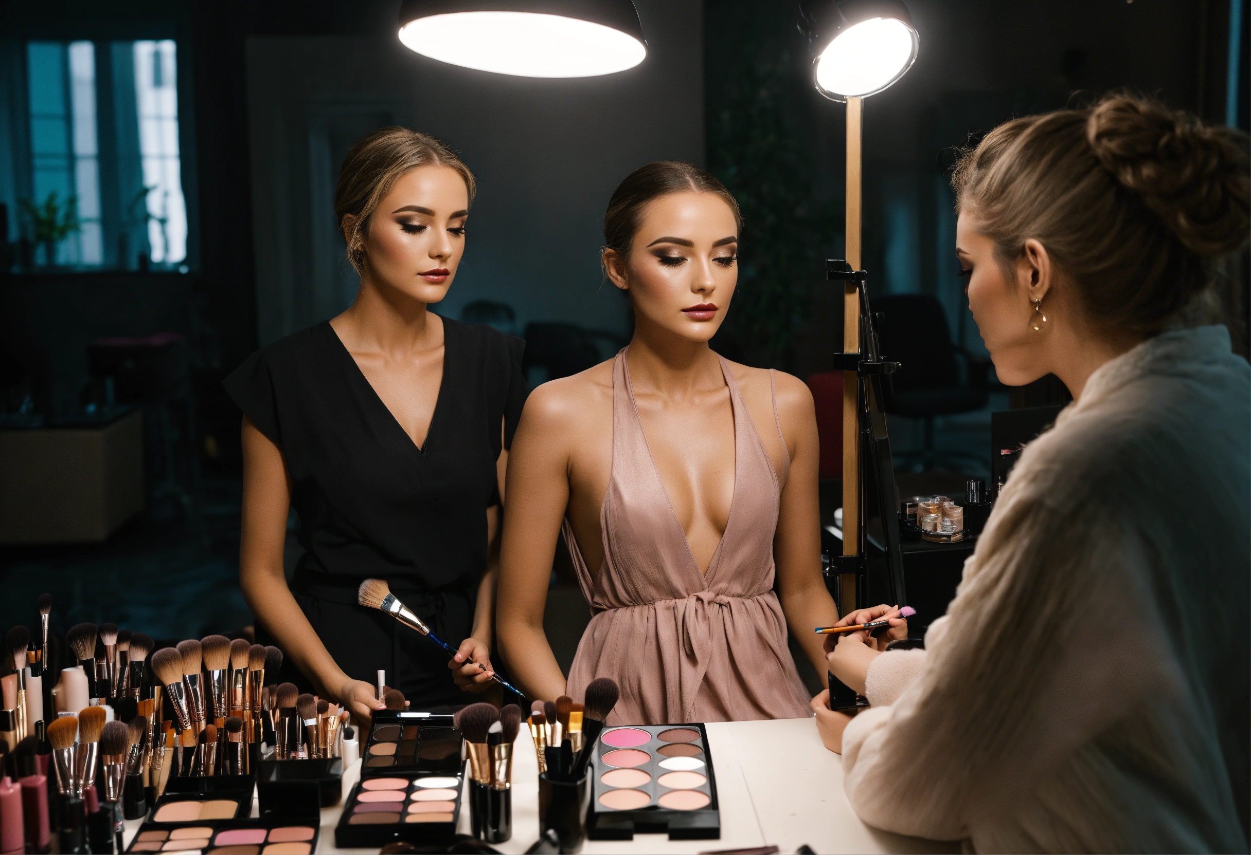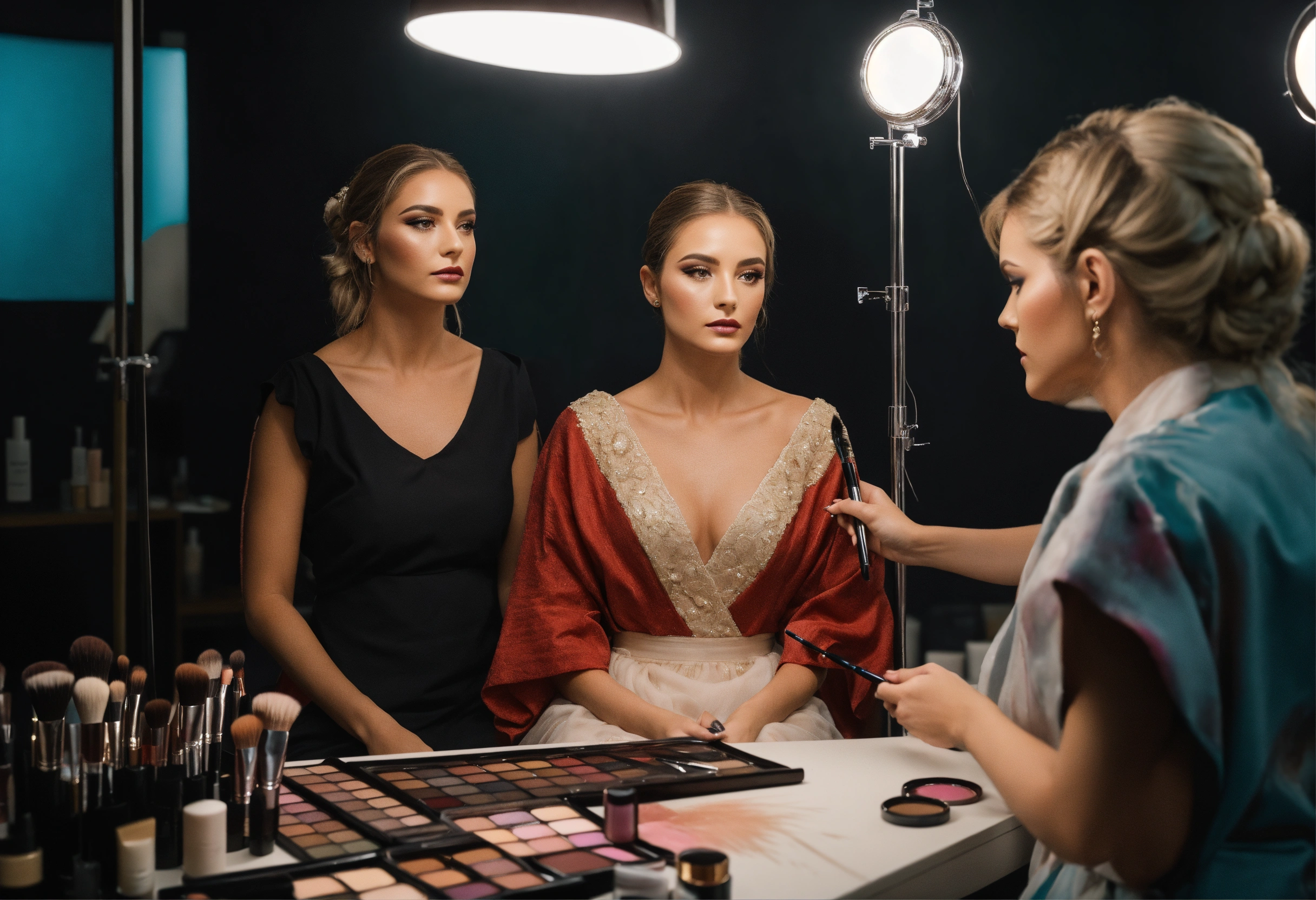 The actress is made up and painted by two people a makeup artist and a hairdresser. she is sitting in an actor's chair, opposite a table with a light.on the cosmetics table, makeup brushes. side view. the process of fitting an actress. low quality. symmetrical bodies, beautiful, different detailed faces.