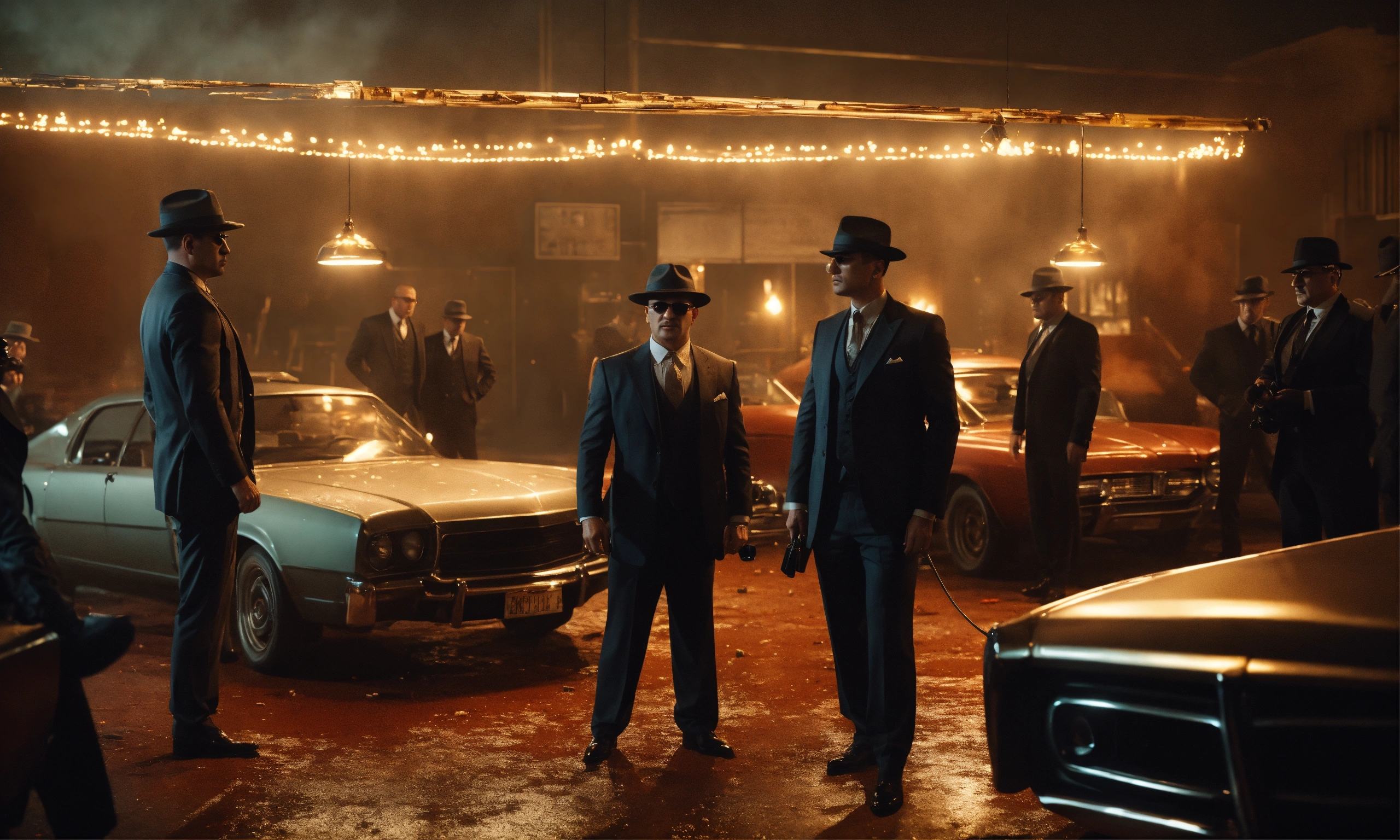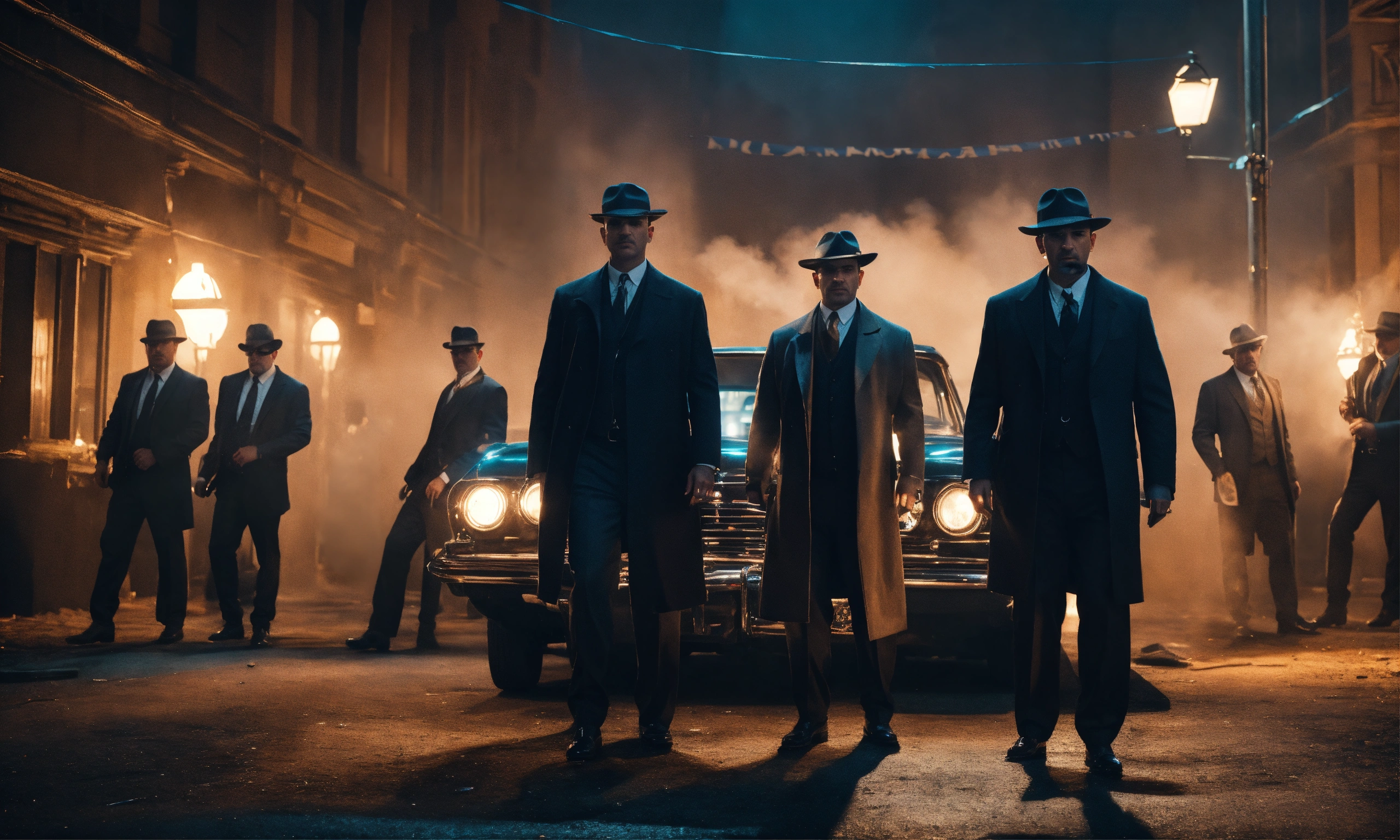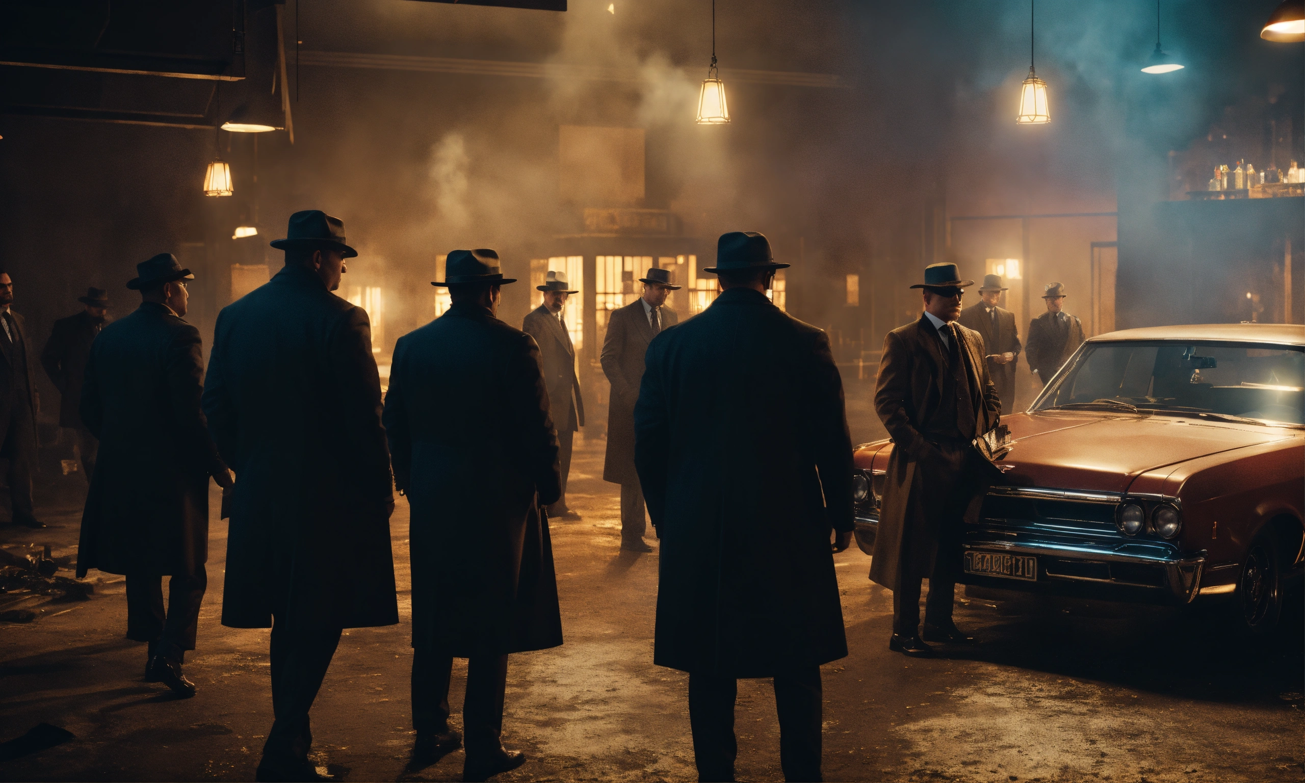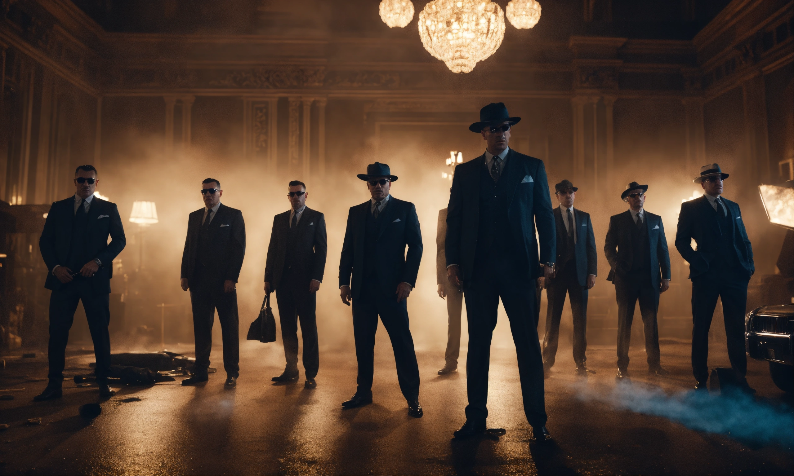 Group of mafia gangster members in crime scene set design, smoky mood lighting, wide front shot, night time, 8k, luxcorerender, earthly colour, cinematic photography, real humans, real images, matte finish, shot on arri anamorphic, extreme wide shot, smooth, sharp focus, ornate, highly dynamic, particulate, hyperreal, wide shot.
