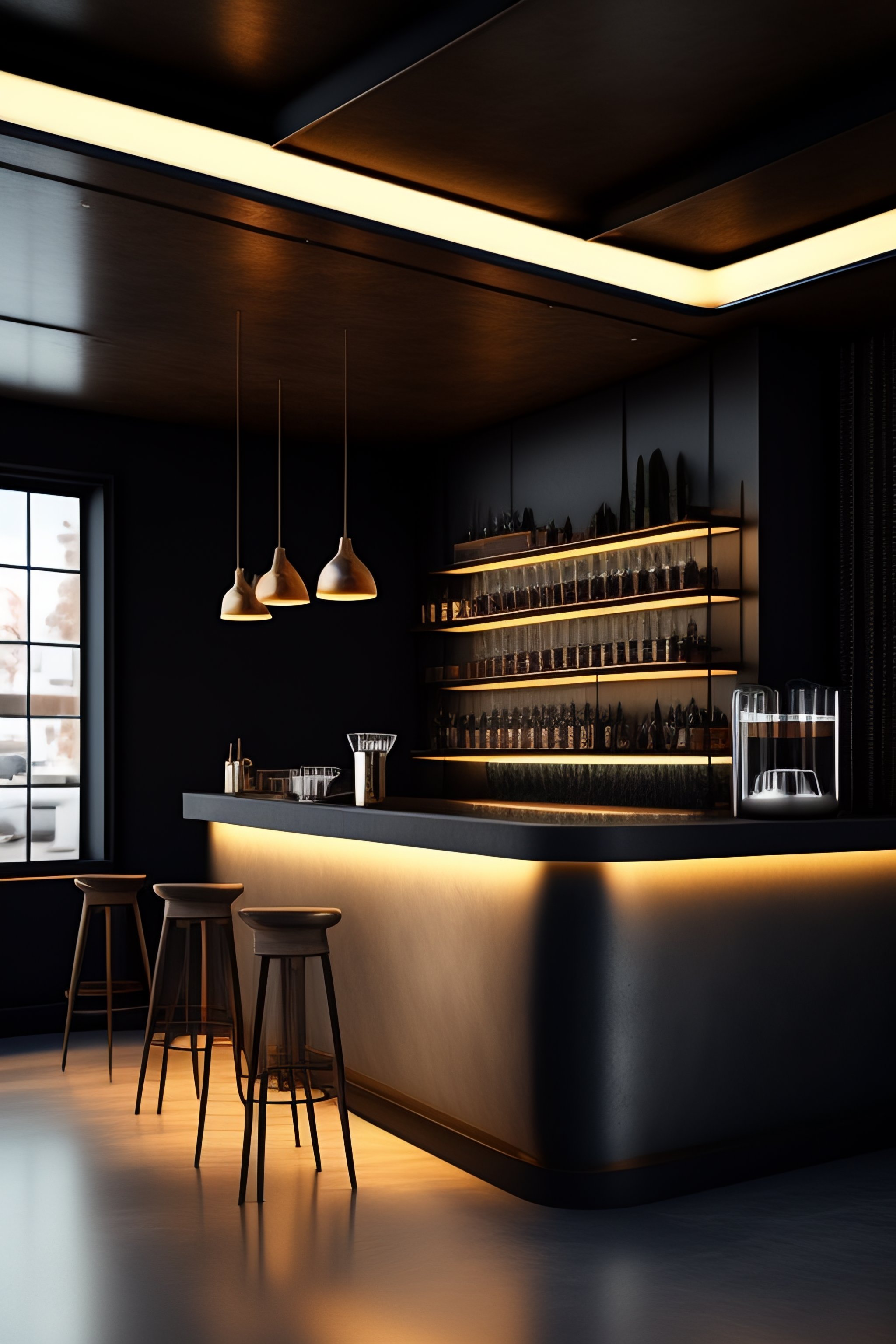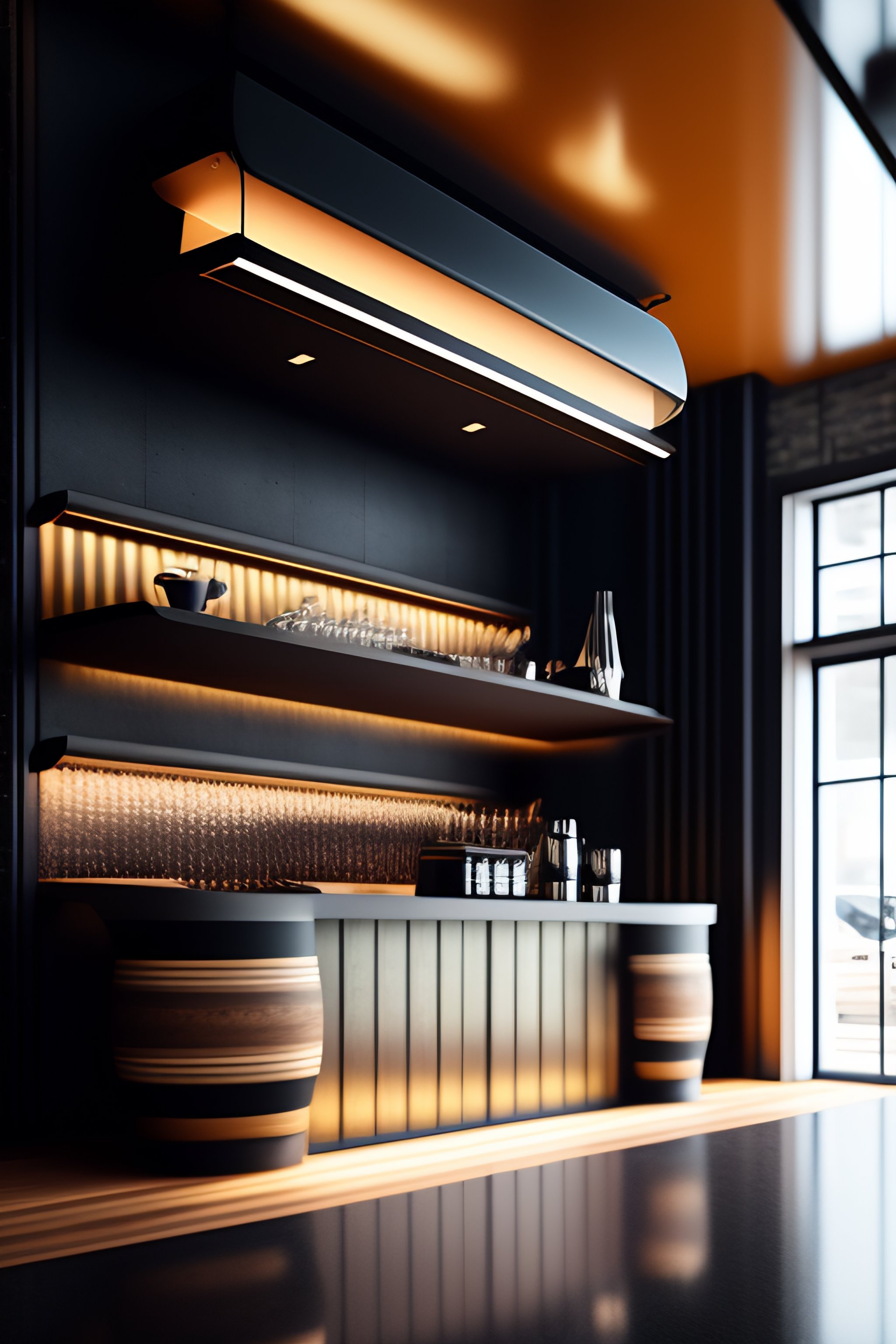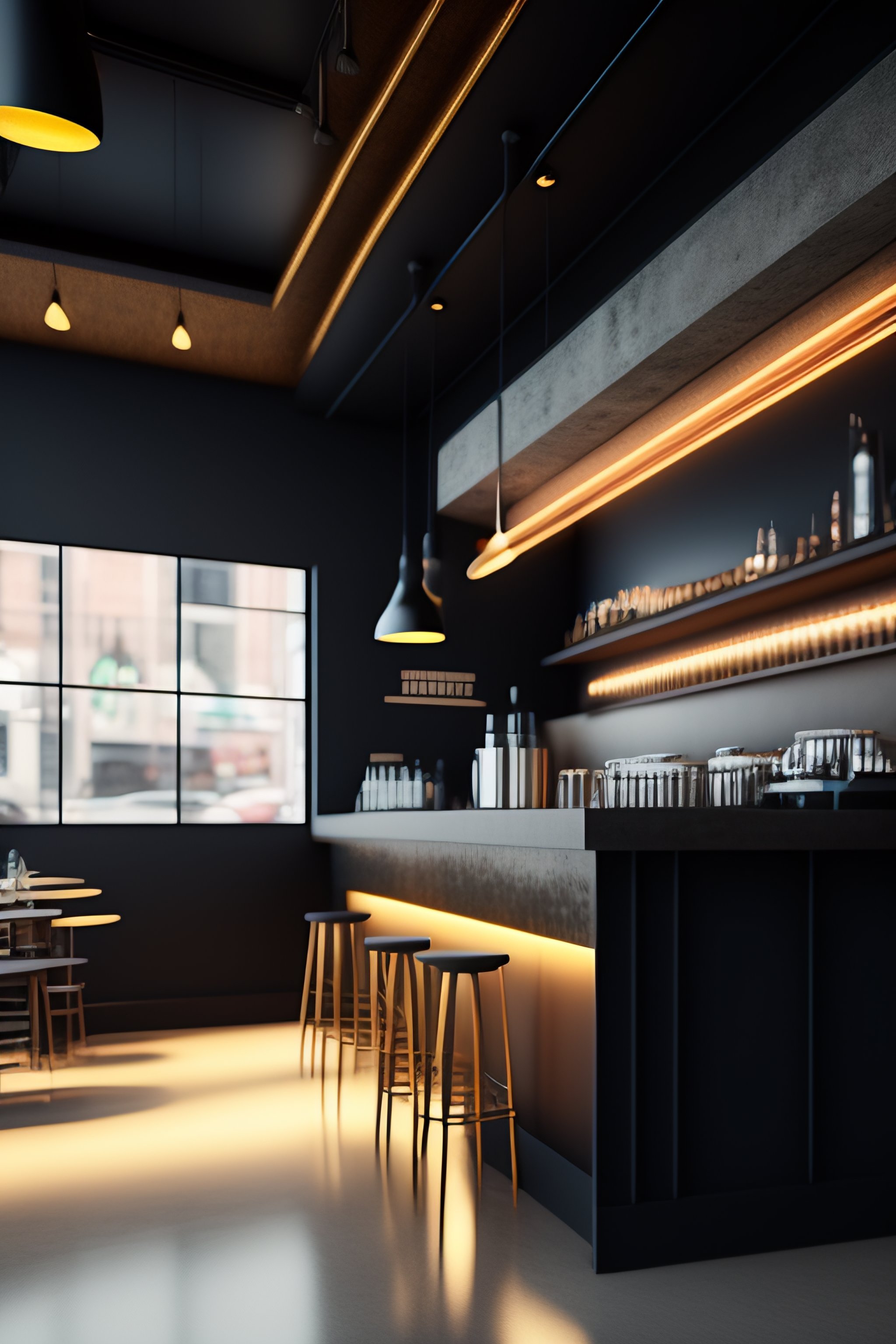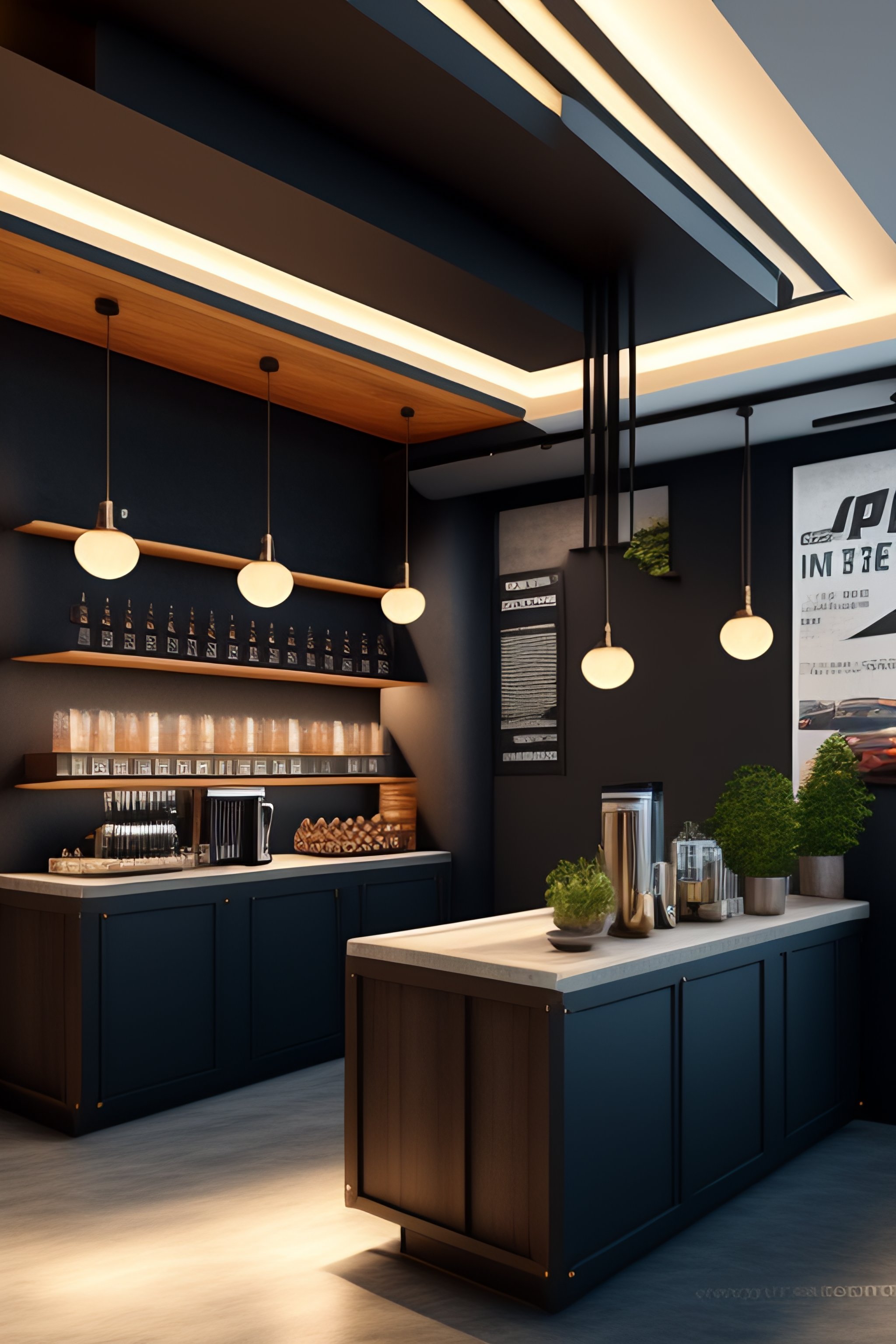 Cafe interior, industrial effect, ultra-realistic, show all details of cafe bar and celling show espresso machine, concrete celling, cafe will be in car show room