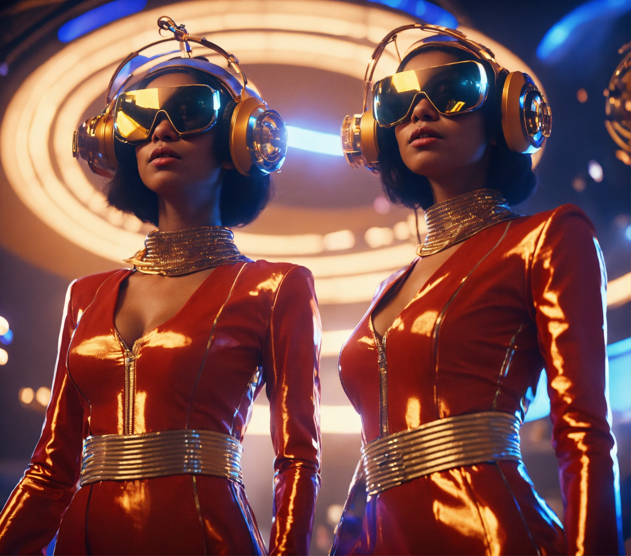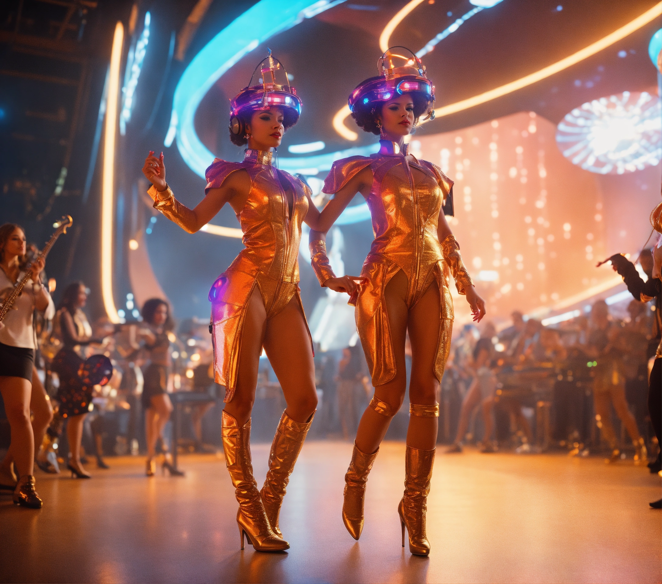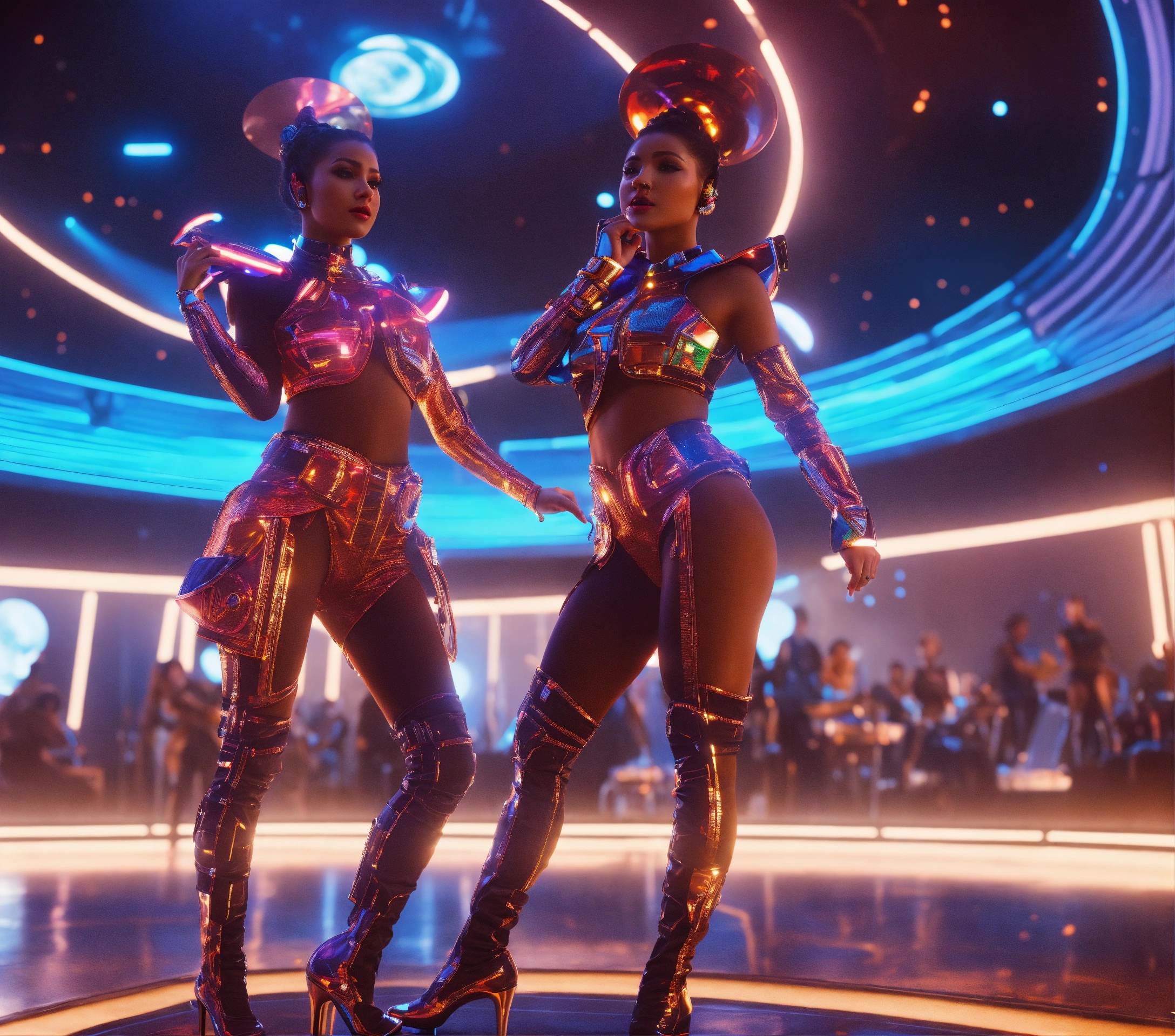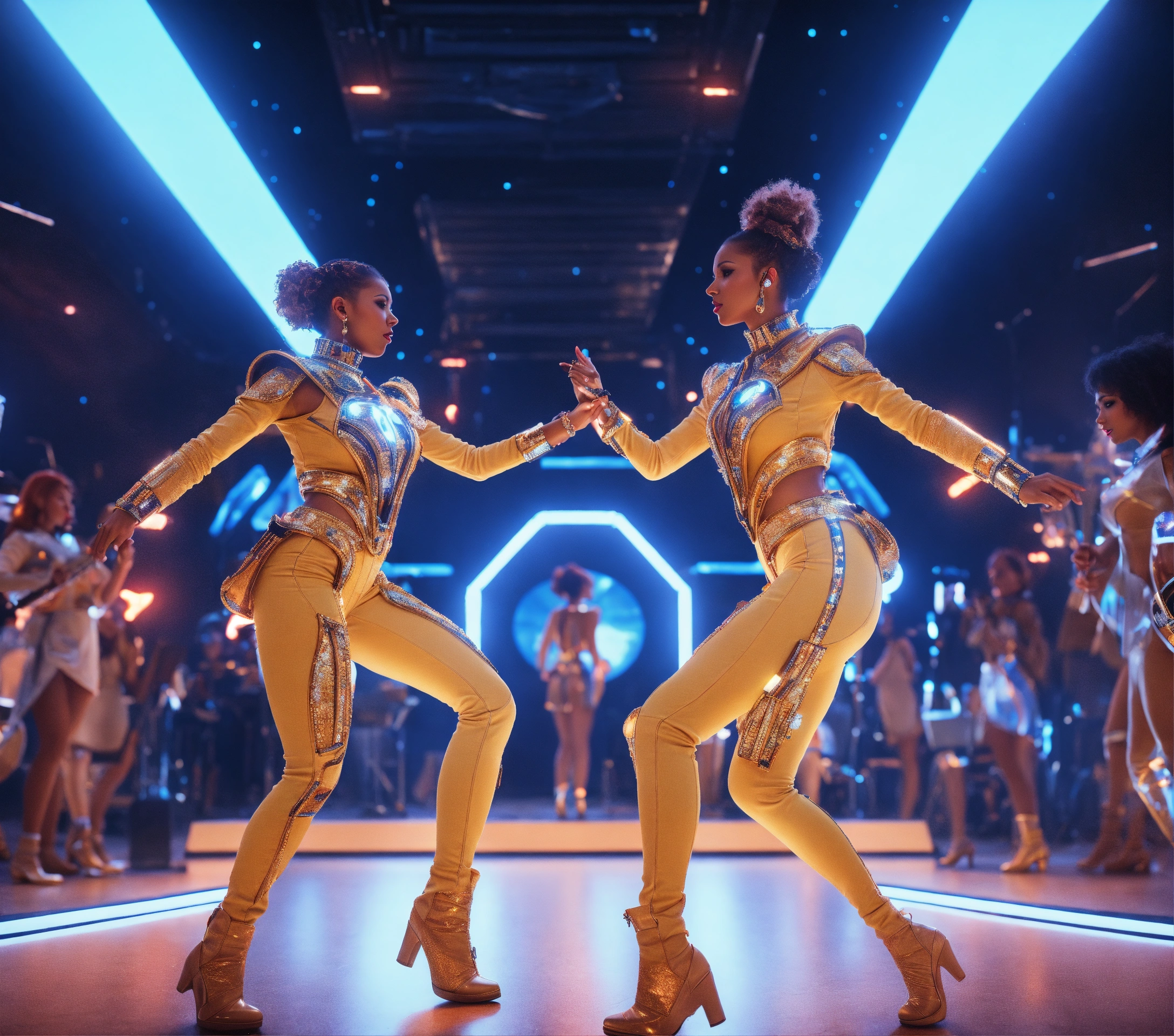 2 beautiful women in funky futuristic royal attire dance to music at a packed jazz concert on a spaceport, realistic, futuristic, sci fi, 8k, unreal engine, analog controls