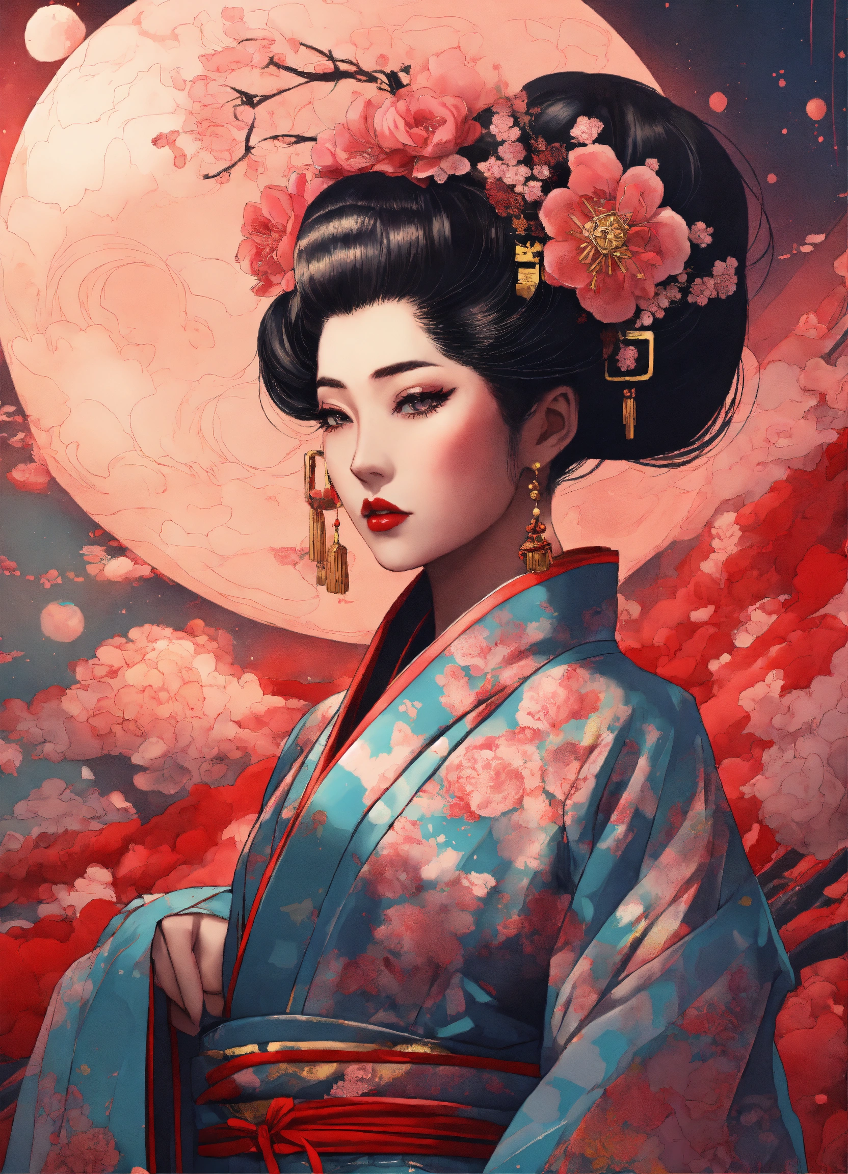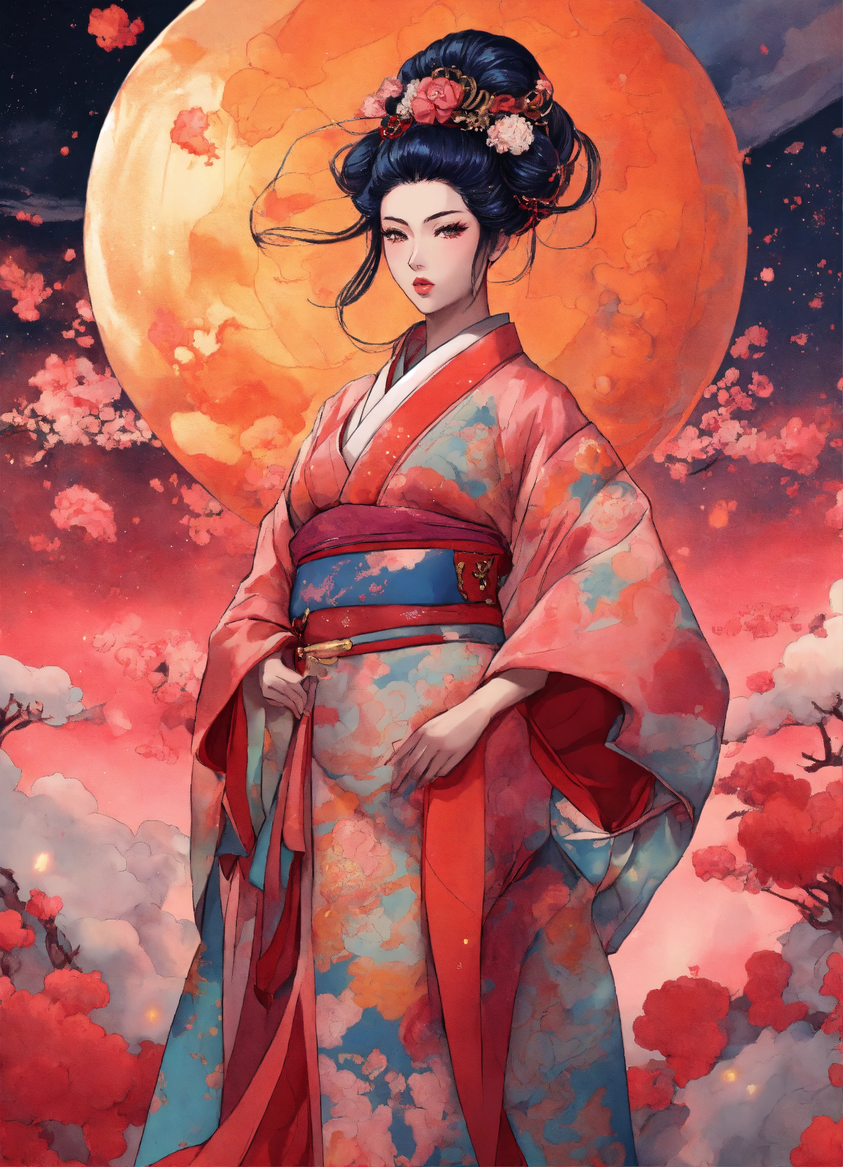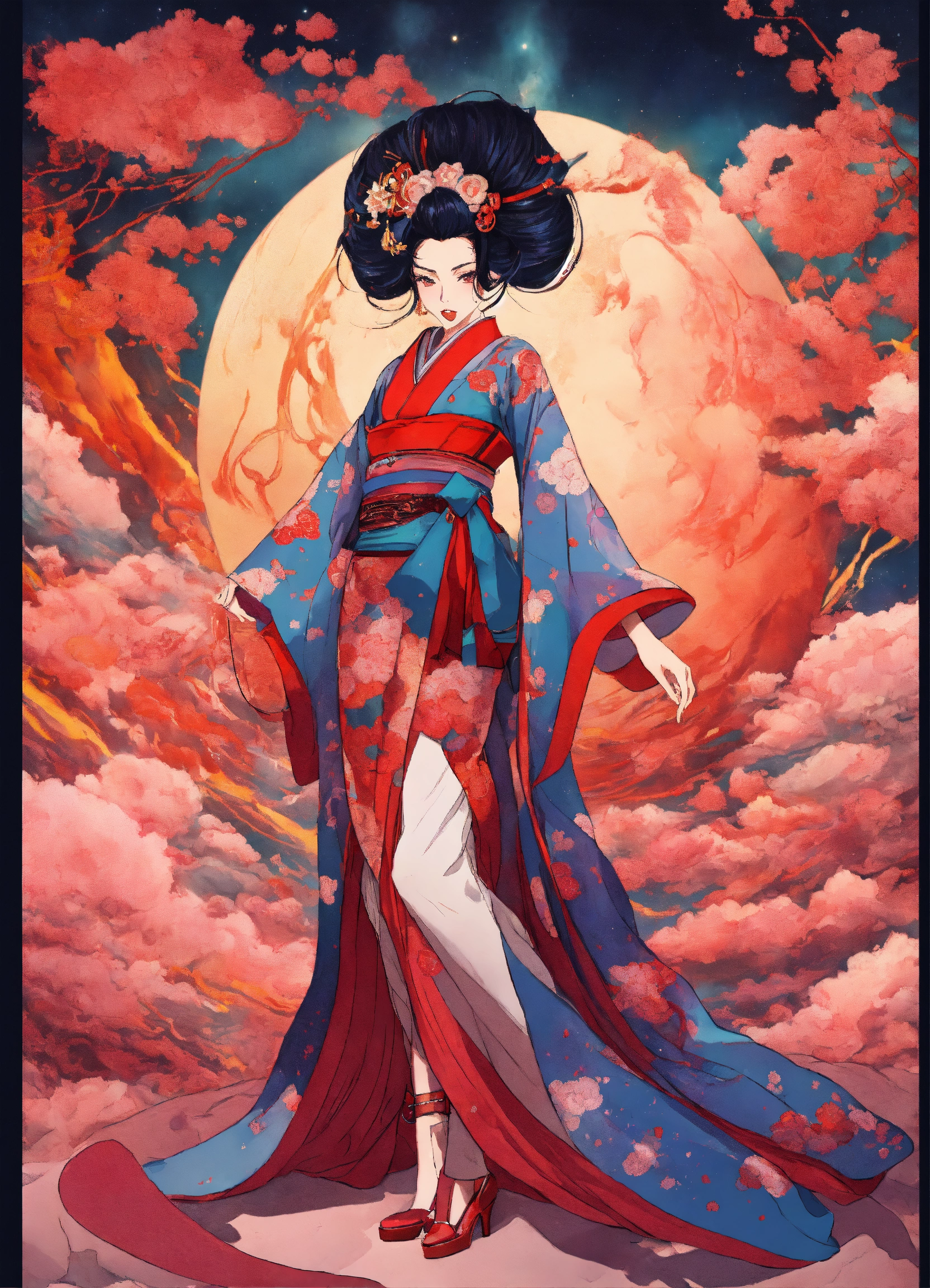 Stylish geisha haute couture outfit in the style of 90's vintage anime, surrealism, akira style. detailed line art. fine details. inside an exploding nebula.