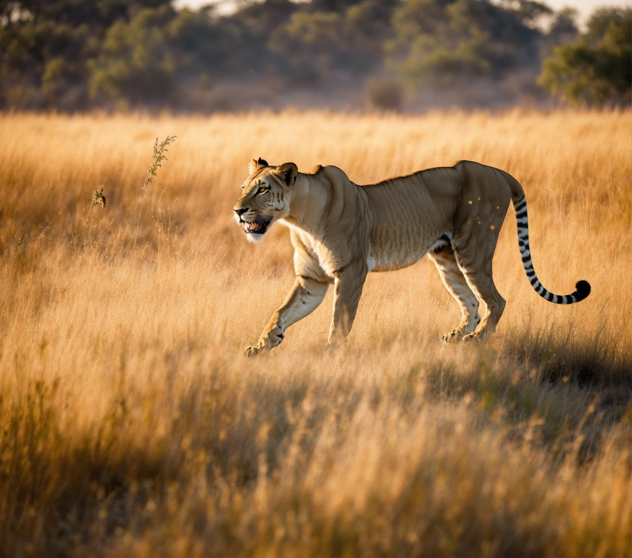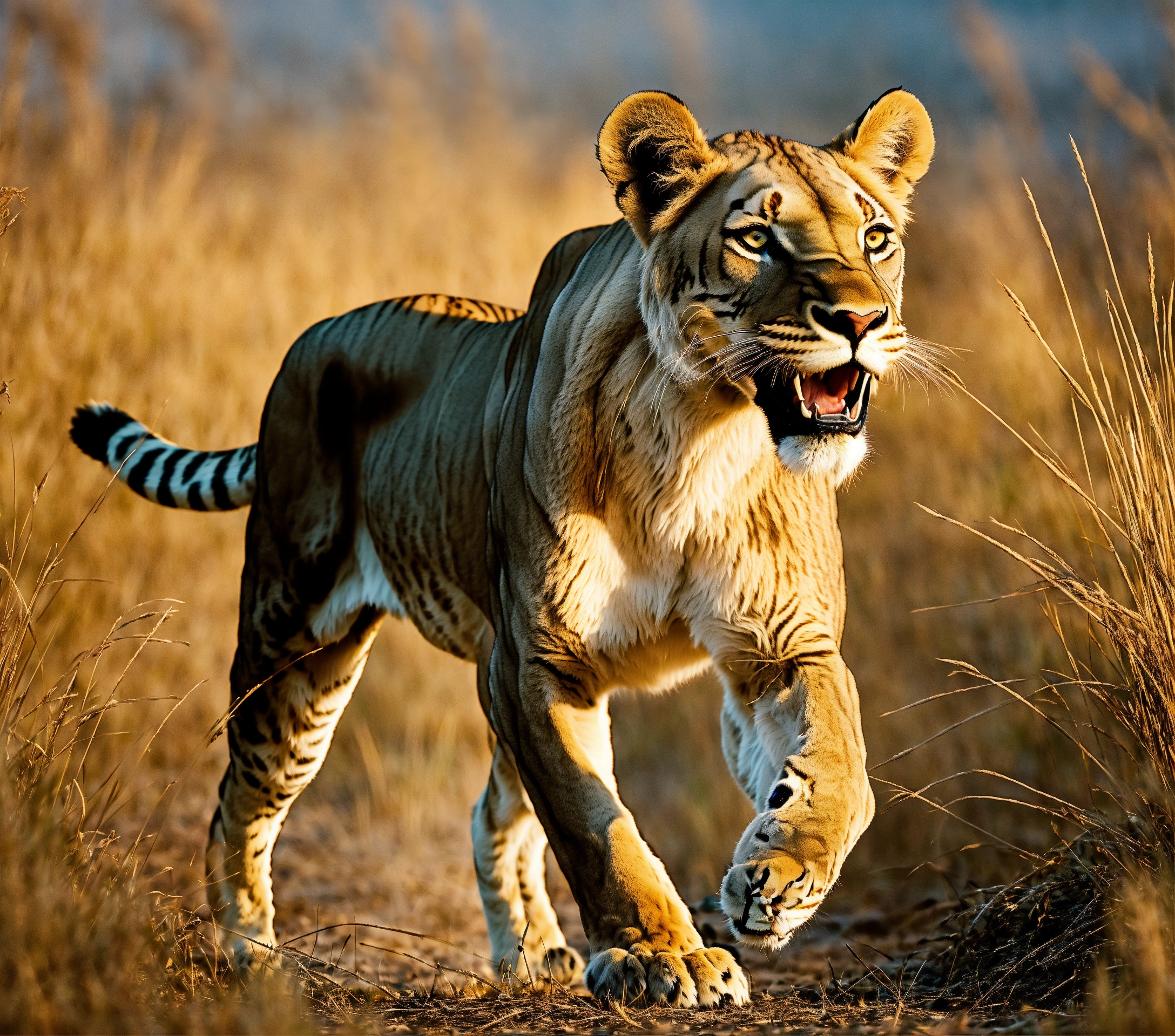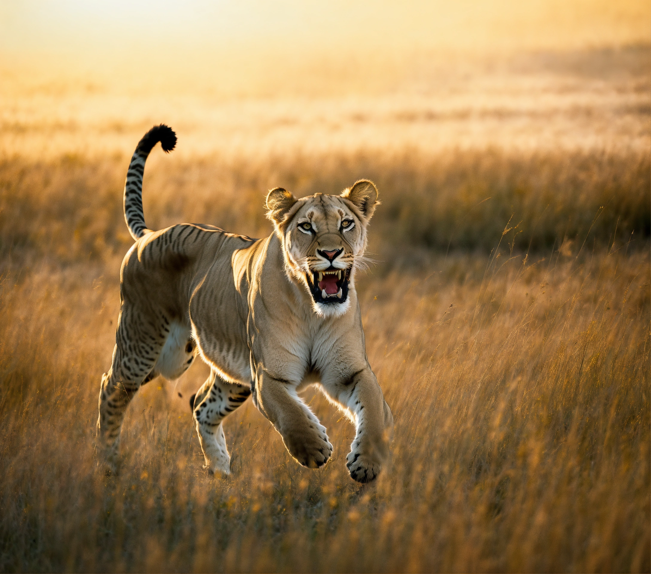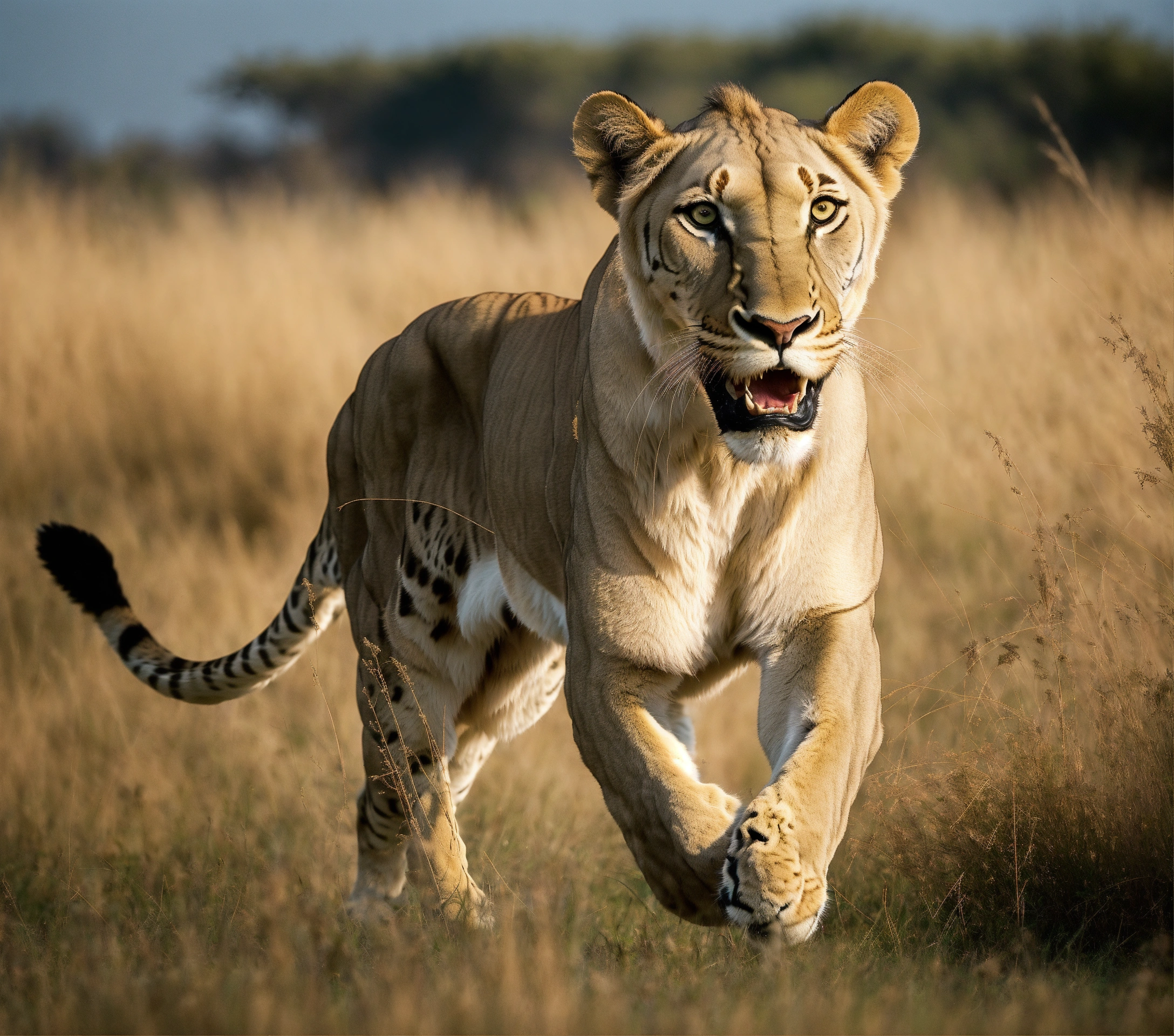 A grey spotted lioness with long sharp canines like a sabre tooth tiger pouncing out of tall grass to ambush a small deer which is running away