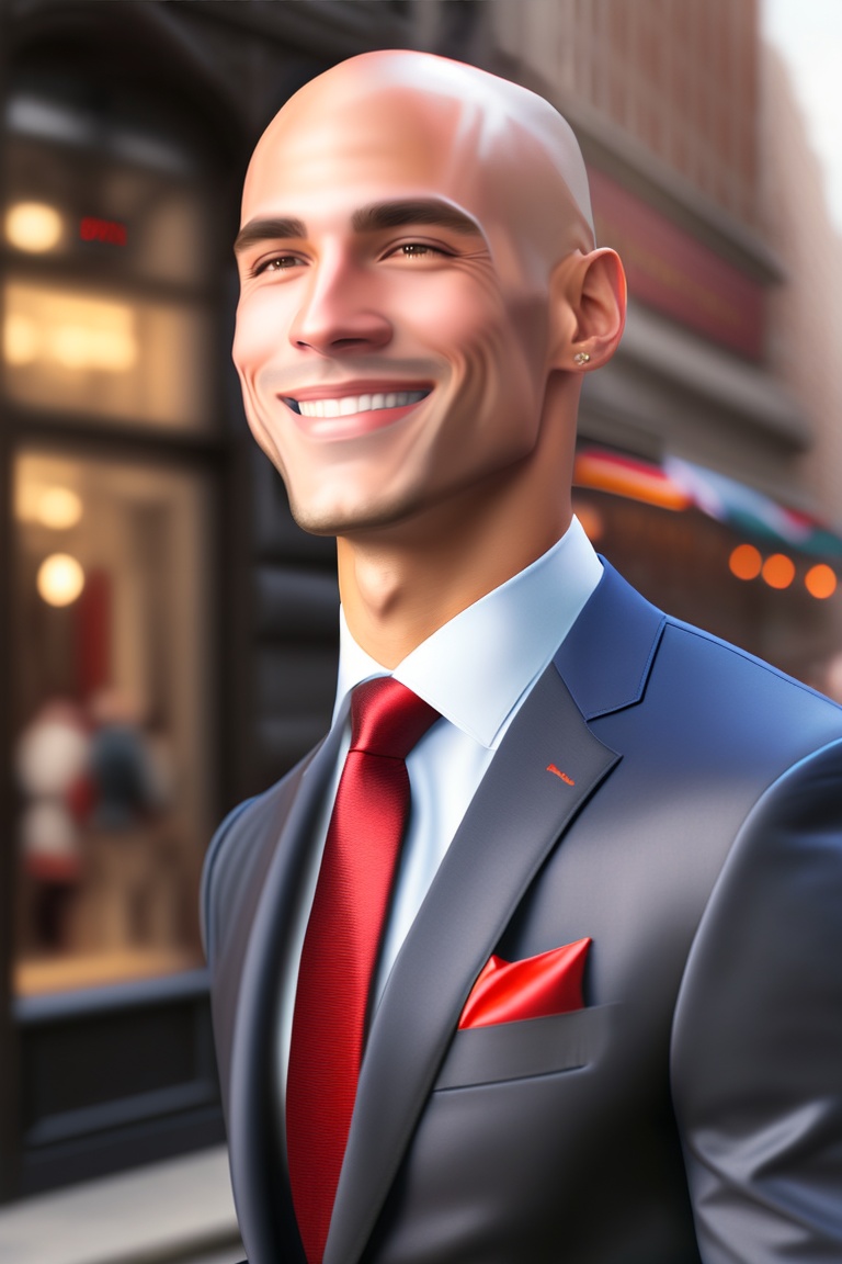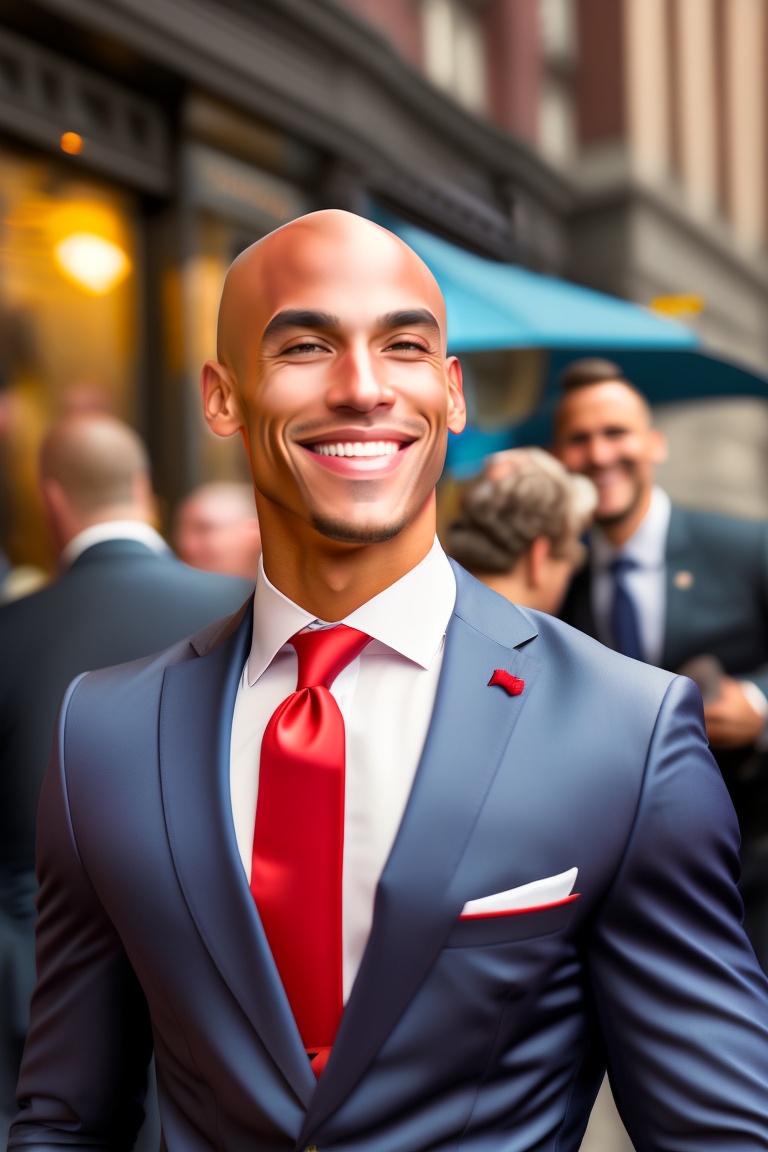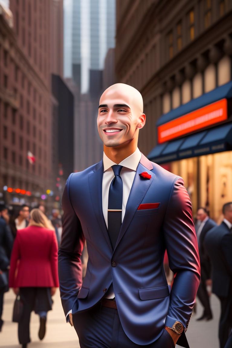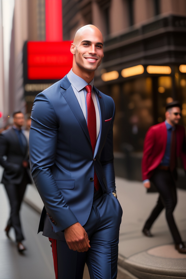 Bald slender latino man in navy blue suit with red power tie and matching pocket square, smiling while looking into distance on a new york city crowded sidewalk