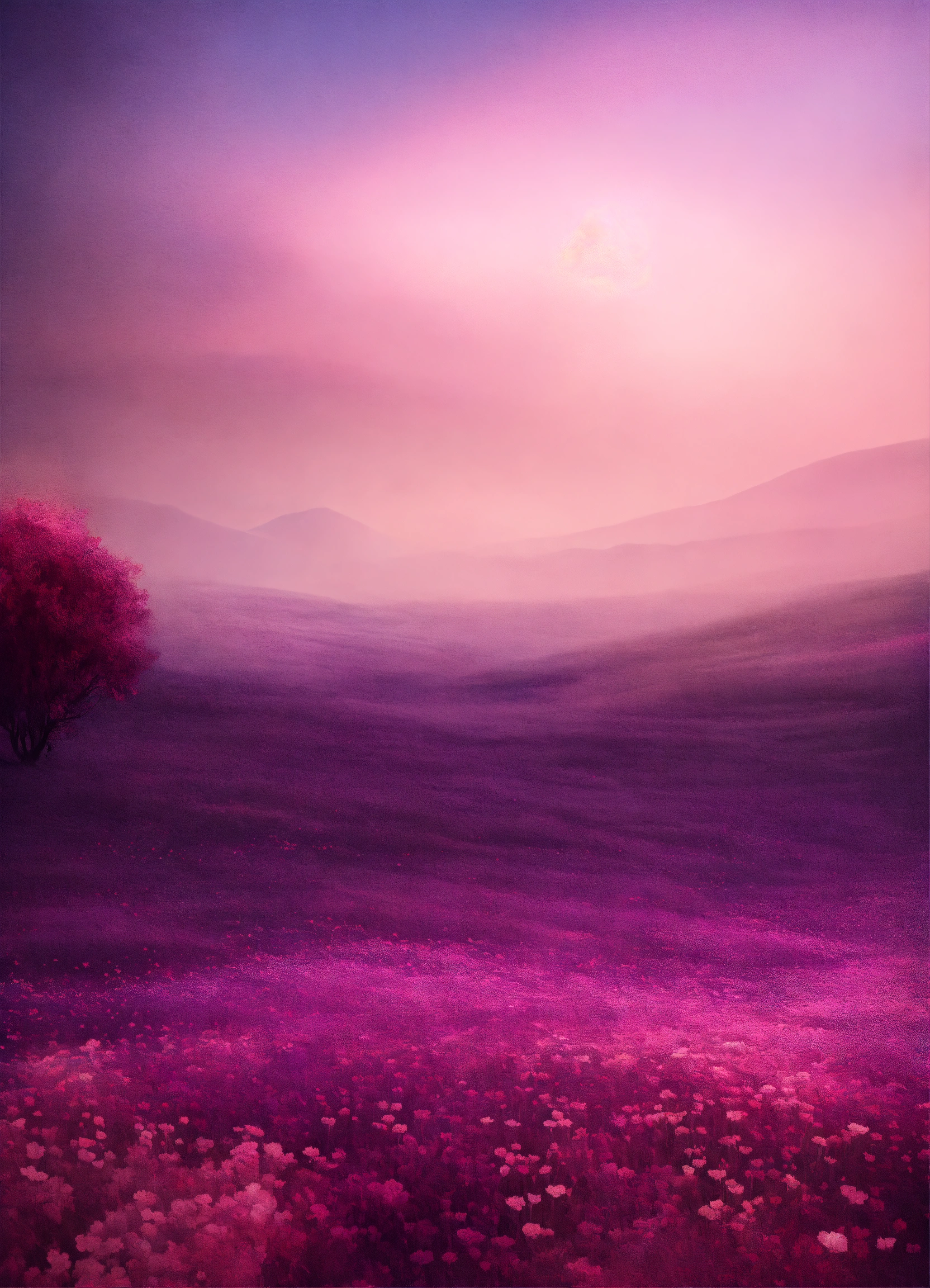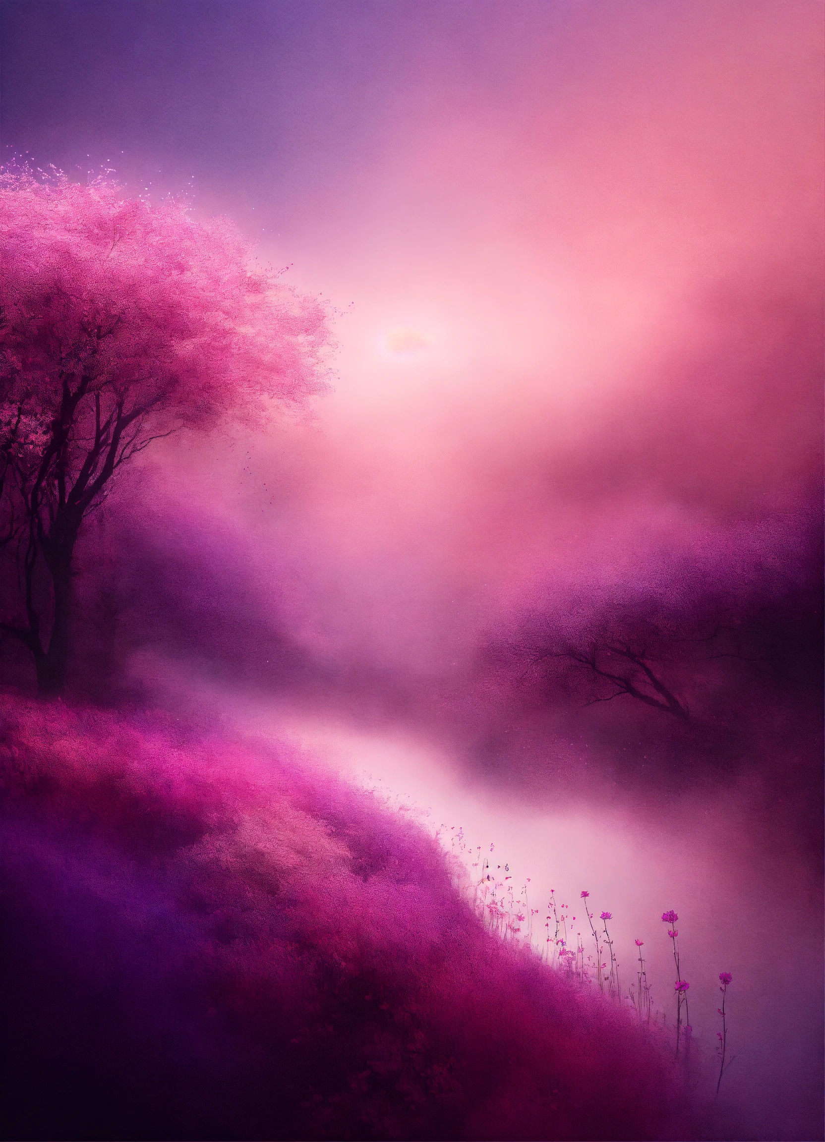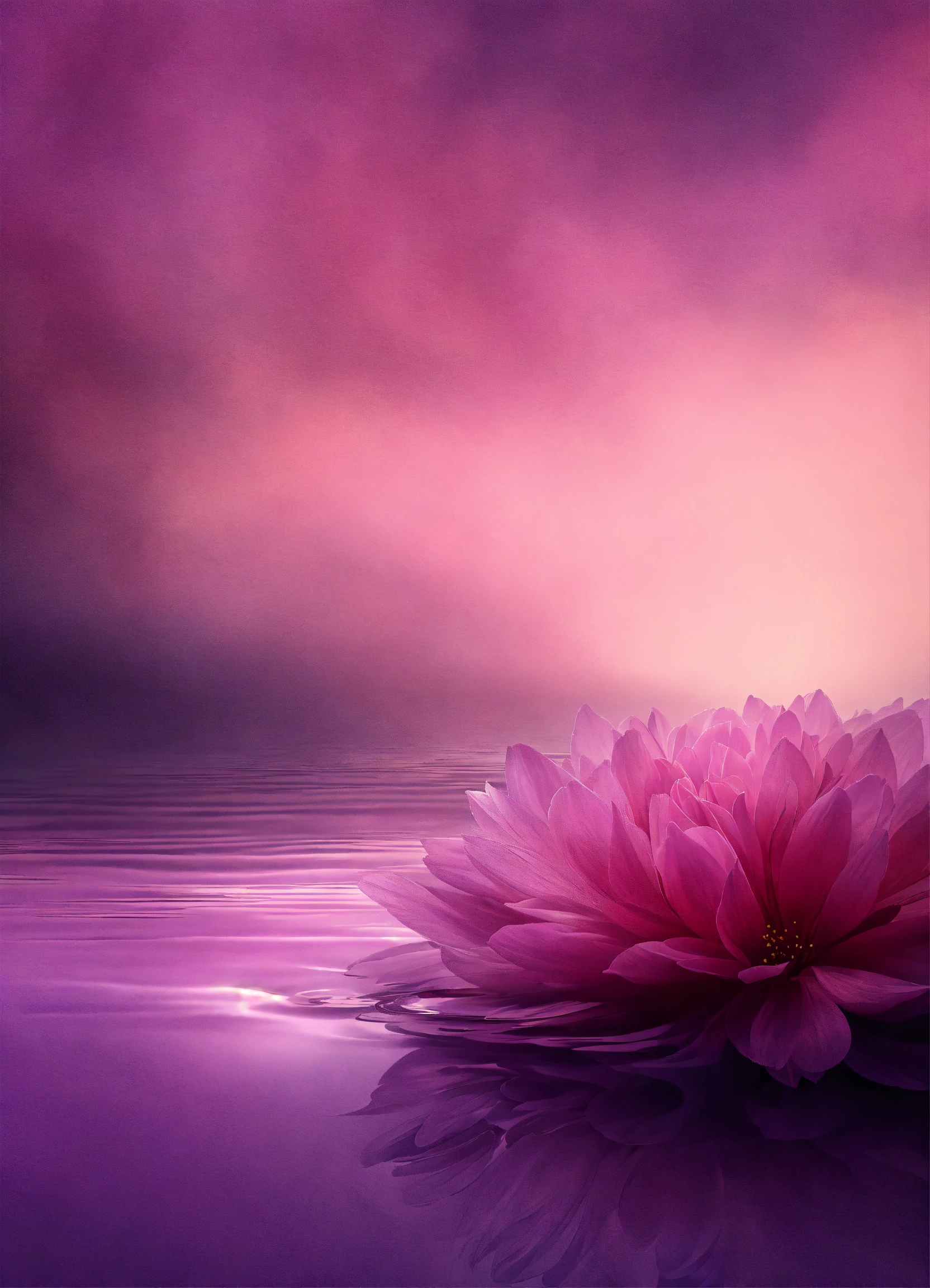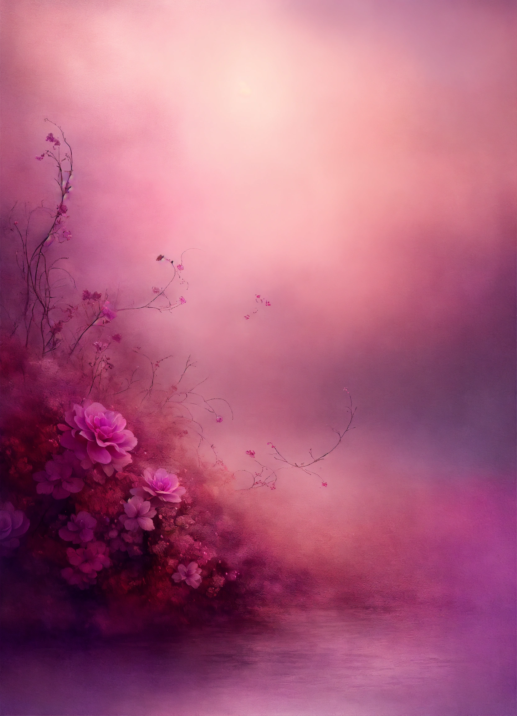 Abstract perfect background image, in the style of surrealistic dreamscapes, digitally enhanced, sparse use of color, soft shade of muted pink and dark purple, serene calm atmosphere, wedding theme, add flower