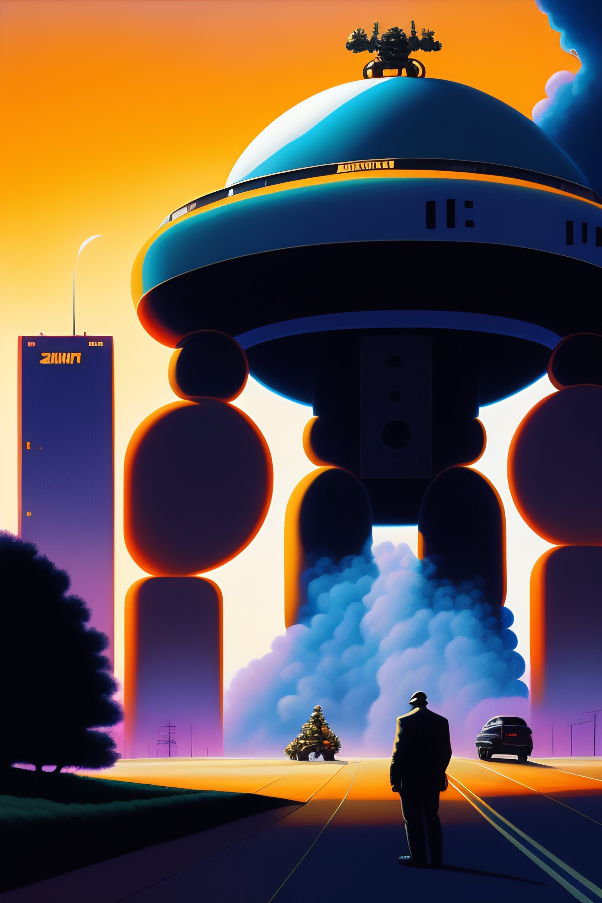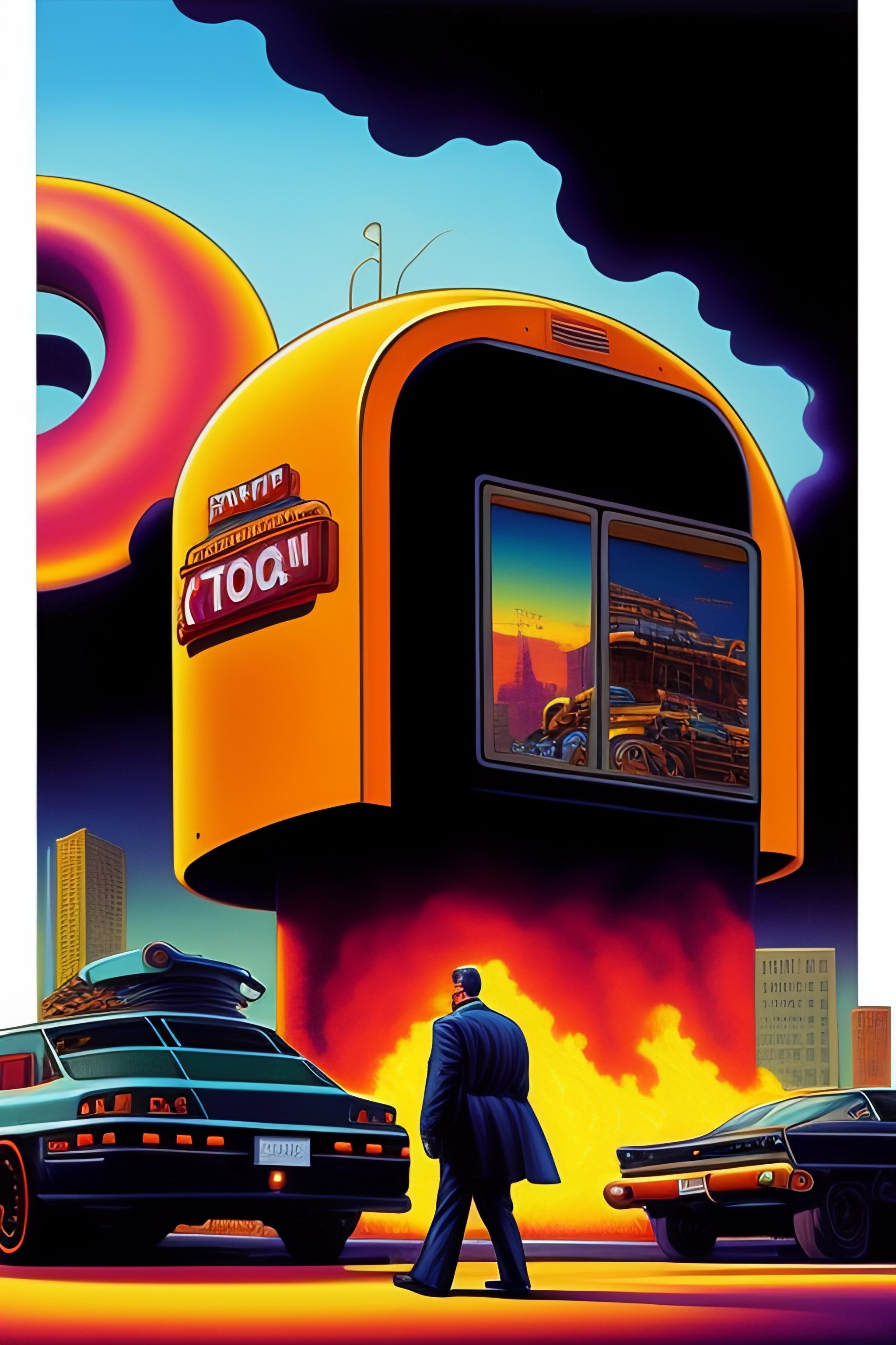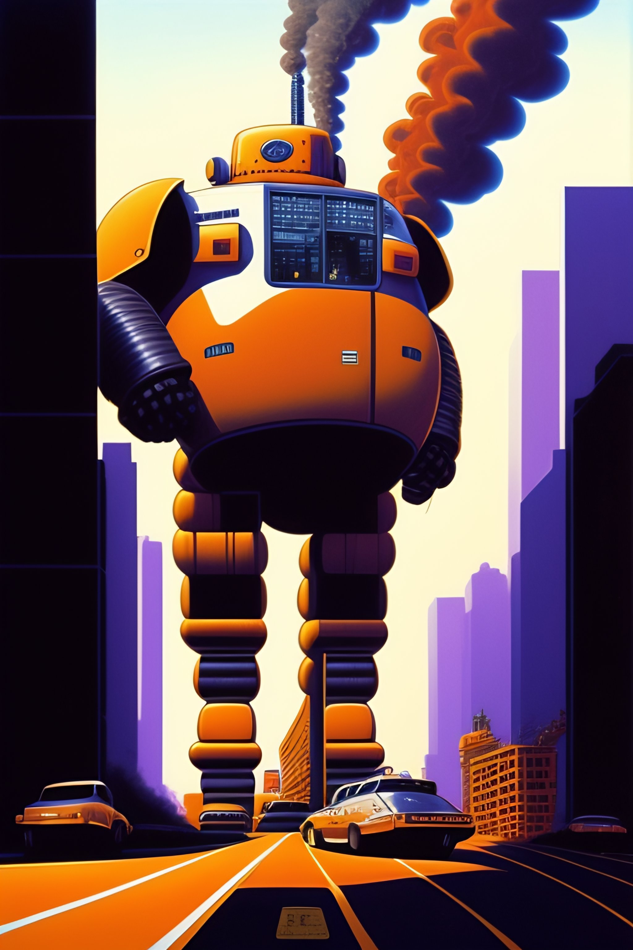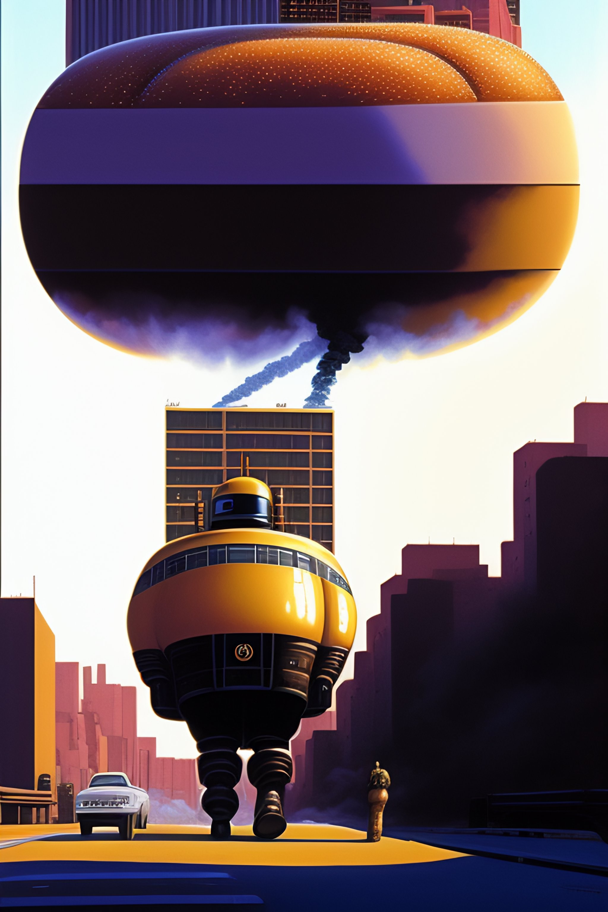 Giant robot walking down a street while eating a massive glazed donut almost as big as the robot, one of the buildings is on fire and smoking and a crushed car is under the foot of the giant robot by richard corben