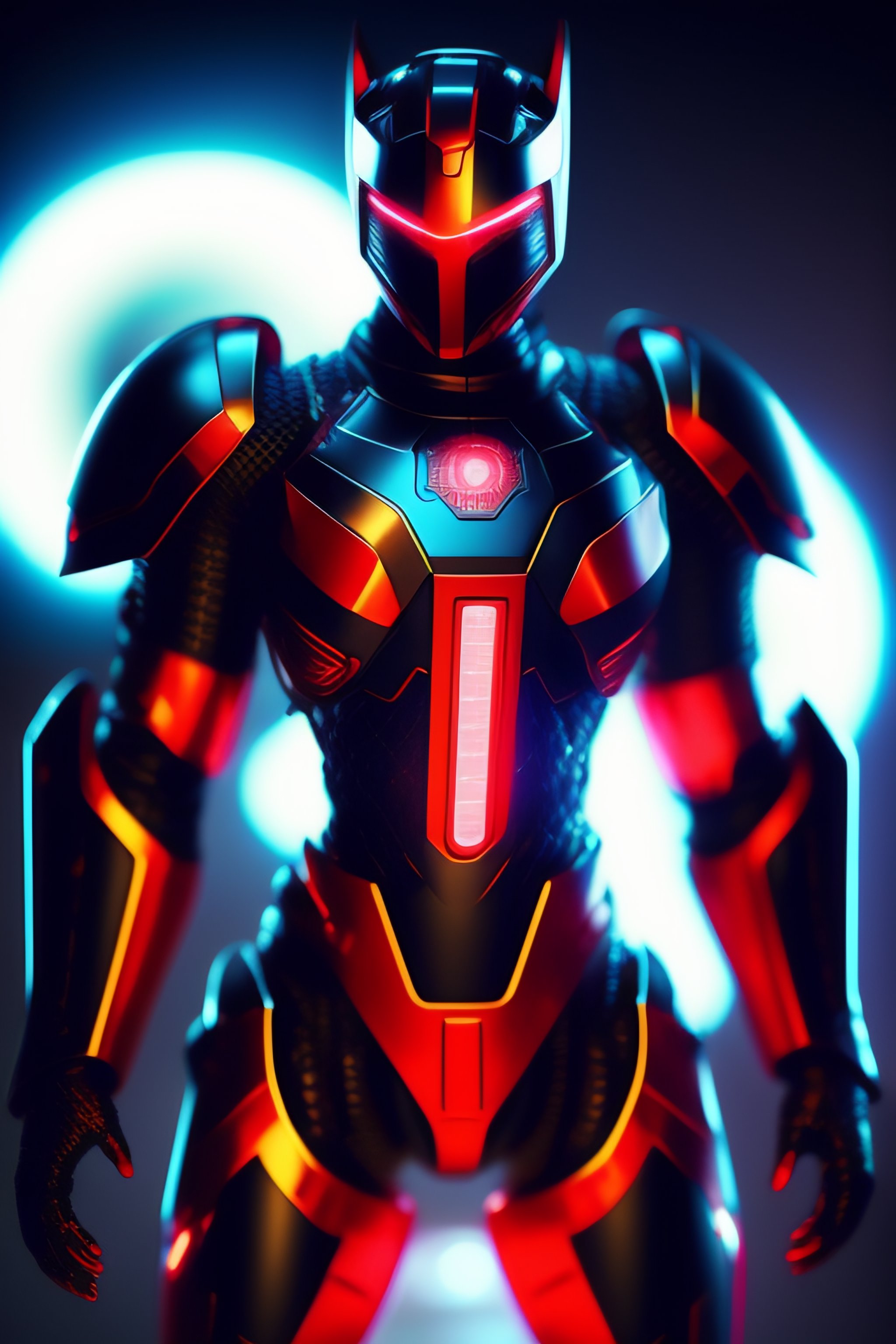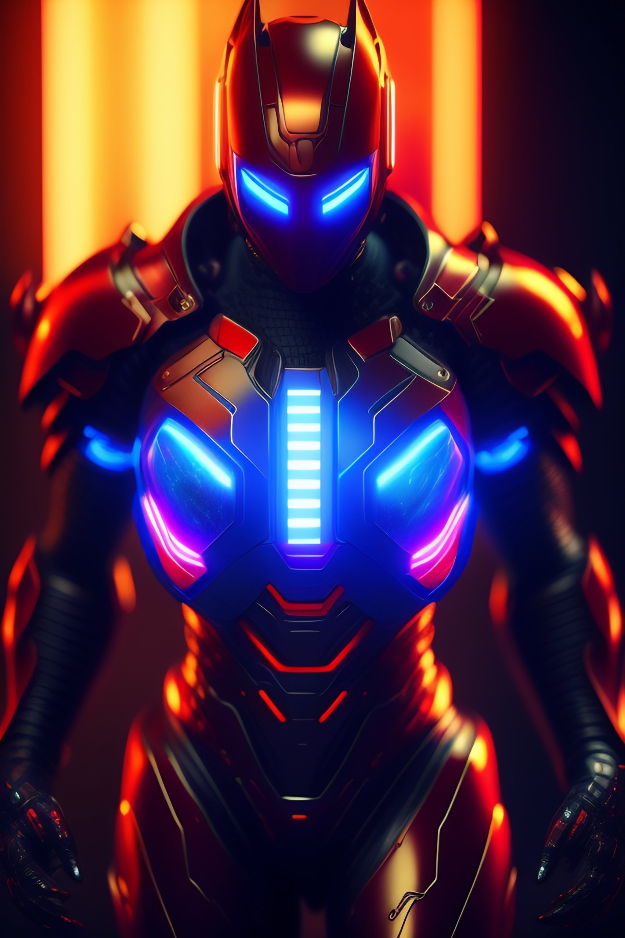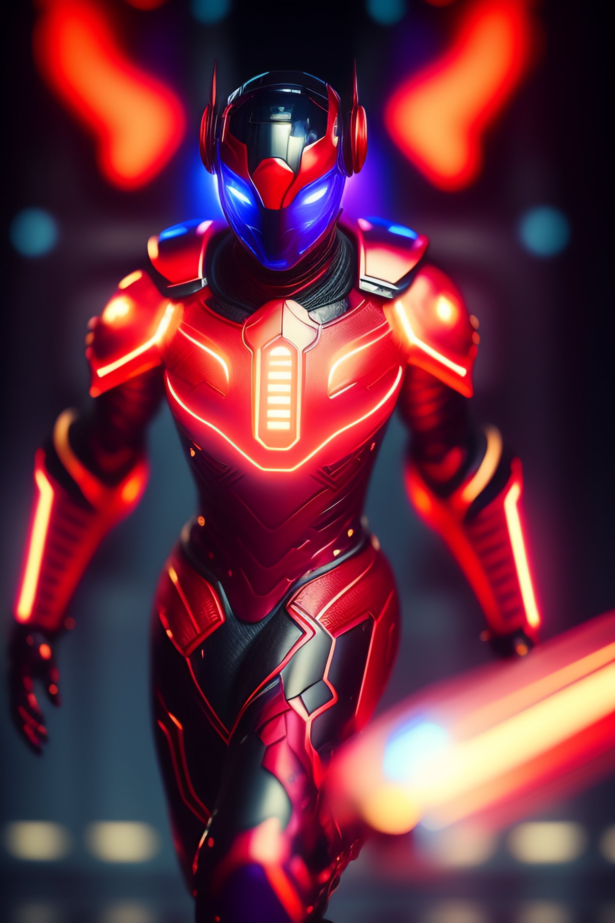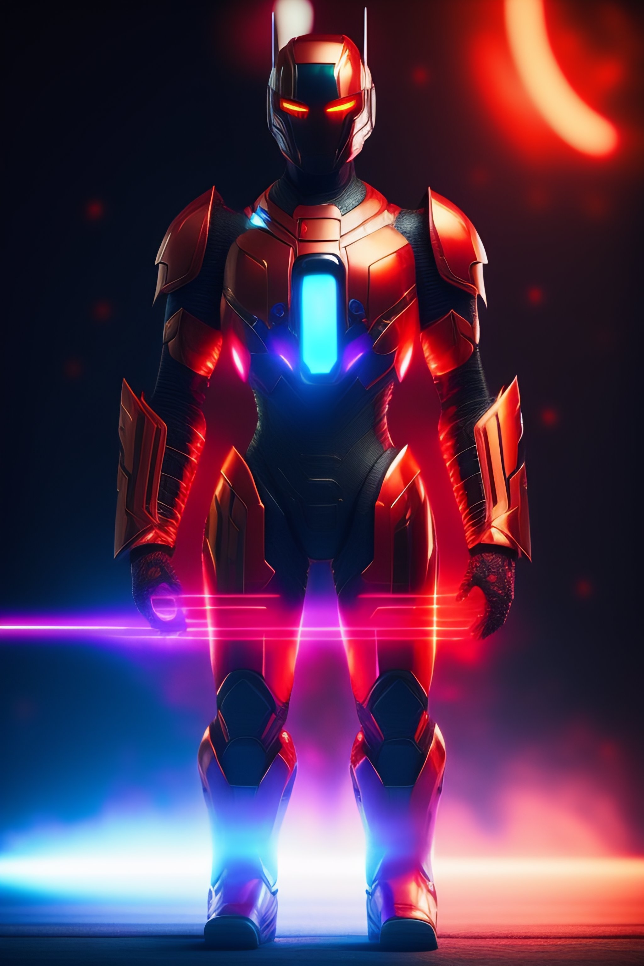 Evil nanite scientist, integrated robot nanites in his body, suit made out of nanites, red armor, blue glowing highlights, evil suit, claw for hand