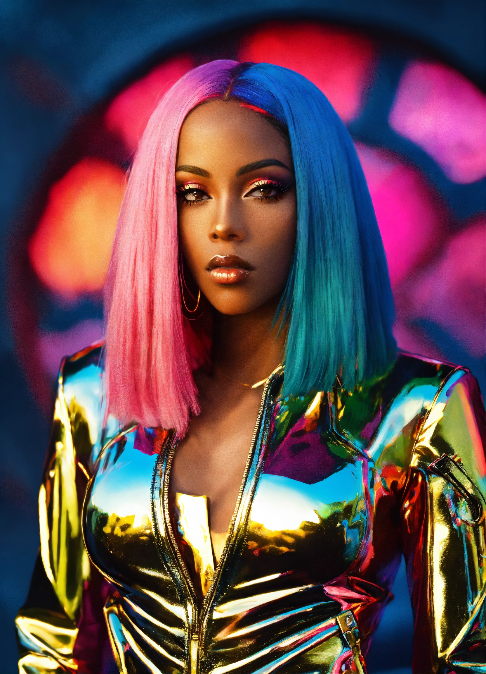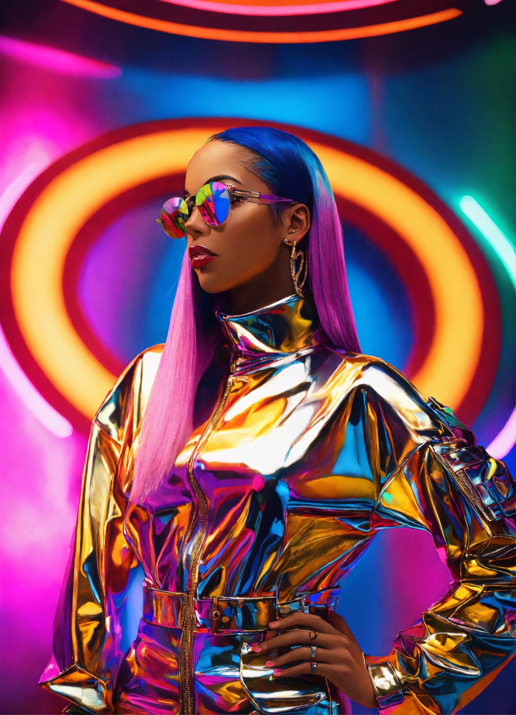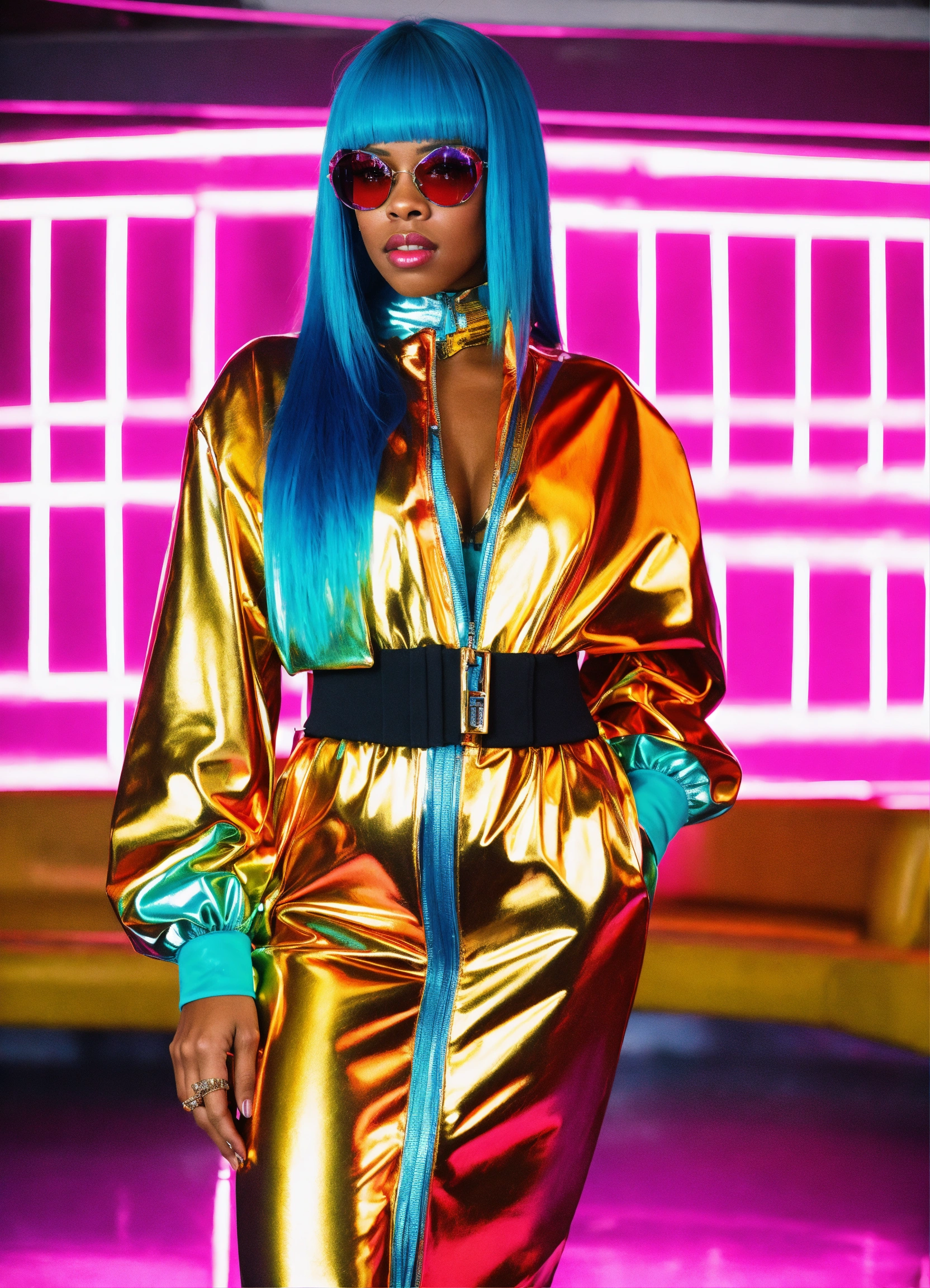 Aaliyah retro futuristic metallic style full outfit with colorful hair