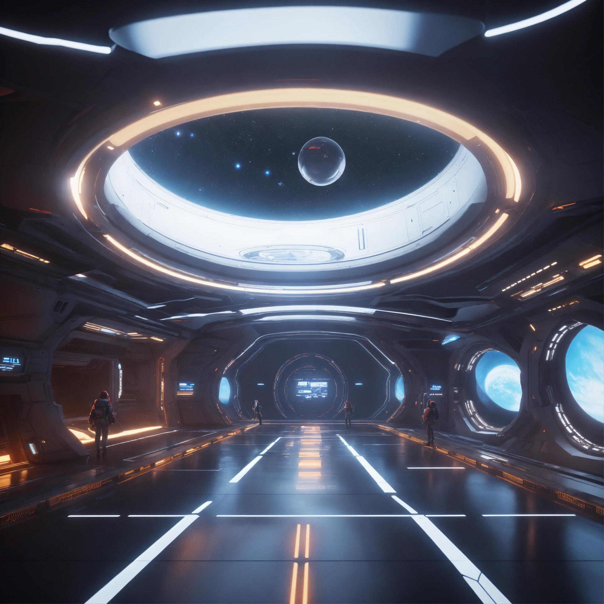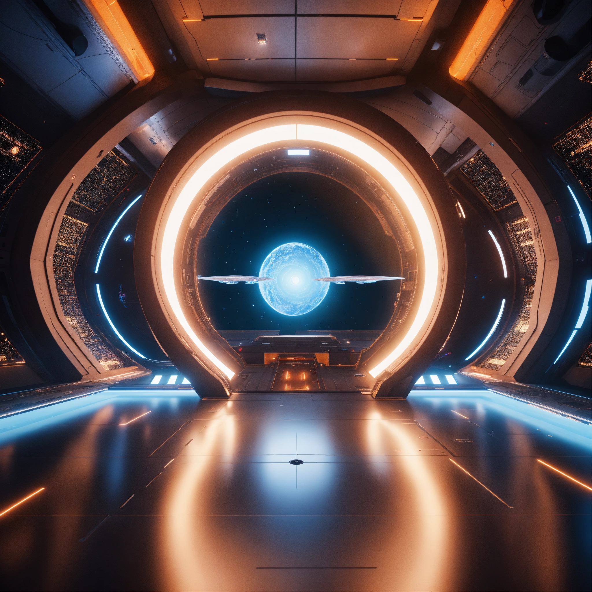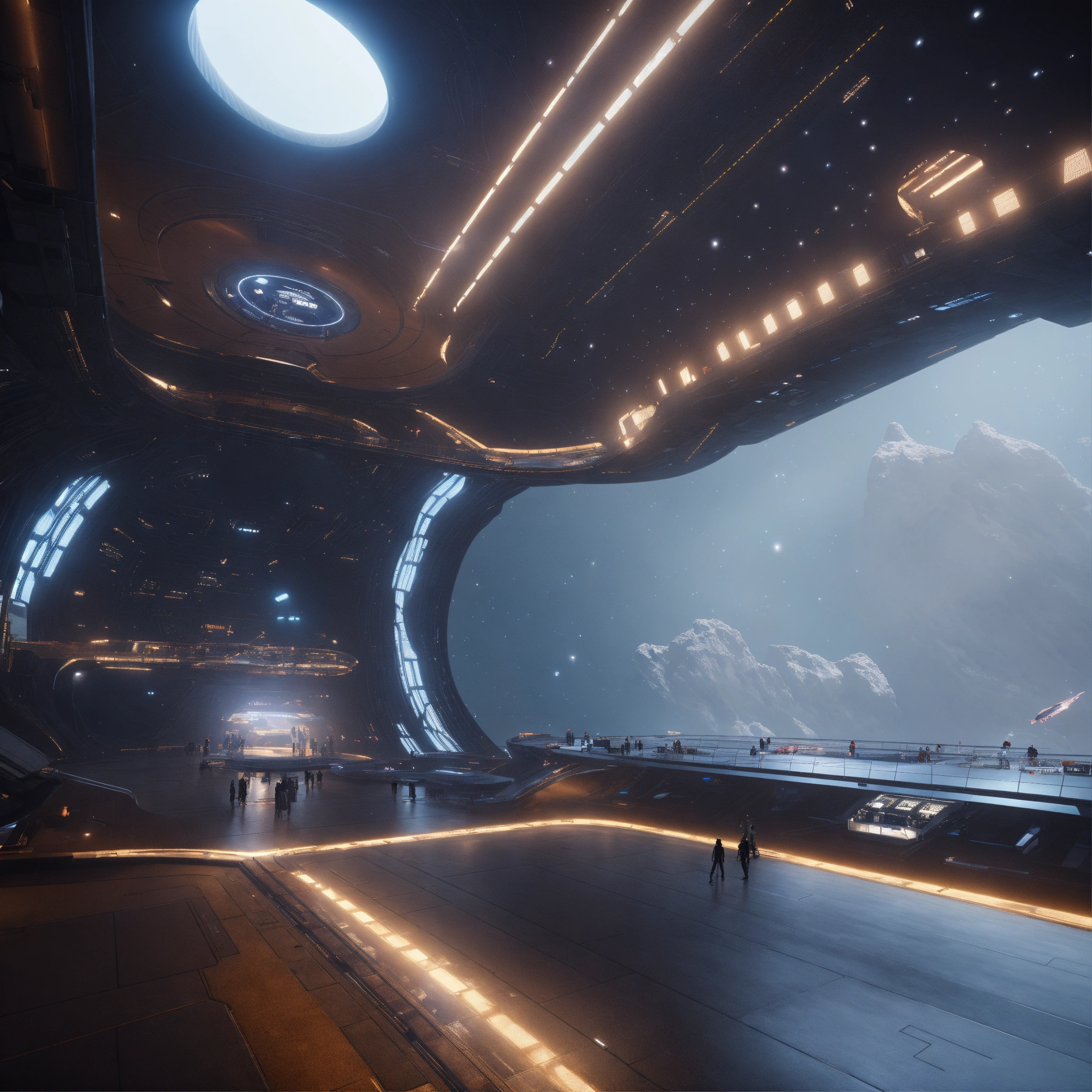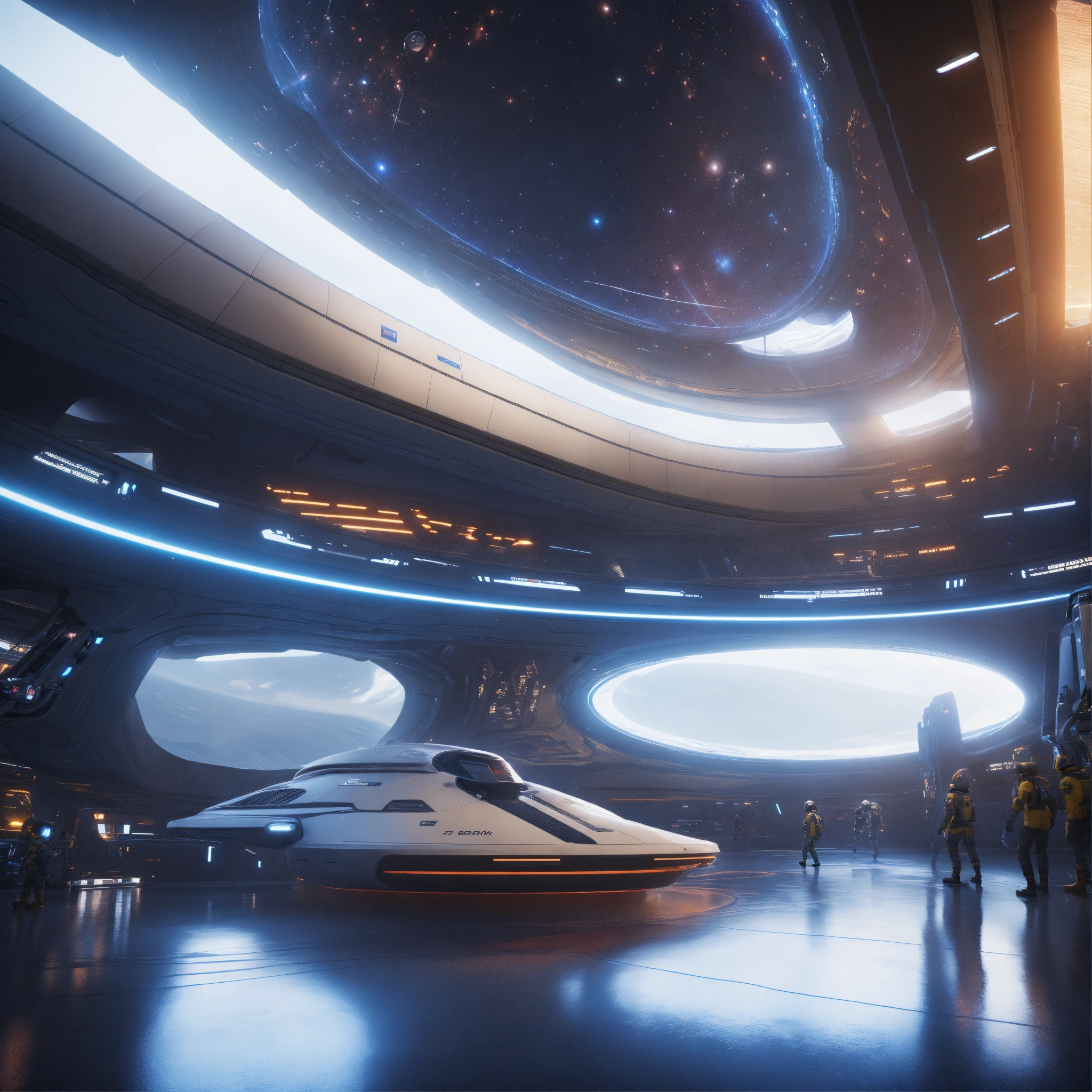 Entering the docking bay of a huge disc shaped spaceport floating in deep space, zaha hadid, futuristic, sci-fi, 8k, unreal engine, pixar