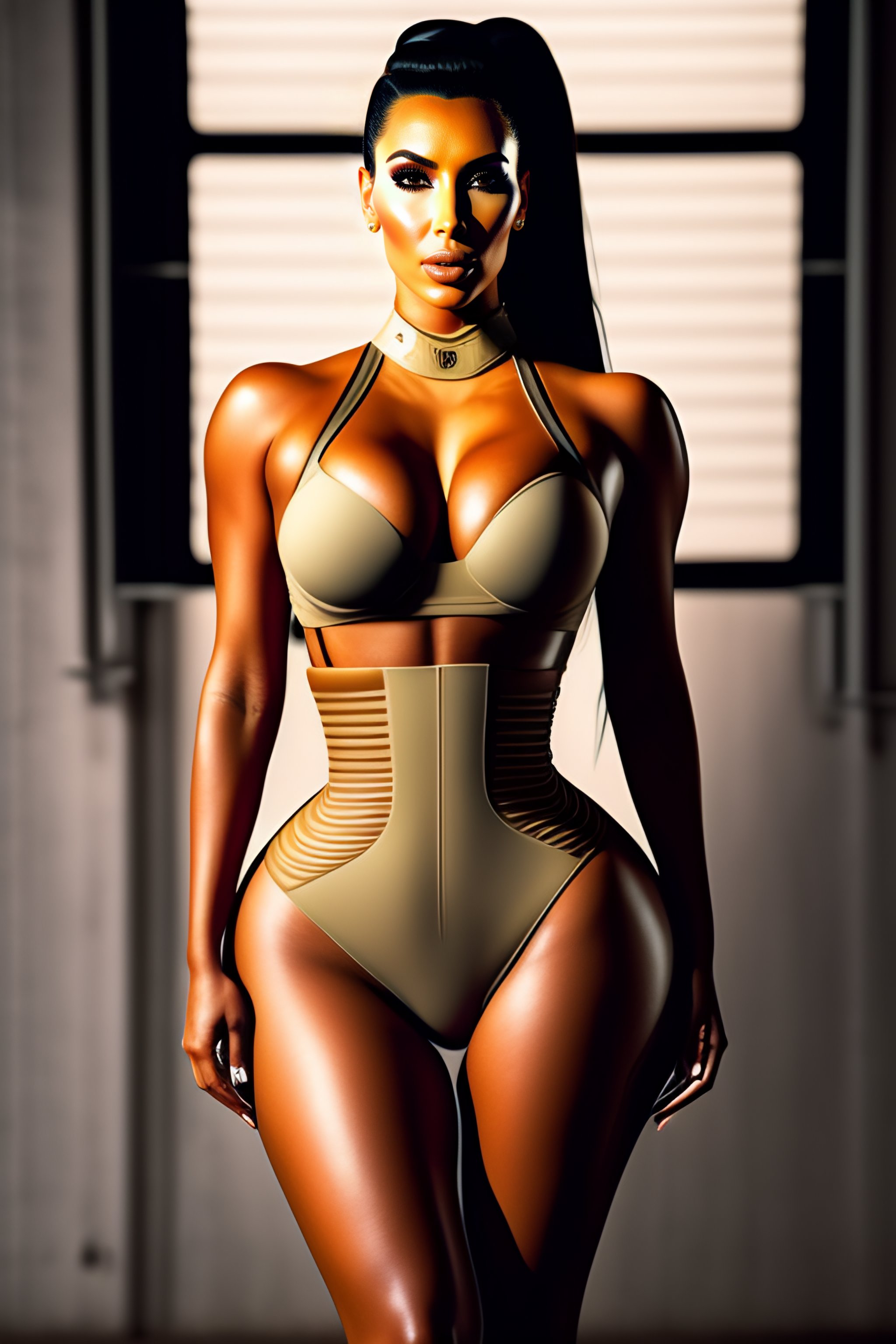 Kim kardashian perfect body, tight waist, skin tight uniform, bulky boots, dystopian futurism art, 1988 product photography, plain background
