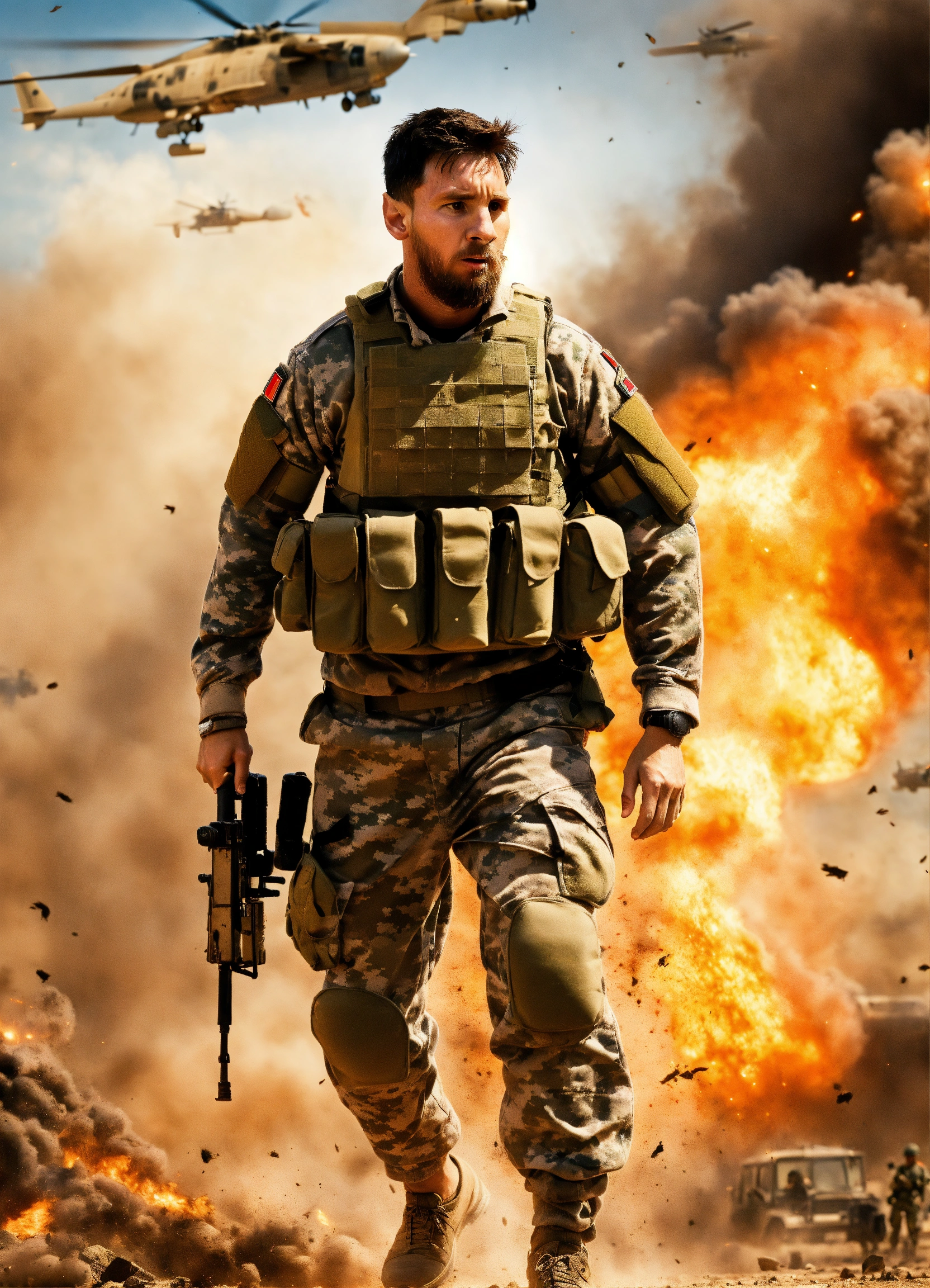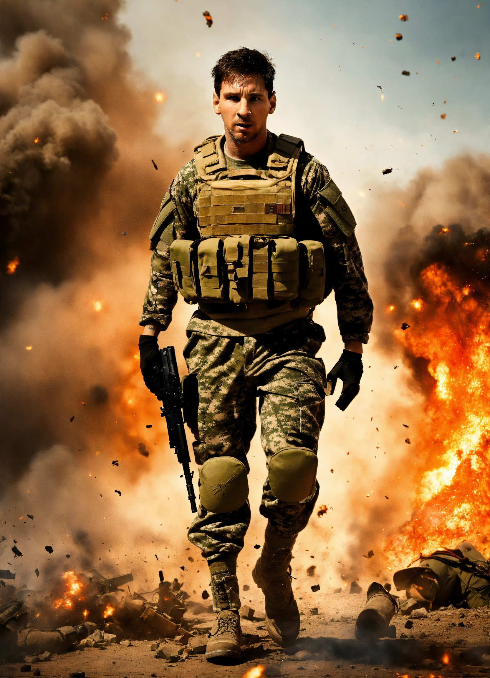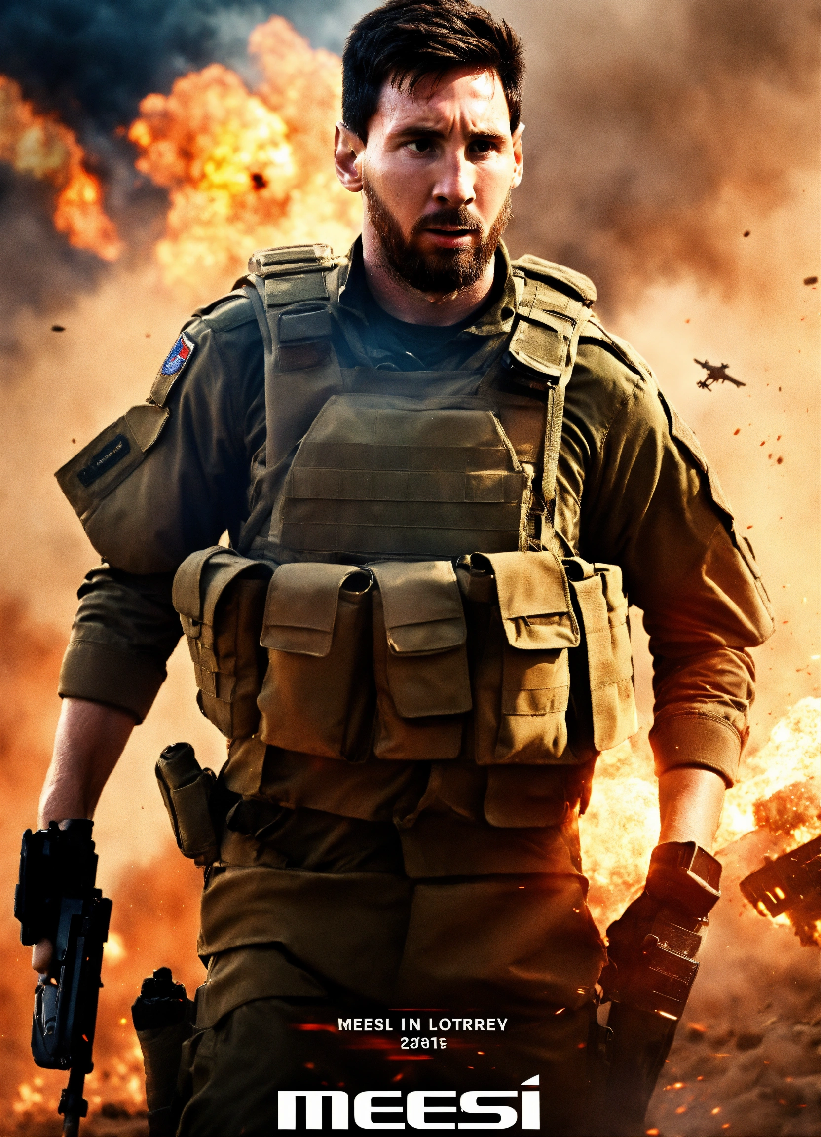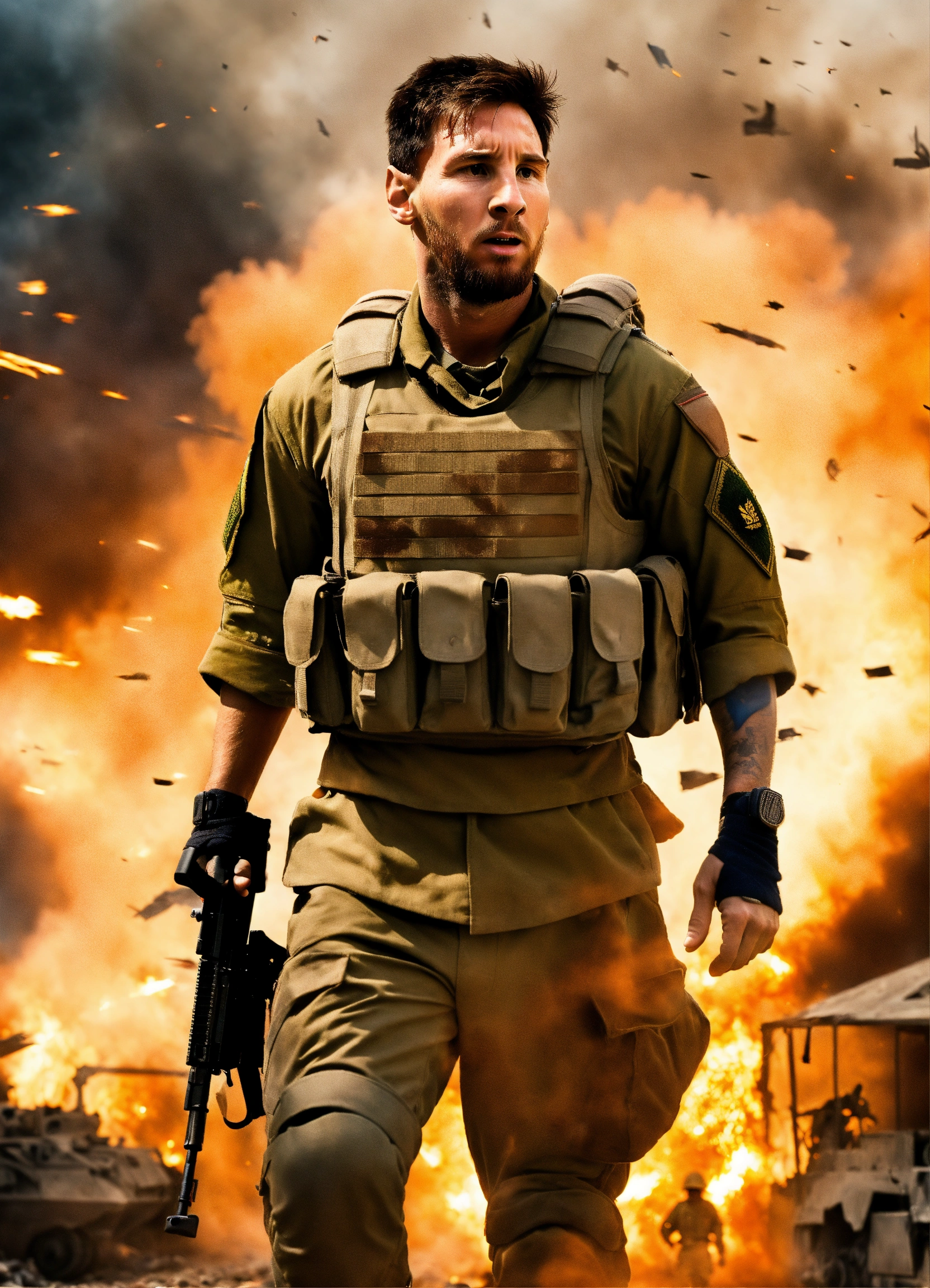 Messi in israeli soldier uniform, in the midst of a battle scene, a soldier stands determined. the background is blurred, capturing the chaos of war, with flying ember particles adding to the intensity of the moment.