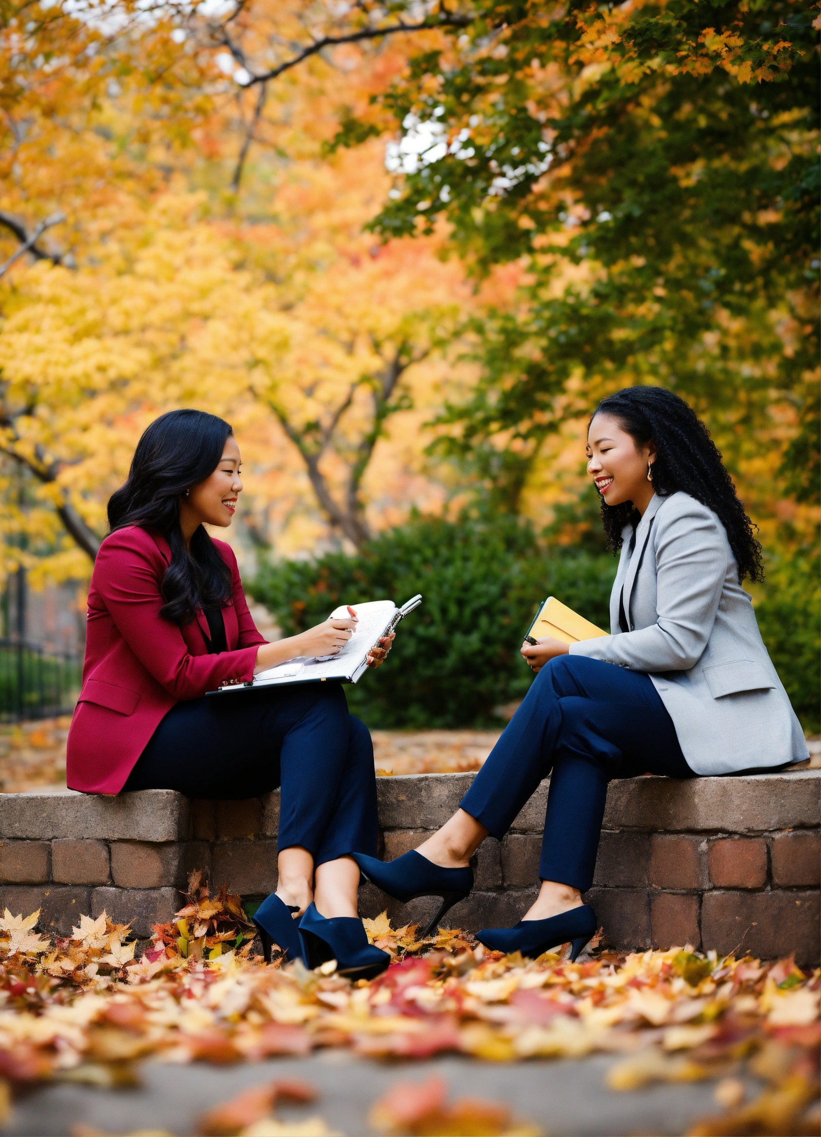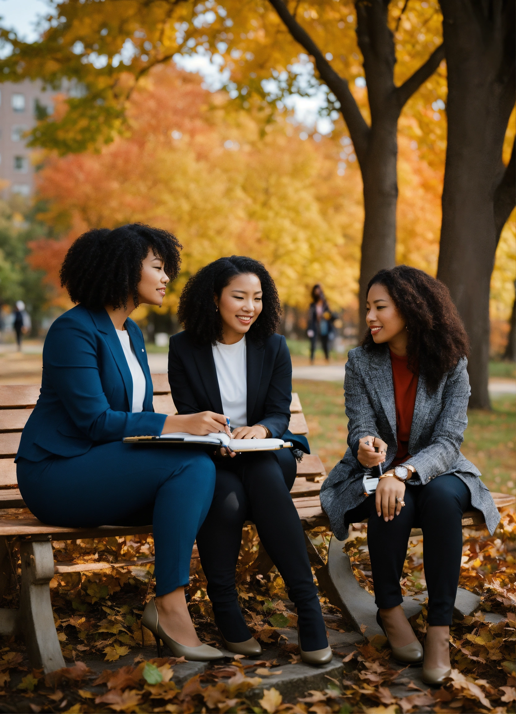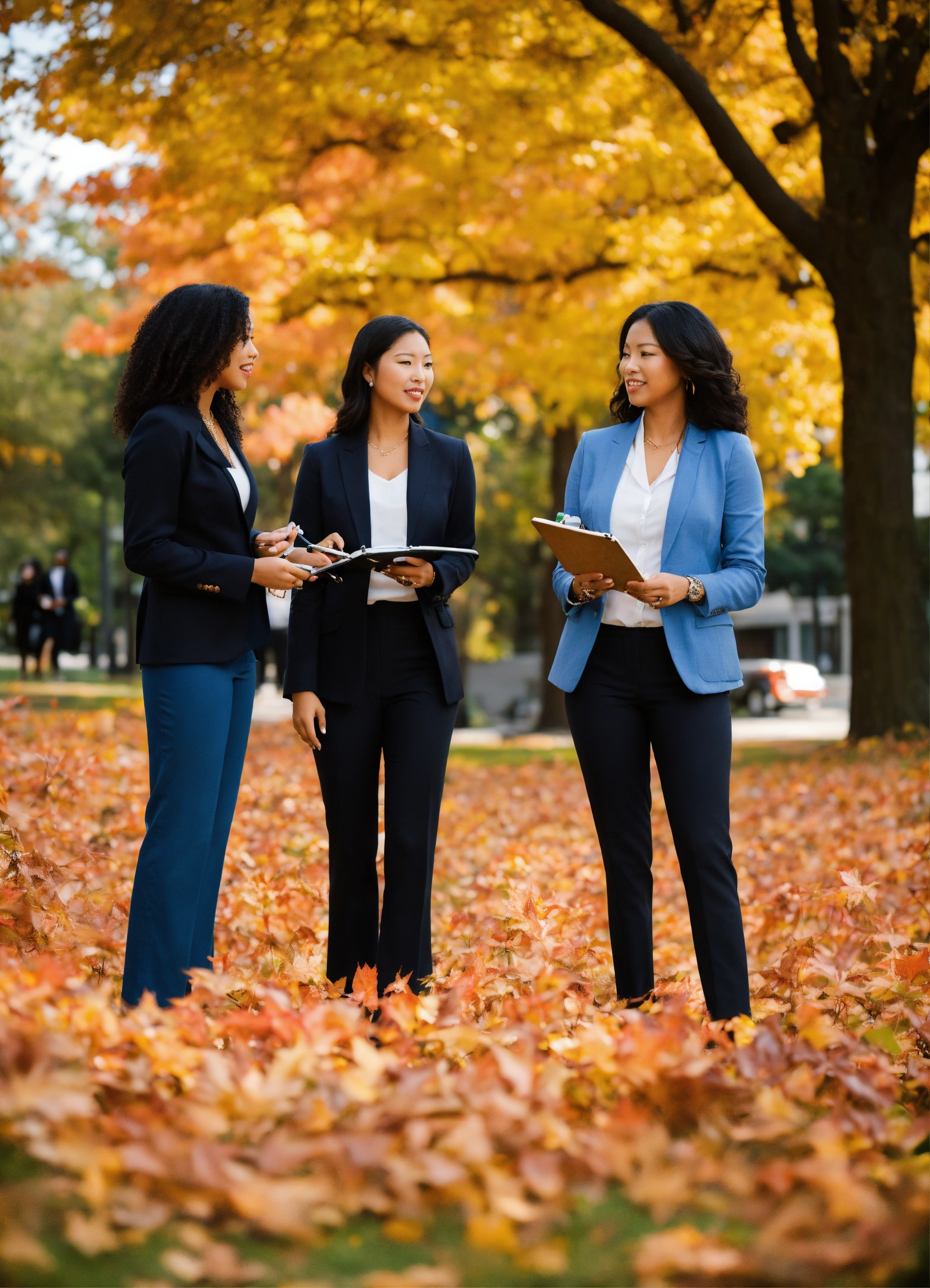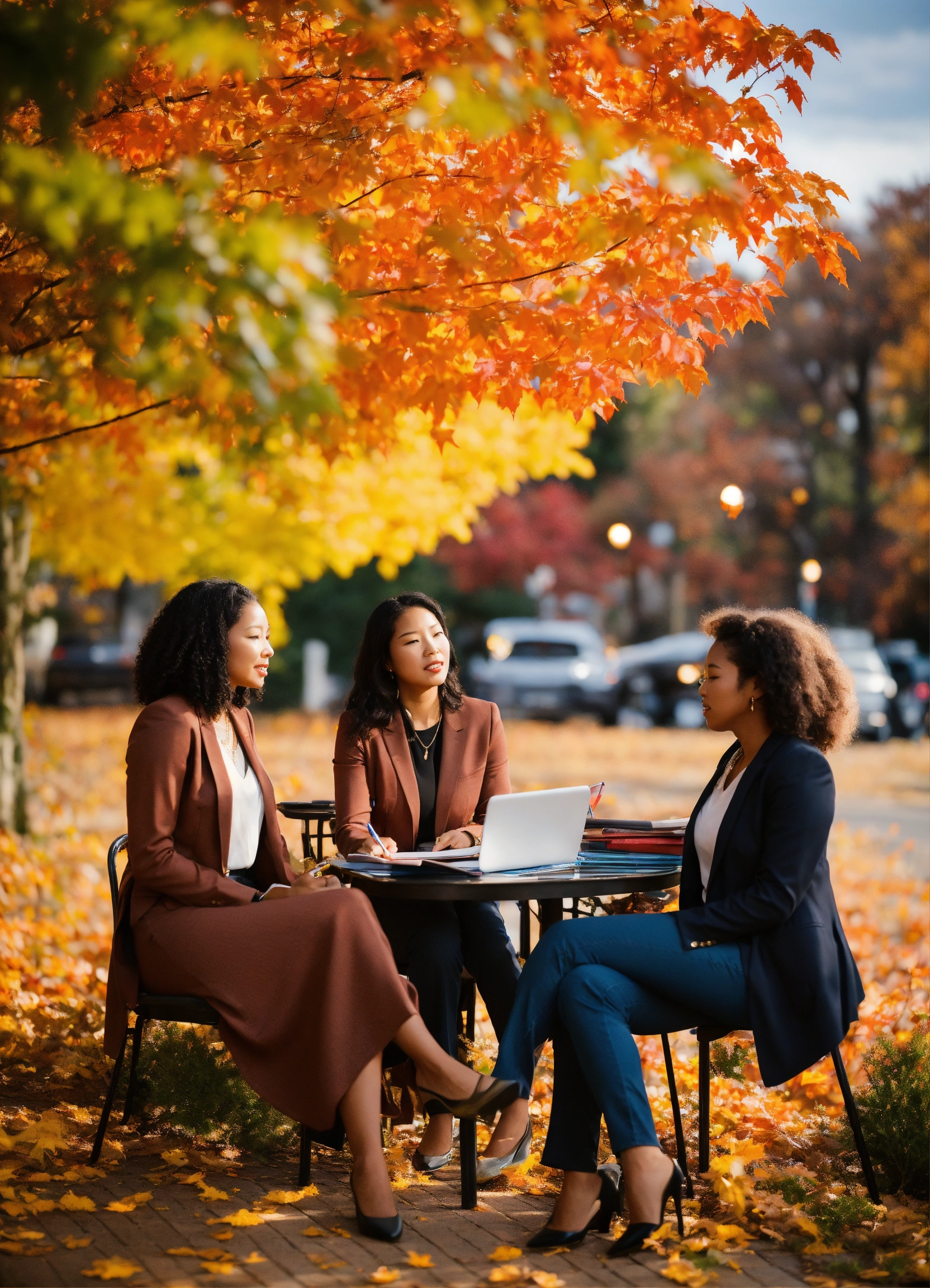 High quality candid photo of three professional women of diverse ethnic backgrounds conversing together outdoors amidst fall foliage. woman 1 is asian, wearing a black blazer and slacks, holding a notebook and pen woman 2 is african american, wearing business casual dress, resting hand thoughtfully on chin woman 3 is latina, wearing a blazer and jeans, gesturing expressively the women appear connected, supportive, and actively engaged in discussion. the fall leaves and colors create warmth and reinforce the theme of change and transitions. this visual conveys women coming together across backgrounds for community, advice, and empowerment.