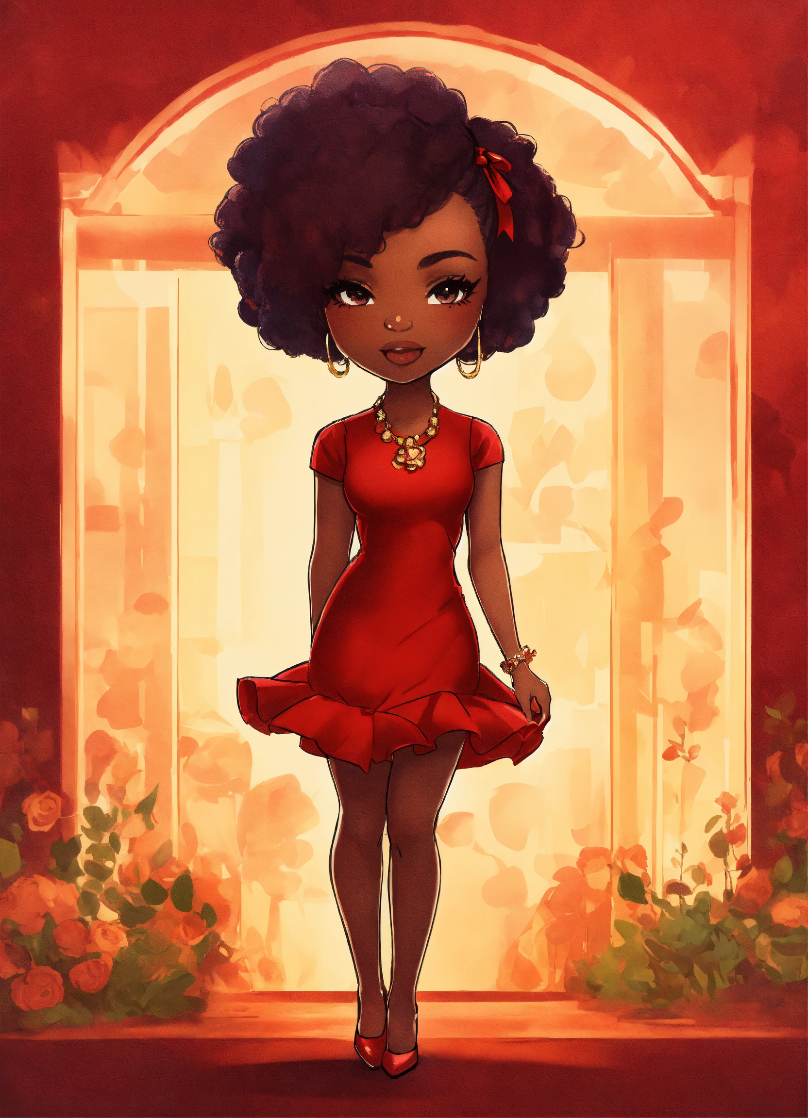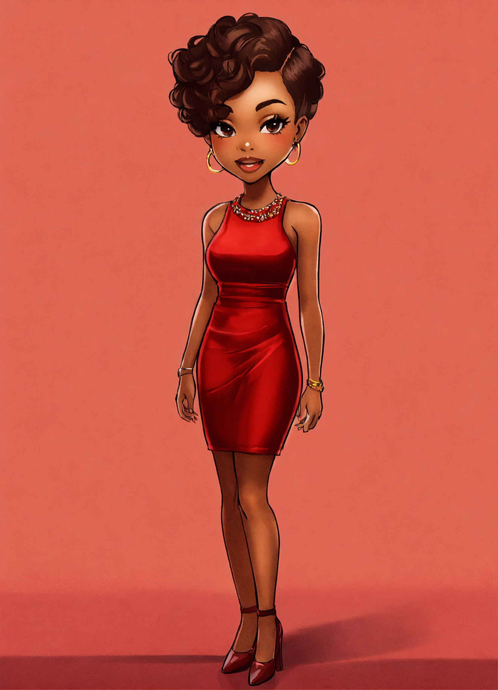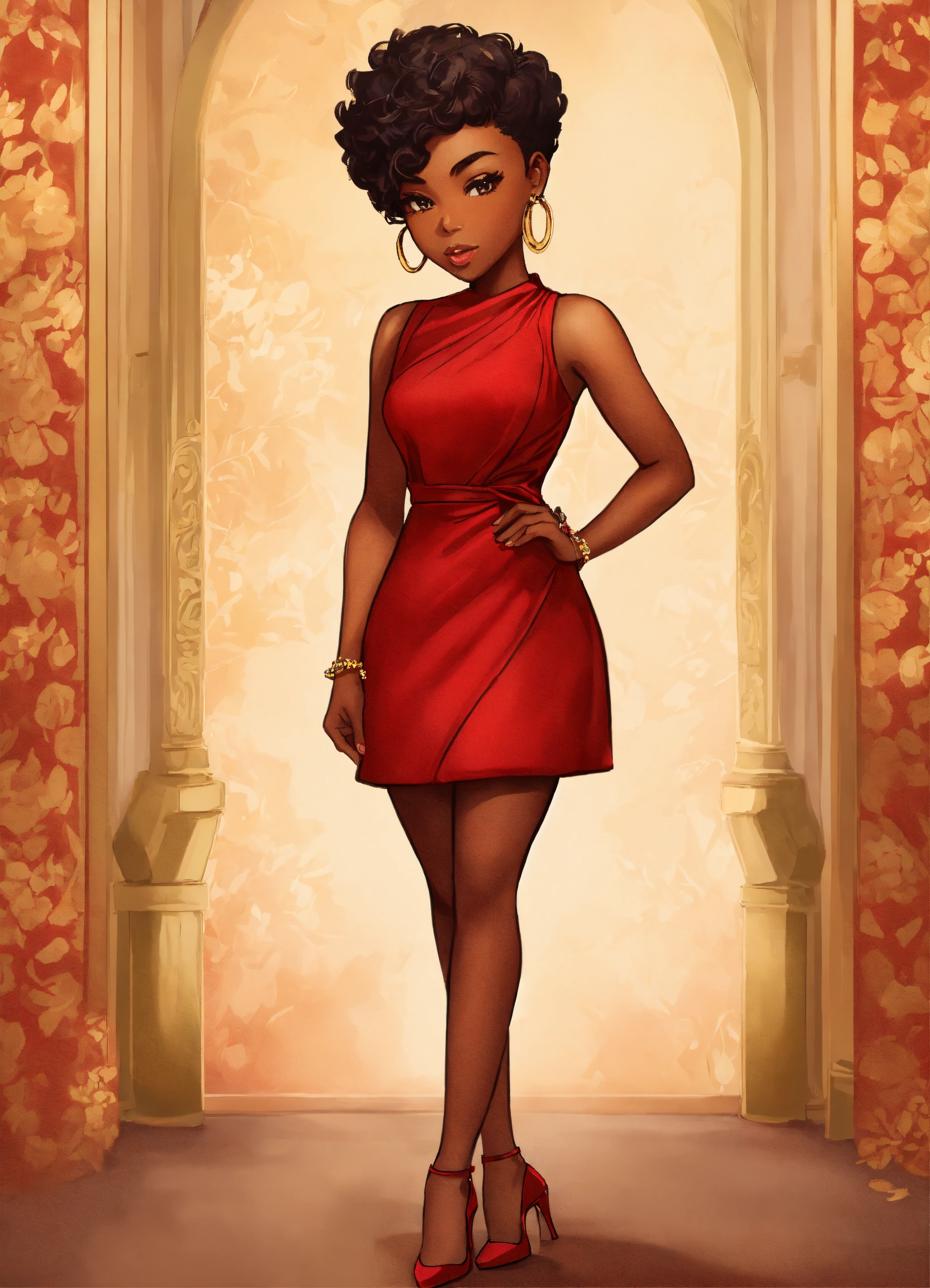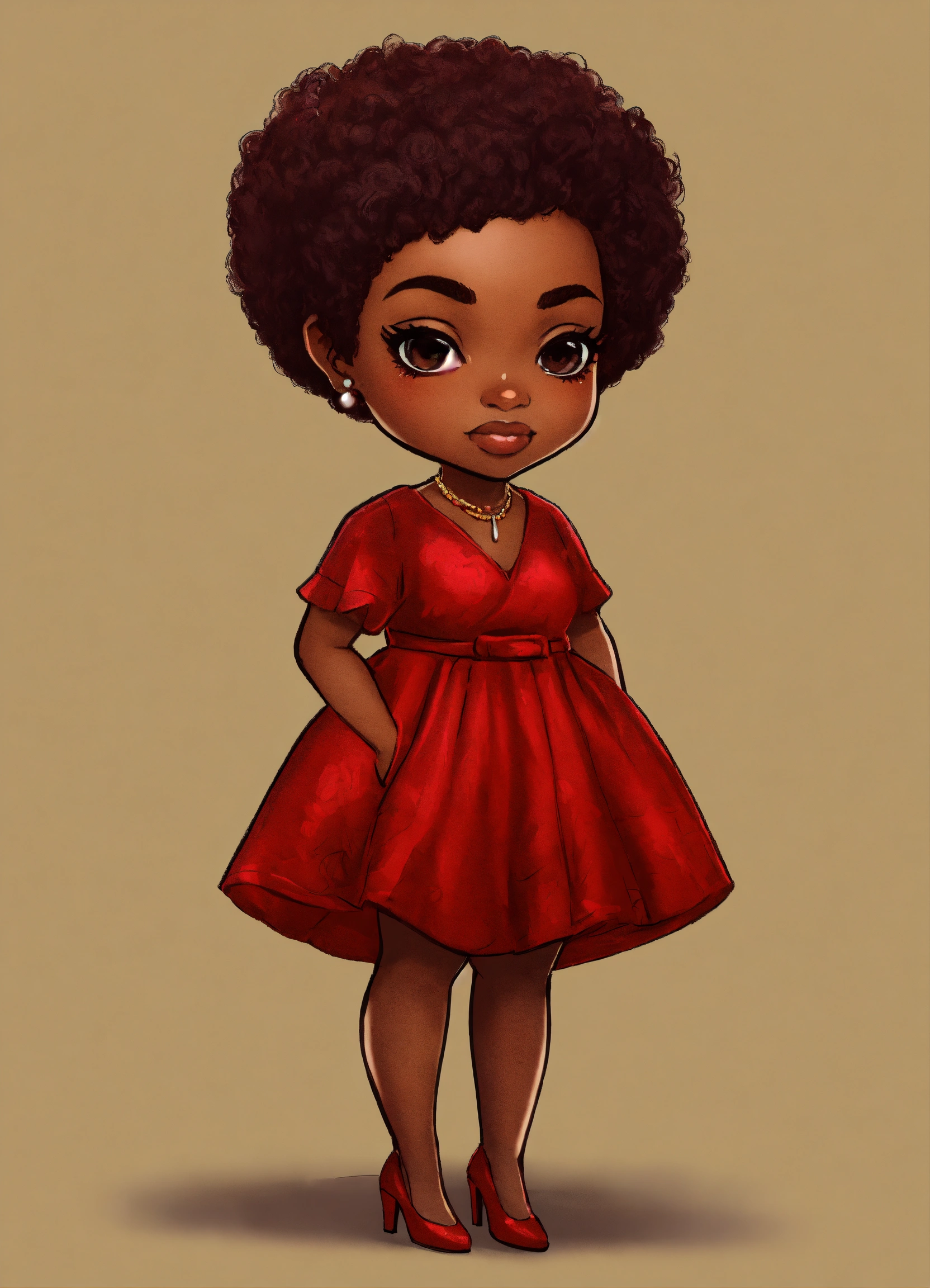 Digital illustration of a sophisticated chibi african american woman with a pixie cut, wearing a red velvet dress. full body.