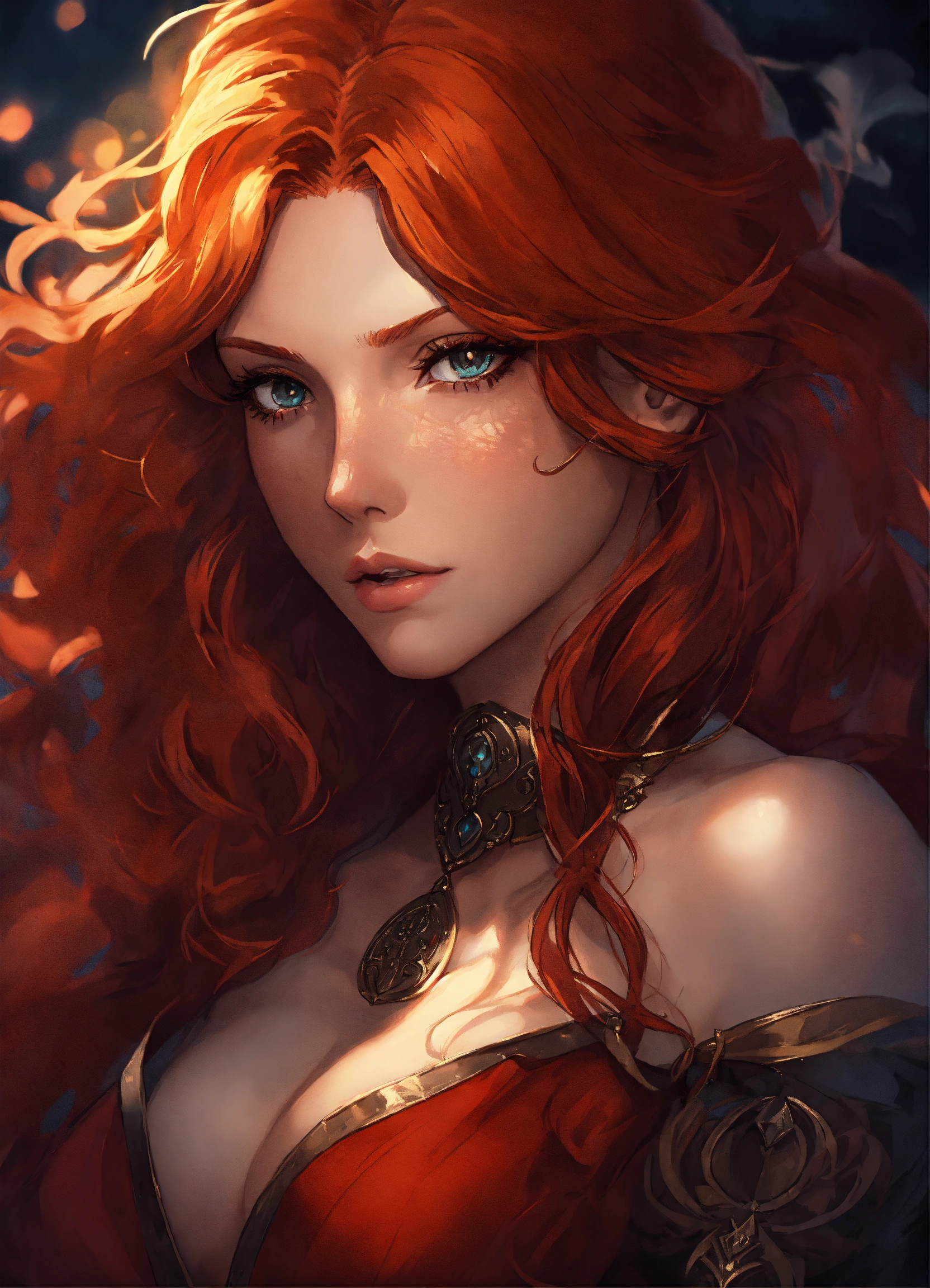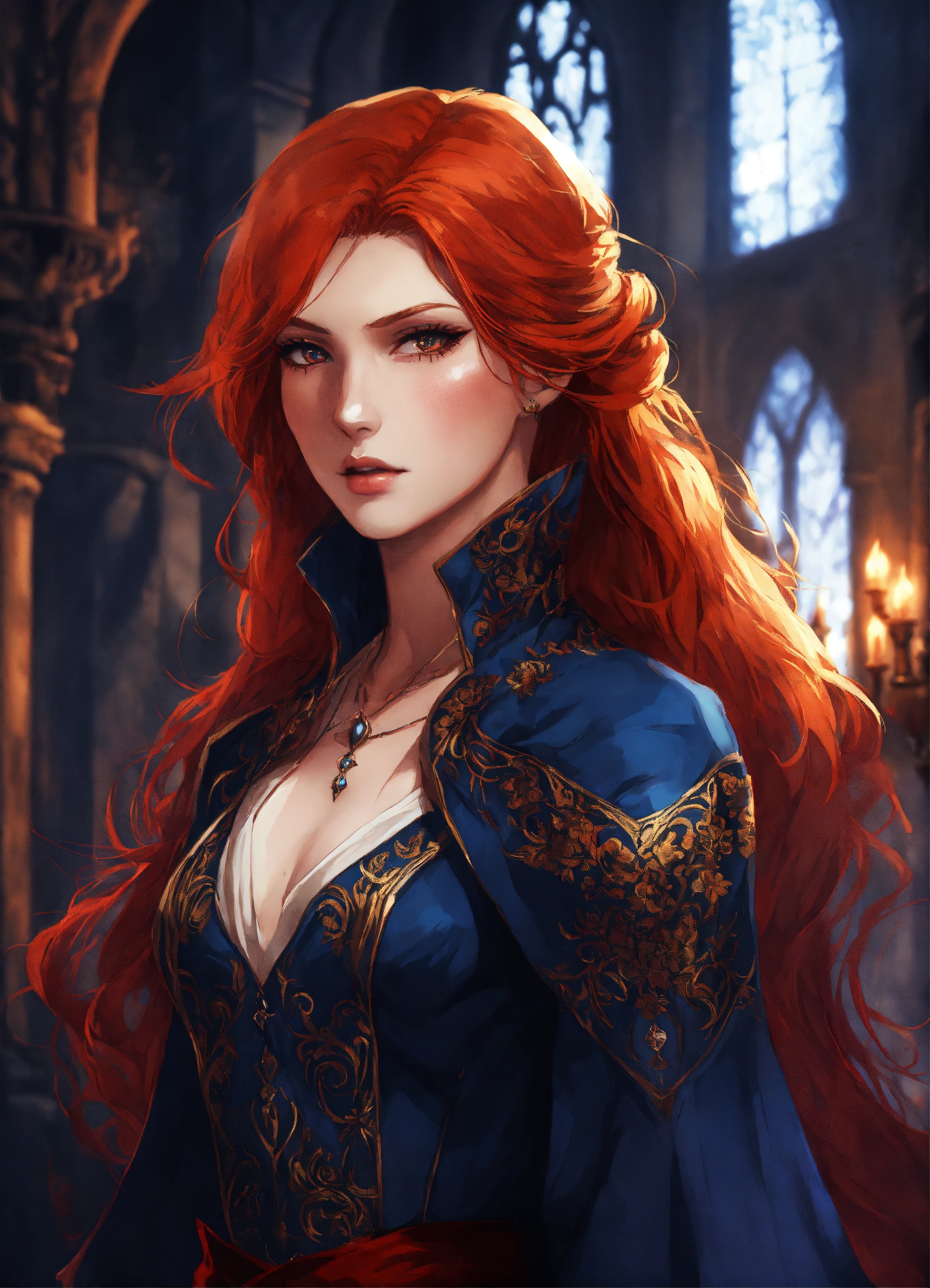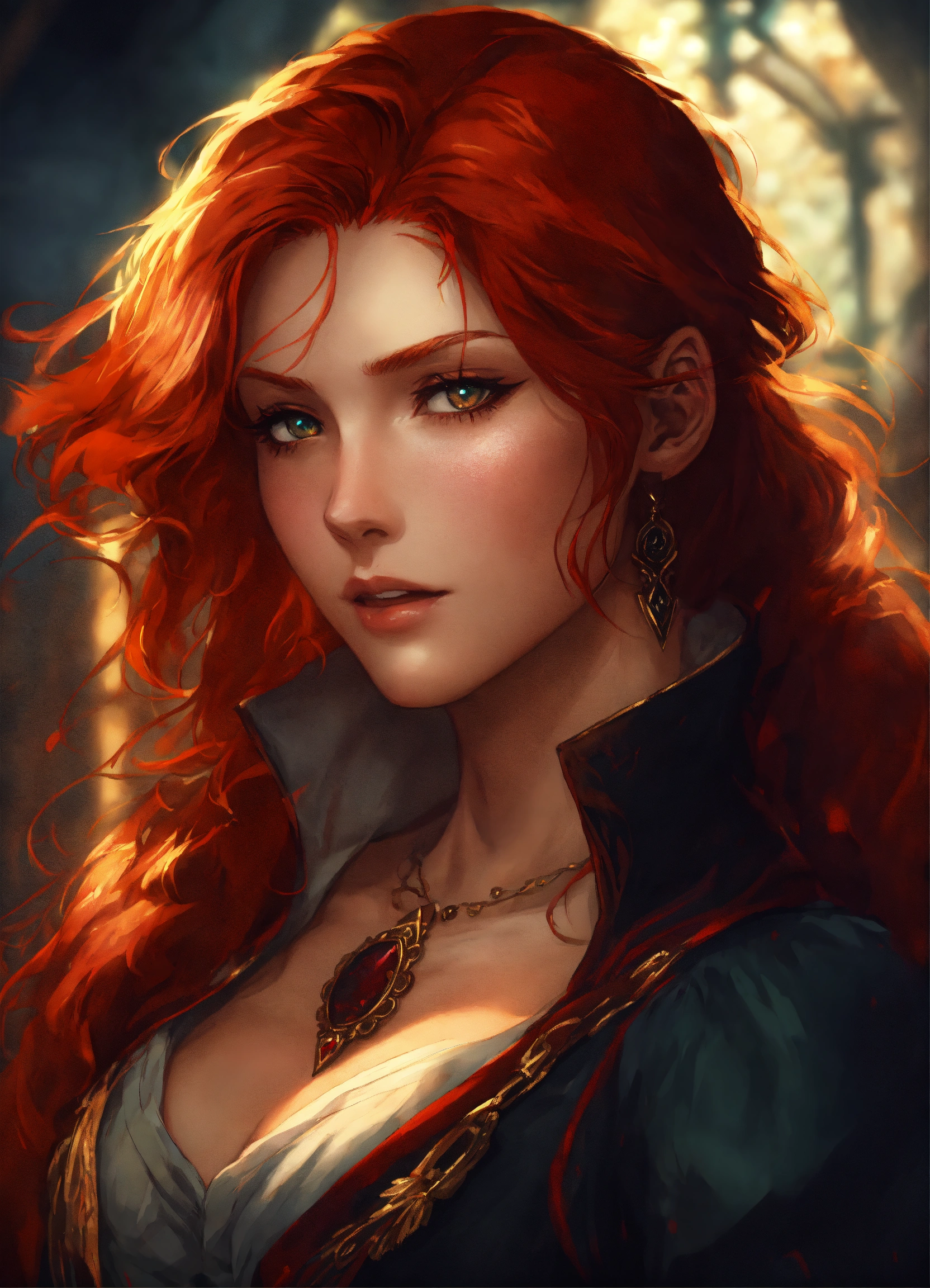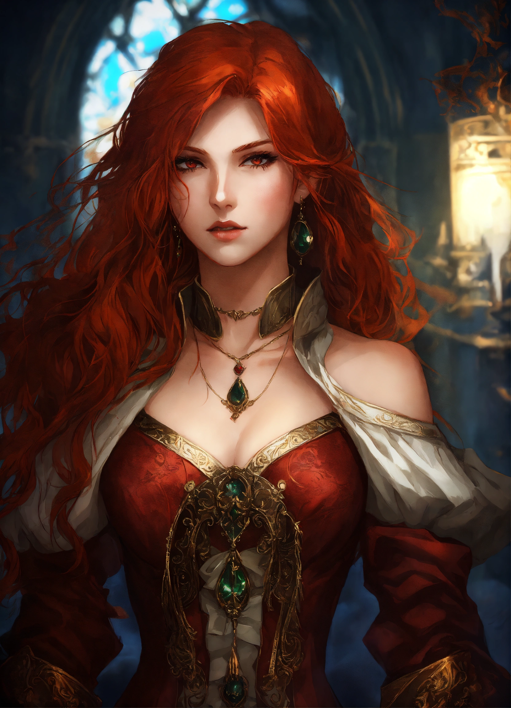 Beautiful redhead woman, castlevania artwork, alluring, beautiful face, intricate, moody lighting, anime