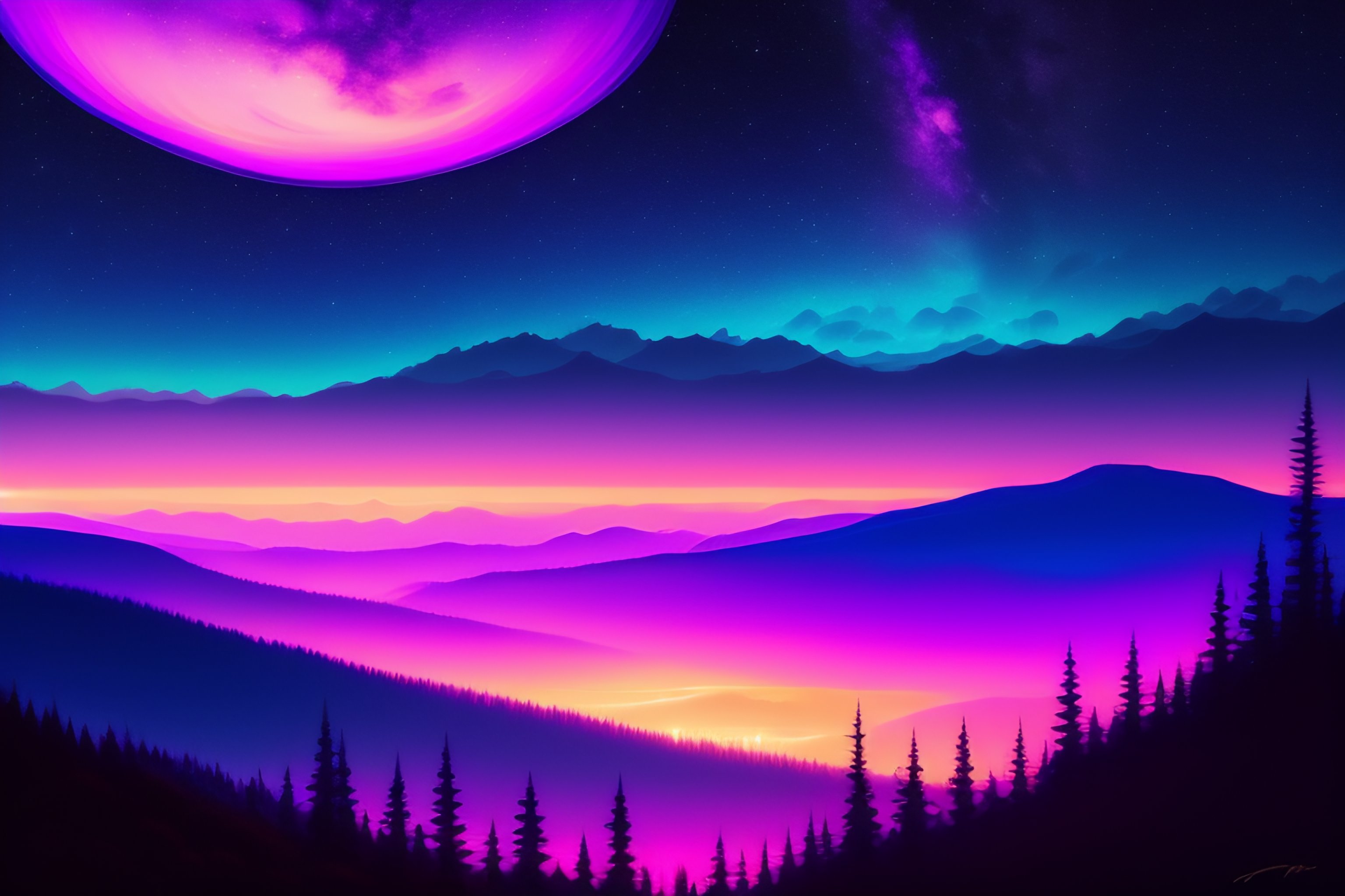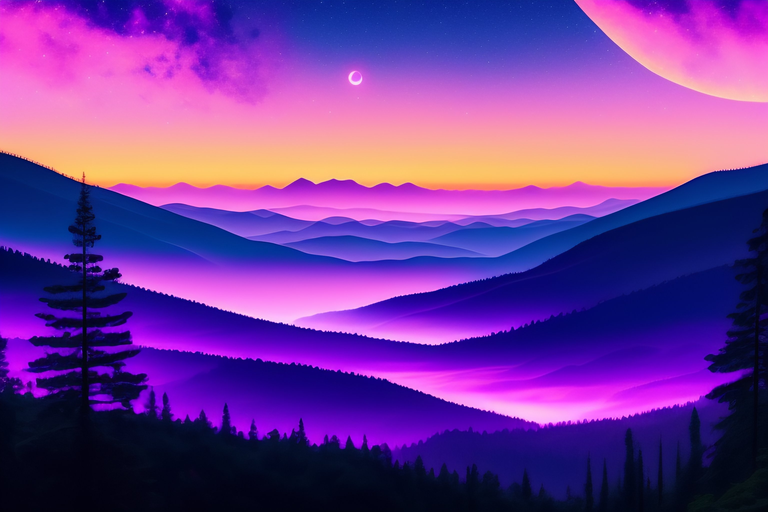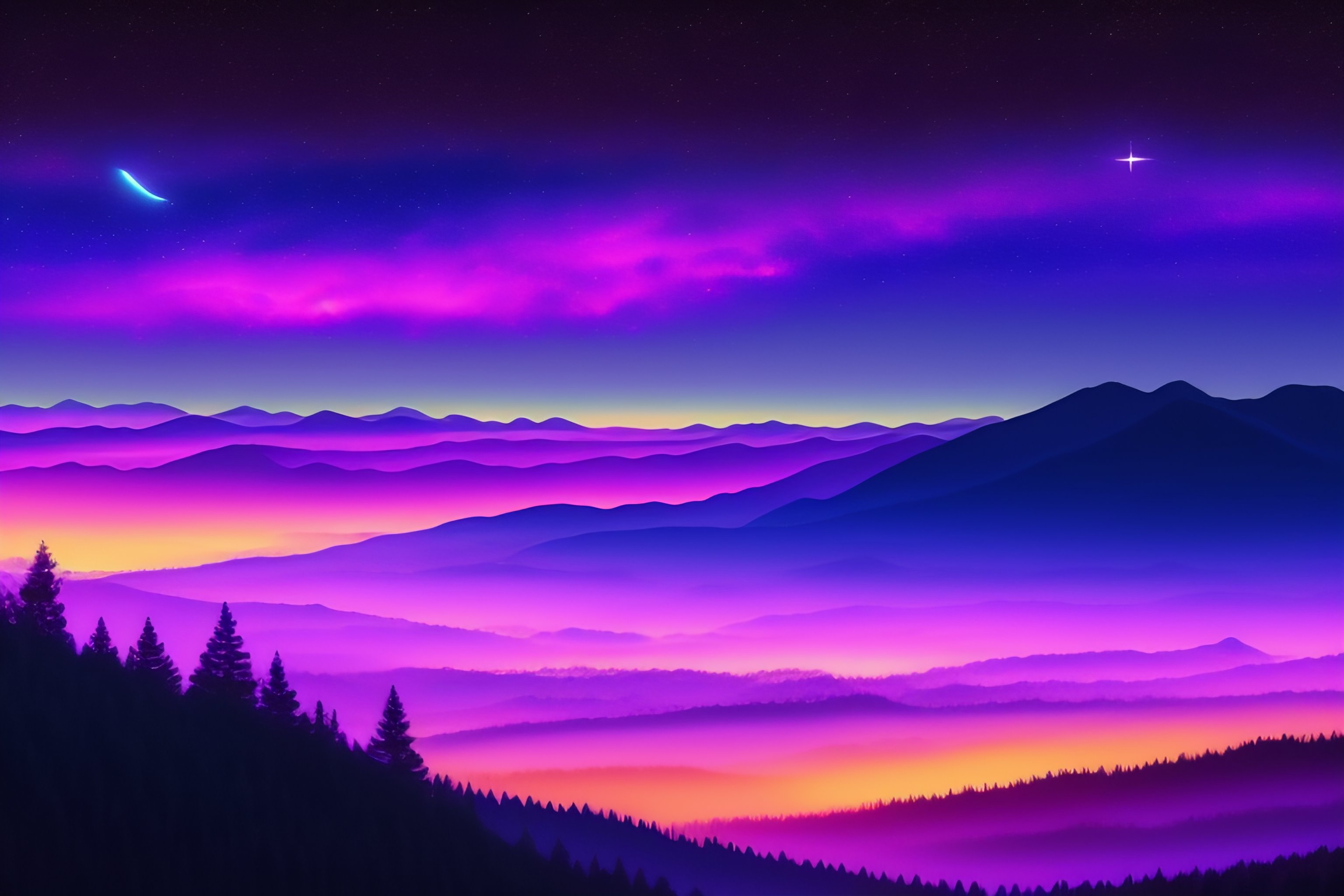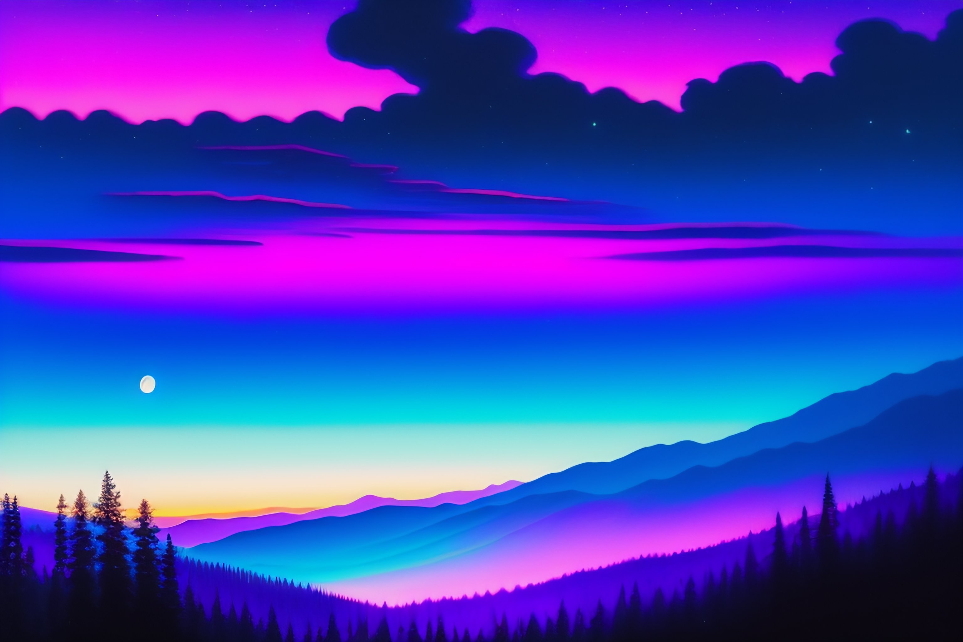 Matte painting layered night sky, comet in centre of night sky, stars and a swirly starry night moon, pink and purple ombre puffy cotton candy clouds, soft colors, dark hills forest silhouette below, cyril roland naomi okubo