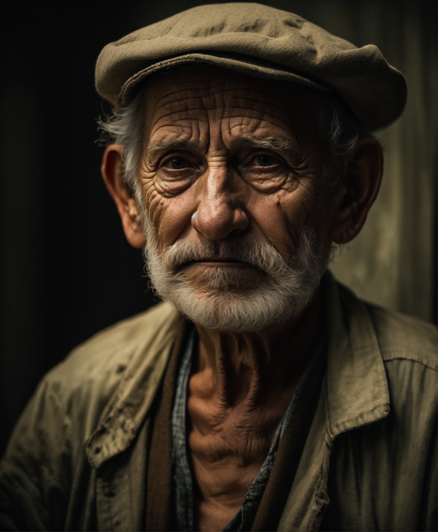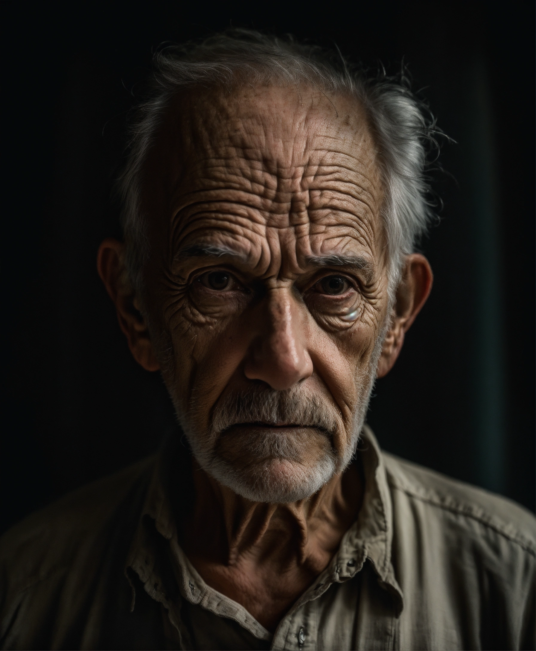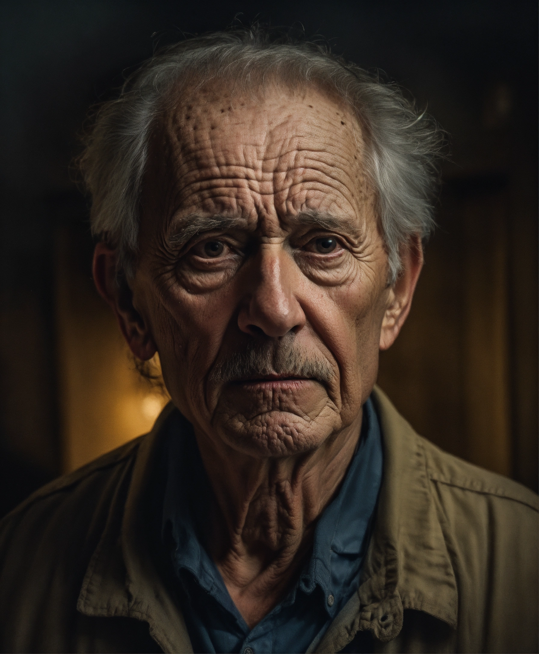 Bust portrait old very scary american man, picture to ththinning hair, small little eyes, with wrinkles and dark circles telling a story, dark room background