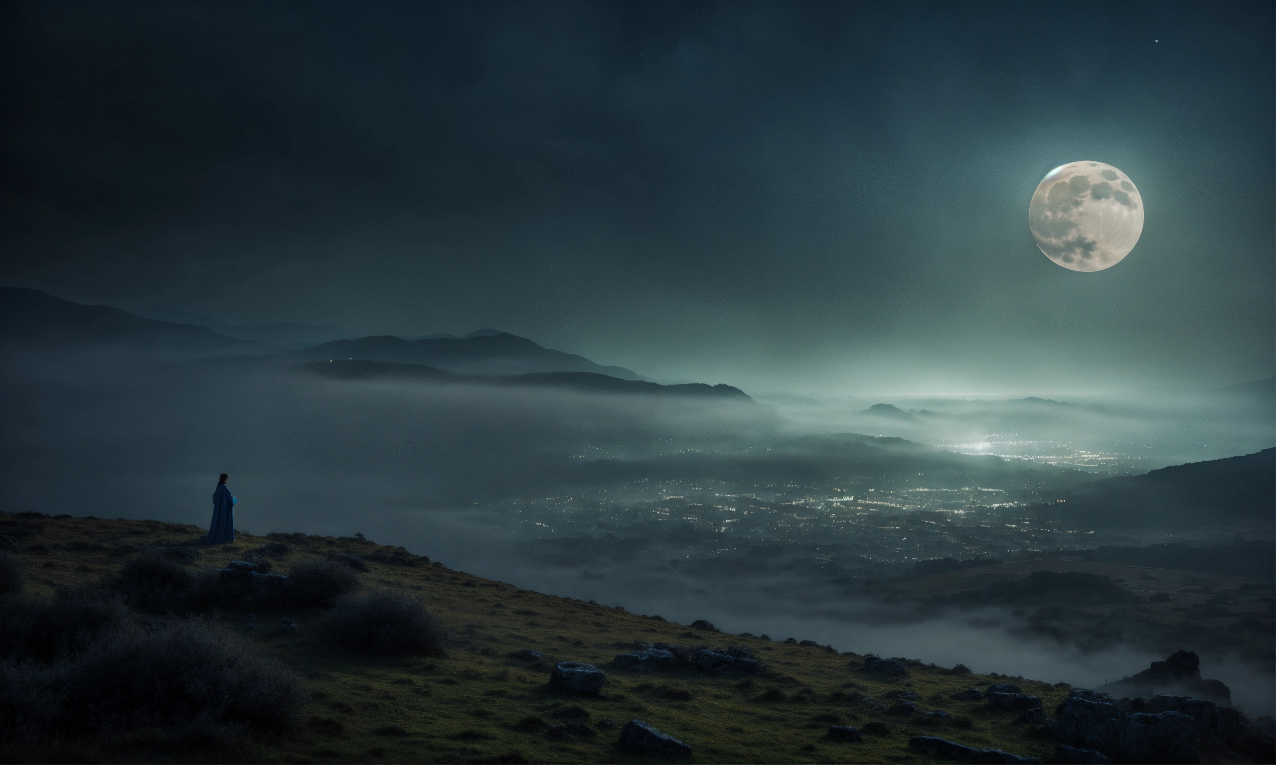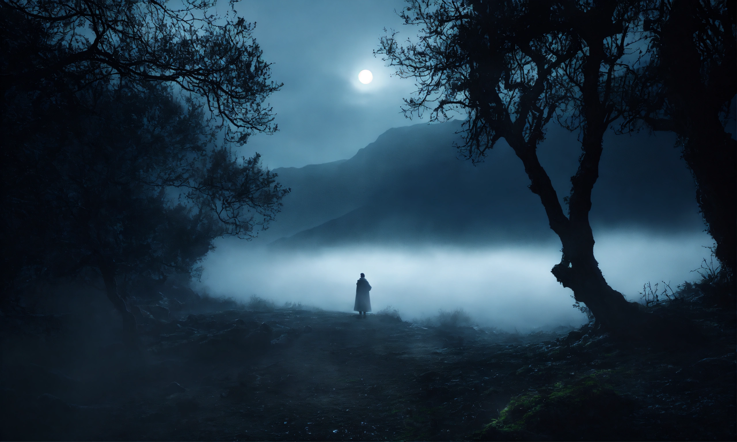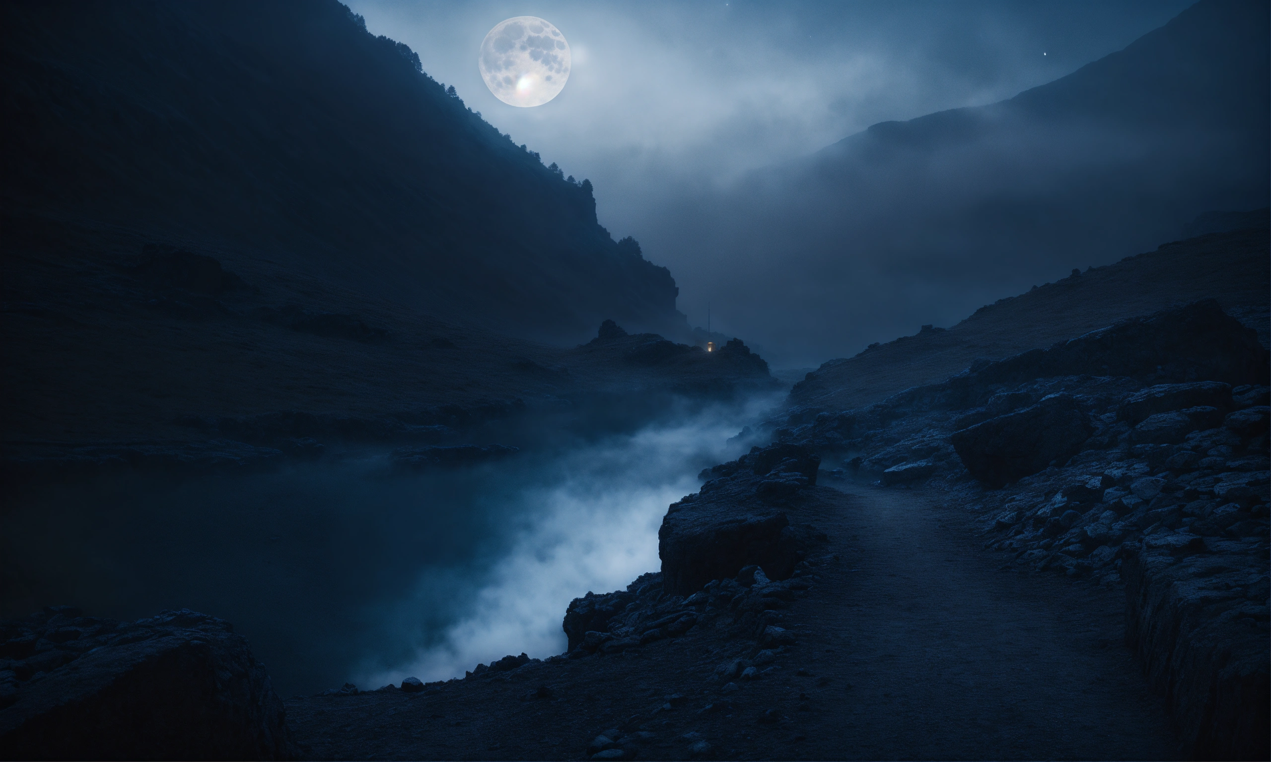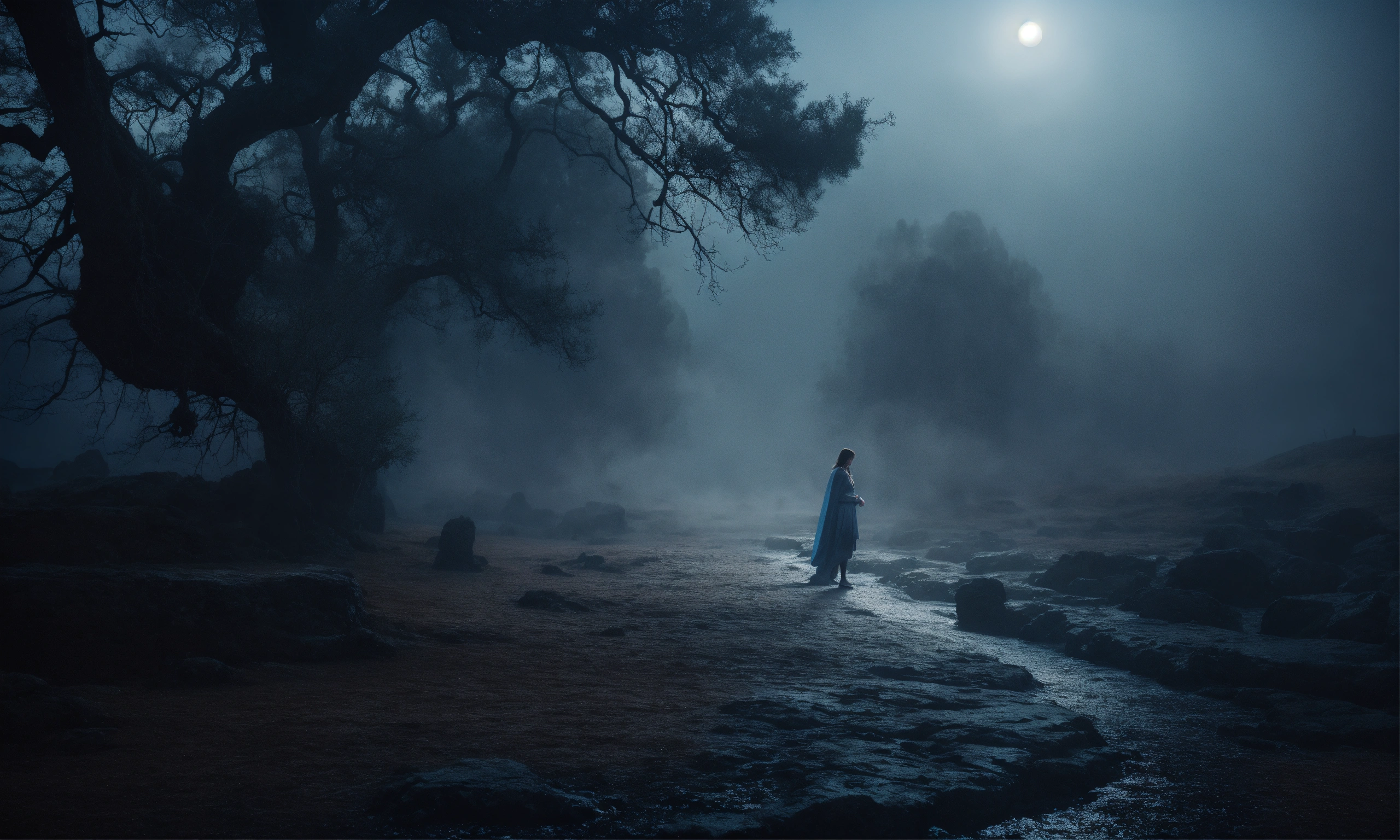 Greek mythology, underworld landscape, dark moonlight, mist, portrait photography, taken with a 50mm lens, hyper-realistic