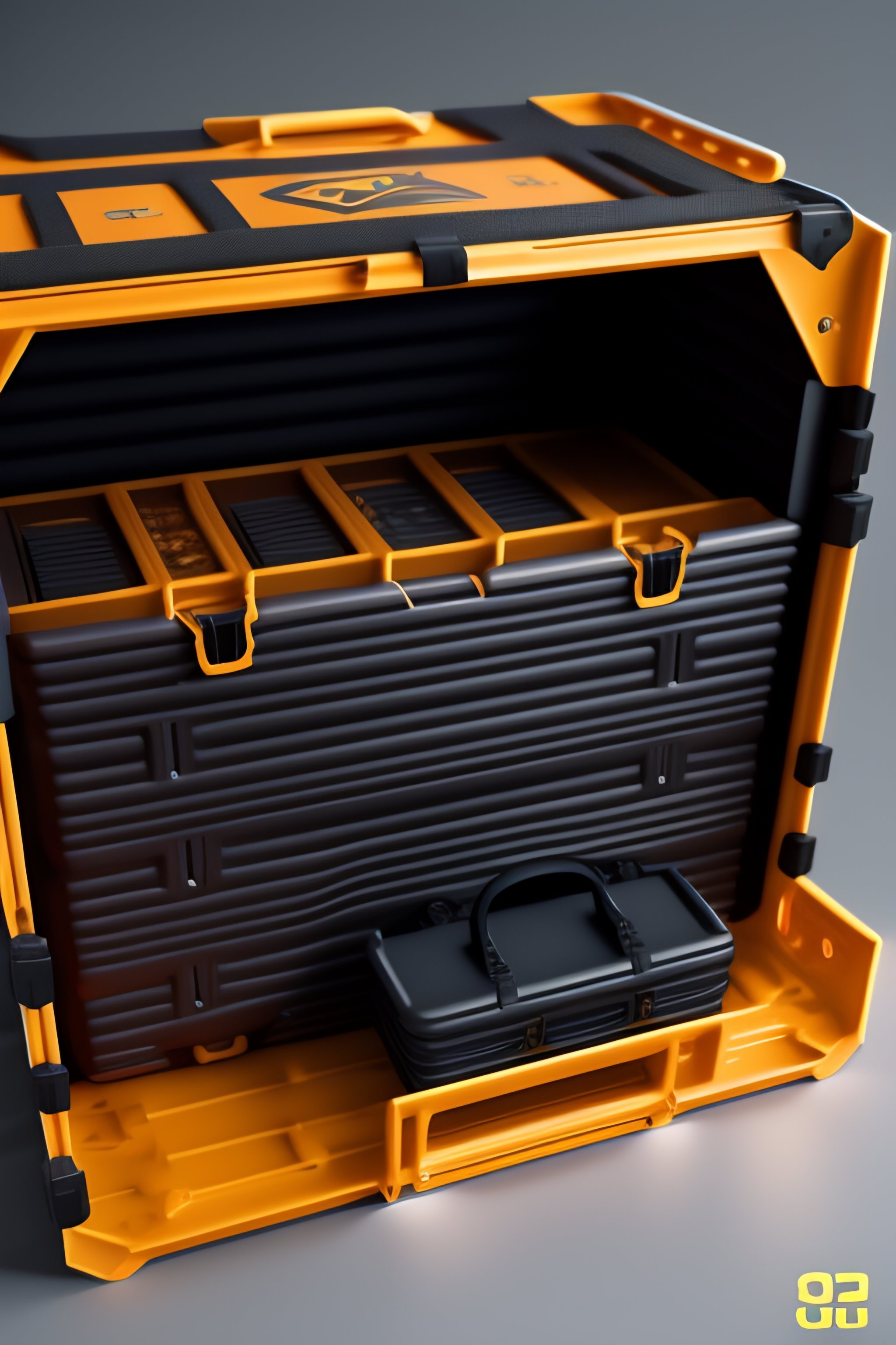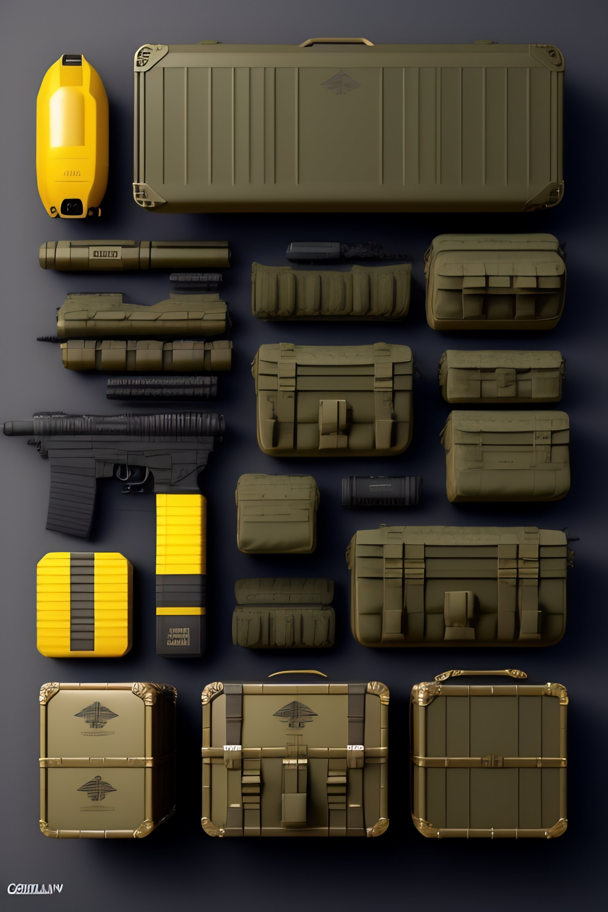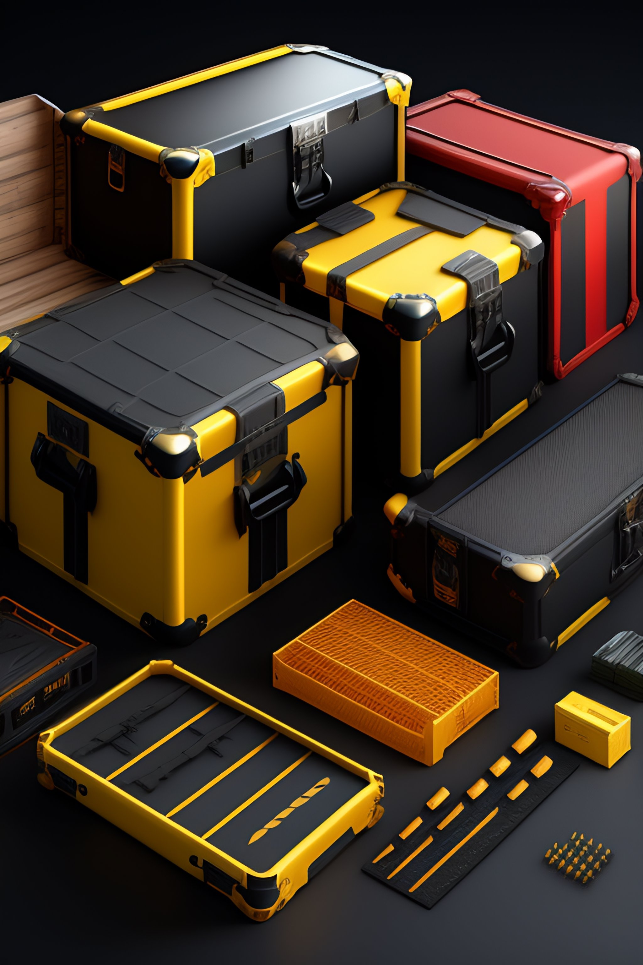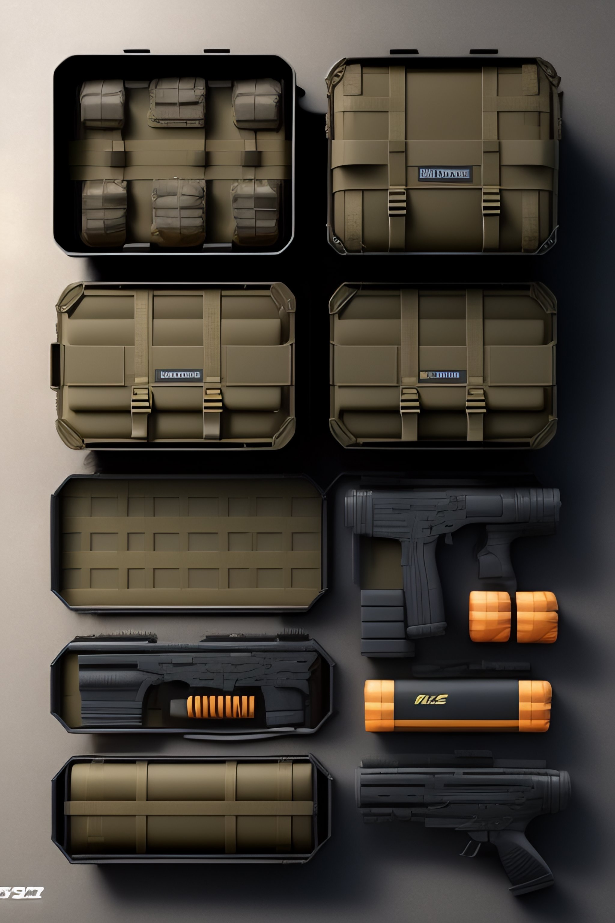 Cs-go box case collection, costumes and props, knolling, knolling layout, deconstruction, highly detailed, depth, many parts, lumen render, 8k