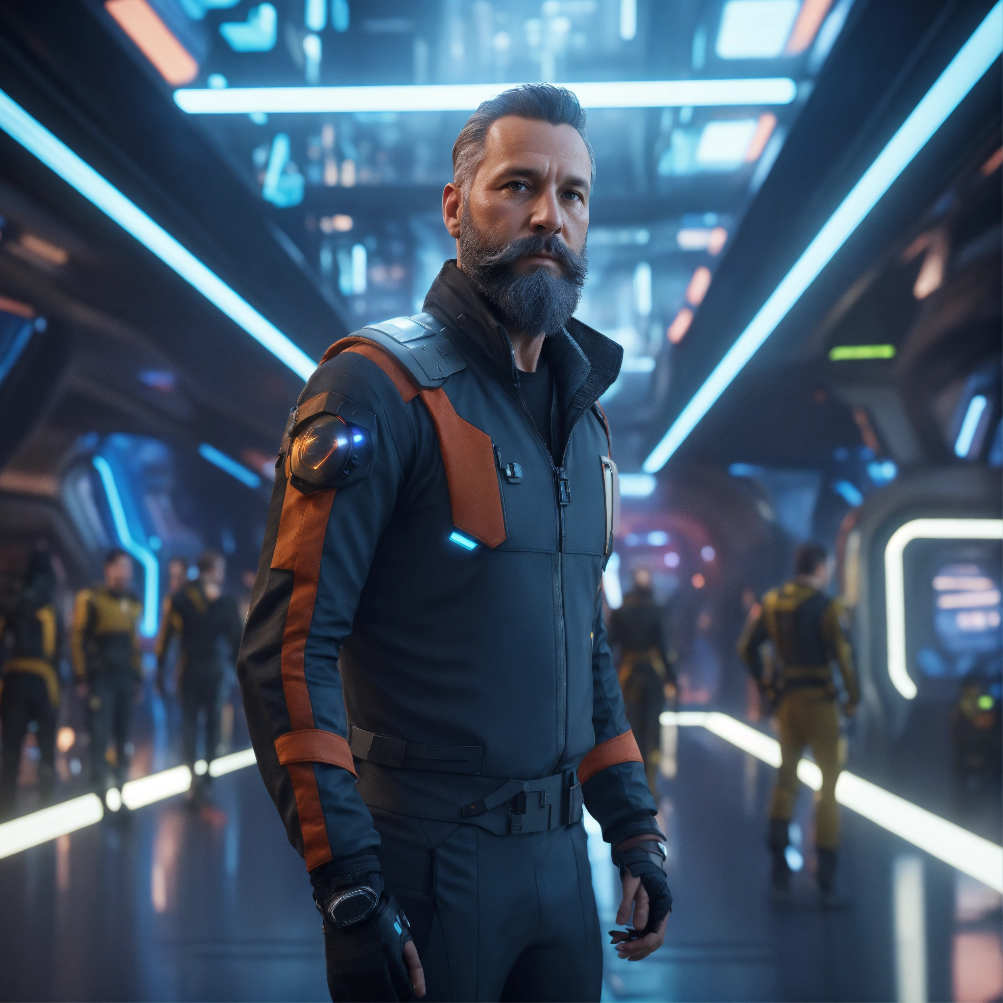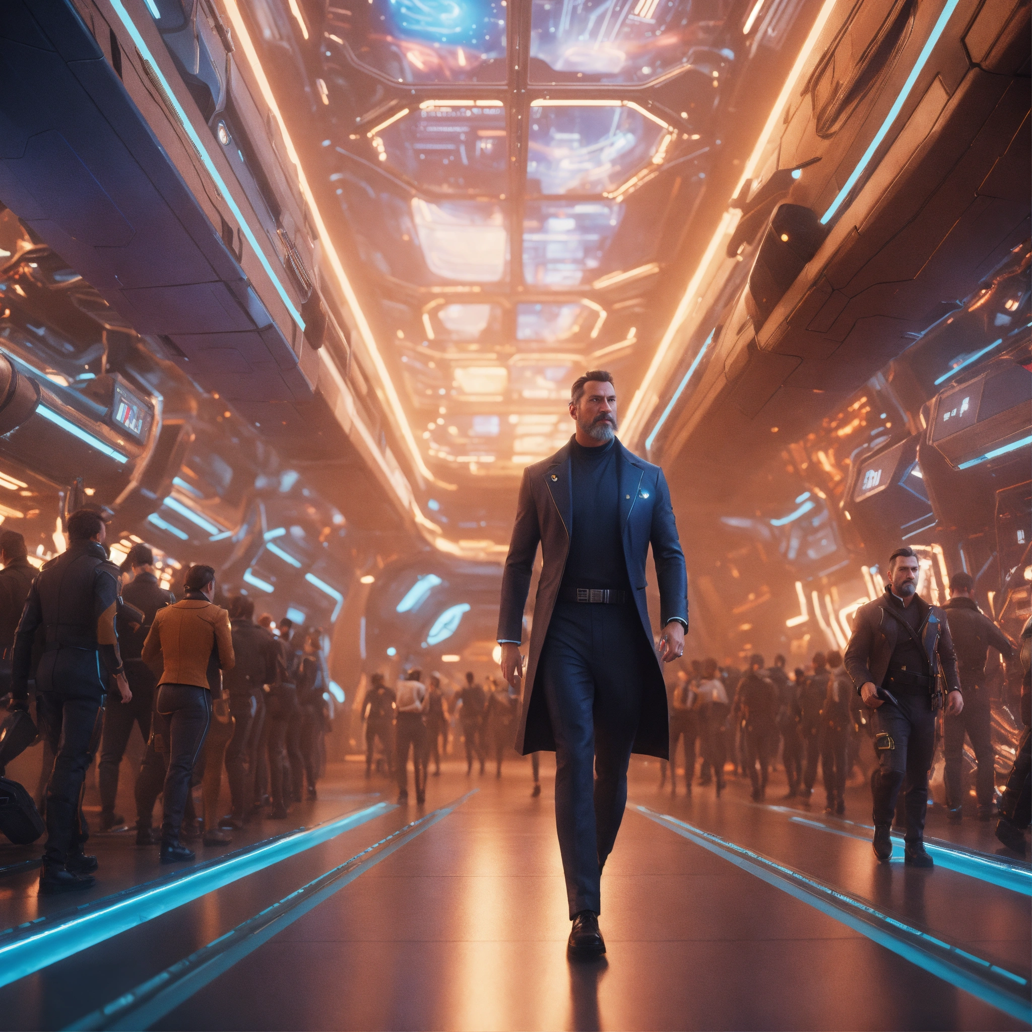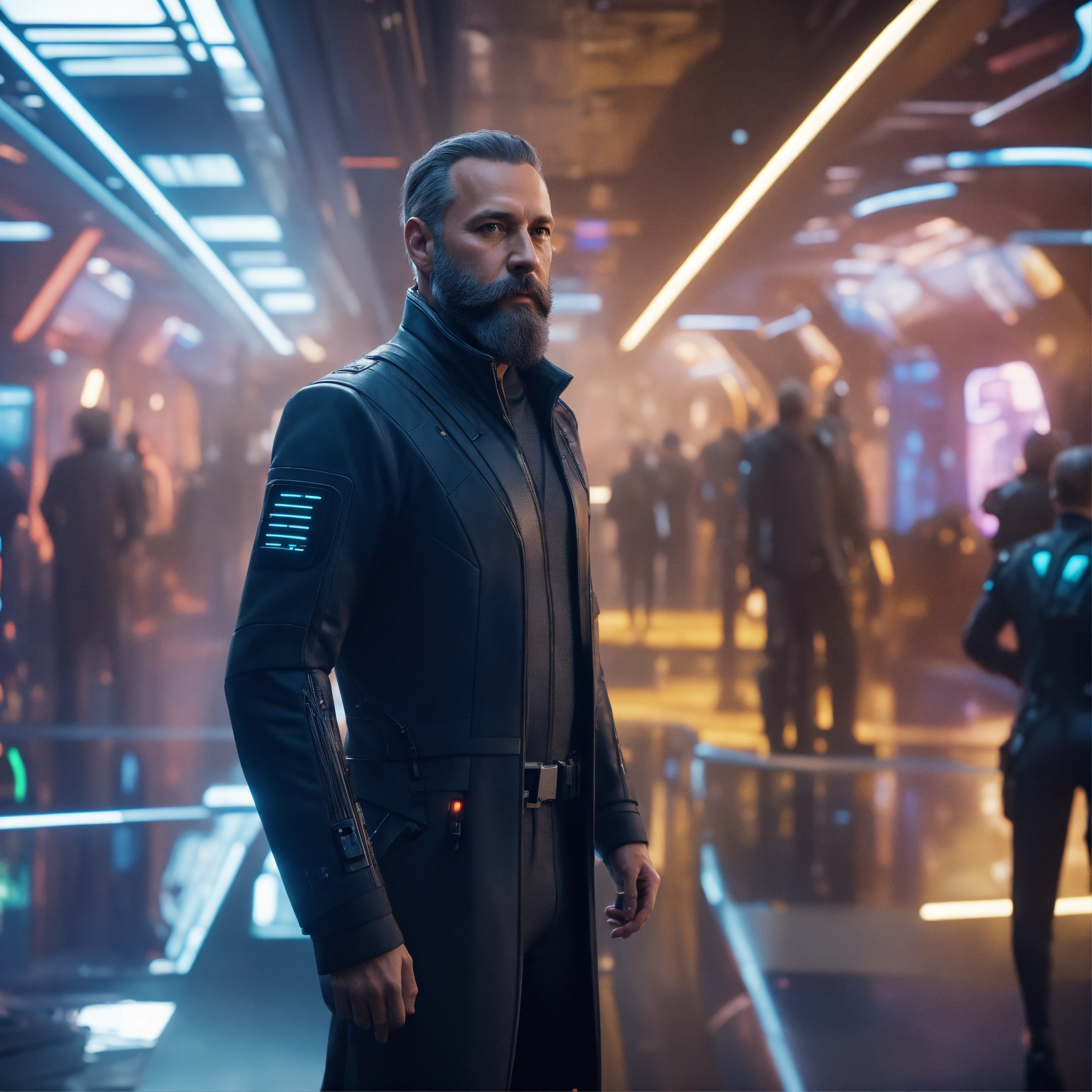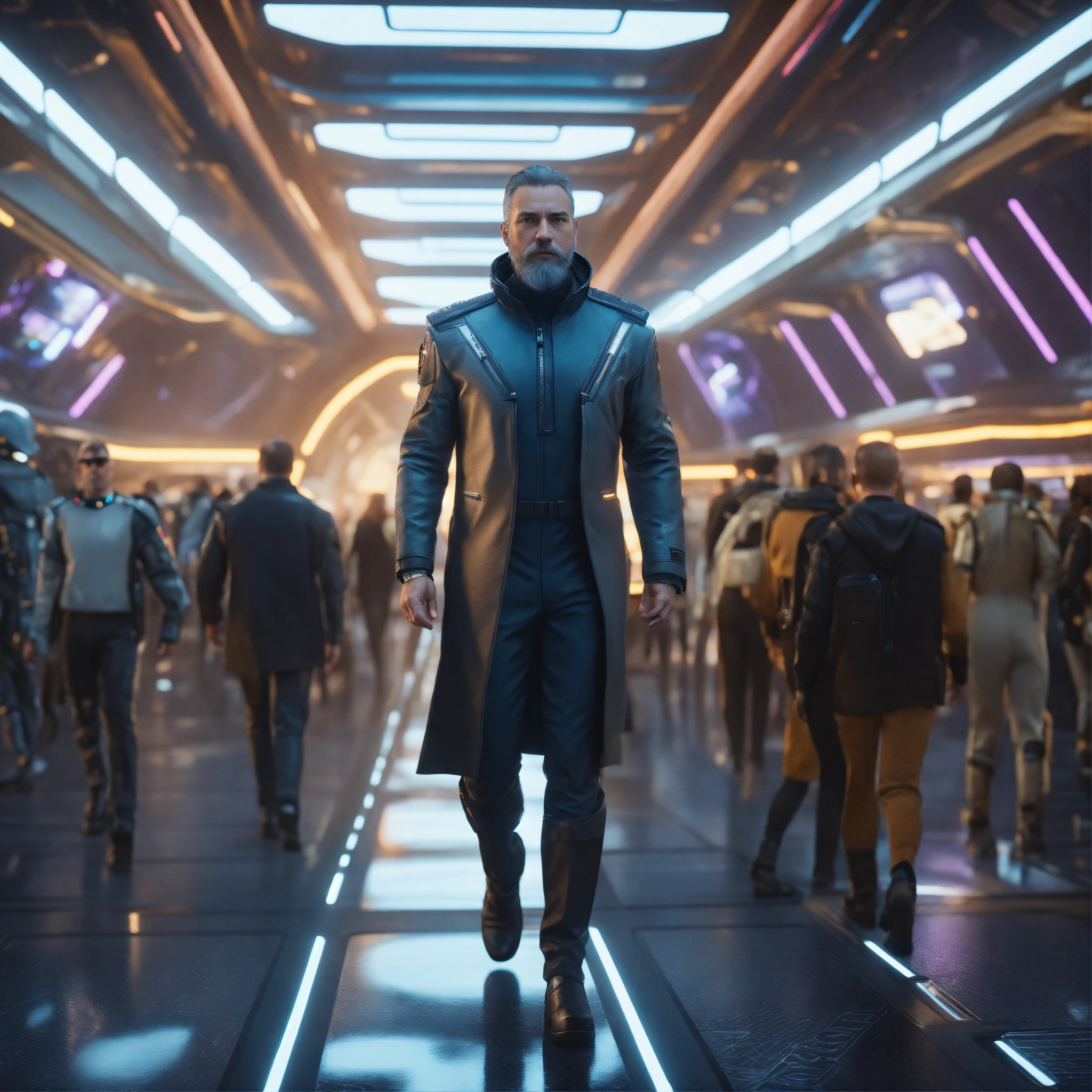 45 year old masculine man with trim beard in futuristic spy clothing is moving through a crowded space port, realistic, futuristic, sci-fi, 8k, unreal engine, pixar, zaha hadid