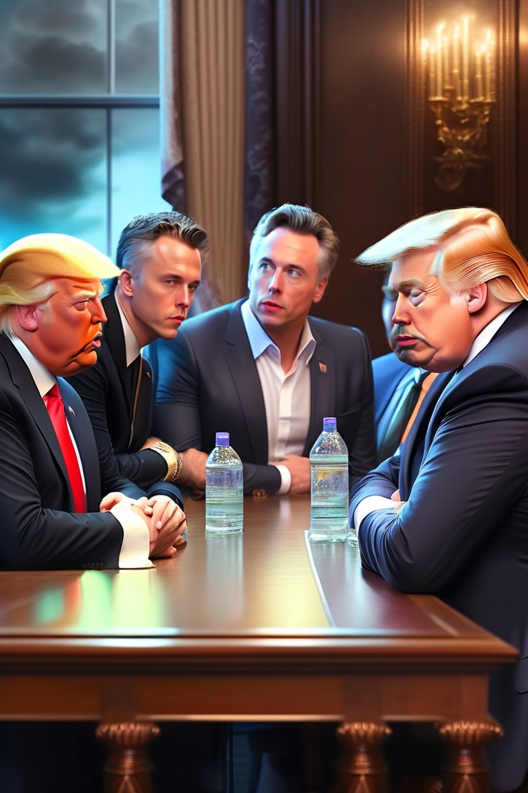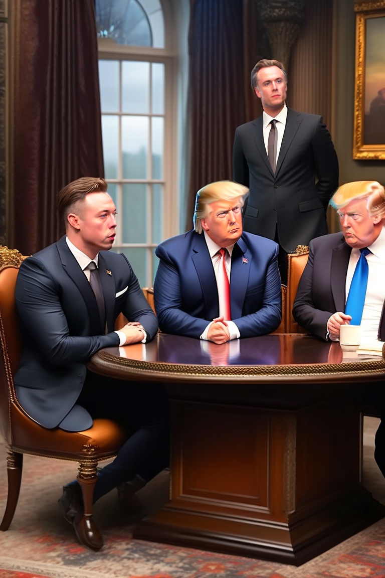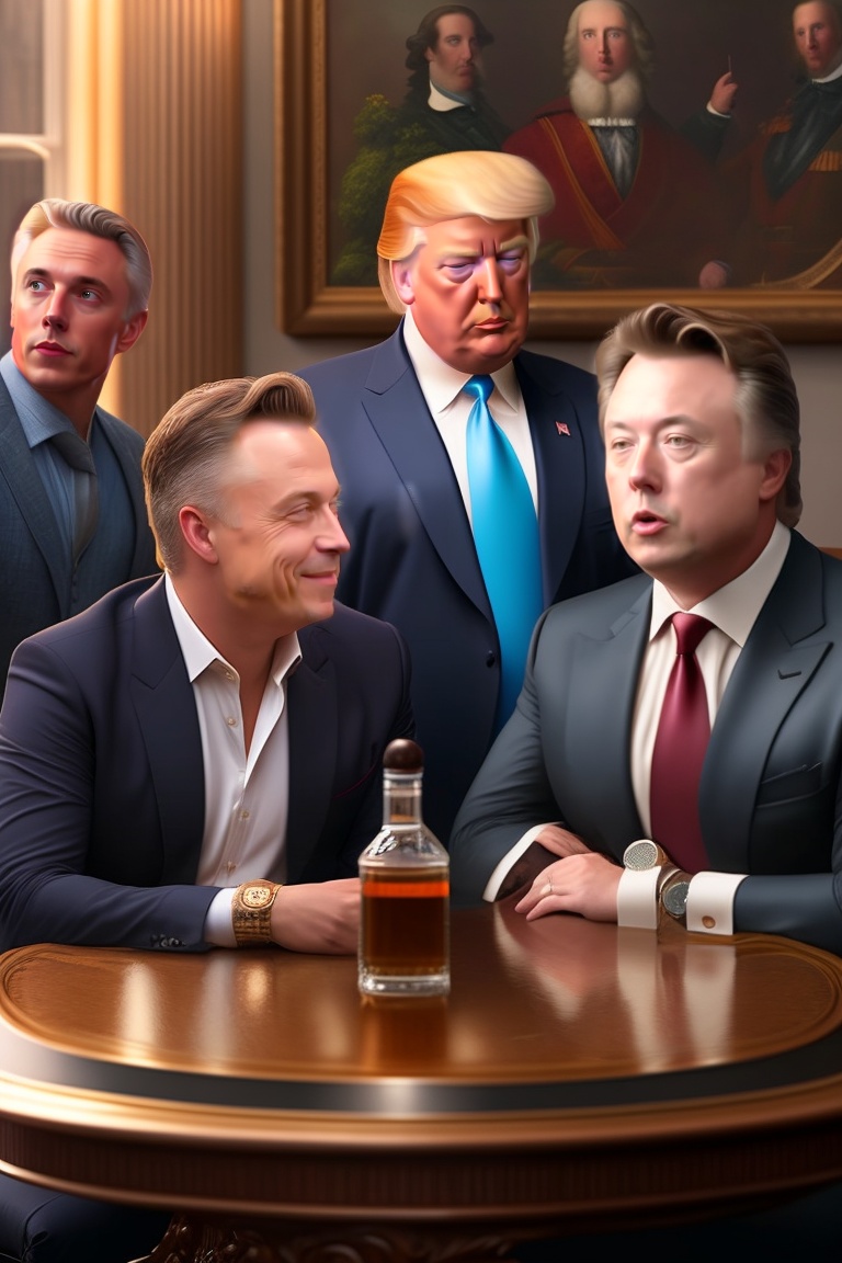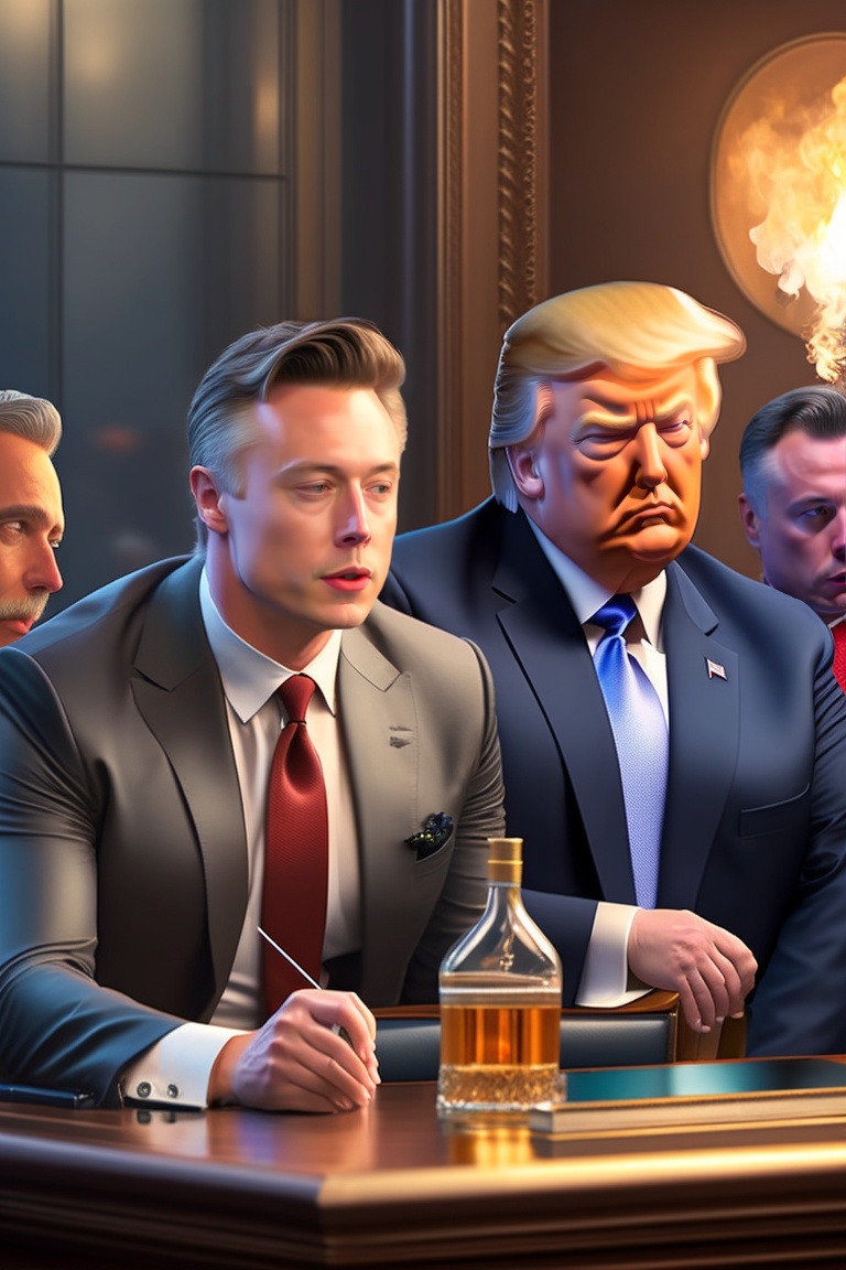 An image of andrew tate, tristan tate, jordan b peterson, donald trump, elon musk sitting on the same table smoking ciger