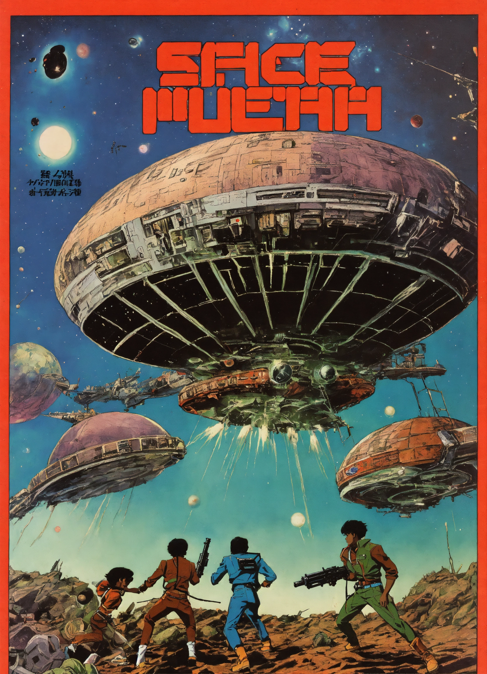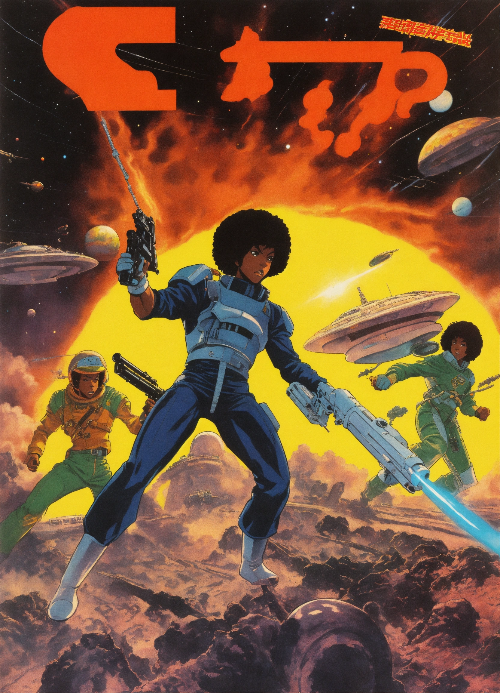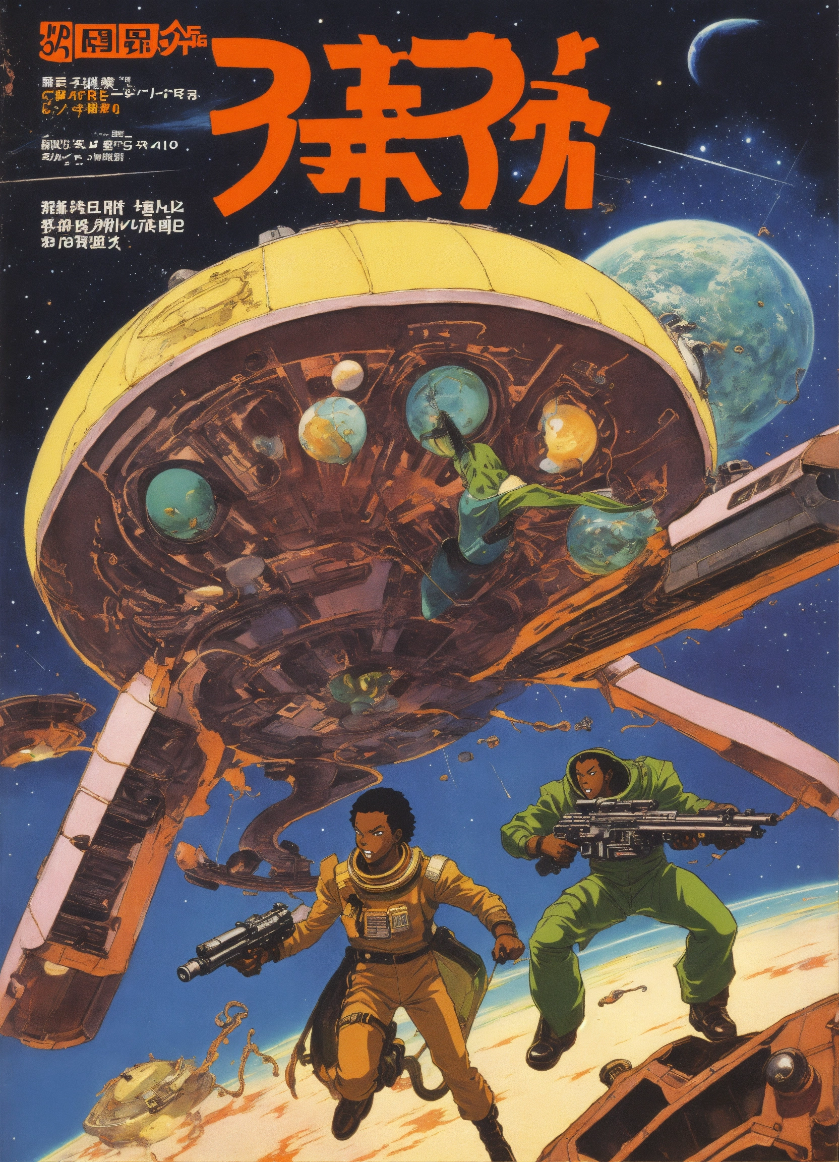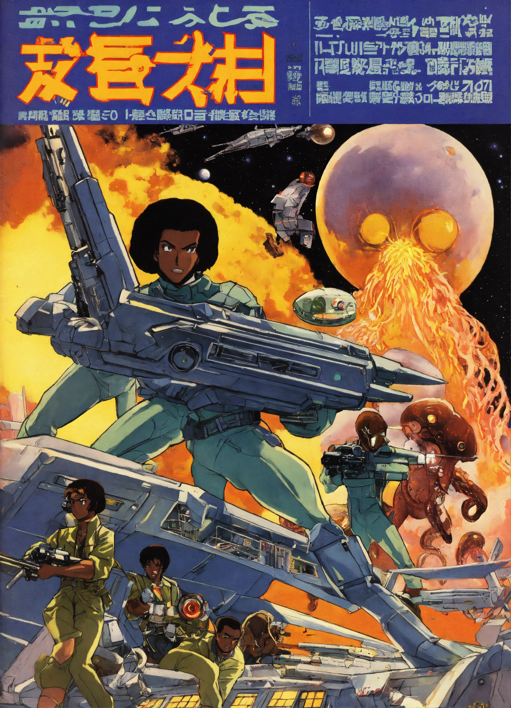 70s anime black characters fighting tentacled aliens with space guns on a damaged mothership manga cover