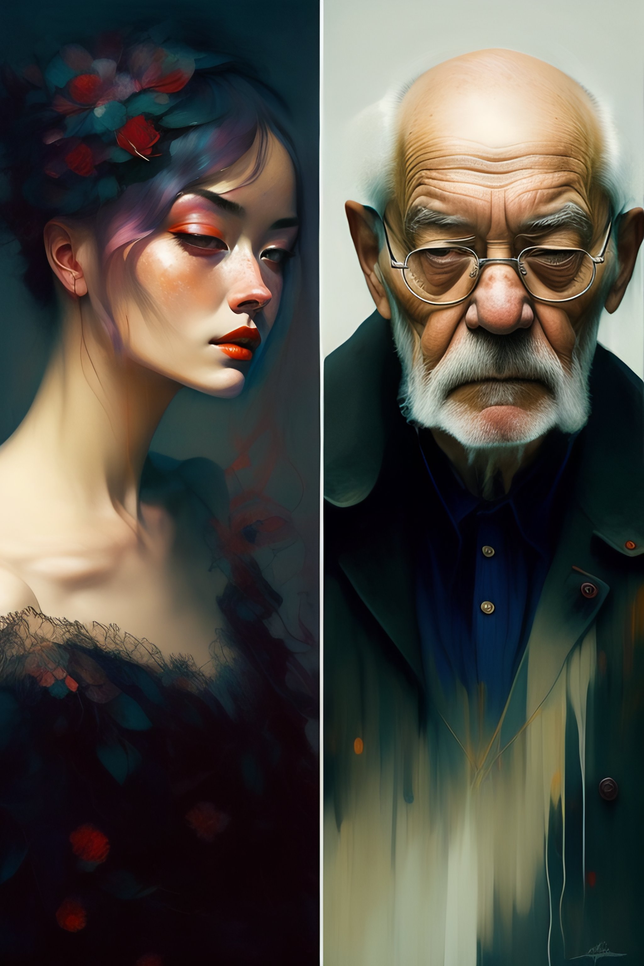 European old men and woman, there is ugliness in beauty, but there is also beauty in ugliness. in the style of adrian ghenie, esao andrews, jenny saville, edward hopper, surrealism, dark art by james jean, takato yamamoto, inkpunk minimalism