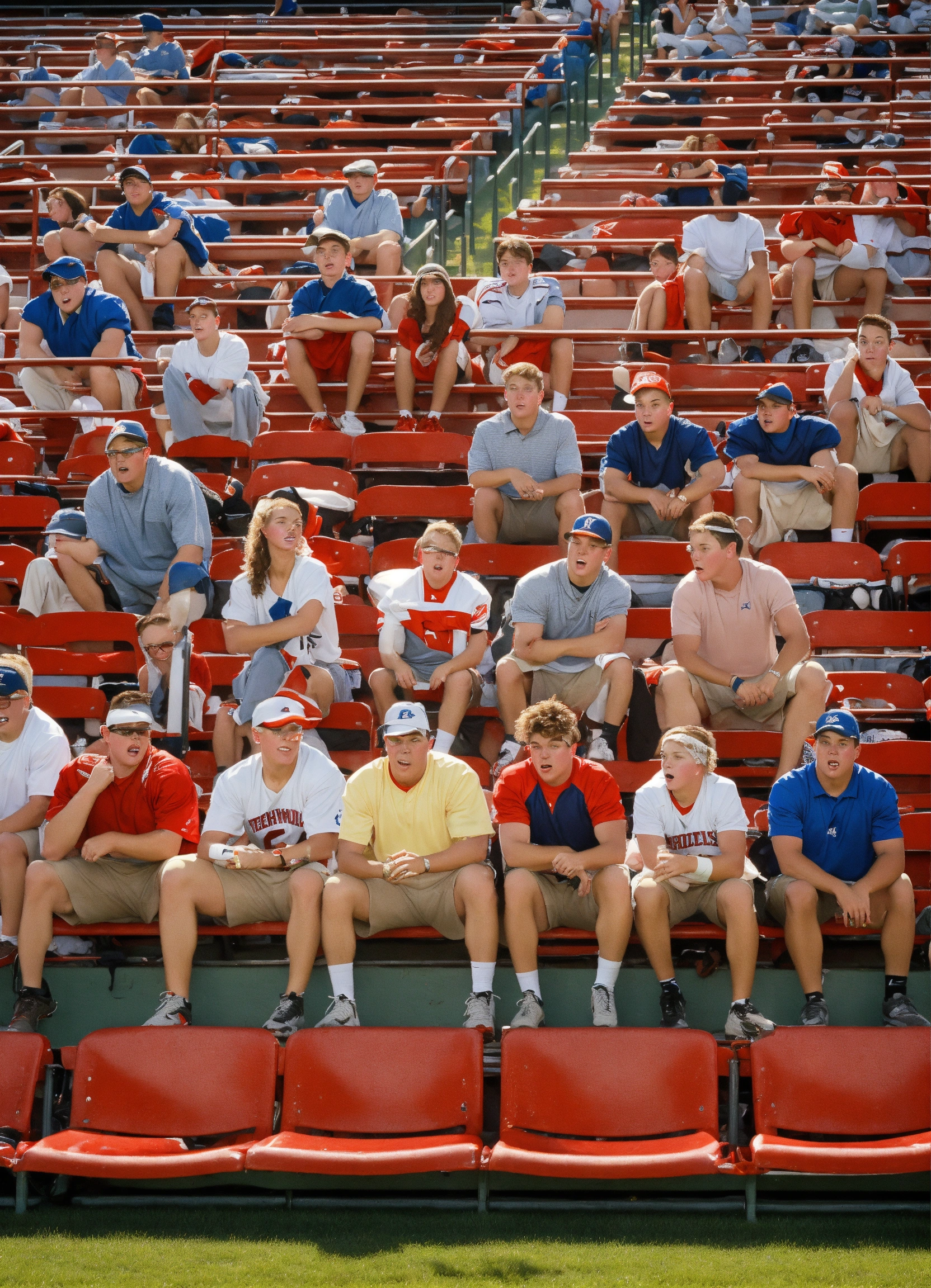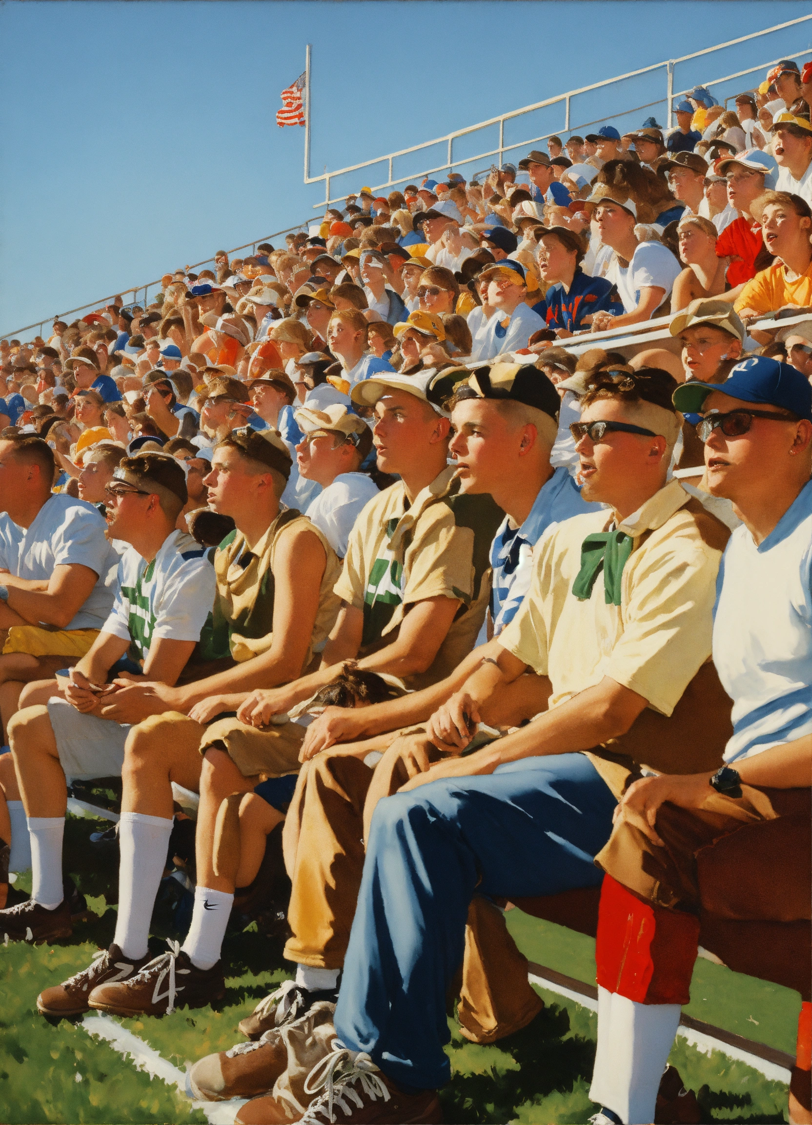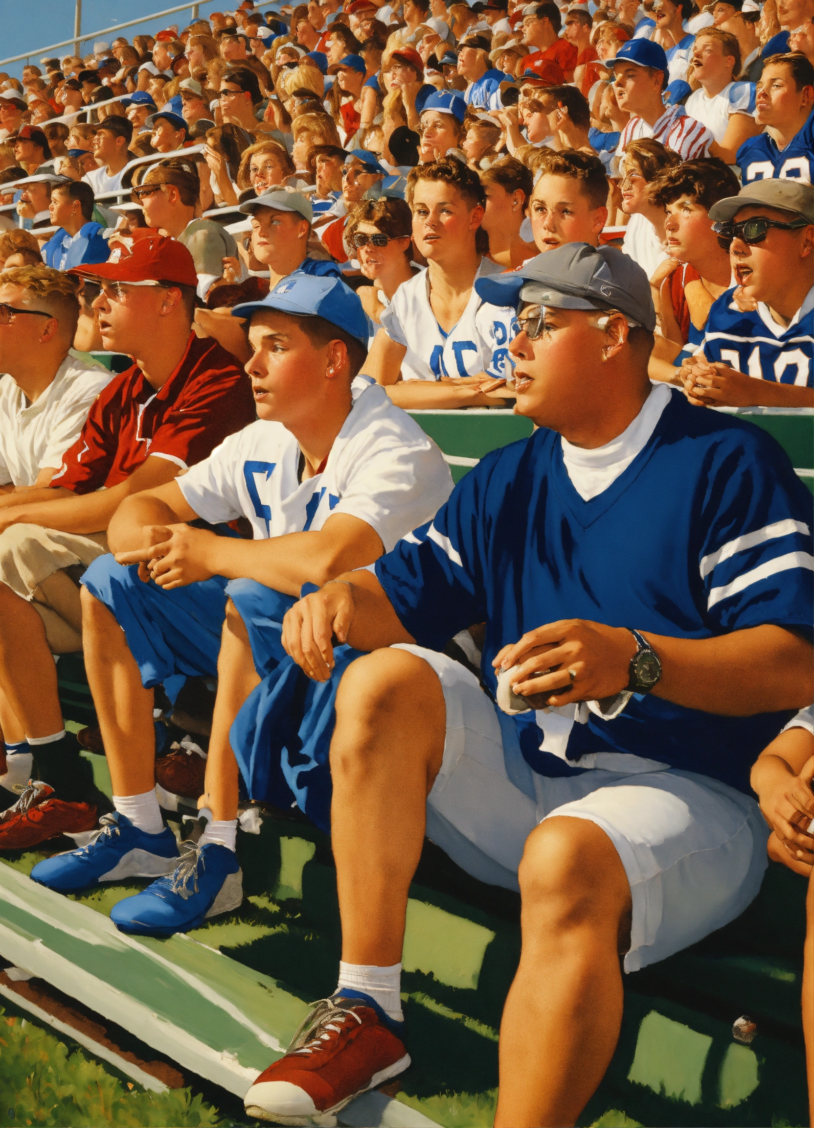 Sports fans watching a high school football game in the bleachers norman rockwell style