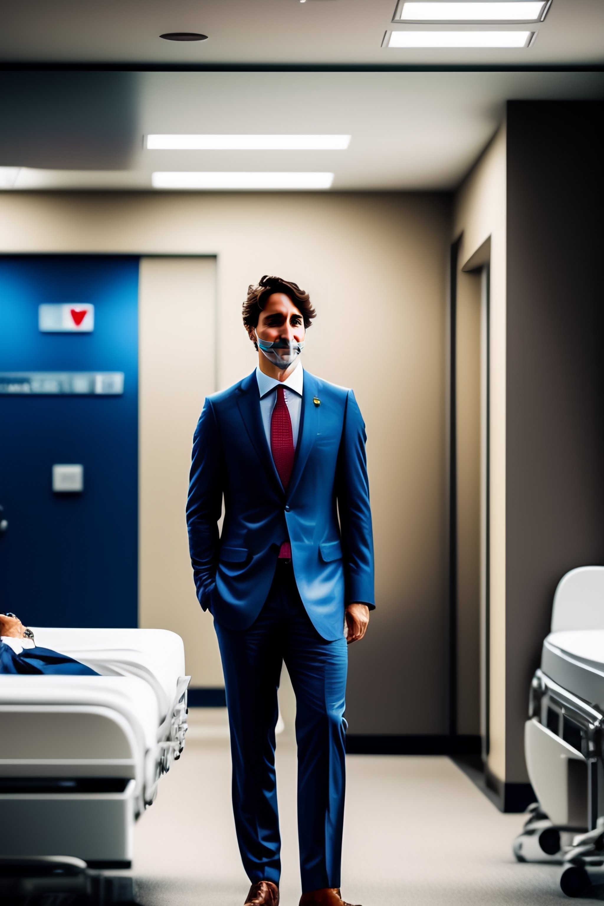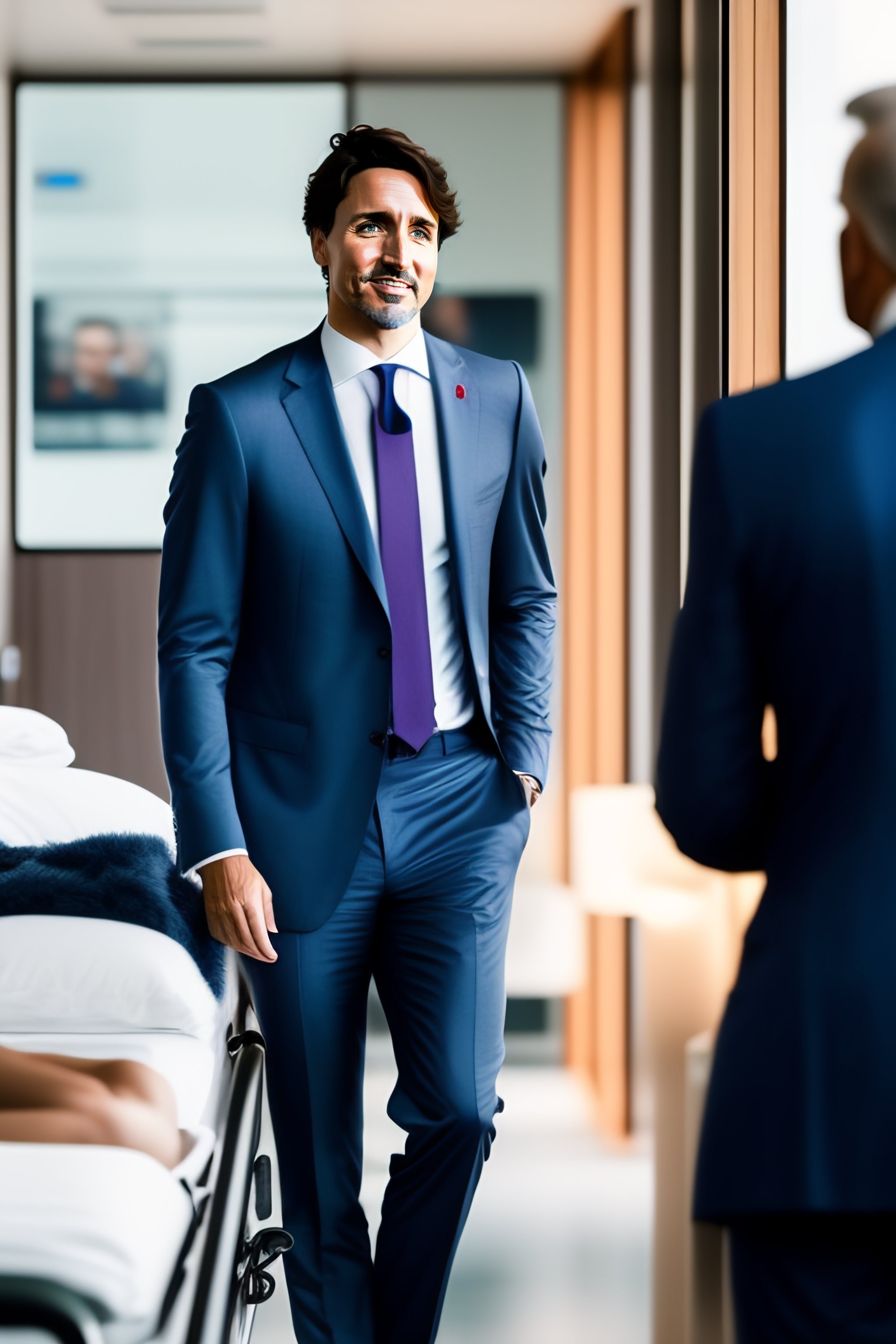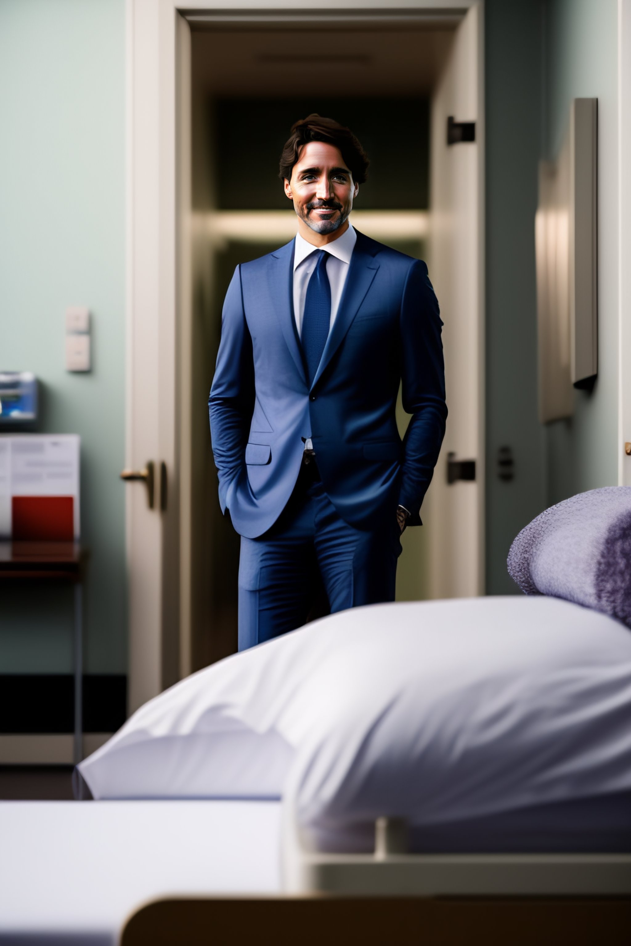 A full body portrait of justin trudeau standing over a hospital bed and inviting you in