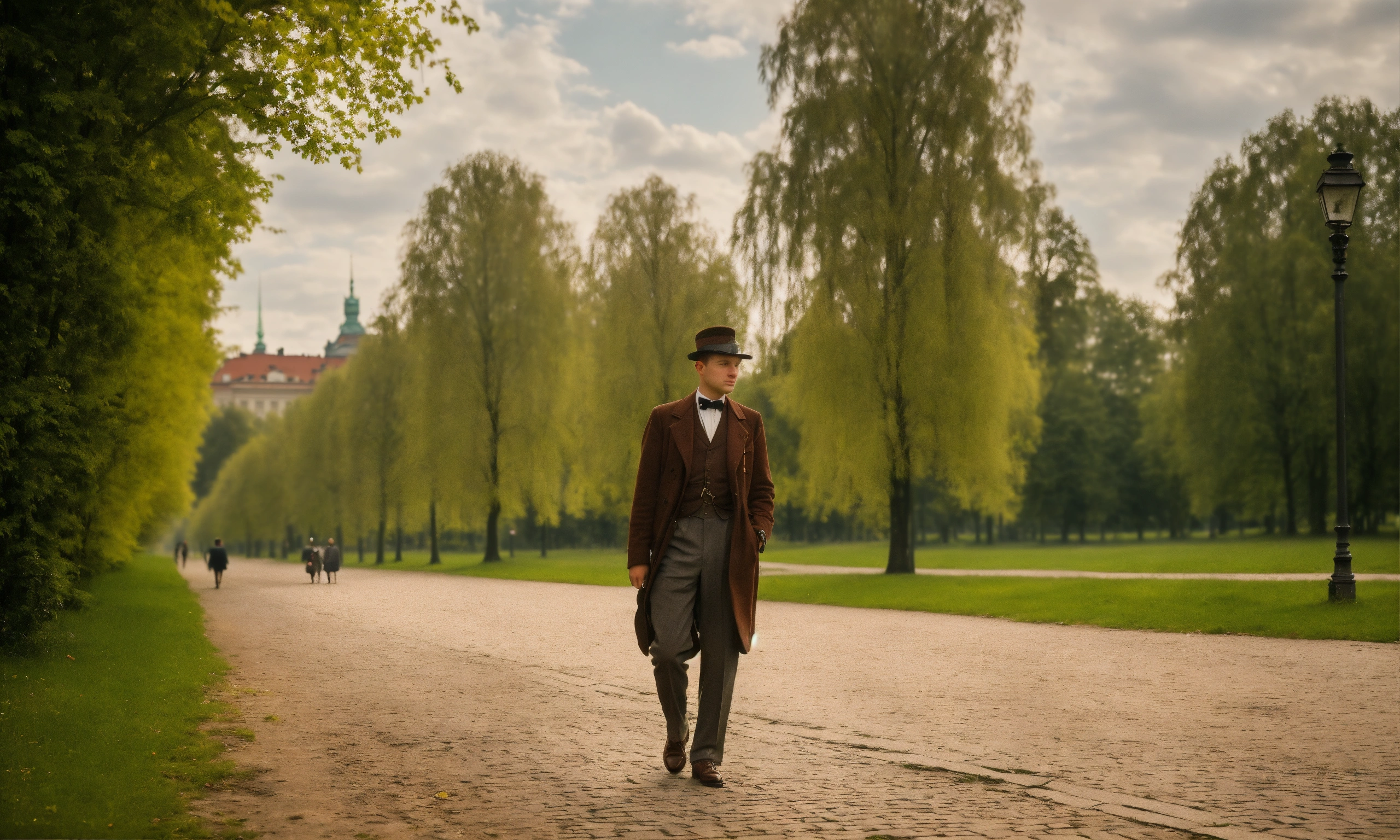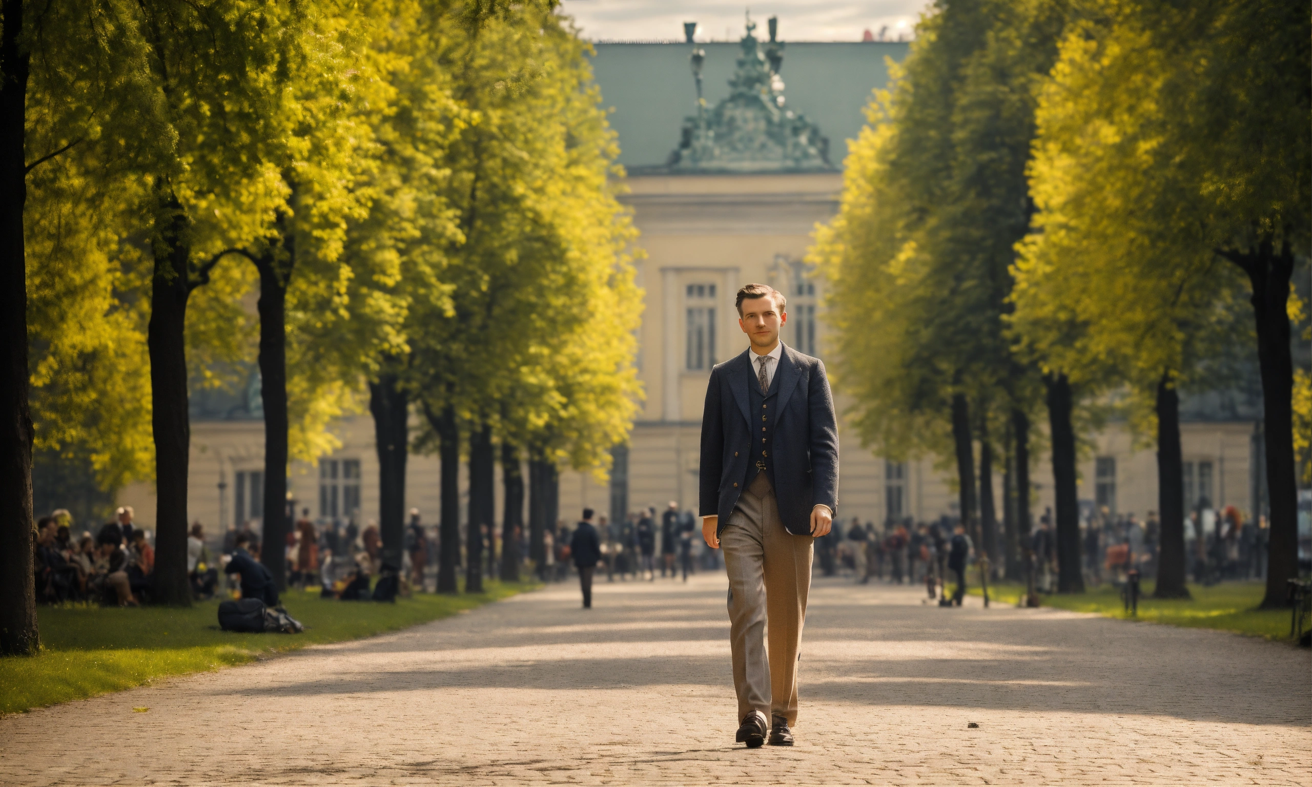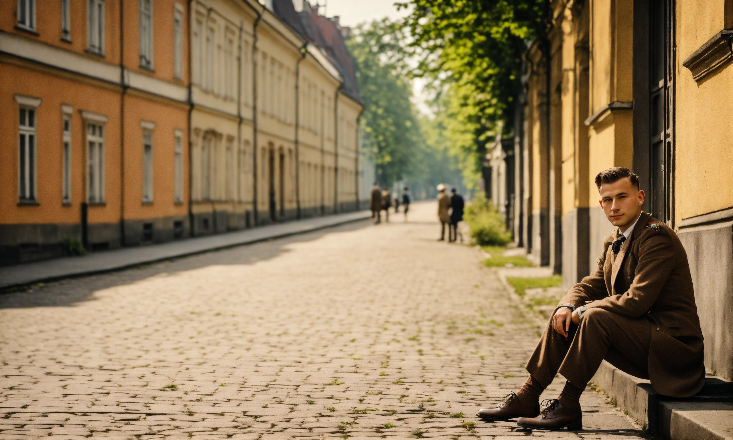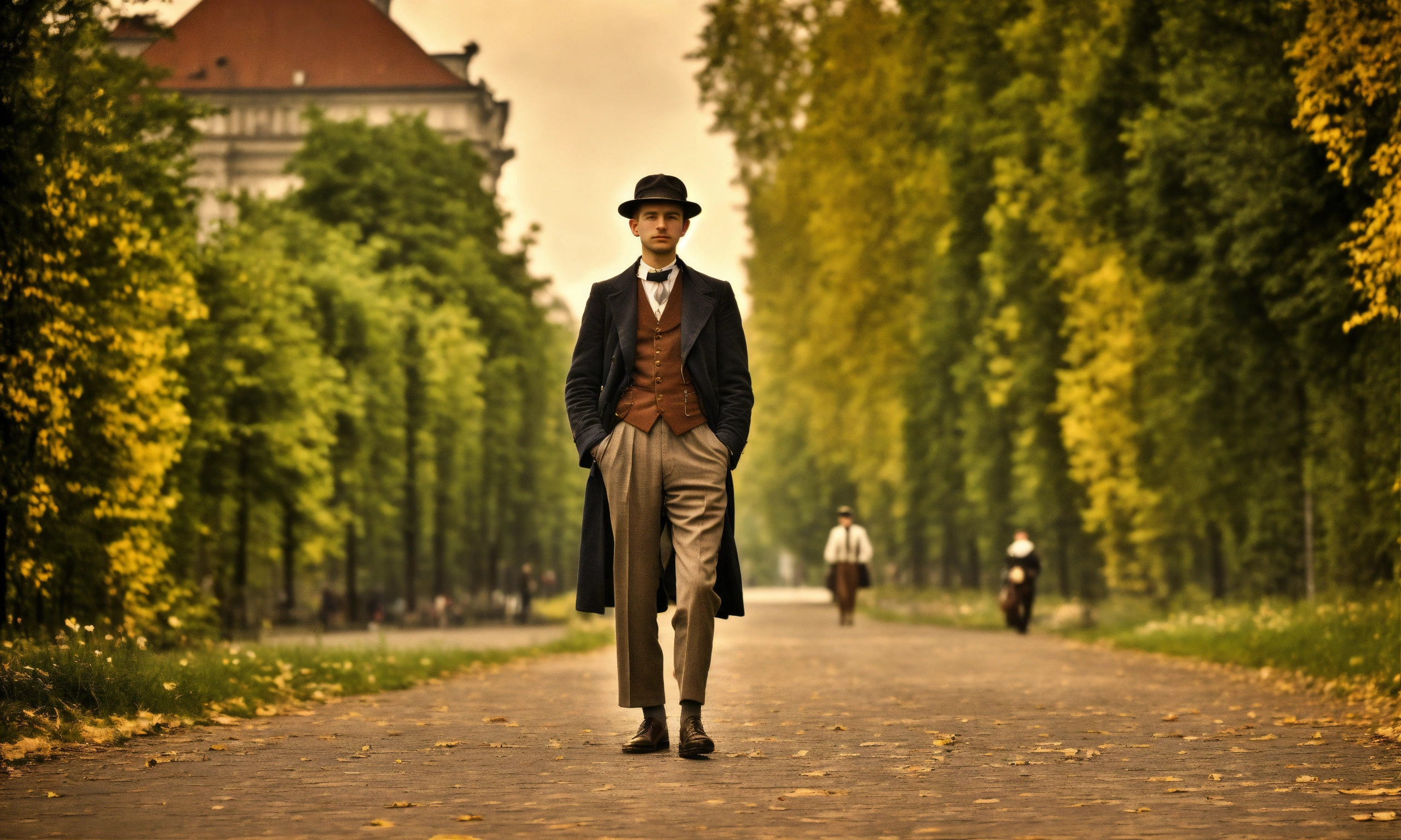 Cute poland poor man age 30, 1920-1930 on streen in warshaw. retro style photo full height. without people. focus camera on face man. season summer, keep in mind that the street must be without people, retro style photo. warshaw wilanów palace without people.