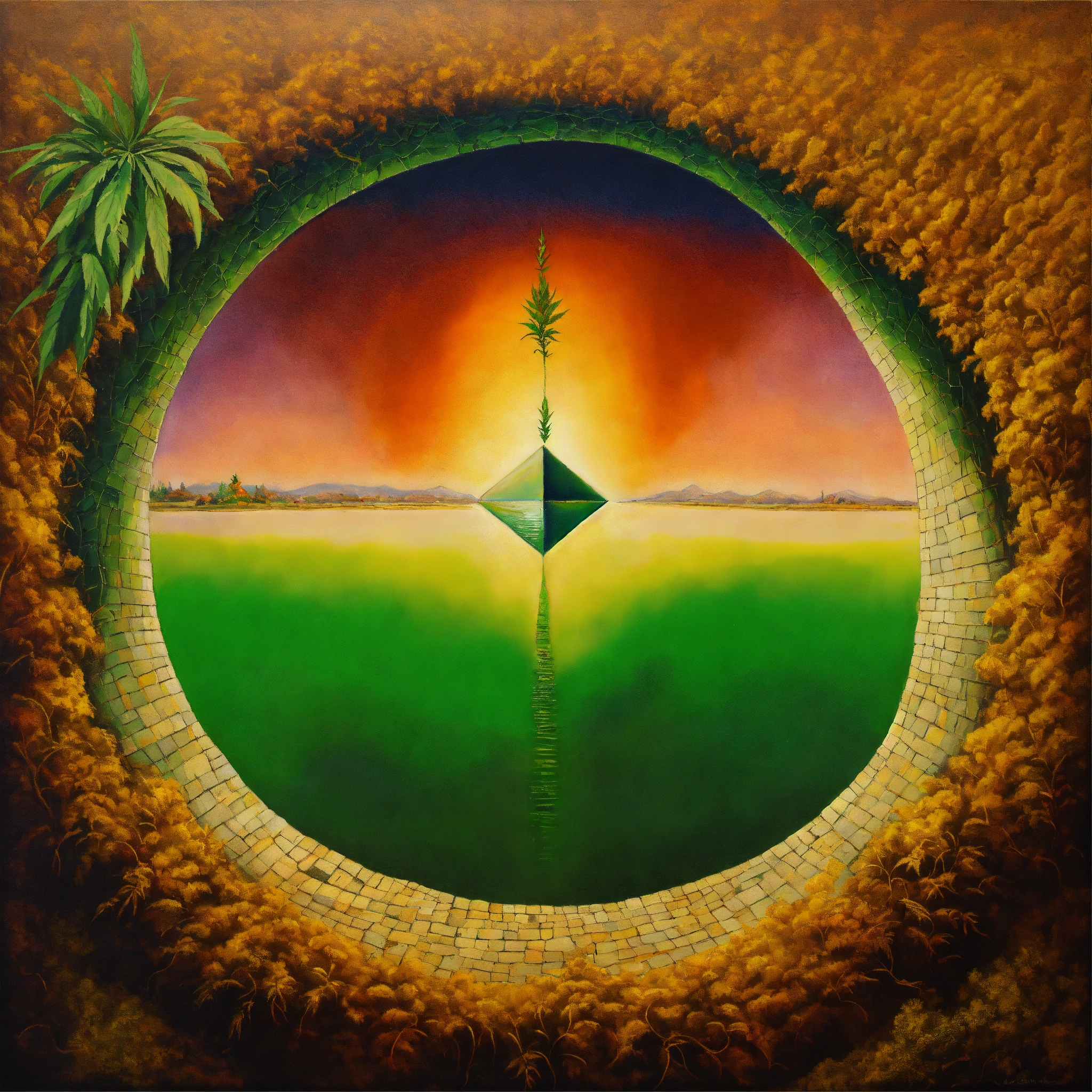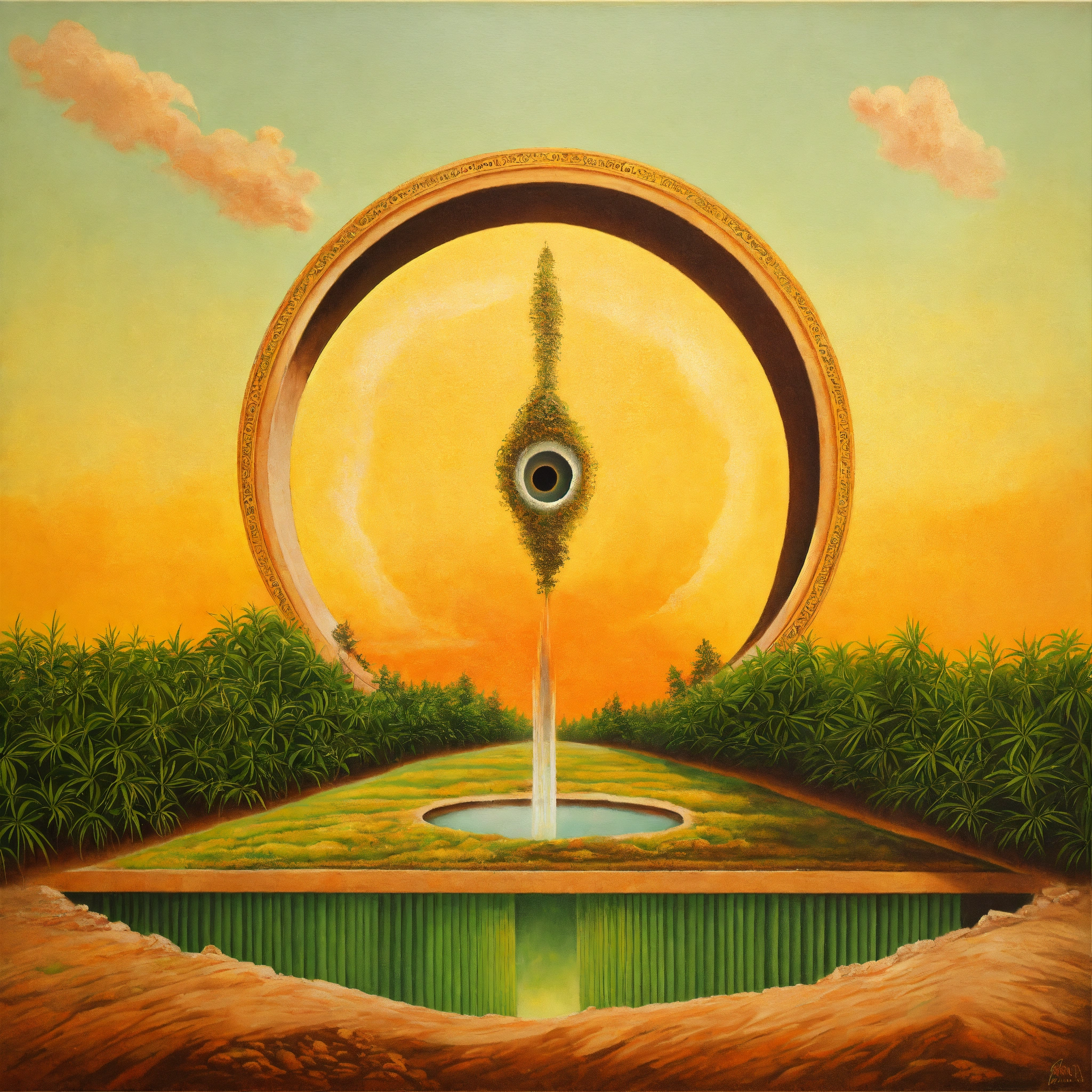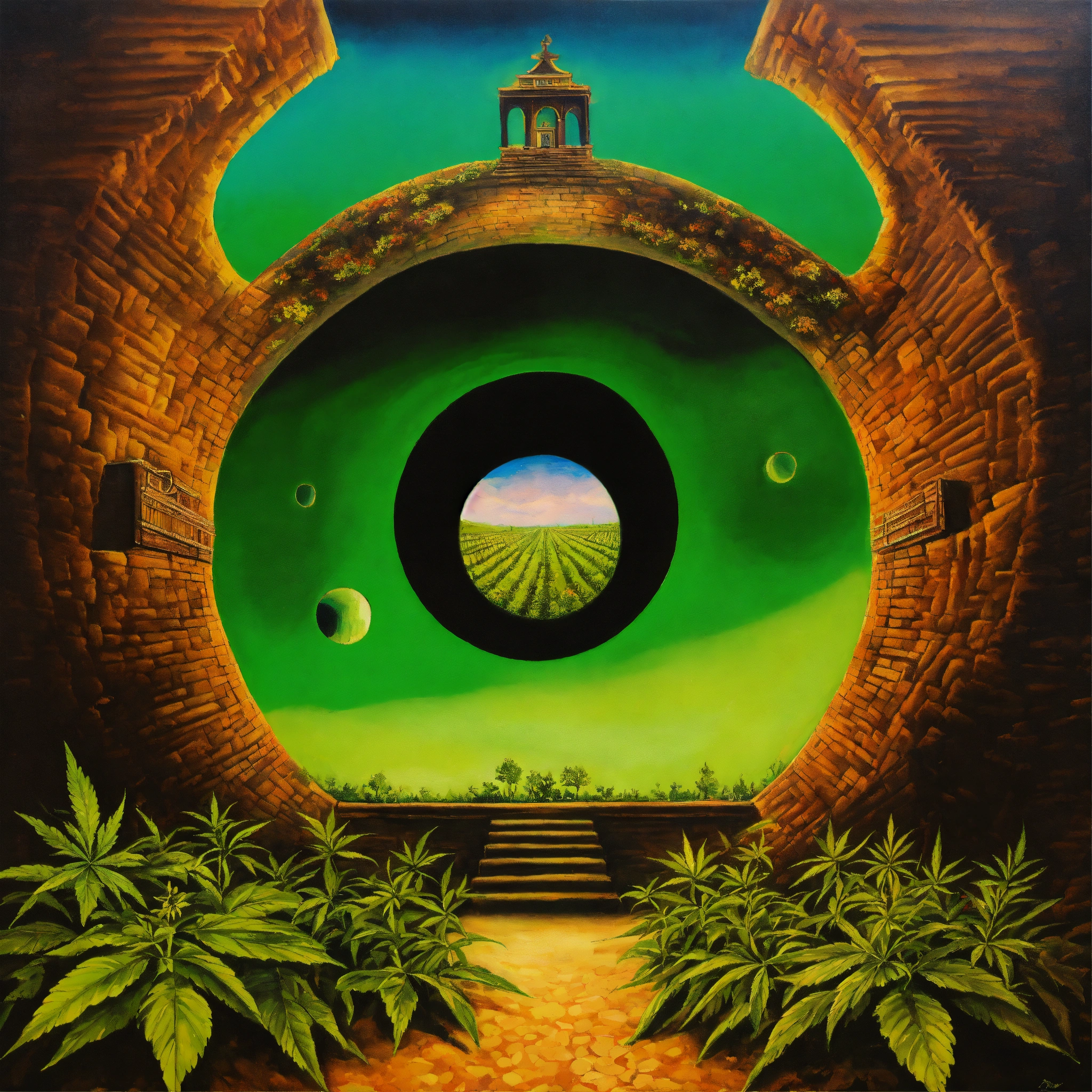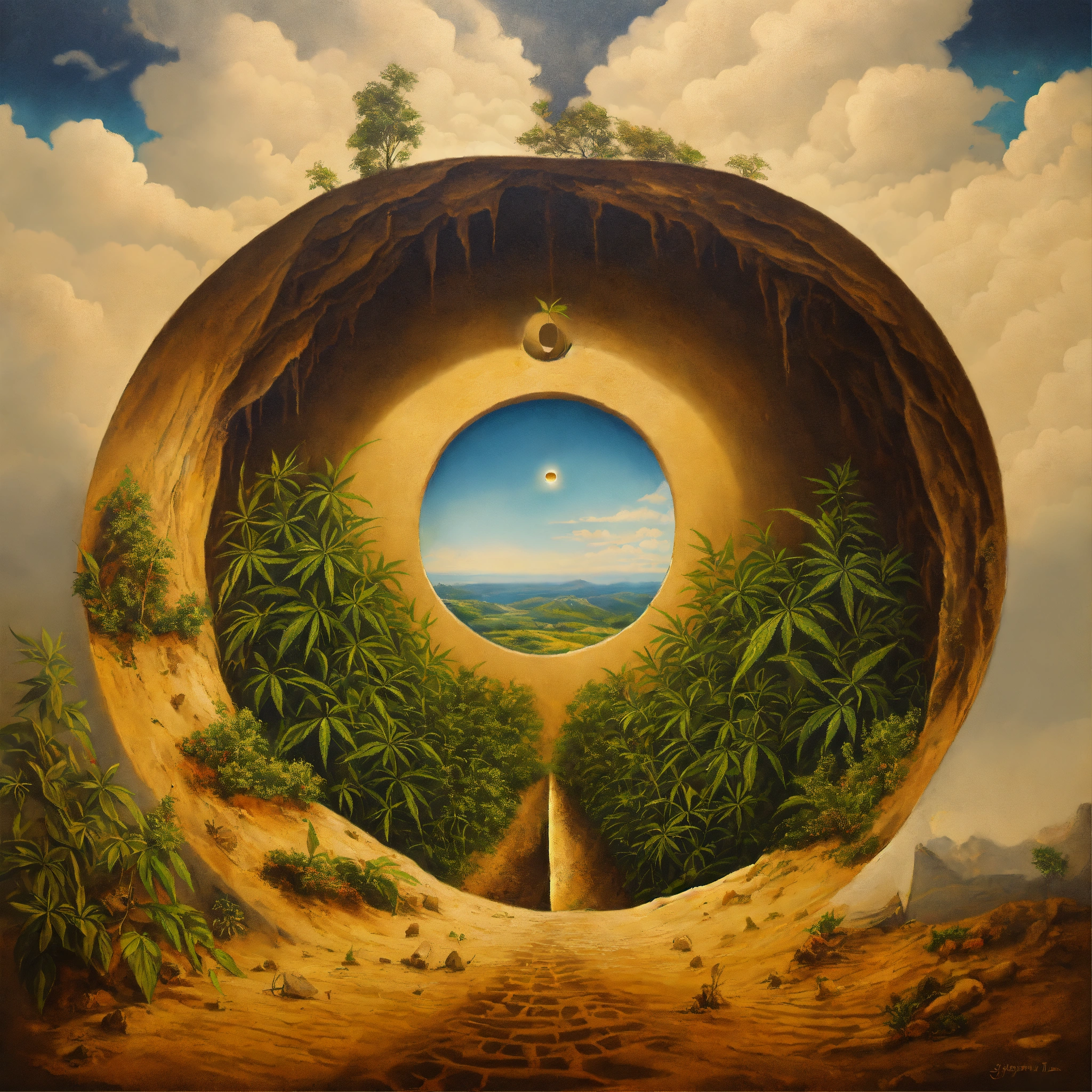A painting with optical illusion image with a hole in the ground and ganja