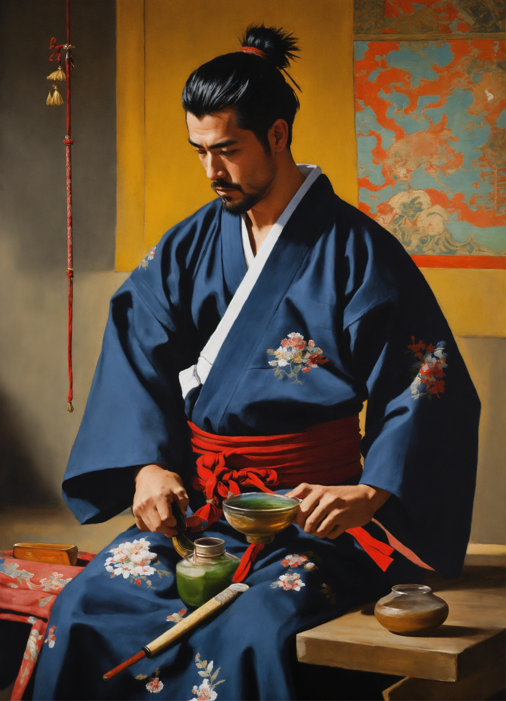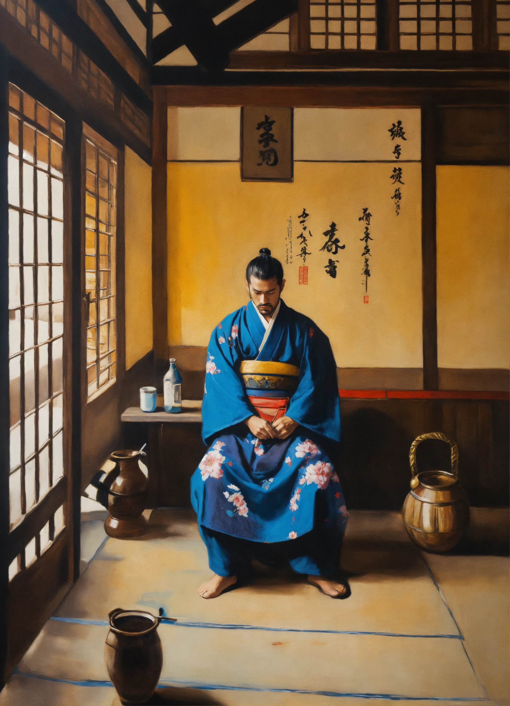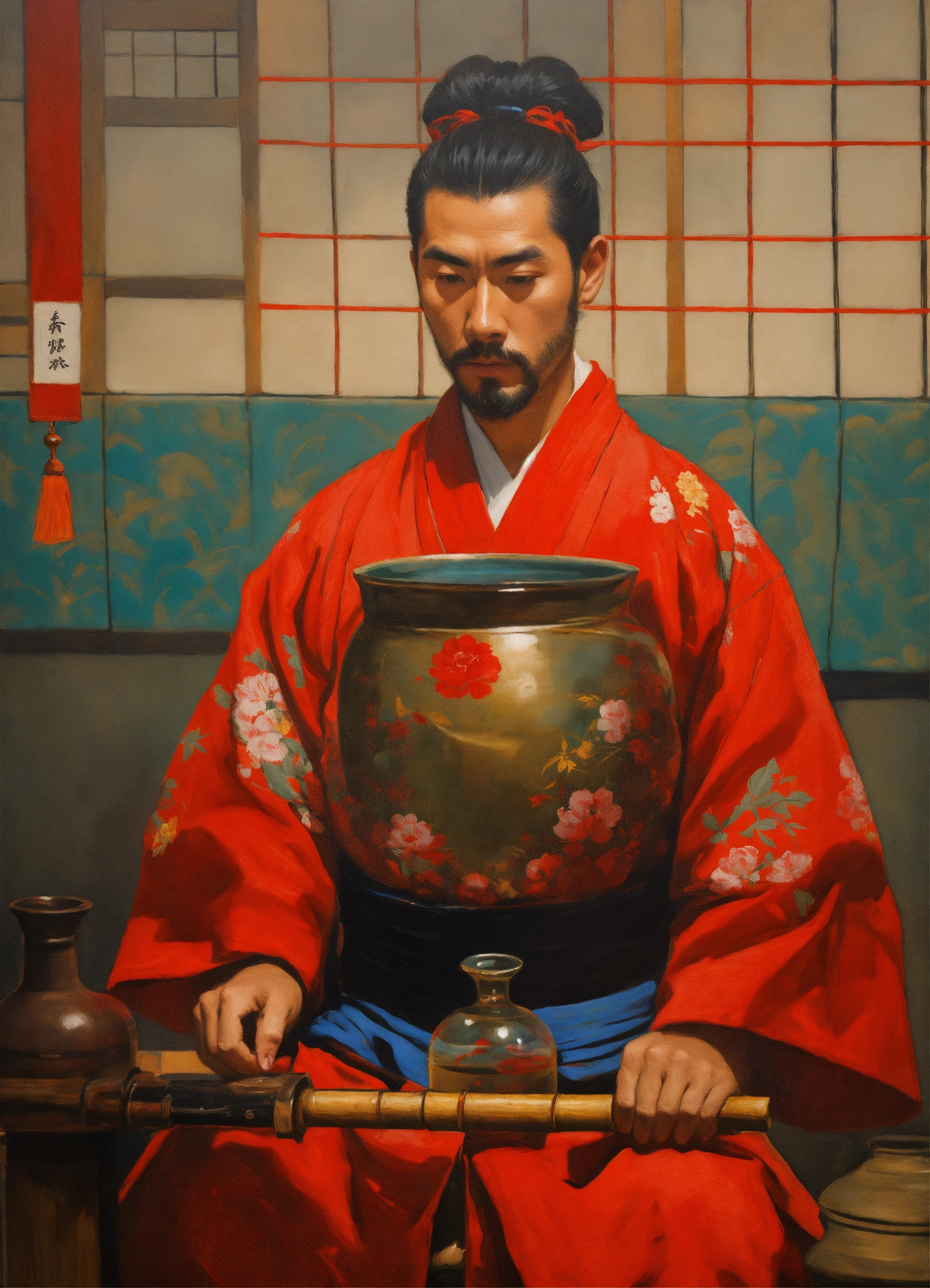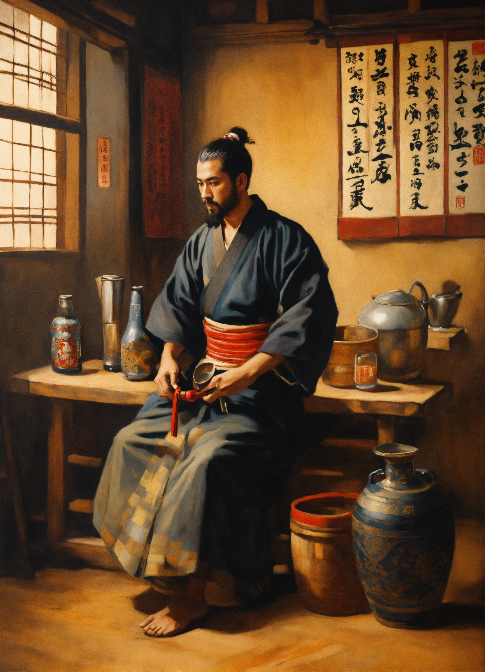 Cuadro impresionista de un hombre, español, vestido de samurai, observando como trabajan en una fábrica de envasado de bebidas
