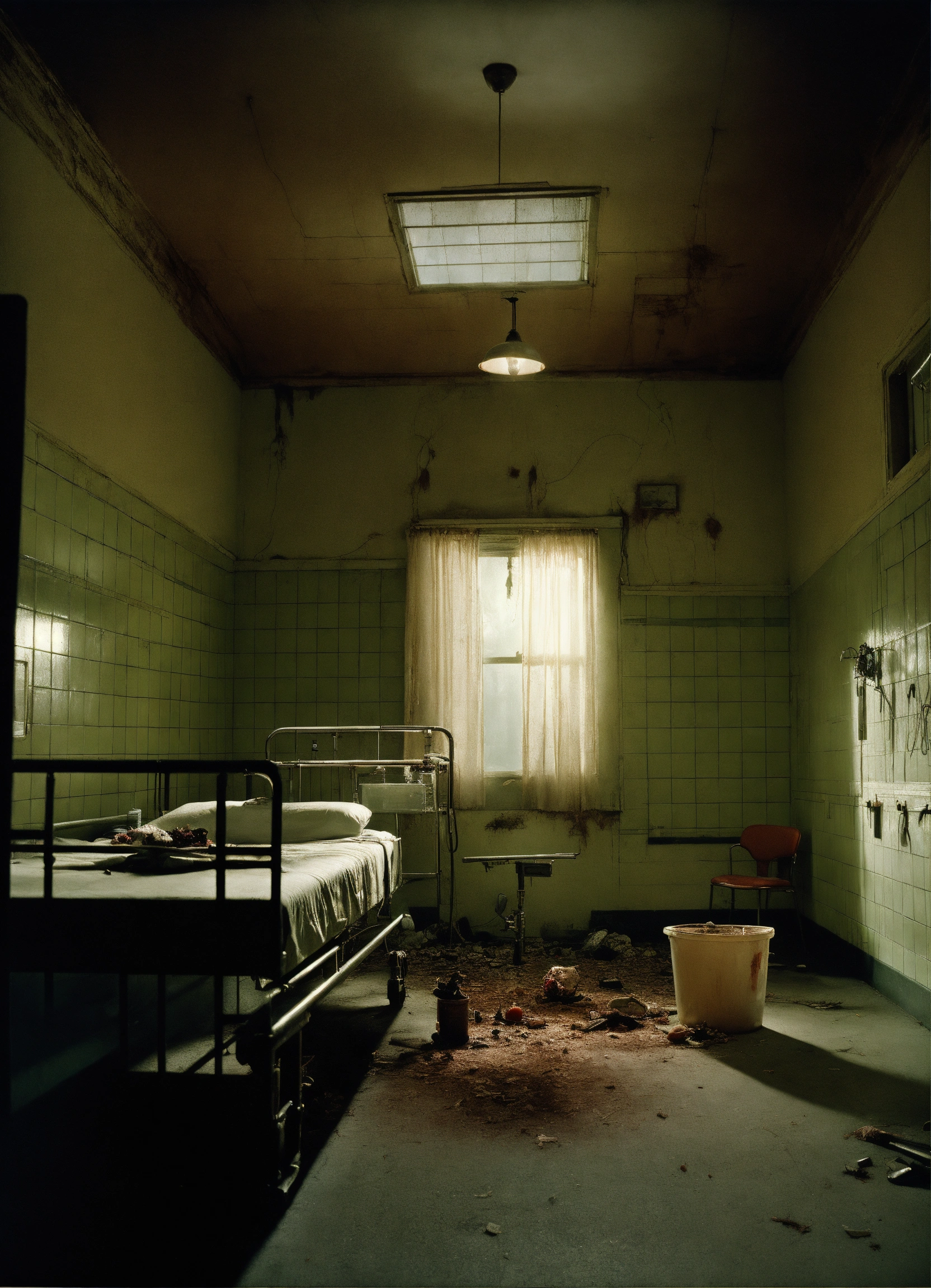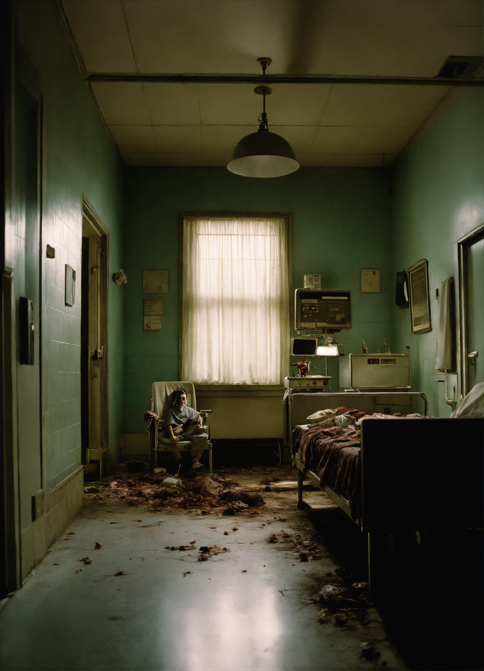 Analog photographic highly detailed cinematic of a scary zomby inside an hunted hospital, hyperdetailed, ominous, ethereal, dramatic lighting, by gregory crewdson