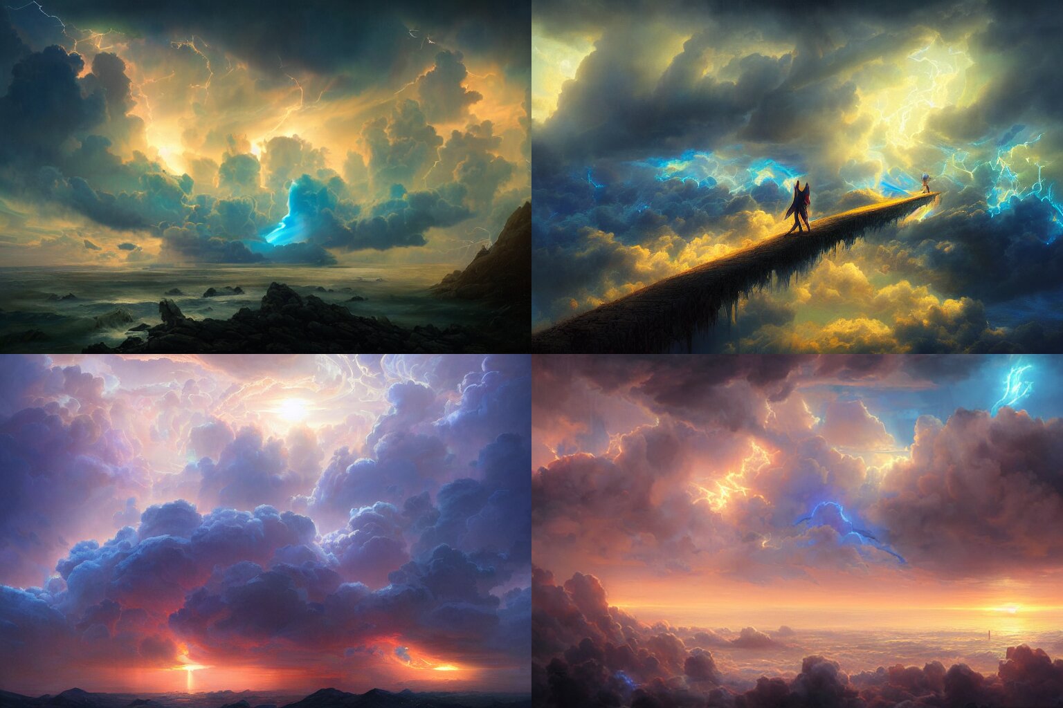 Stormy sky, sunrise, with blue light piercing through clouds, royal blue colors, lighting refraction, volumetric lighting, highly detailed, wlop, peter mohrbacher and greg rutkowski