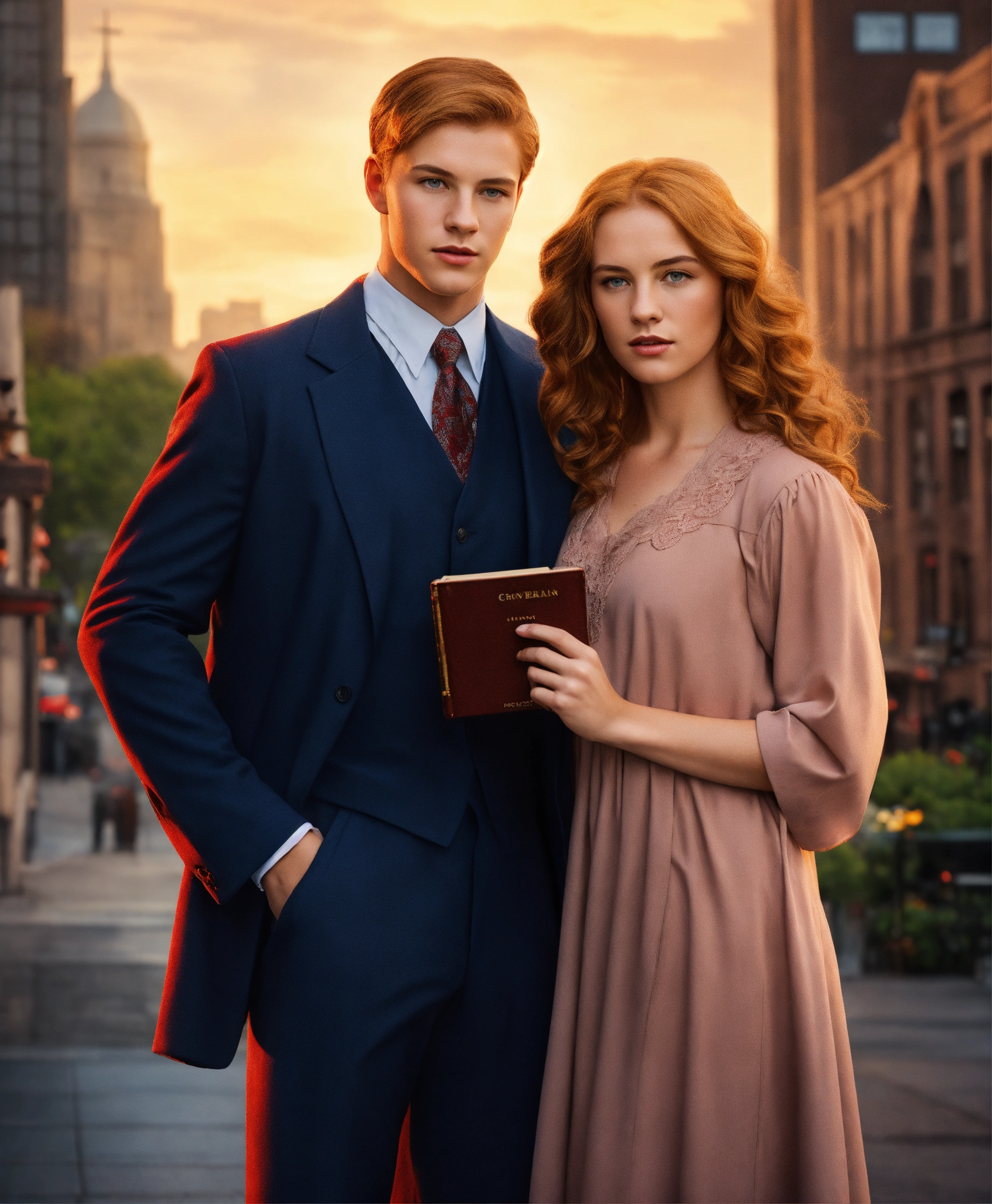 Create a captivating book cover design that conveys the theme of romance, family saga fiction, contemporary women's fiction a young woman with strawberry blonde hair, blue eyes, and should be wearing a crucifix. wearing conservative clothing, ponytailed hair, and closed-neck clothing, from 1920s clothing, passionate about being a christian, the man character is a bad boy looking rich guy, dark red hair, hazel eyes, he is a congressman, background skyline of philadelphia, photoreal, photorealistic, photoreal, history clothing, make it real photo, realistic, photoreal, with shadow effects, captivating cover, with lighting and shadow effects, face focus on top, with some effects, man and woman, captivating cover design, lighting and shadow effects