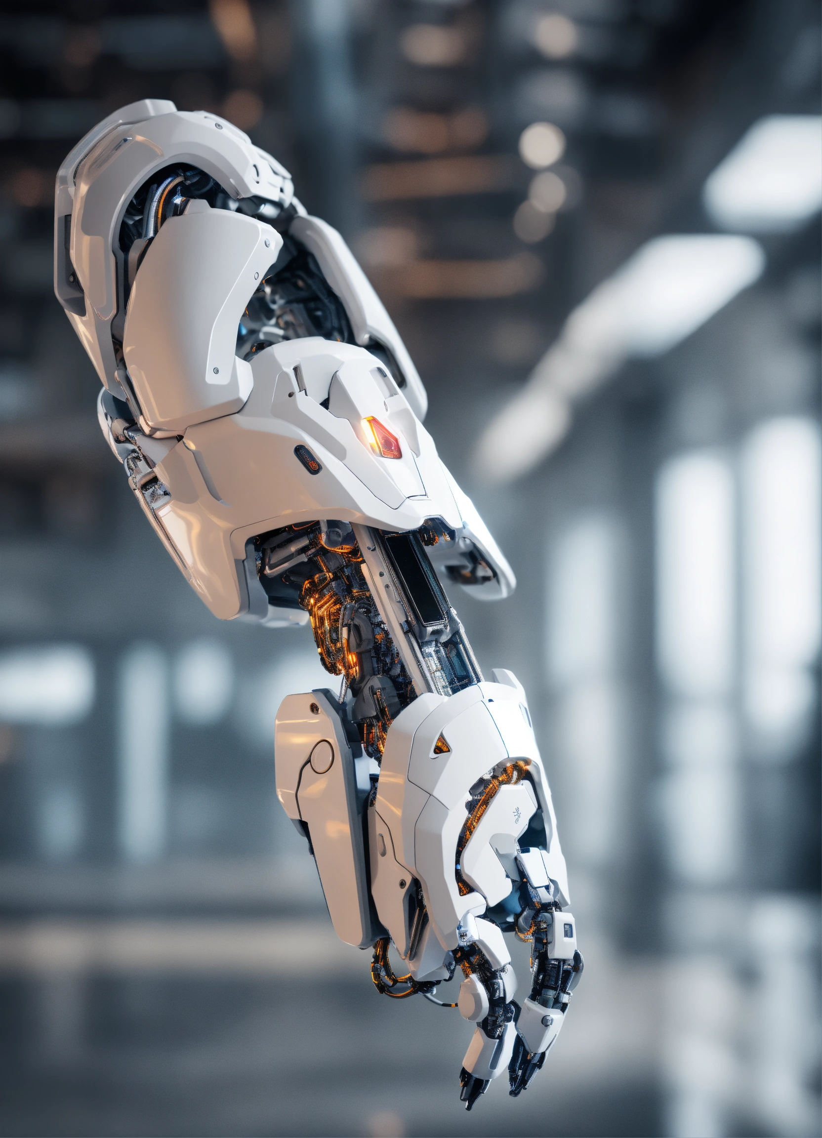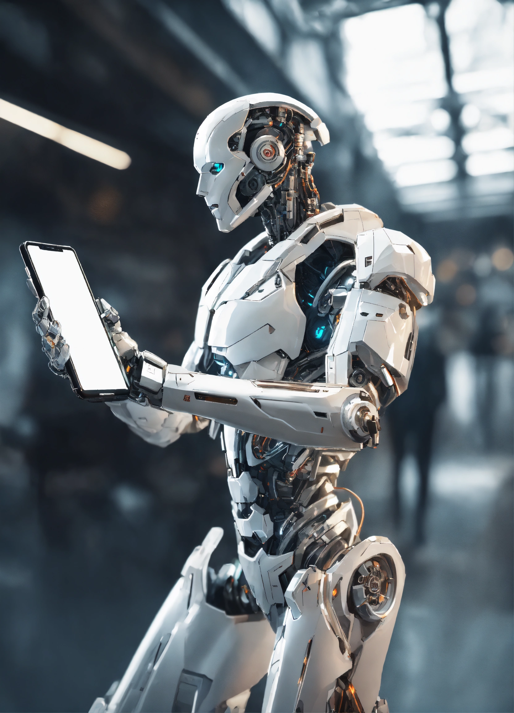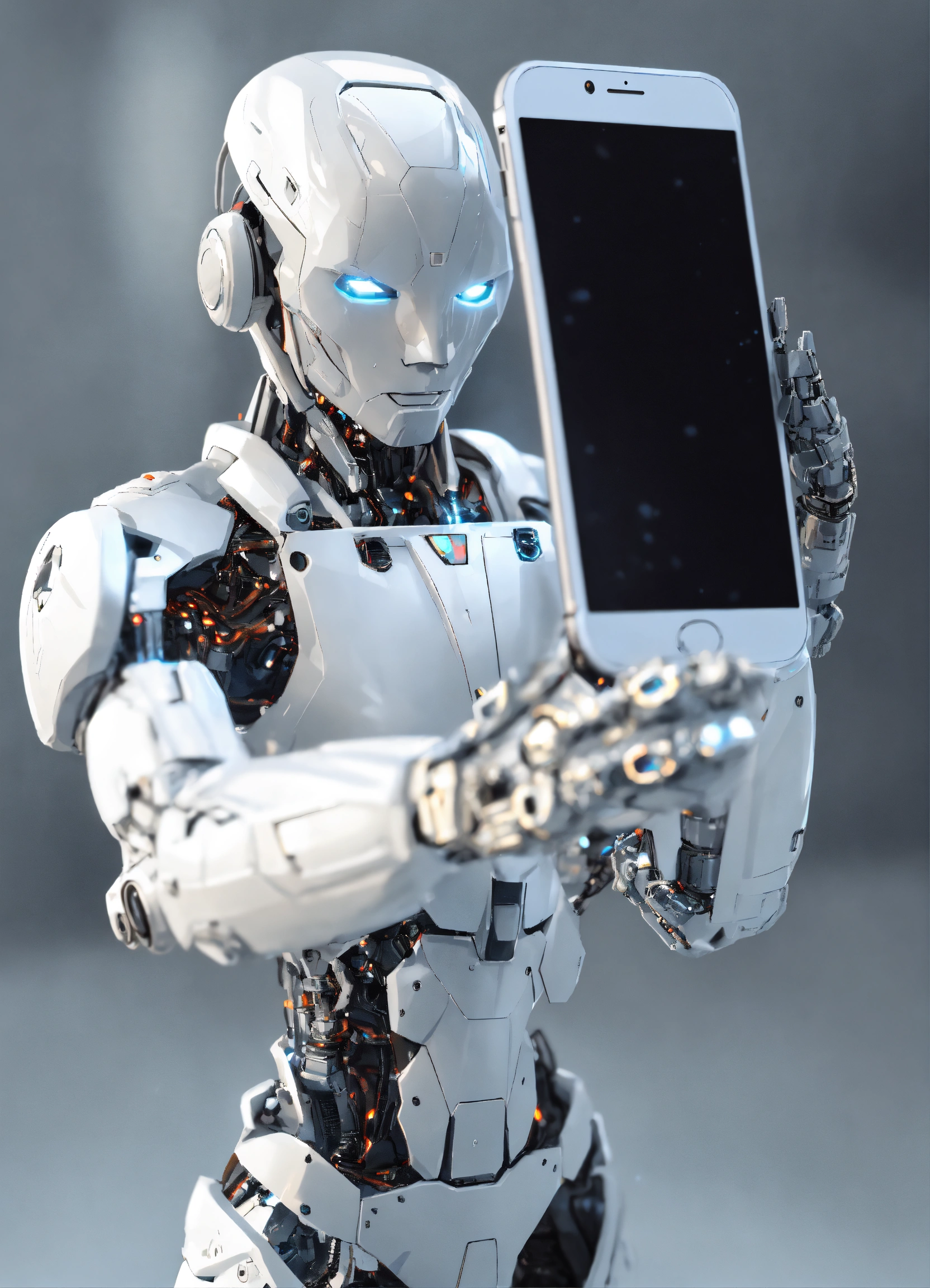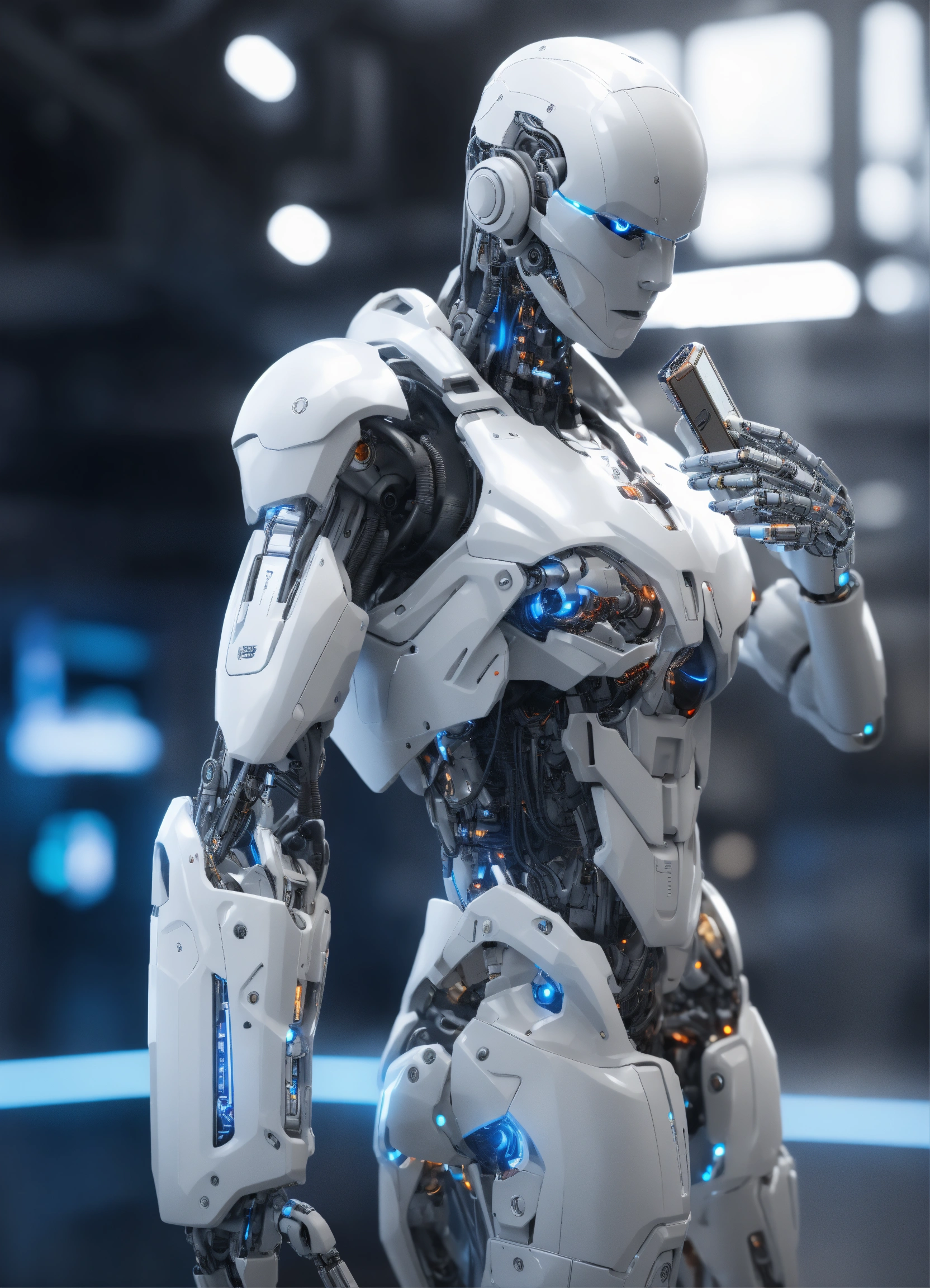 White humanoid cyborg arm holding smartphone