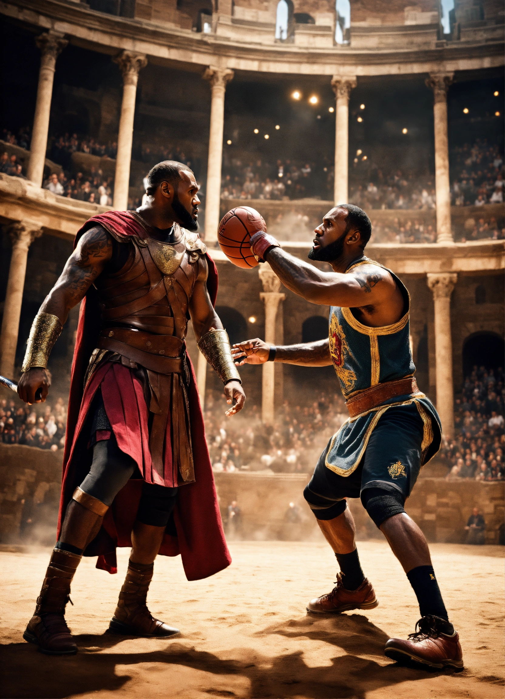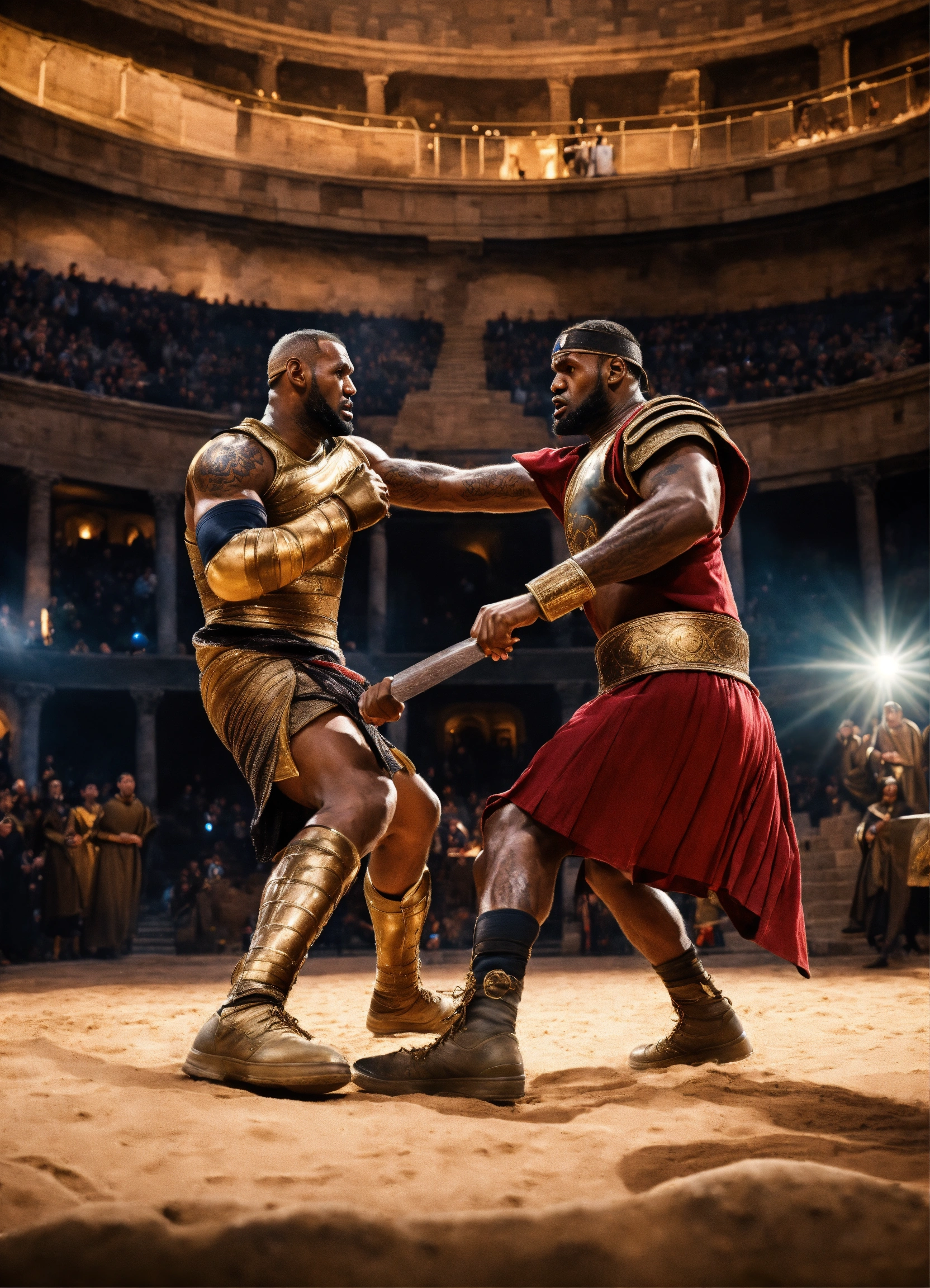 Photo realistic shot of harry potter and lebron james fighting in a gladiator fight in the colosseum