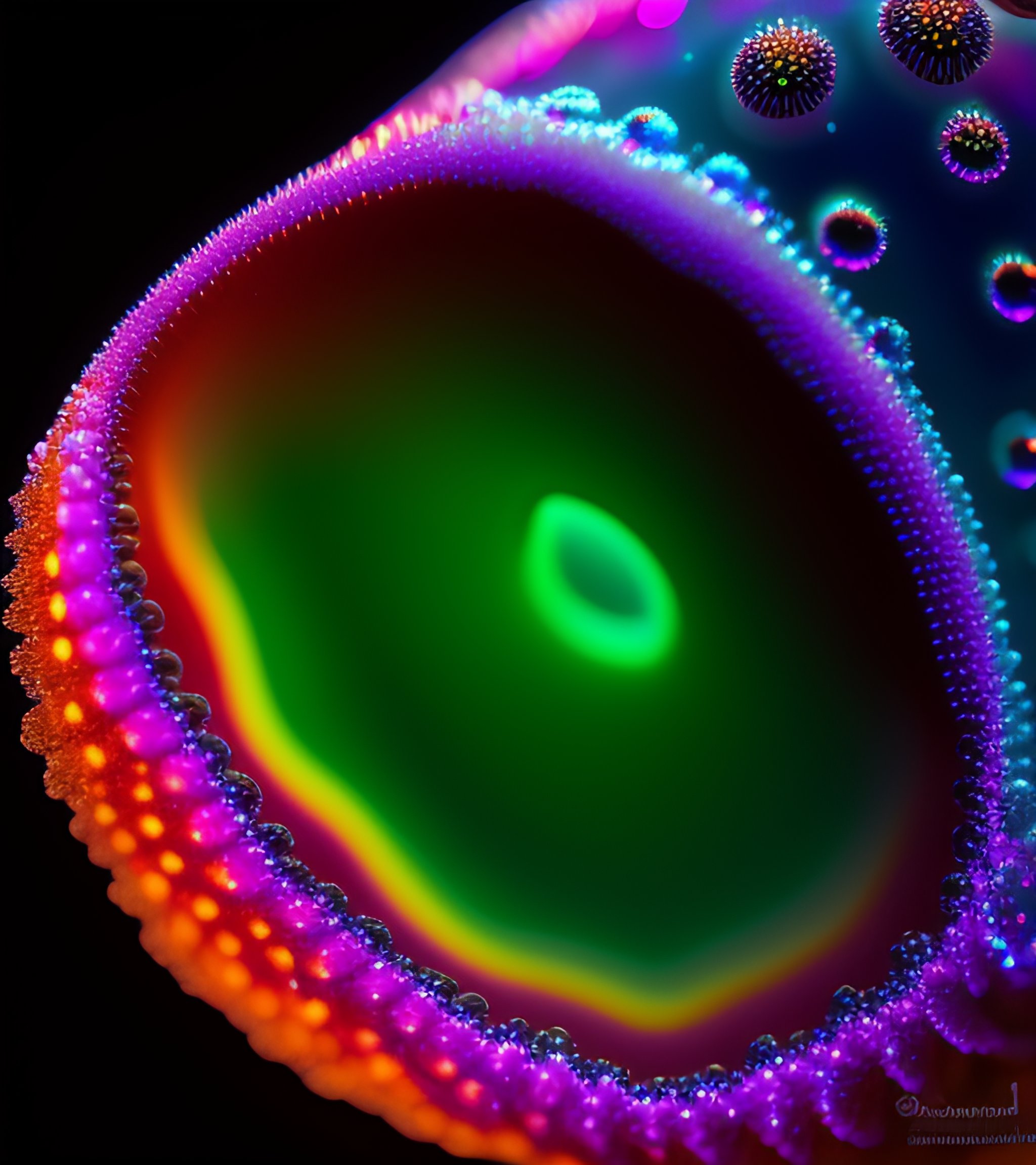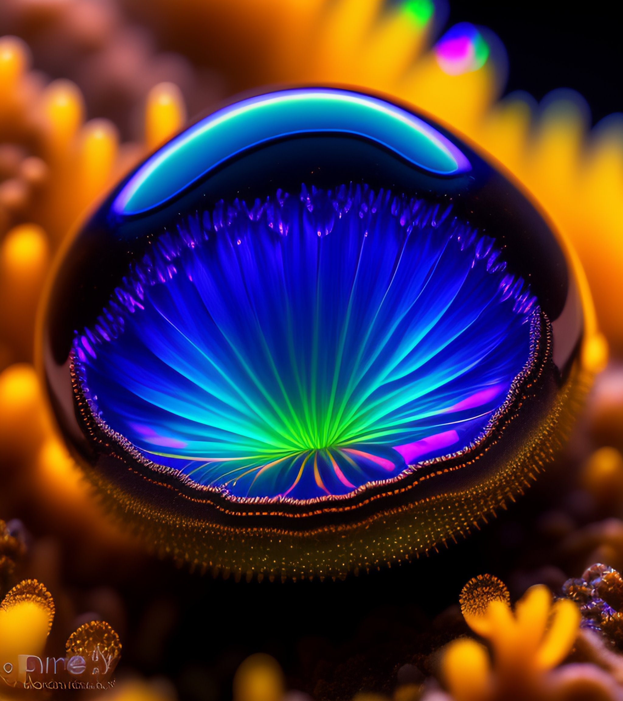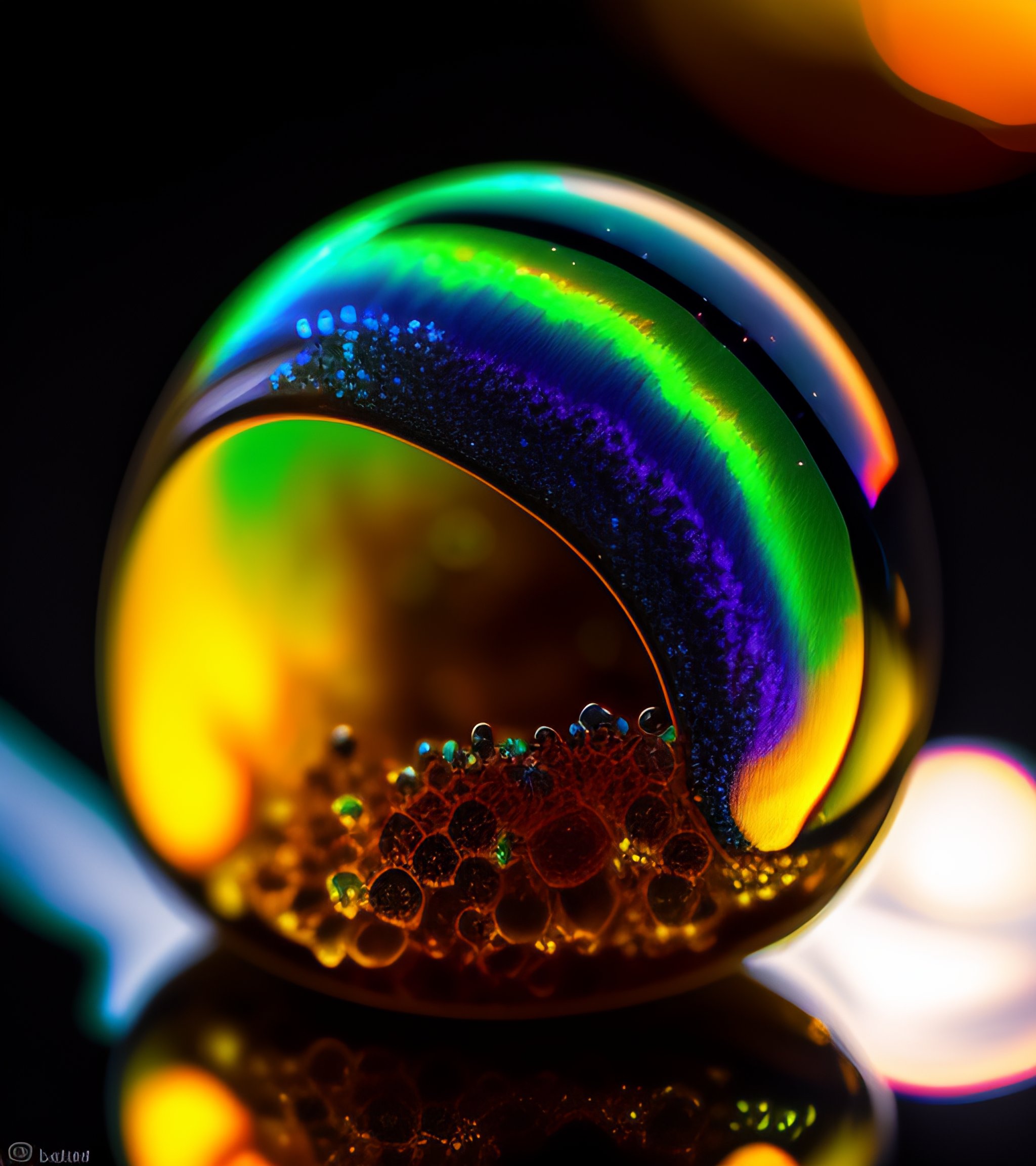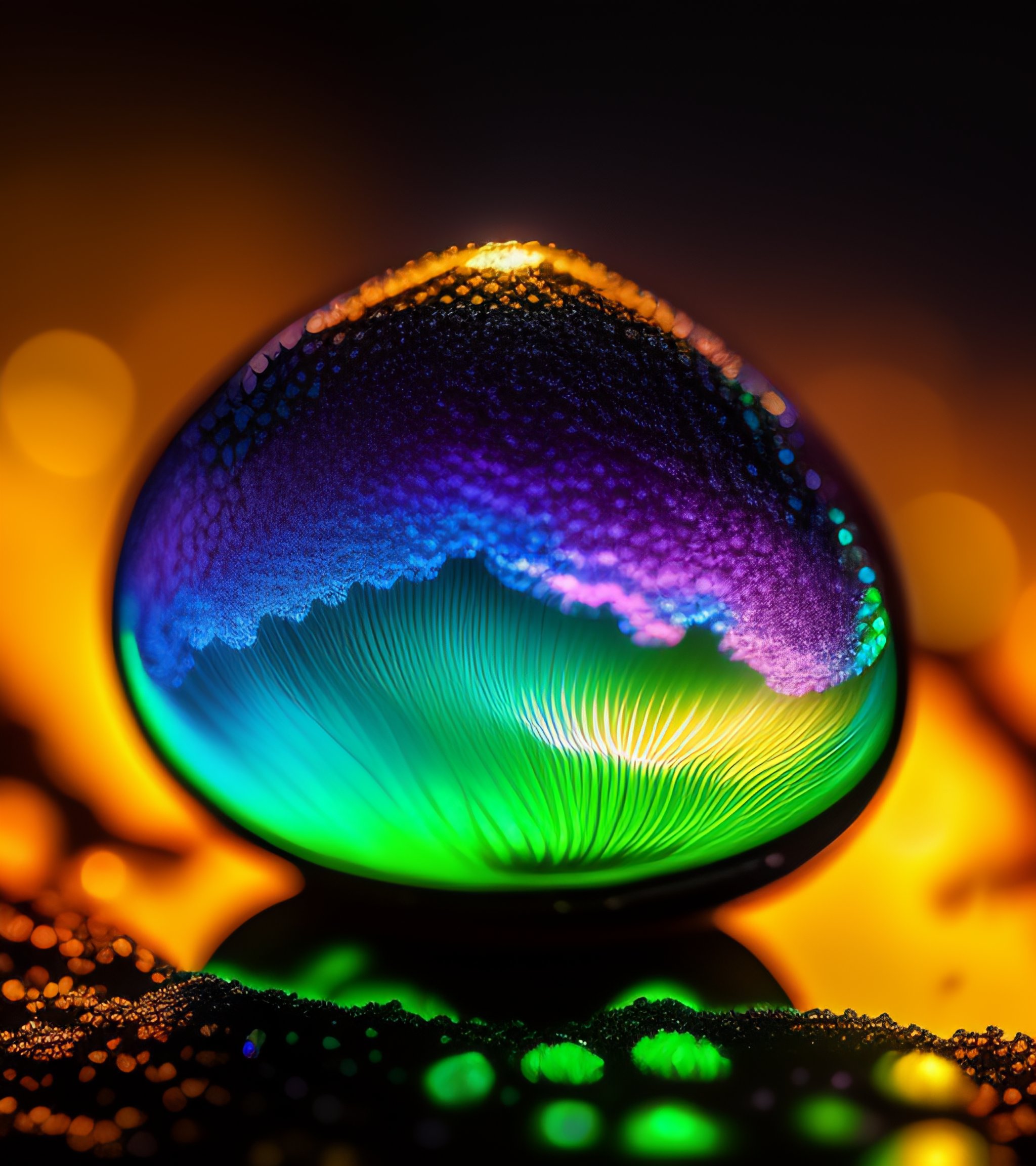 A photograph of a luminous iridescent black myxomycete, slime mold, beautiful iridescence, swirling, low depth of field
