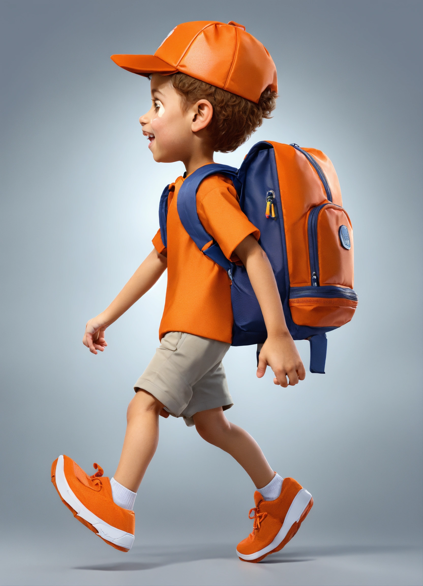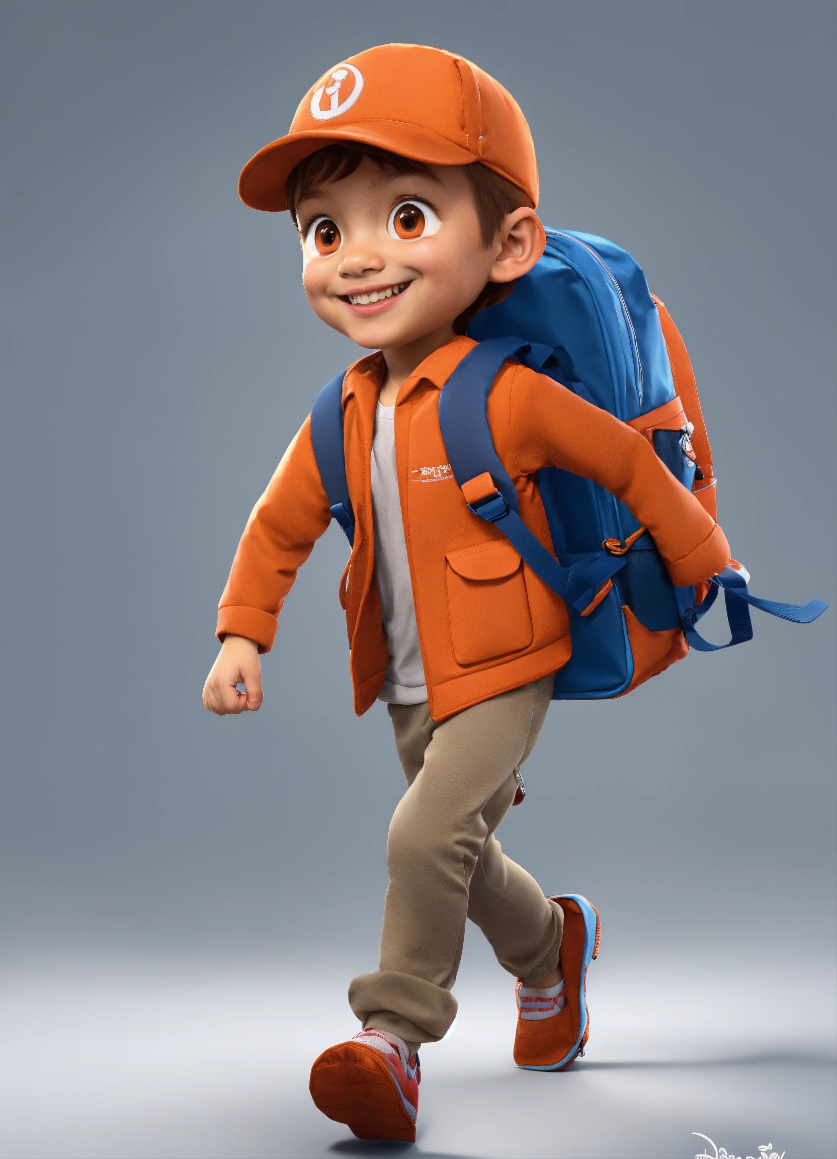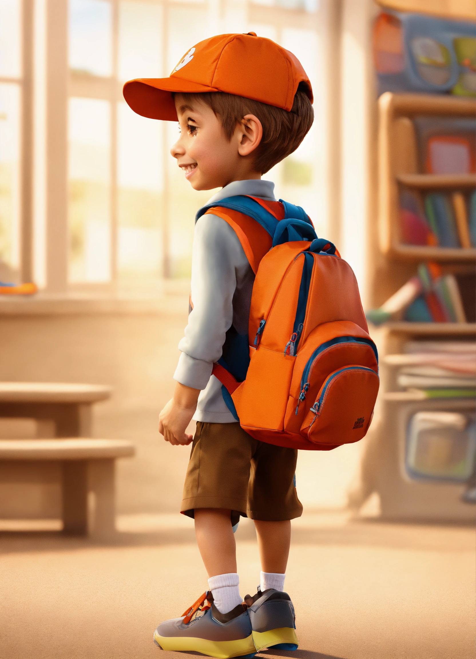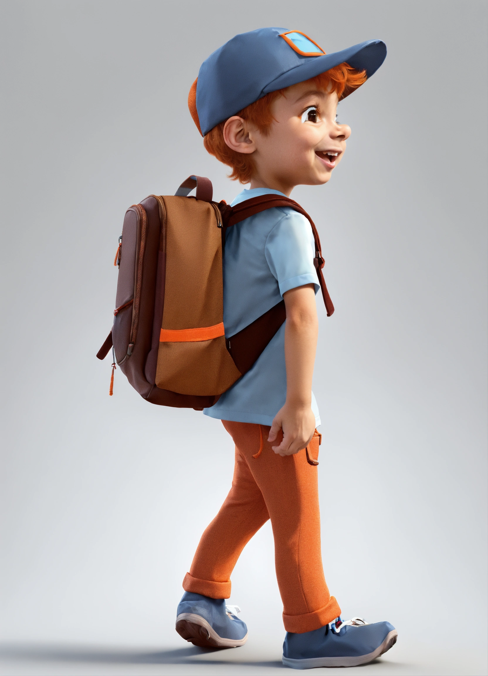 7 year old. happy boy with light skin, with cap, hair in color orang-brown. drawn from the back, (((ran enthusiastically with school bag))).by disney concept artists, elegant, sharp focus. 3d style. happy. white background. full body. looking to the side. photographed from behind.