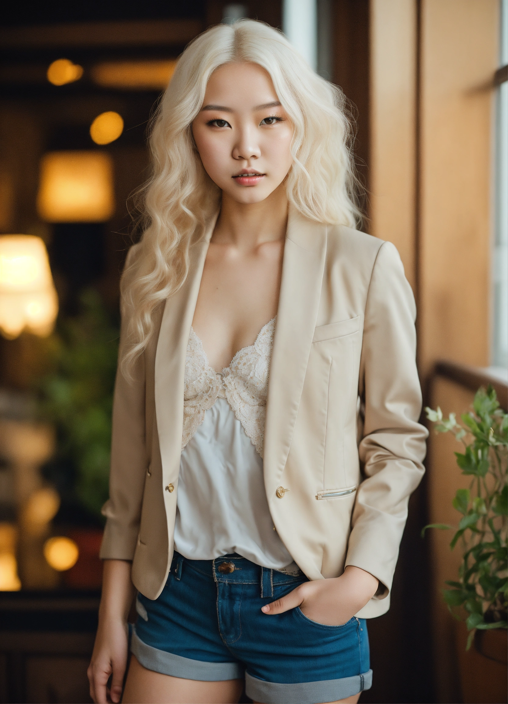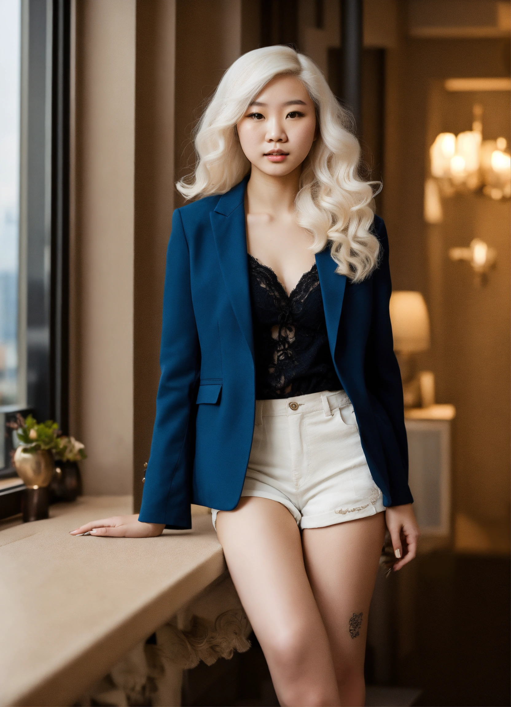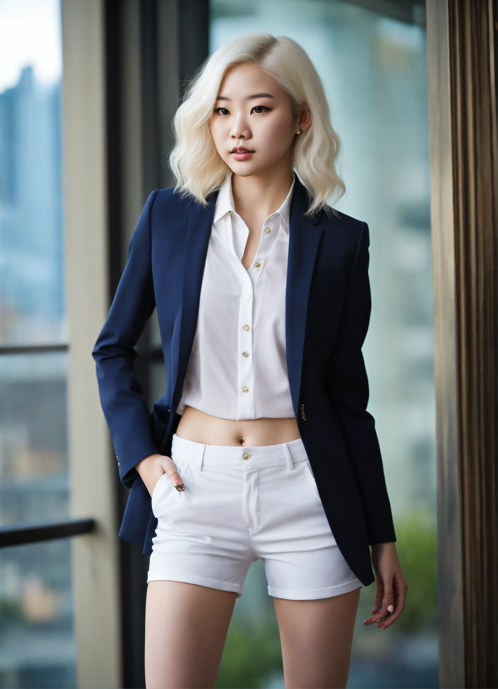 Gorgeous albino asain 20-year-old female. with dark wavy hair. petite muscular frame, dressed in formal jacket and shorts. heels. in upscale penthouse