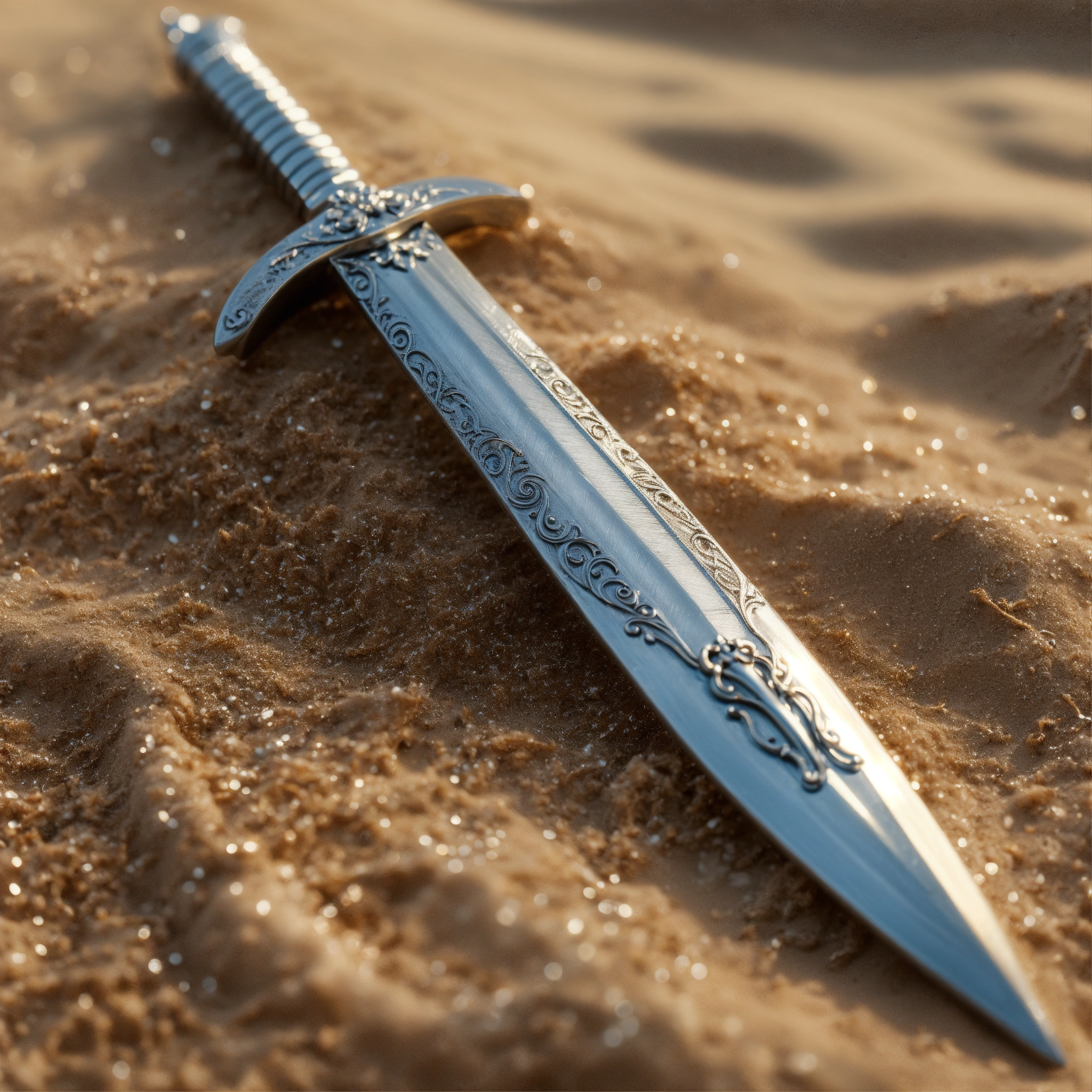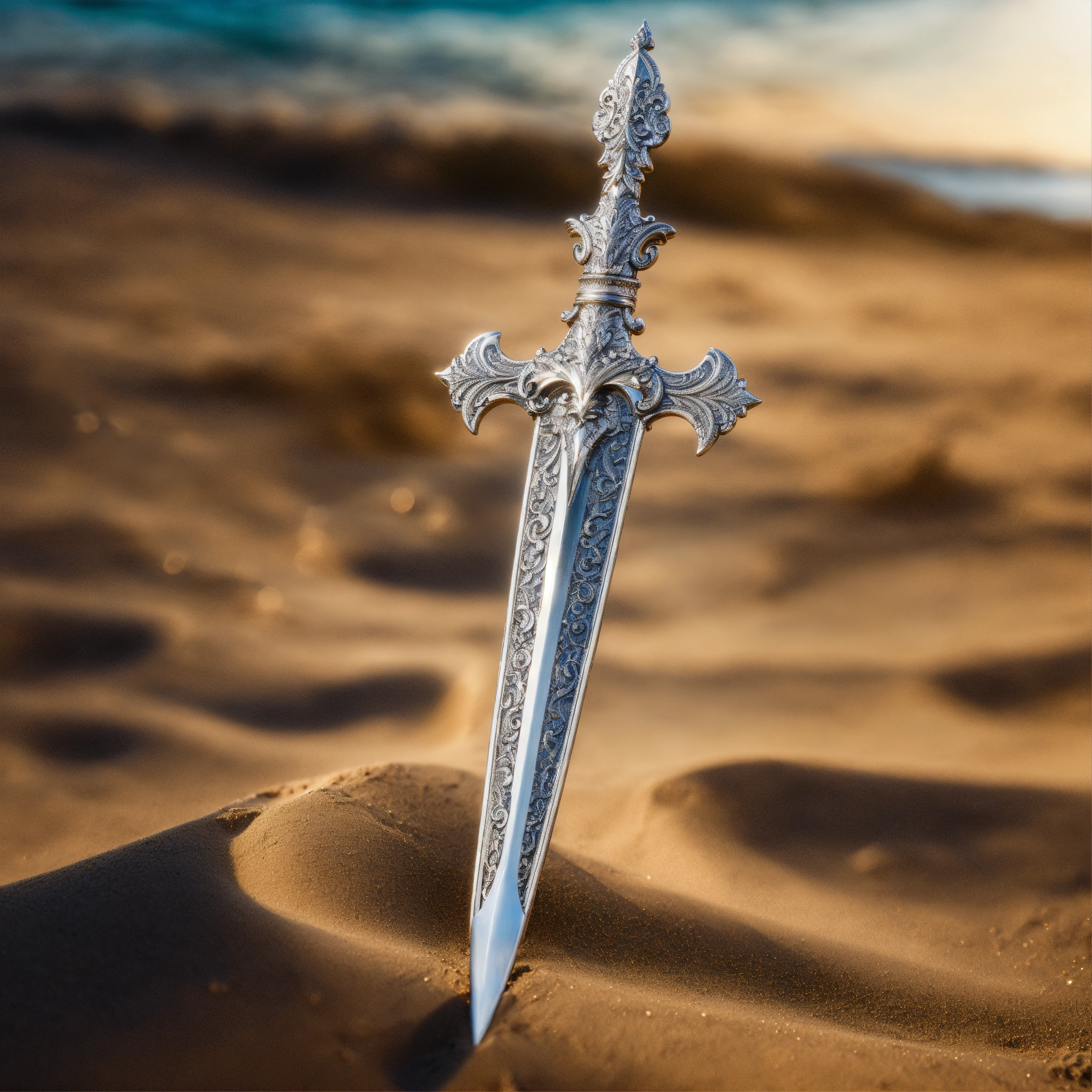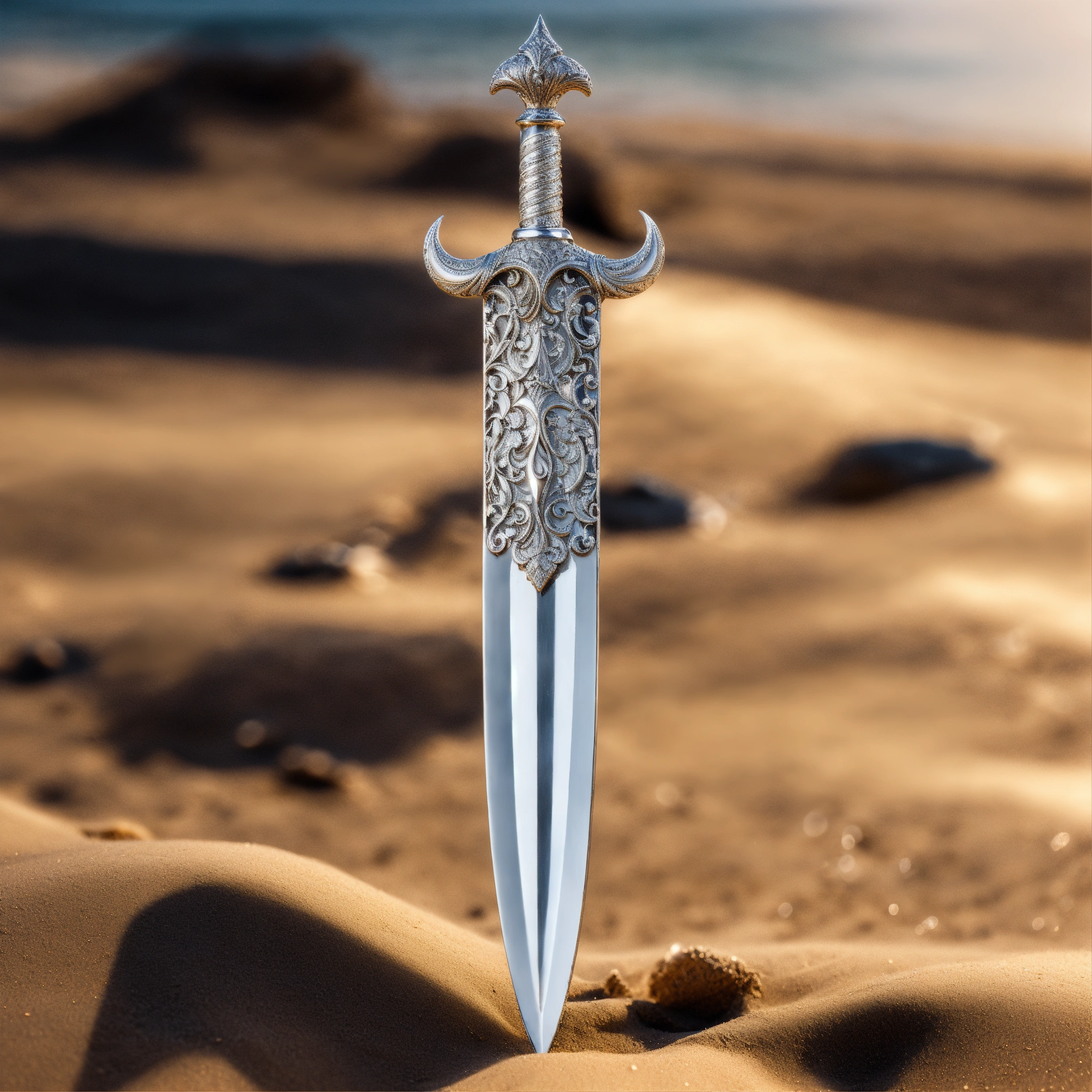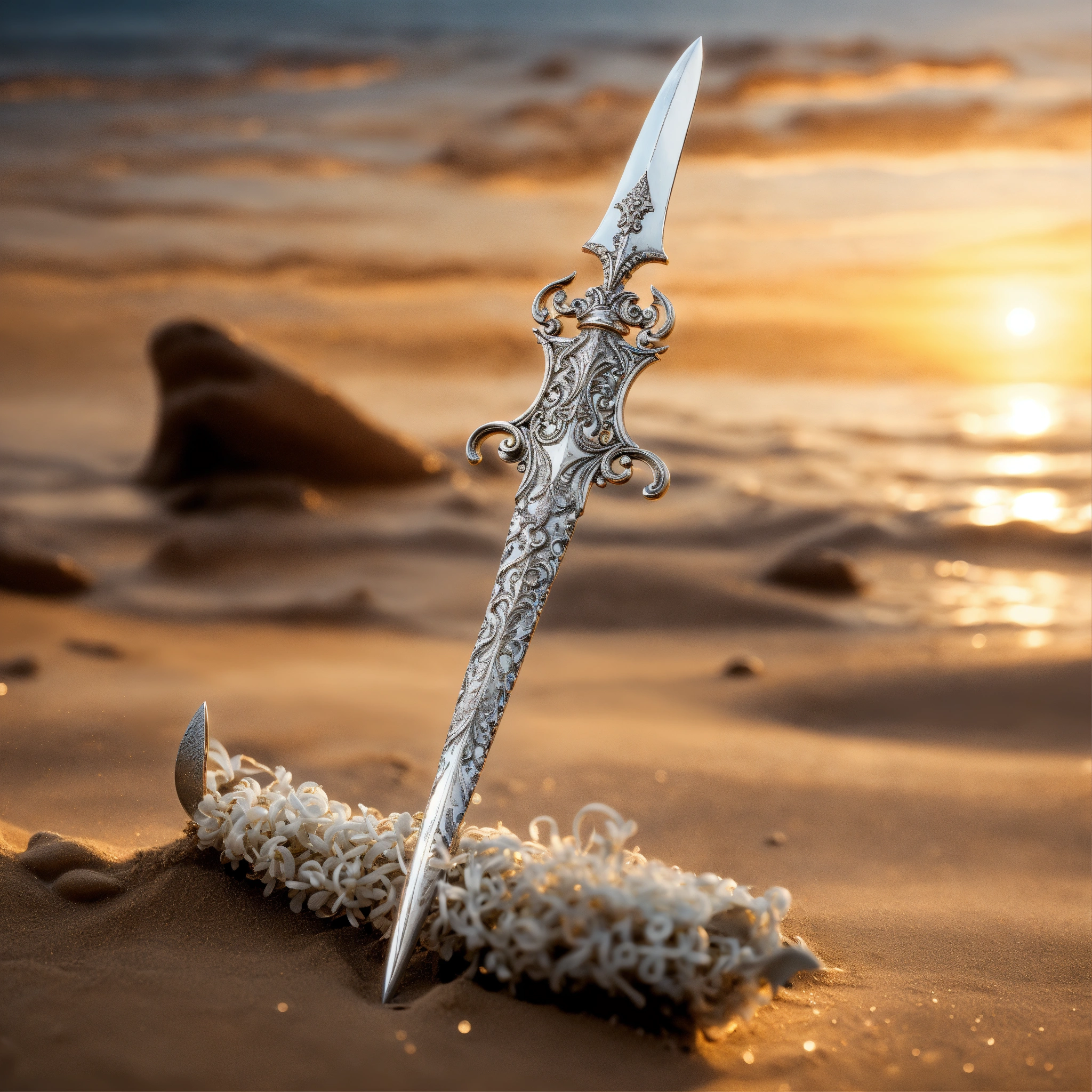 8k, picture of a narrow and delicate wavy dagger made of lunar-silver, highly ornamented, handle is wrapped with silver wire, very detailed, ultra realistic, lays on the beach in the sand, fantasy
