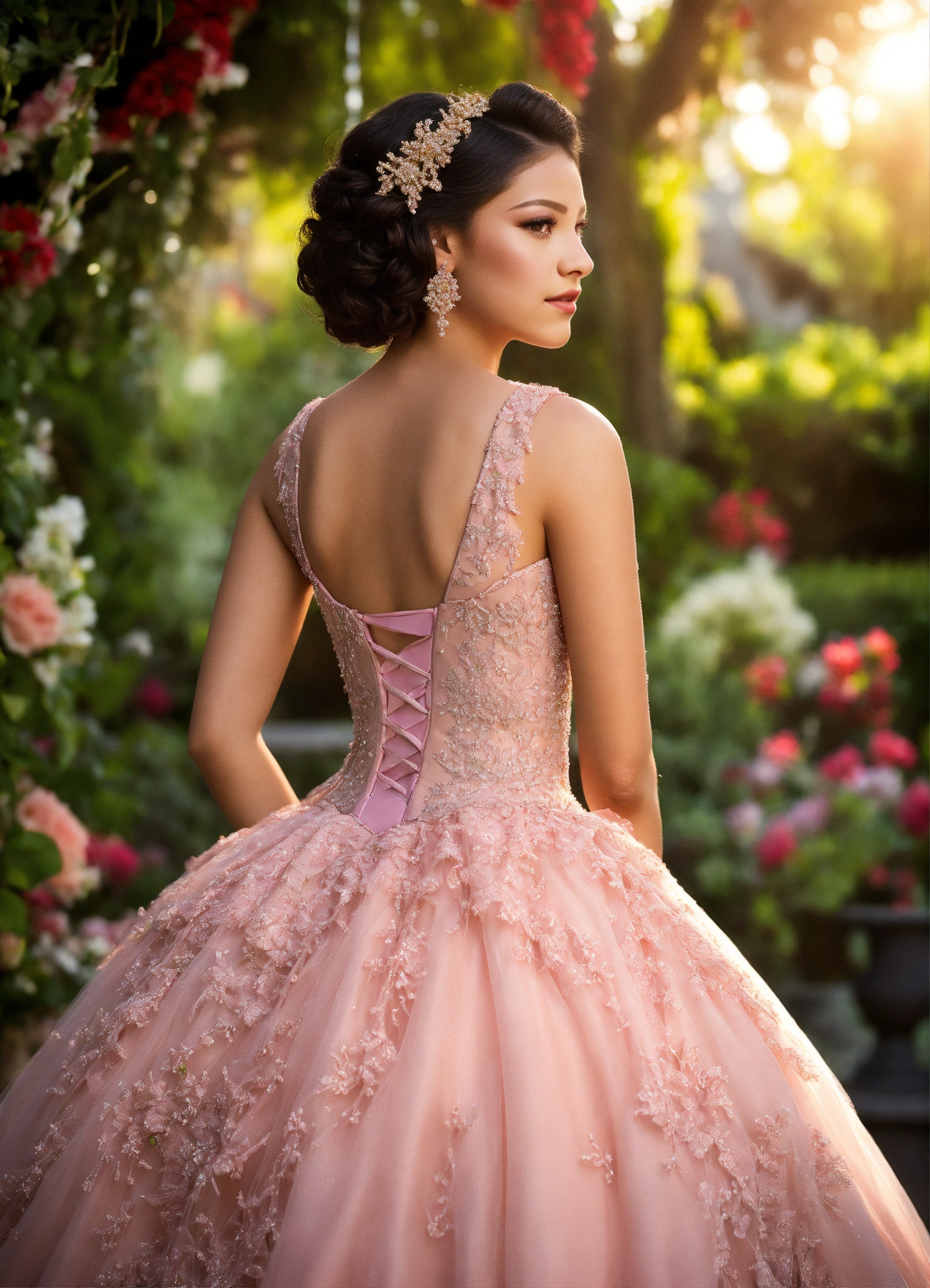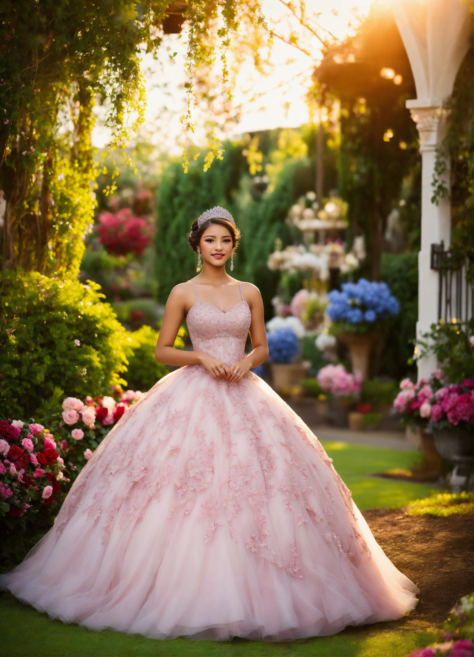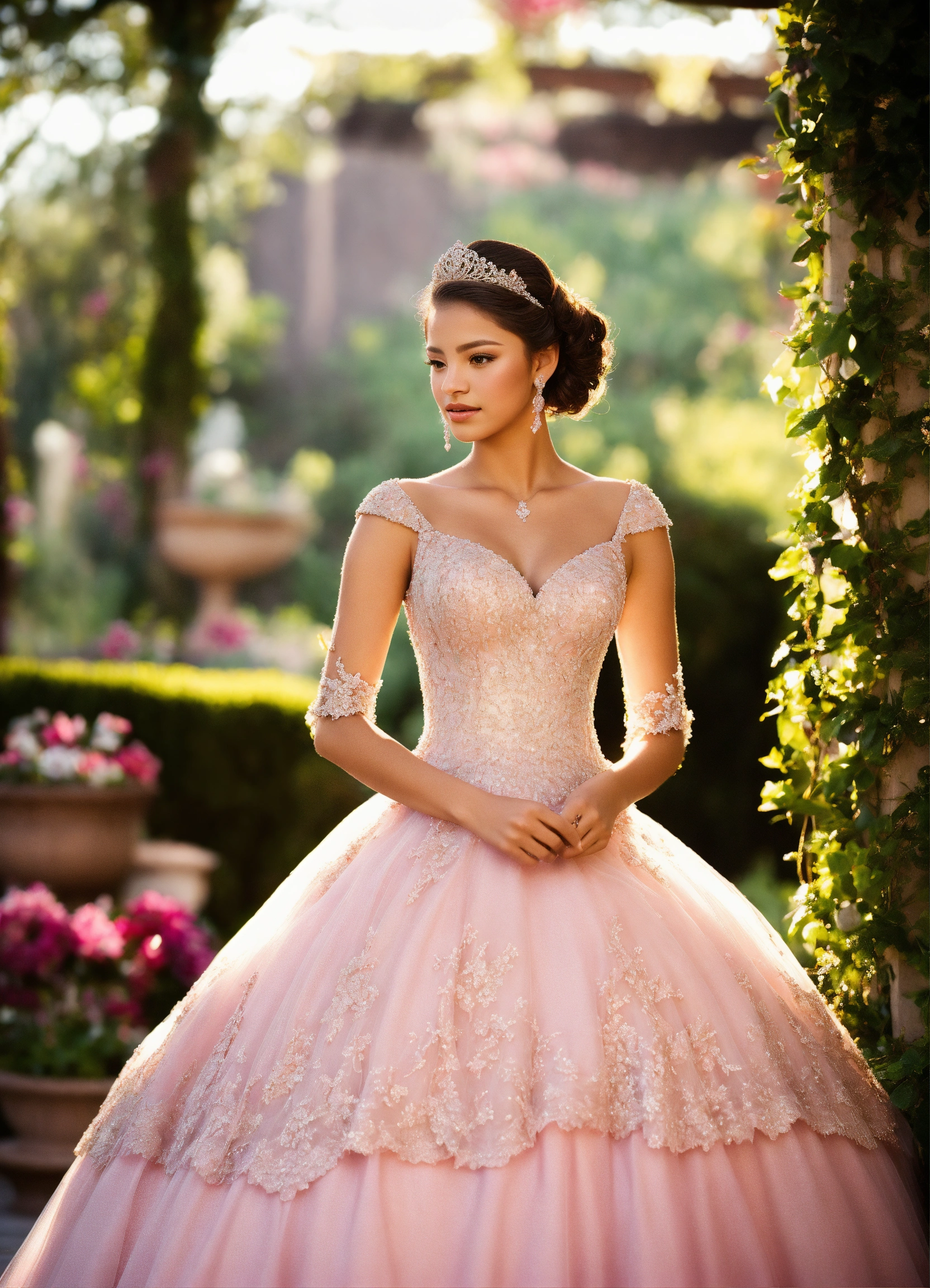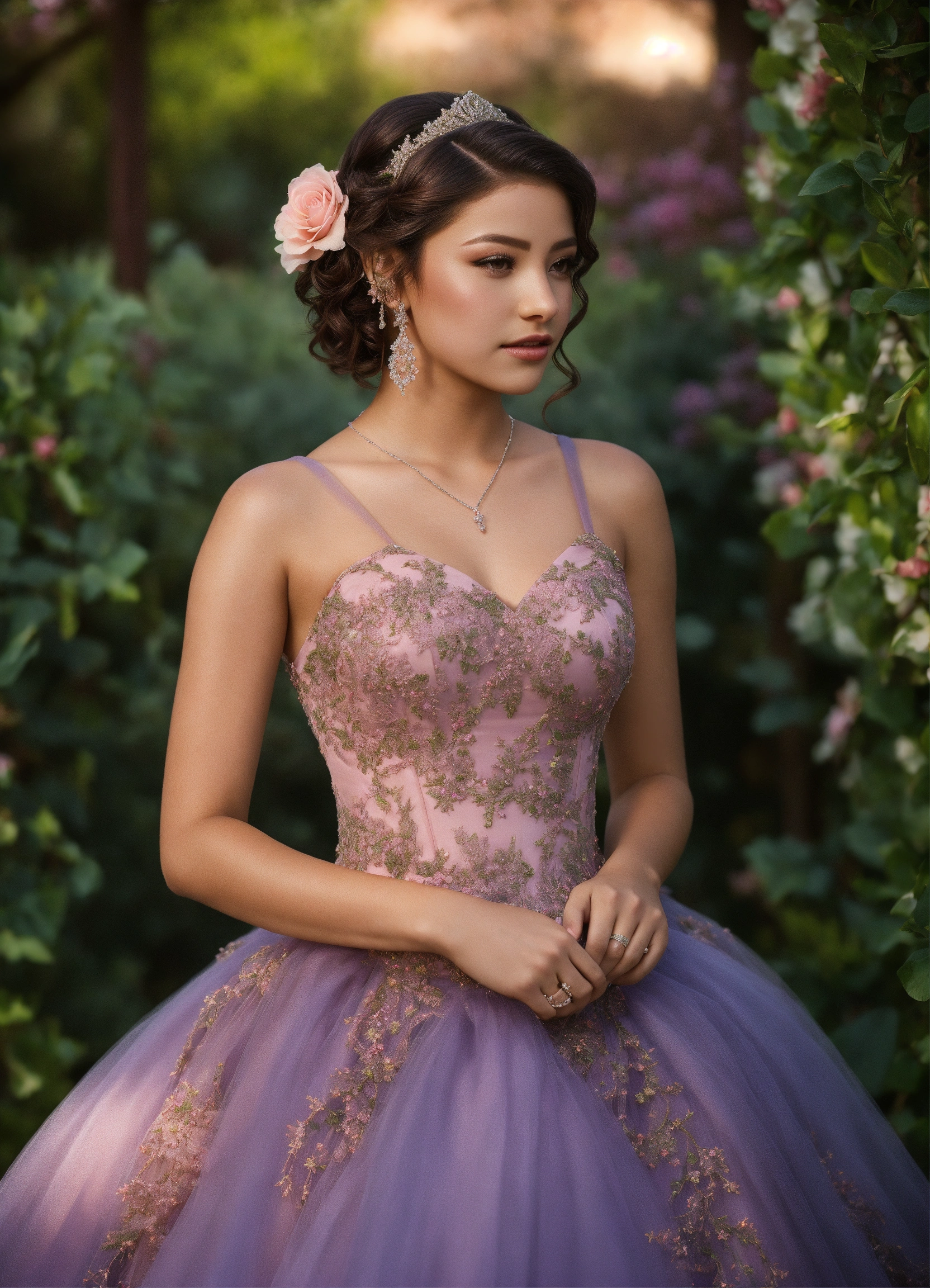 Quinceañera, very short hair, photorealistic, in a lovely detailed ballgown with very wide straps, dark garden backdrop