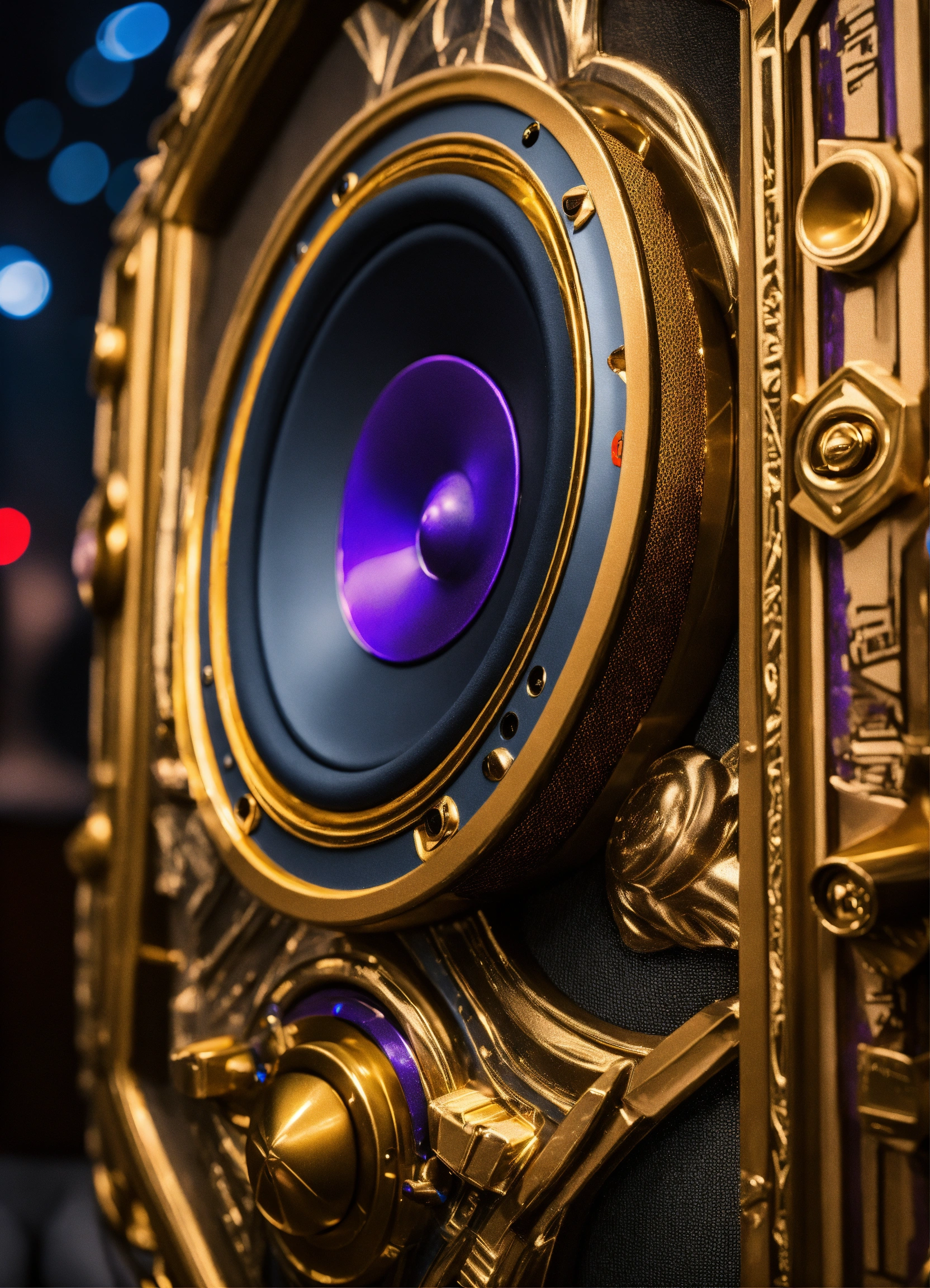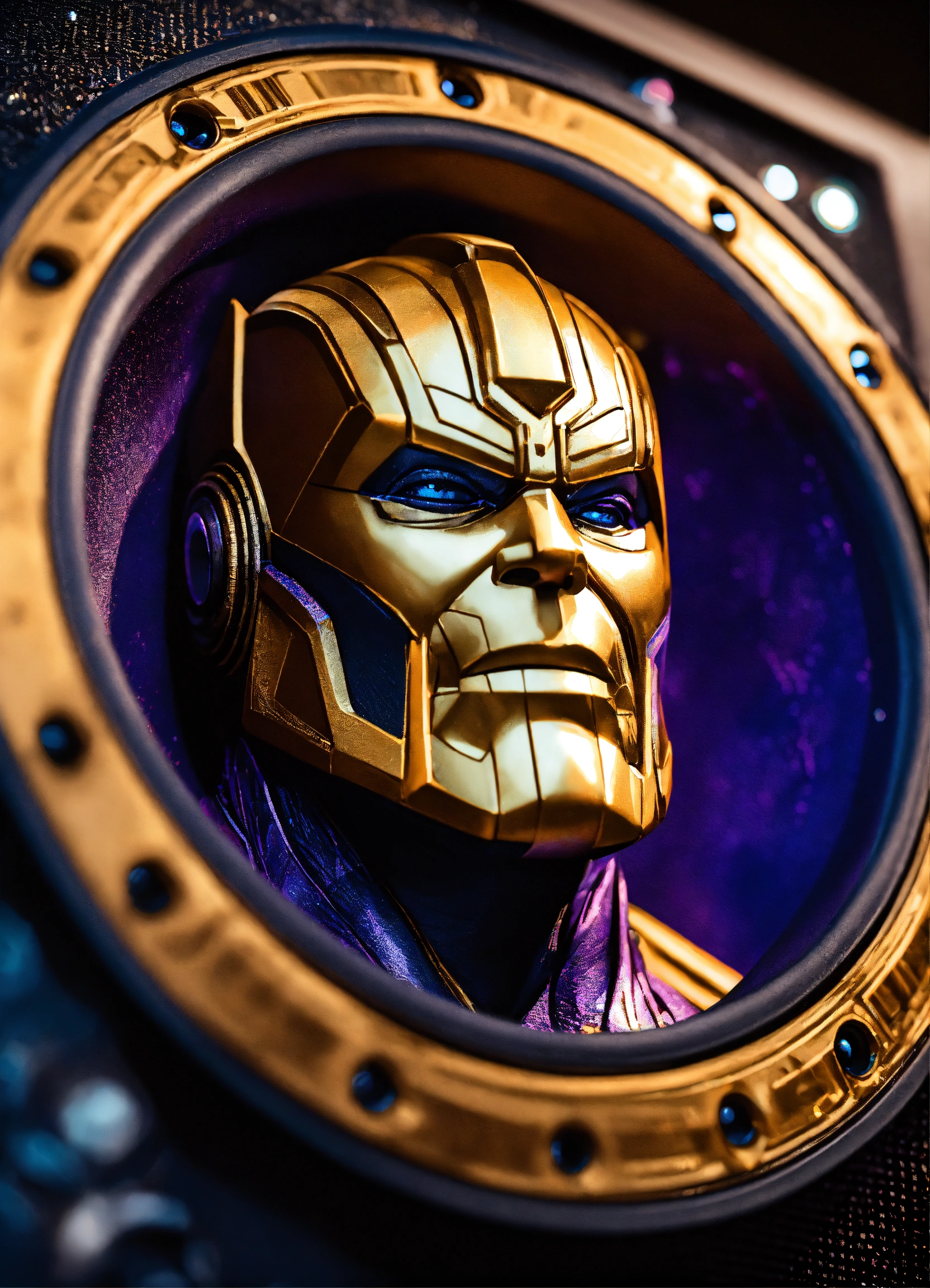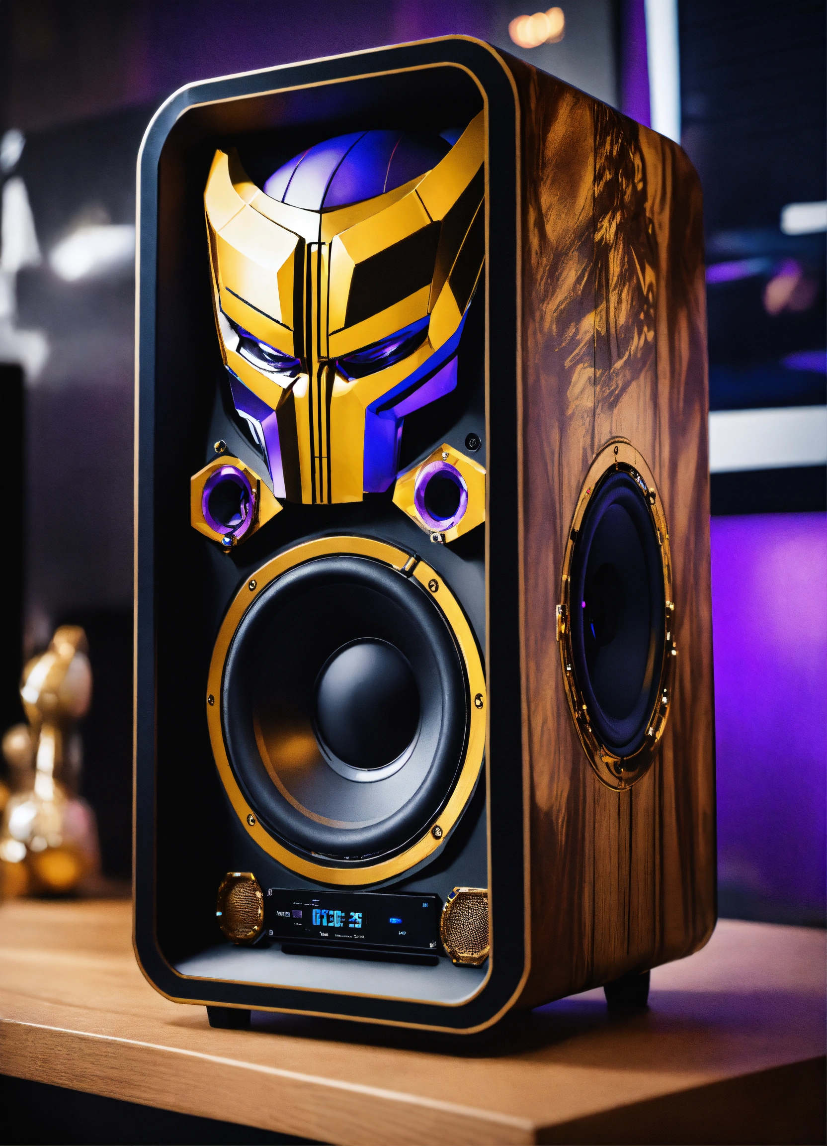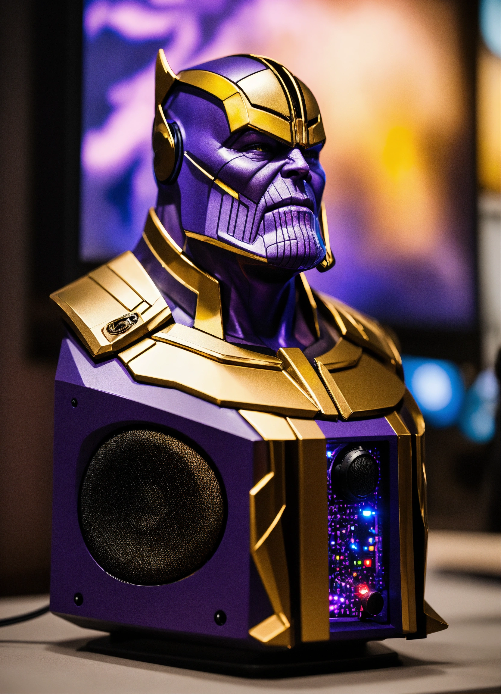 The side panel of a customized speaker, adorned with a photorealistic 3d image in stunning 32k ultra-definition of thanos enjoying music