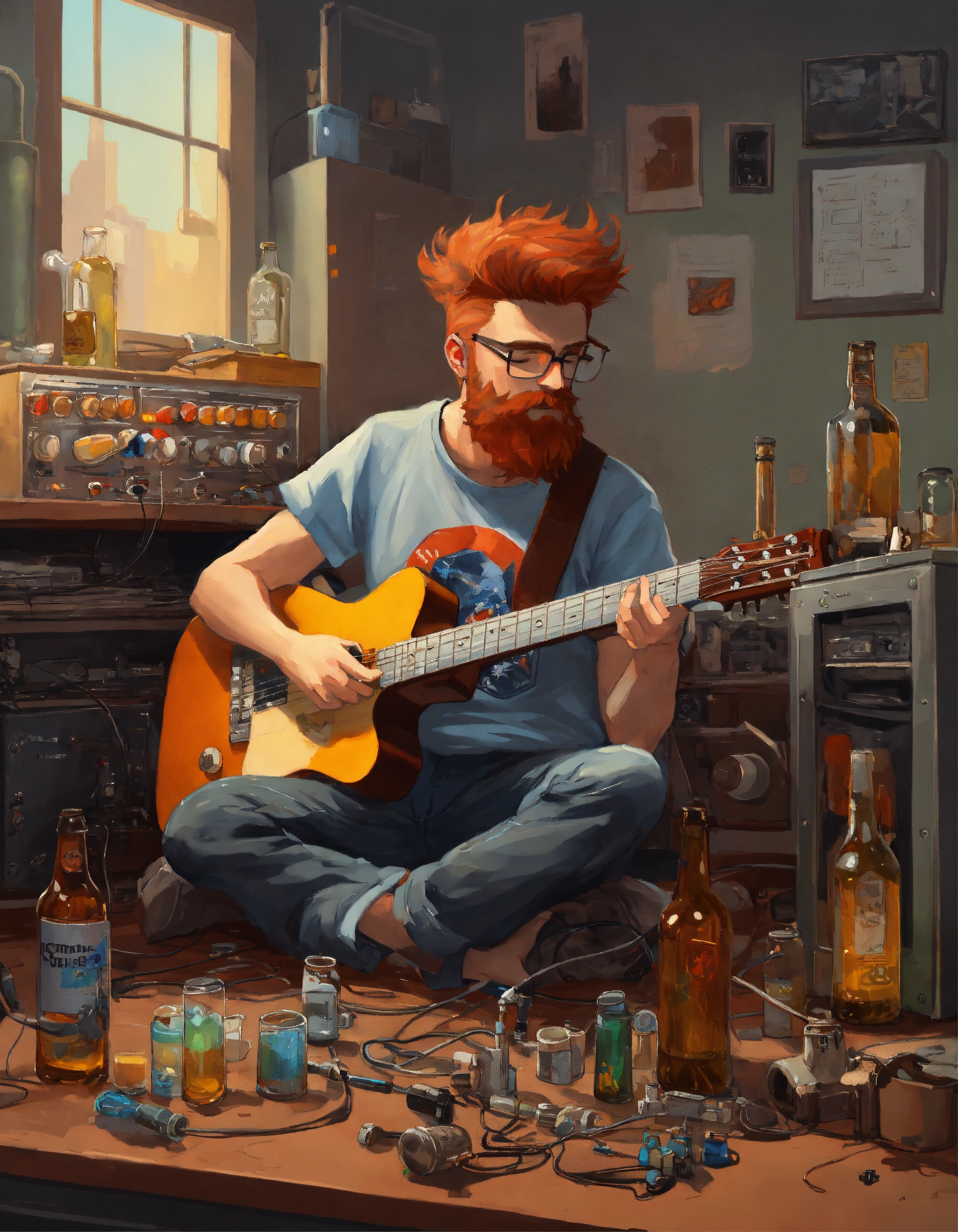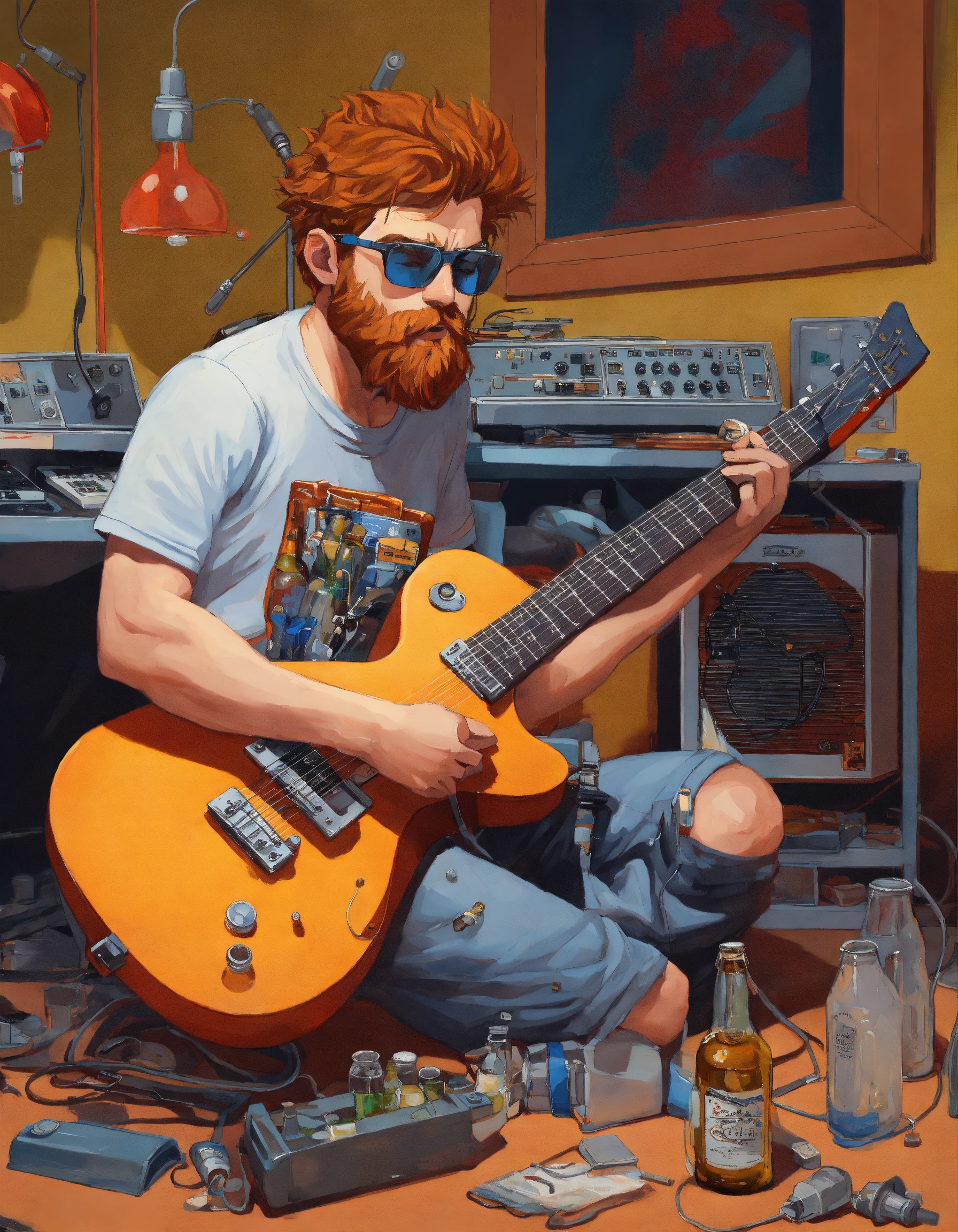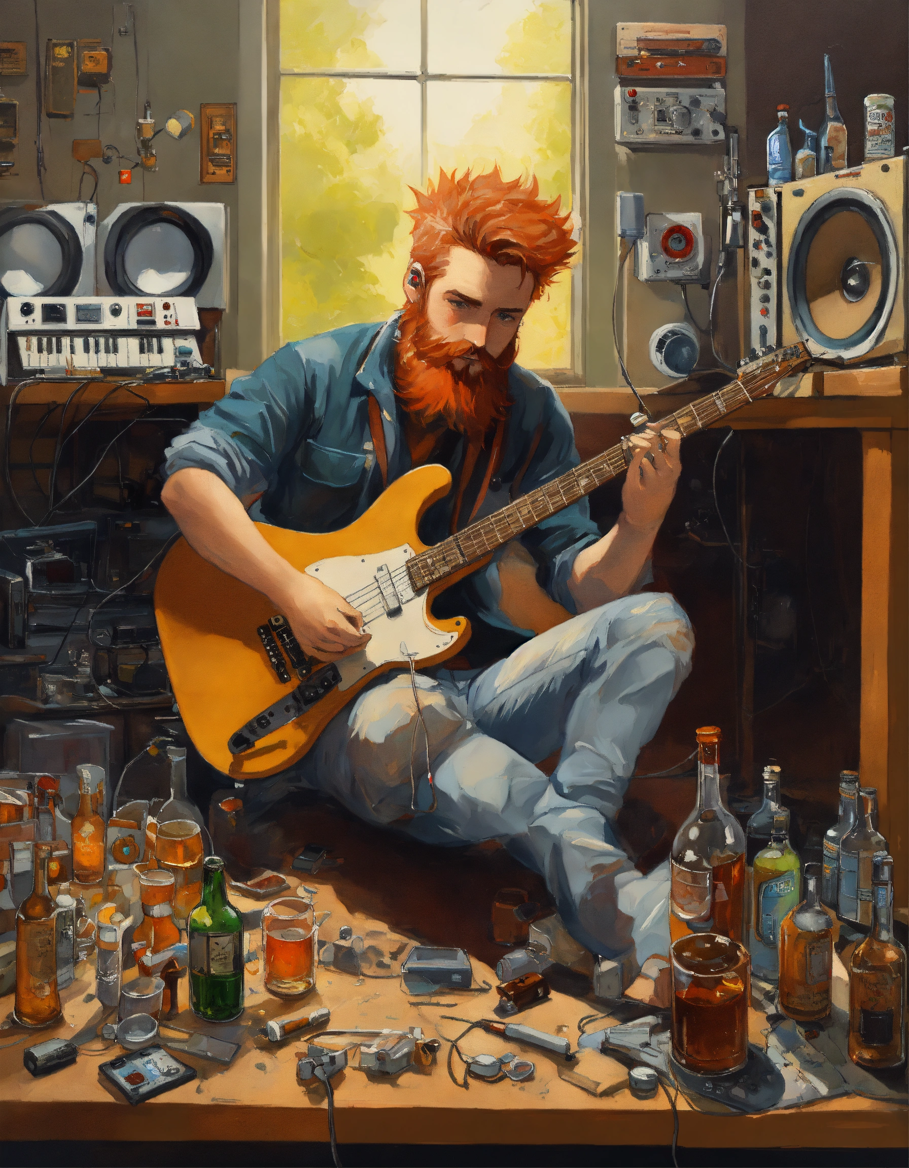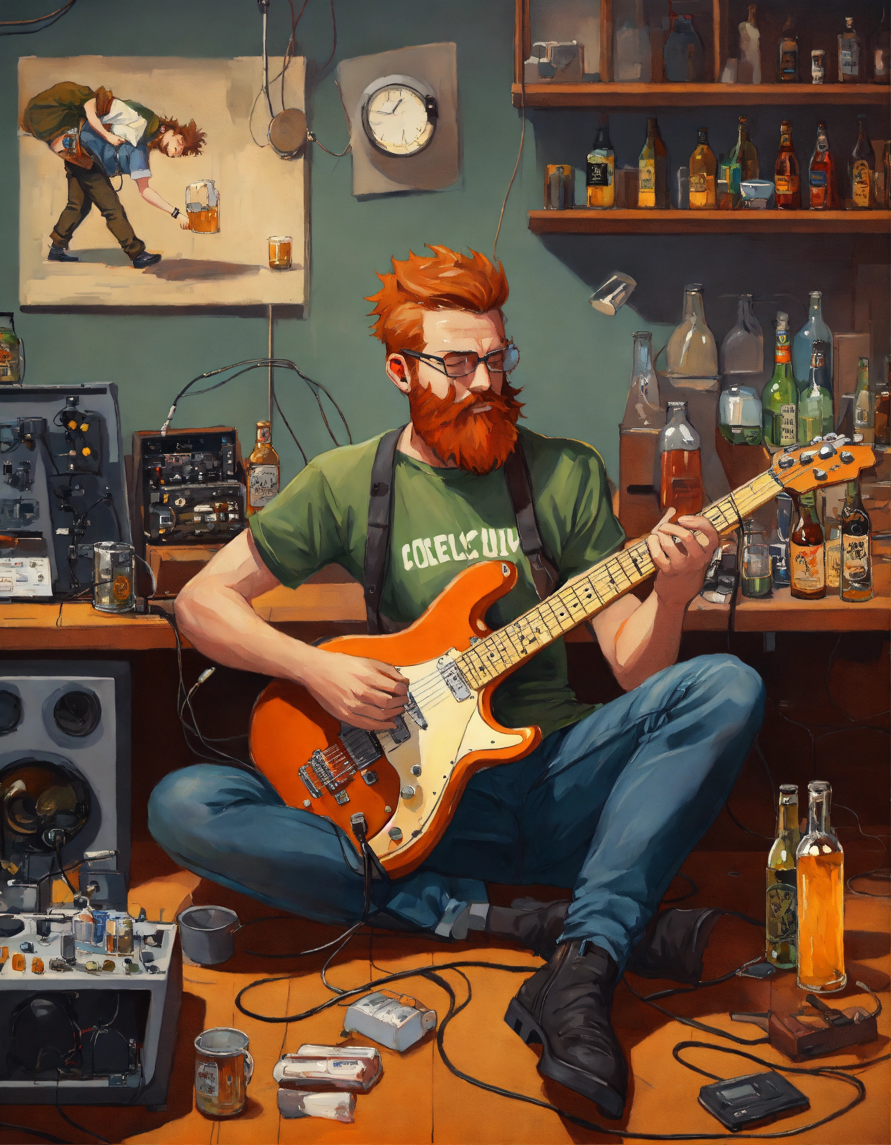 Caucasian mad scientist with gray high and tight short reddish hair and beard, holding electric guitar, wearing concert t-shirt and jeans, in a (neat and tidy) laboratory with music equipment, ((unconscious)) lying face-down at the console with a bottles of booze and mugs of cold lager oil painting