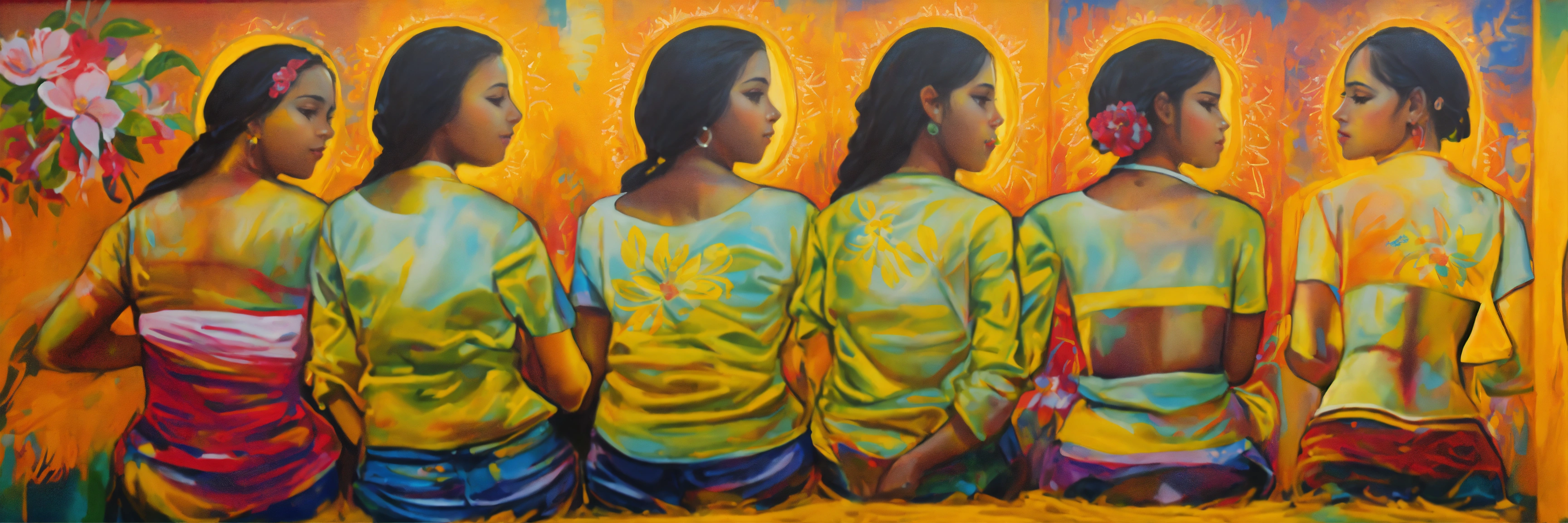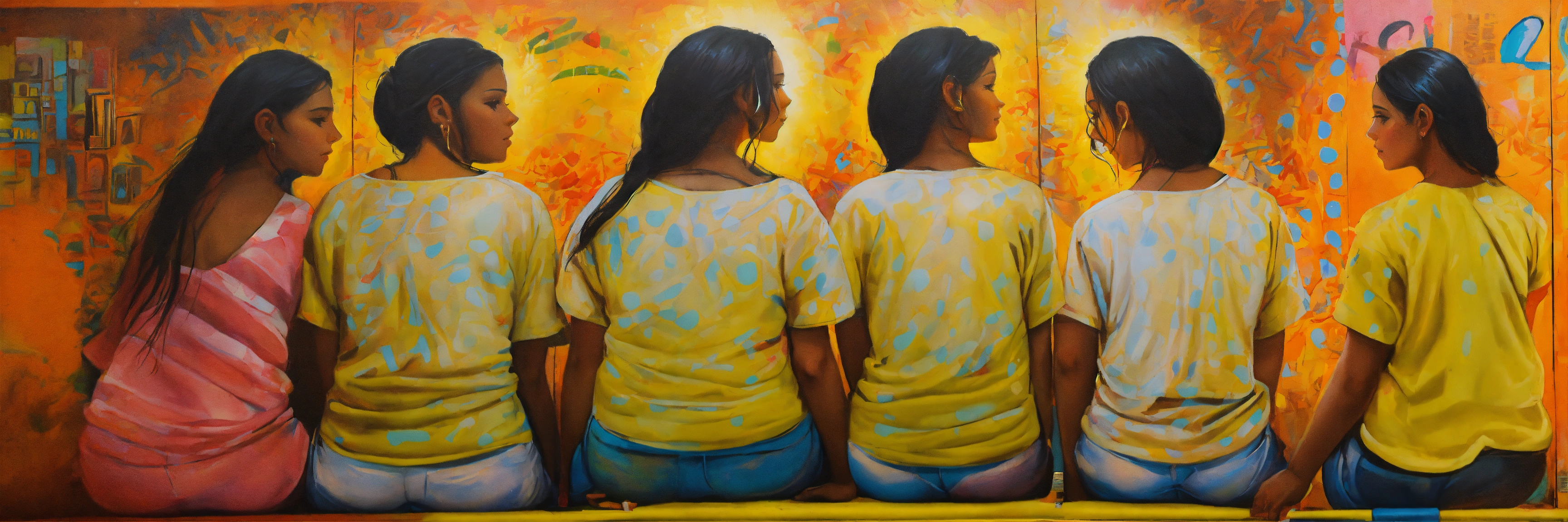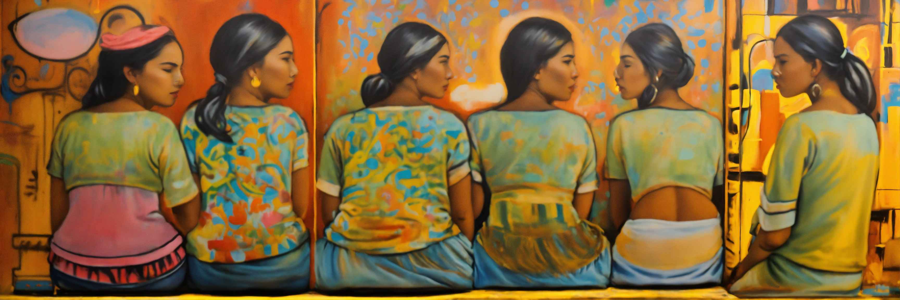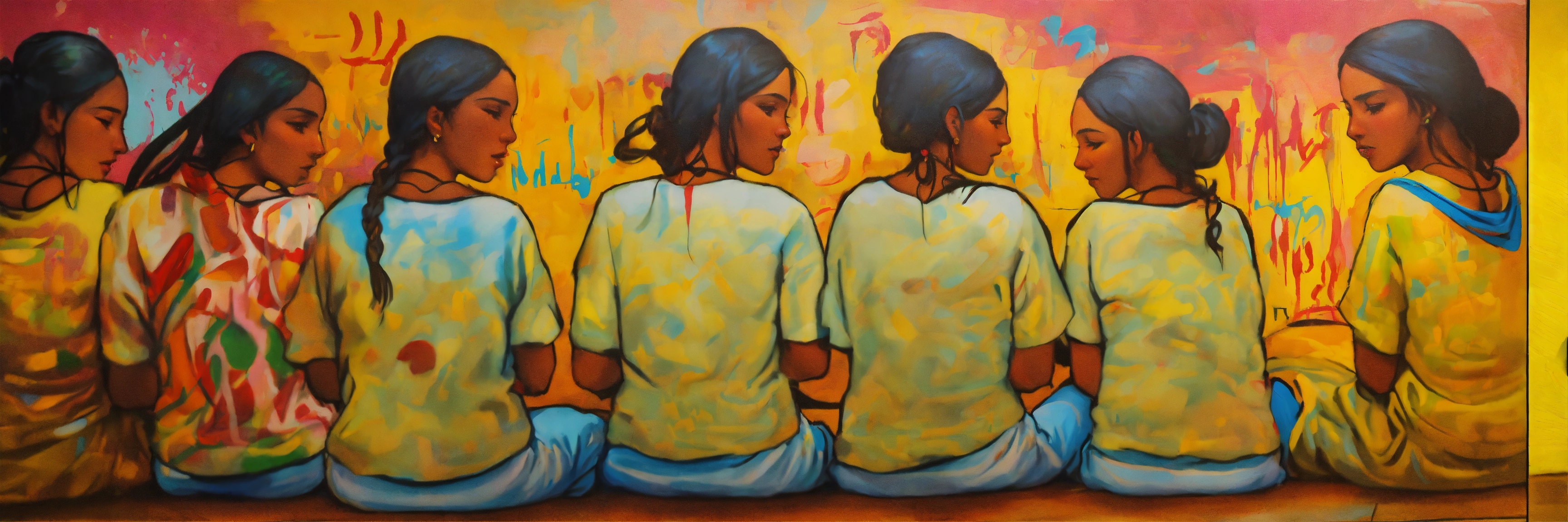 Pintura, de mujeres de distintas etnias o razas, todas estas mujeres tejiendo un colorido textil, no uses fotografías, quiero pintura, that showcases empathy osea the emotional involvement of a person in a reality outside of their own, usually in the feelings of another person, graffiti. abrazo entre dos mujeres, cariño, altruismo by belkis ayún and basquiat style