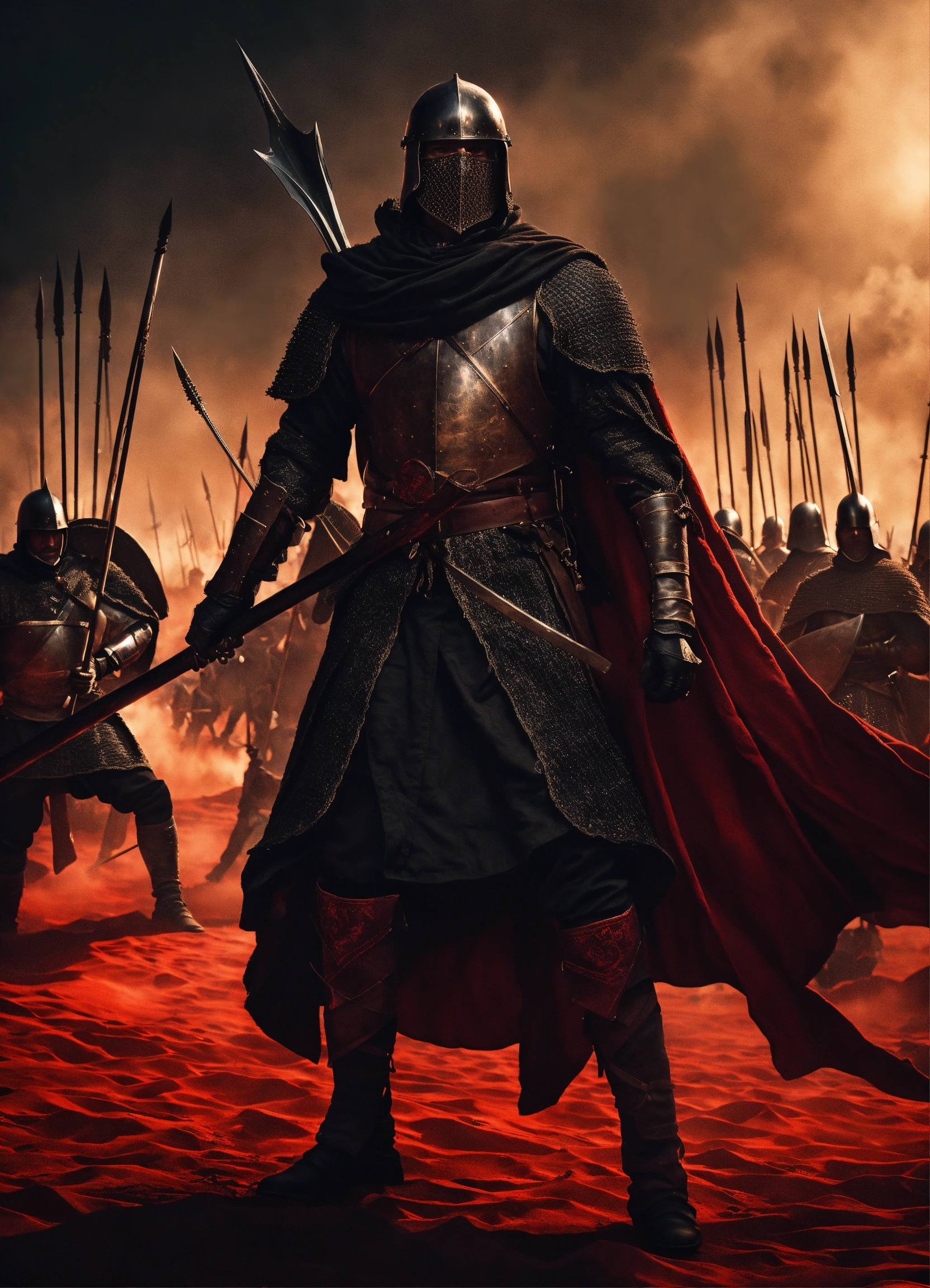 Realistic, army of ninety thousand black and bald men, dressed in black medieval war clothes, in battle stance, with spears, in the red-floored desert, cinematic lighting, energetic, imposing and evil