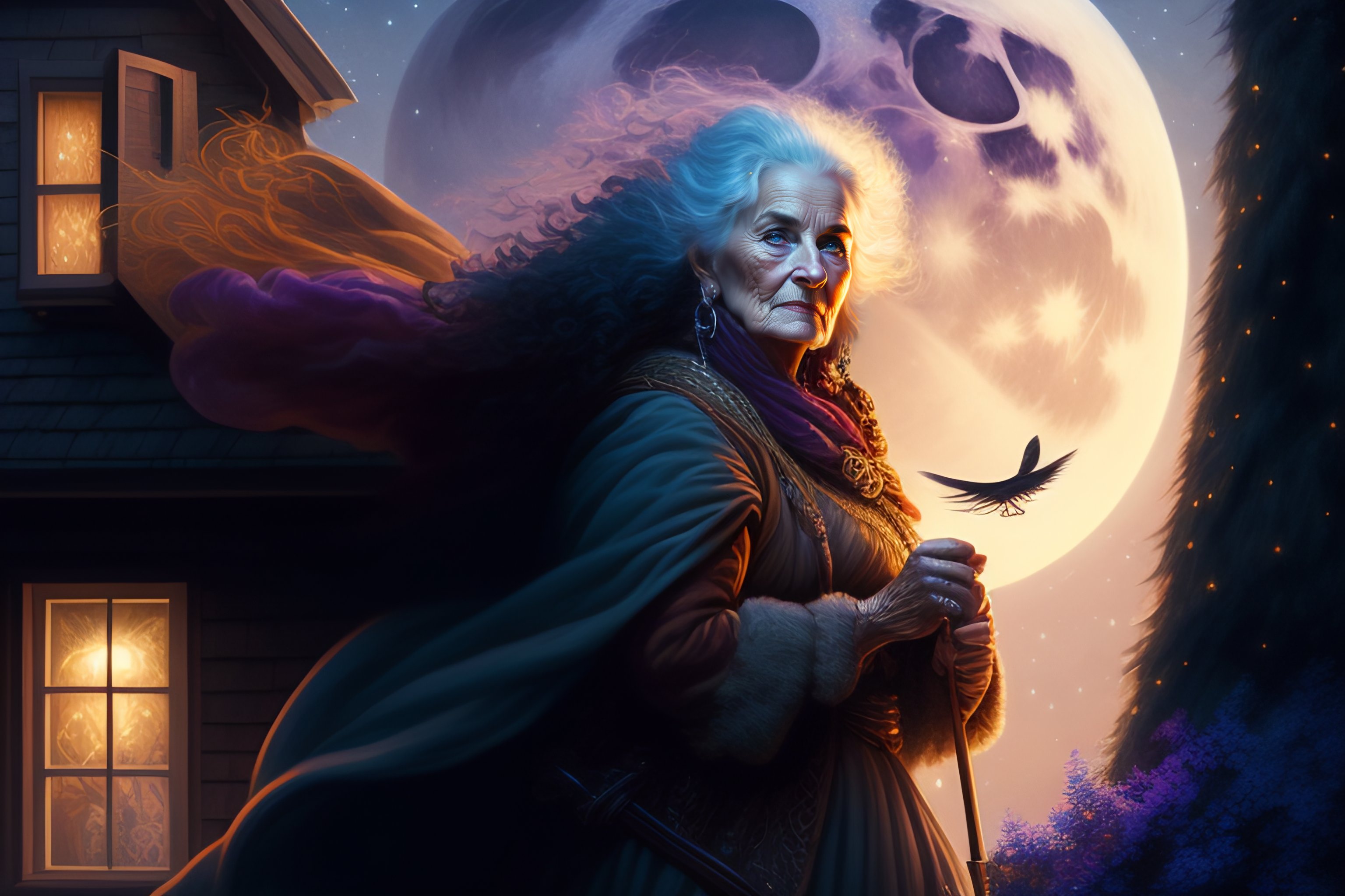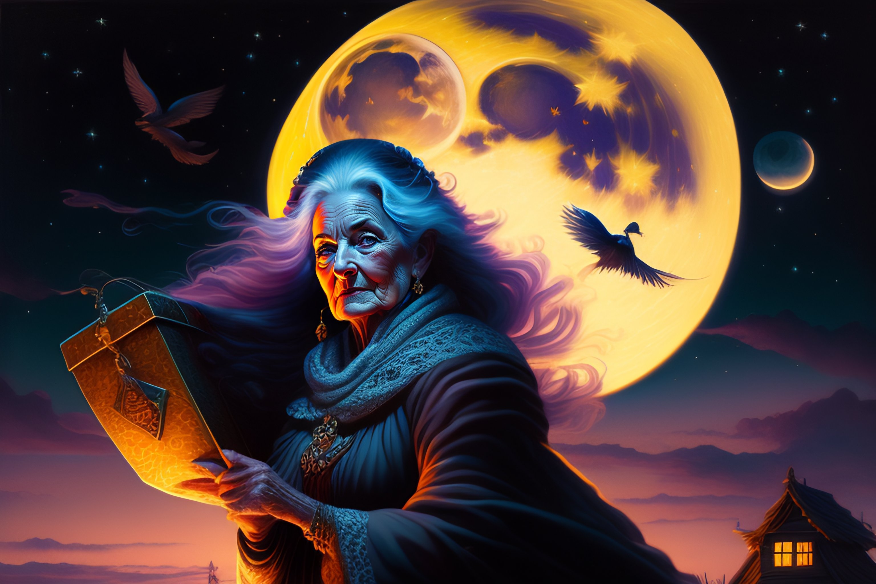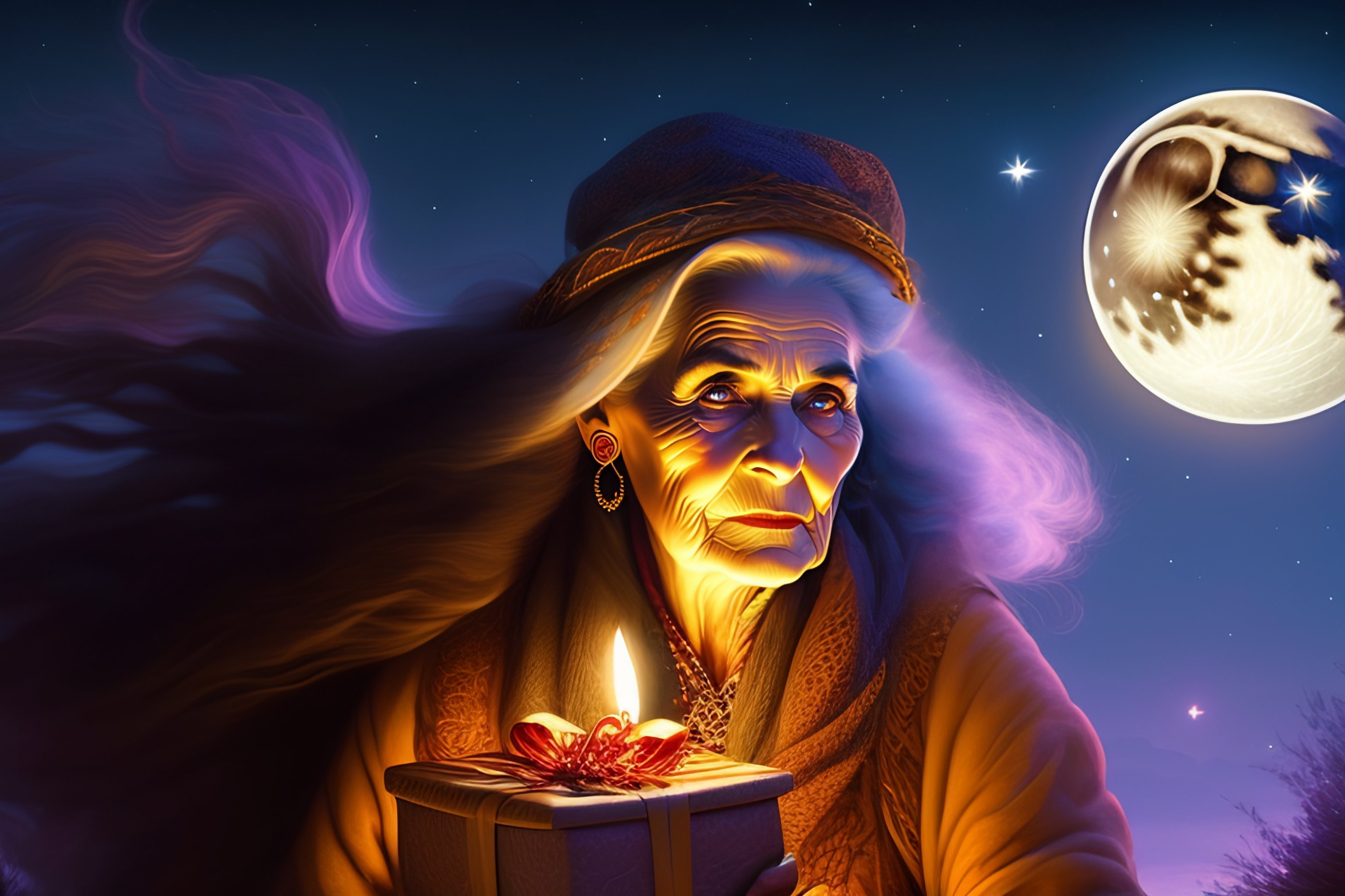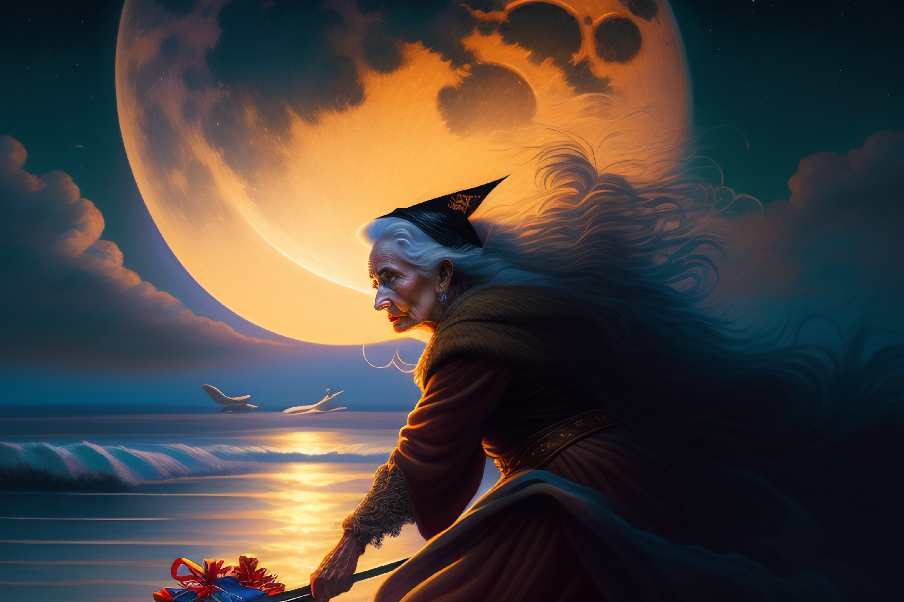 Old crone witch riding a flying broom and holding a big bag full of presents at night with full moon in the background in the style of artger, greg rutkowsky, hildebrandt, intricate detail