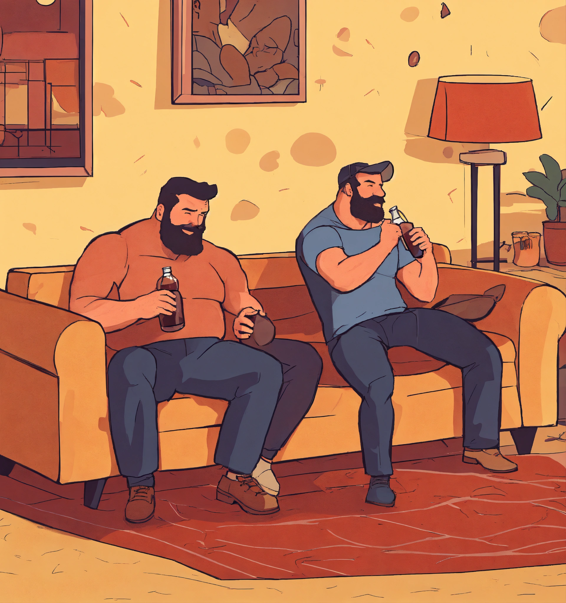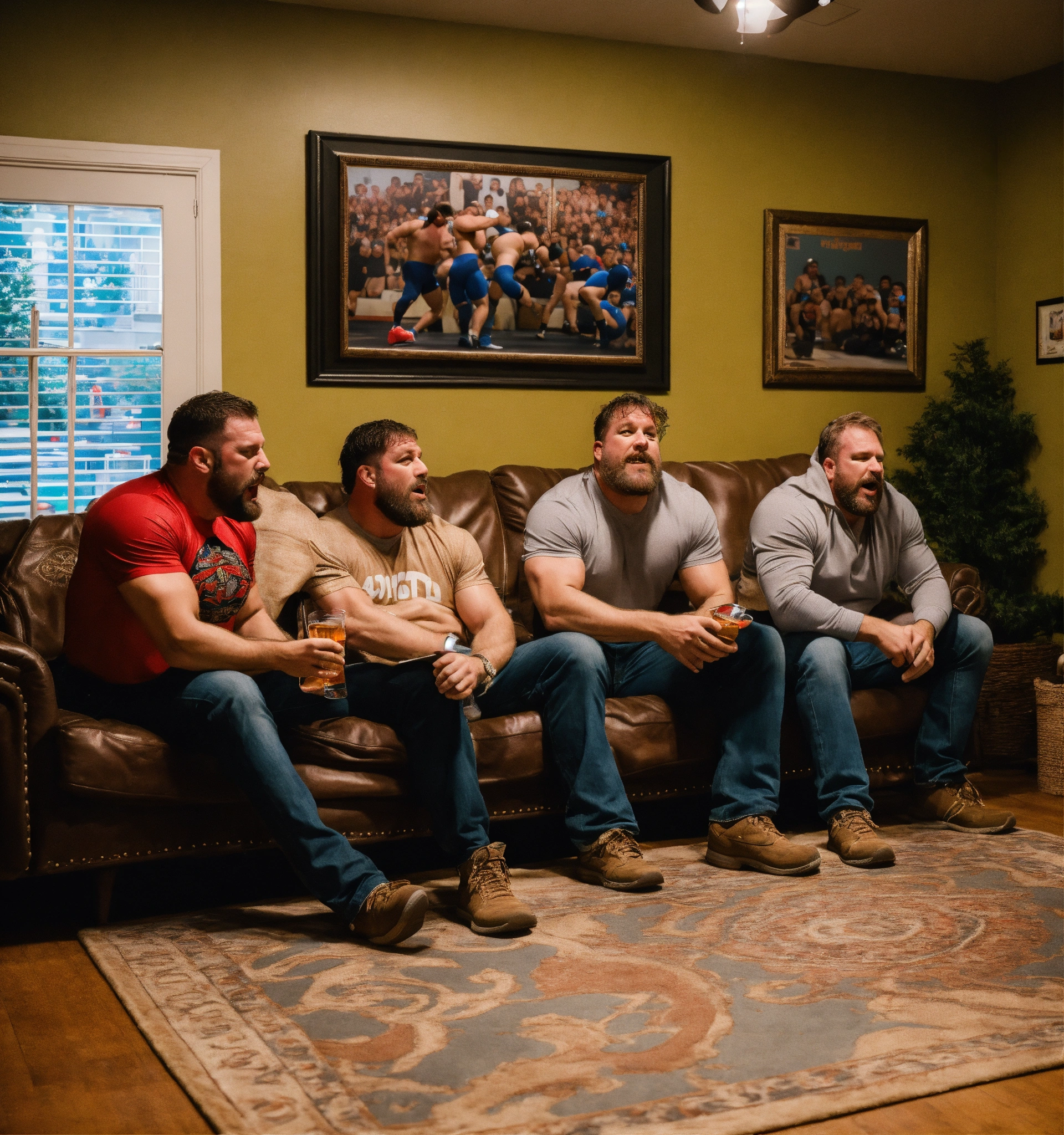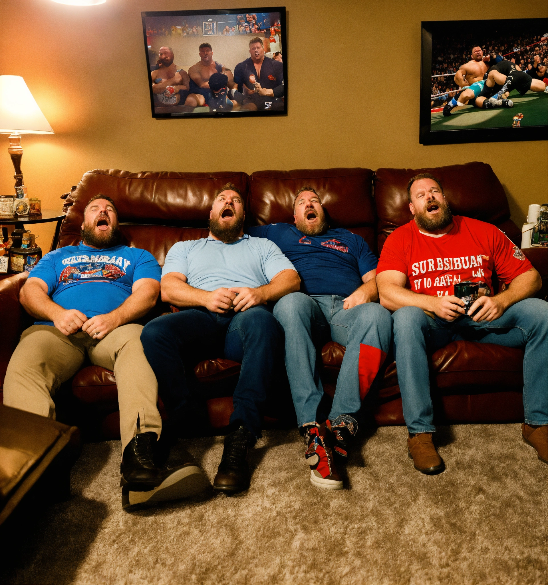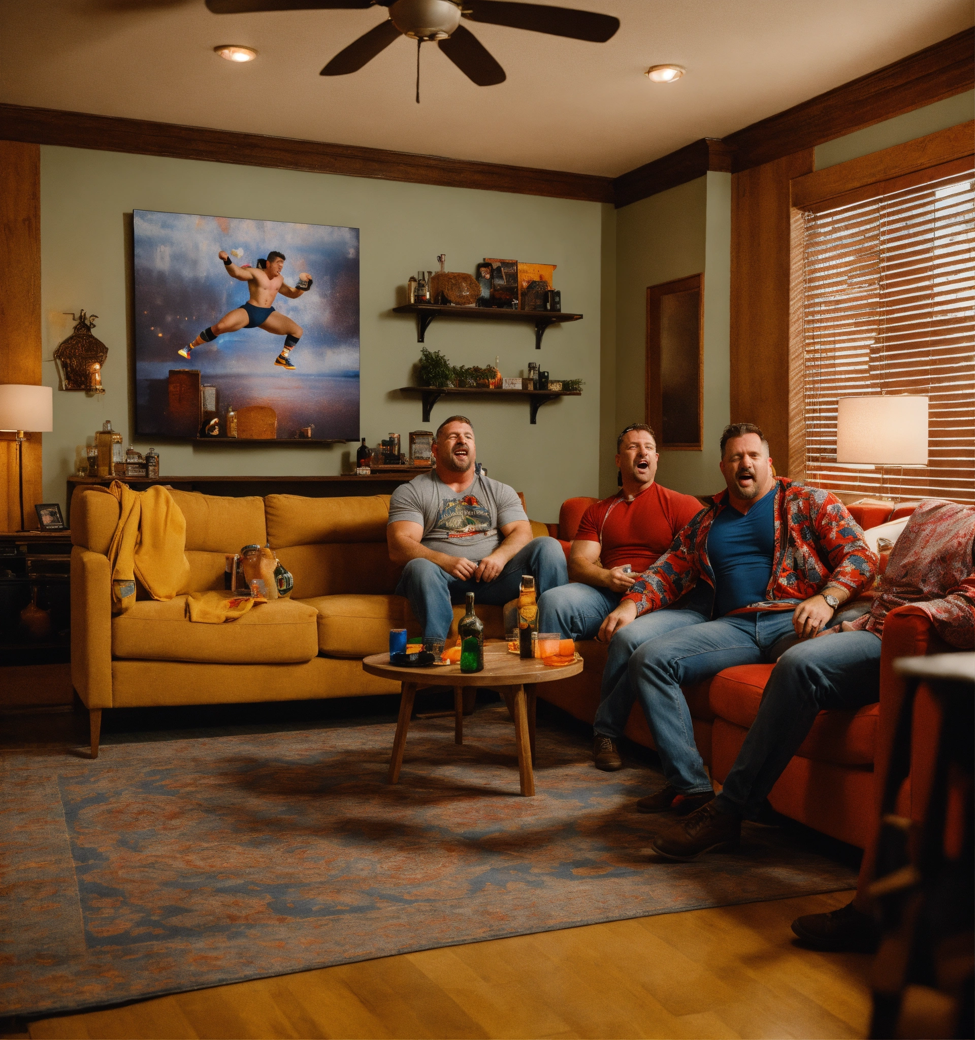 A trio of suburban dads drunk and watching a wrestling match in their living room
